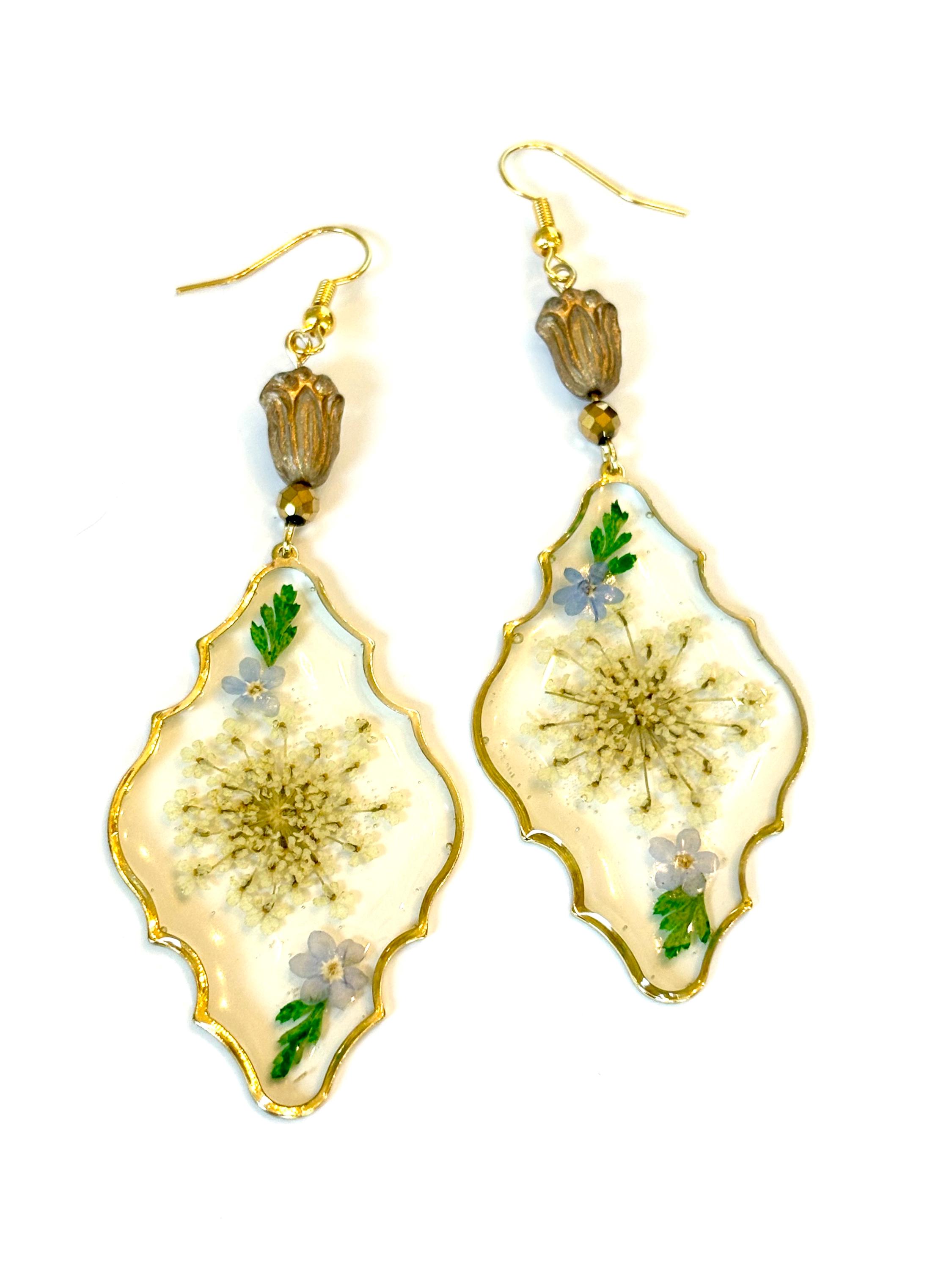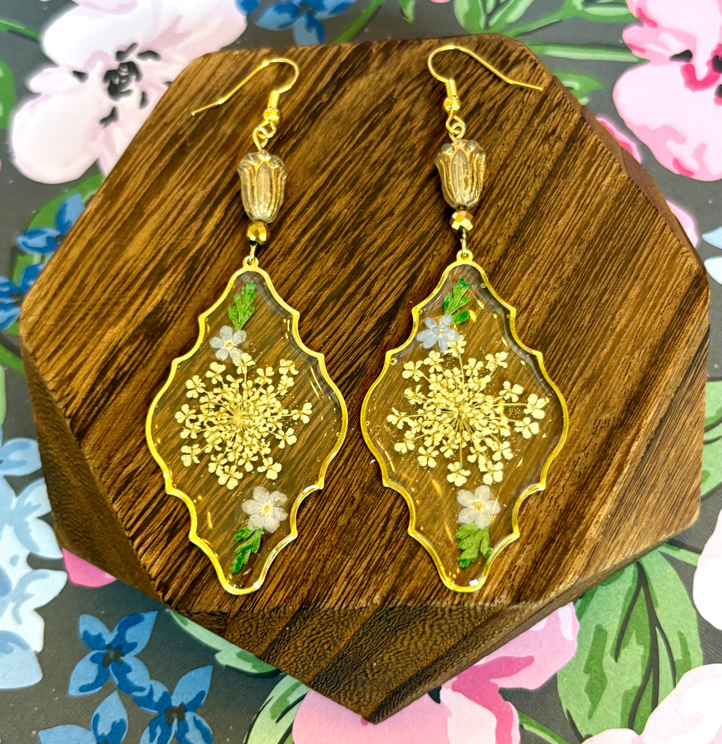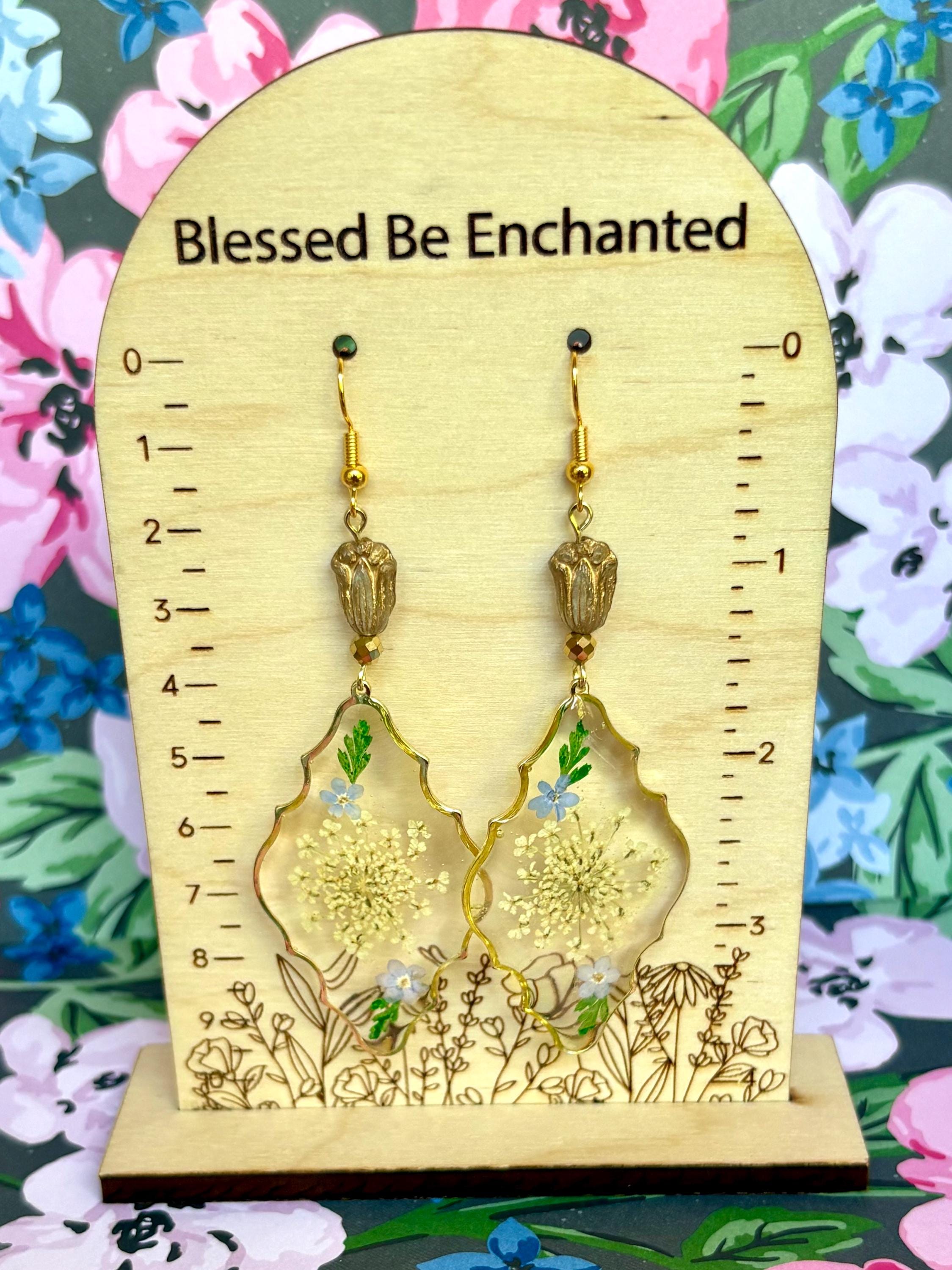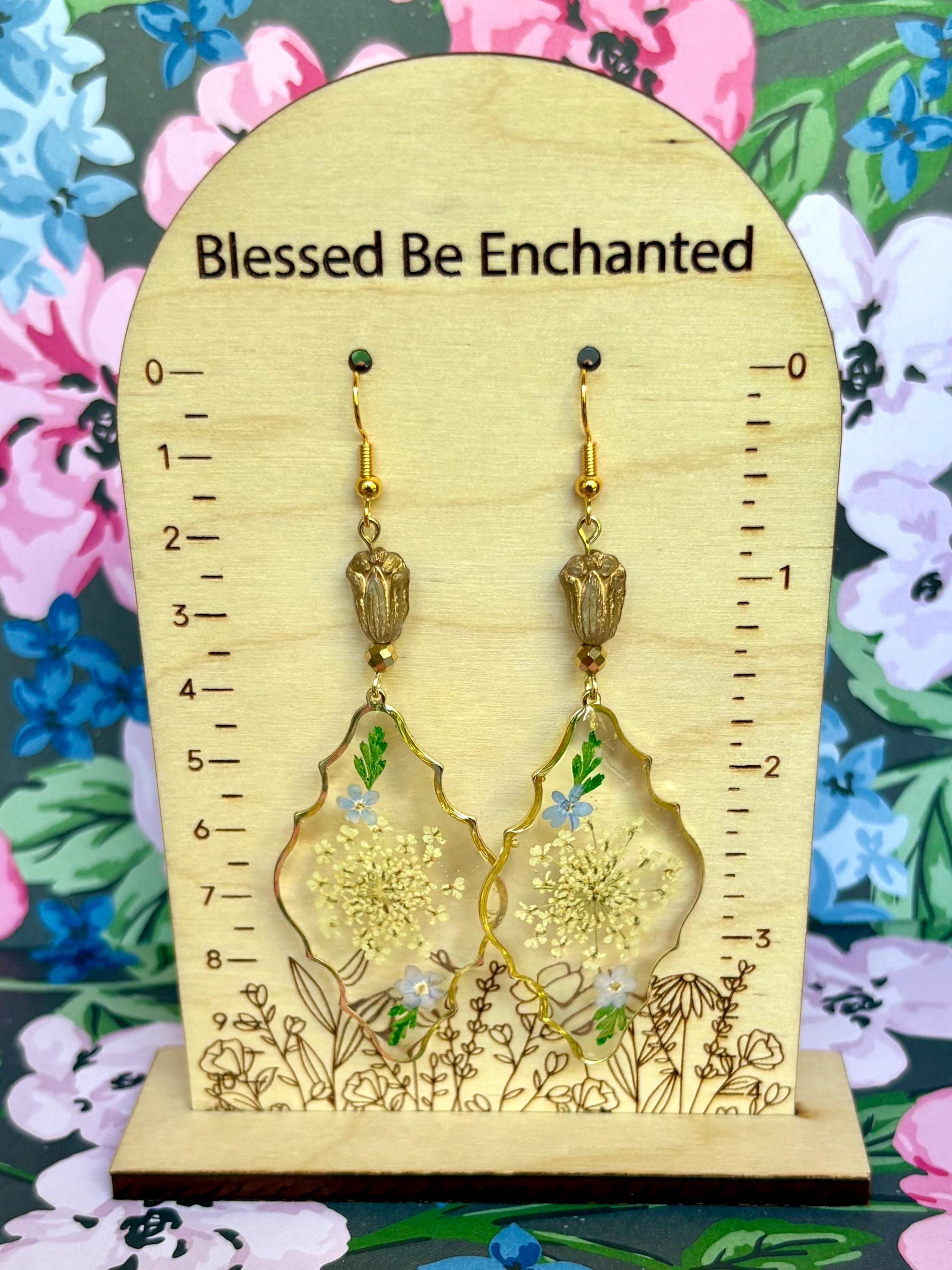 Celebrate the magic of the season with these Enchanted Holiday Blossom Earrings, a radiant mix of natural beauty and golden elegance! Each pair features delicate resin pendants filled with real pressed flowers and greenery, creating a timeless botanical keepsake that glimmers with light. Above, Czech glass tulip beads and faceted gold hematite gemstones add warmth and sparkle, symbolizing joy, protection, and abundance.