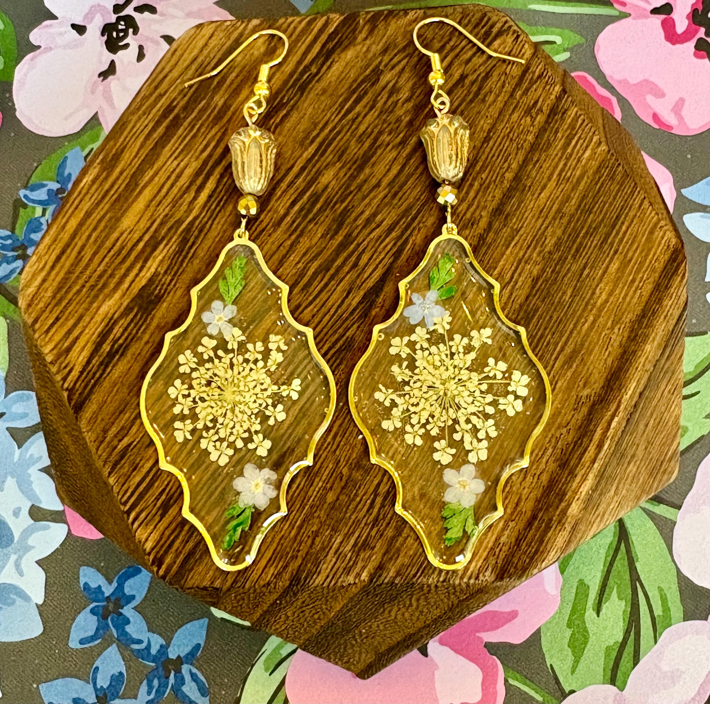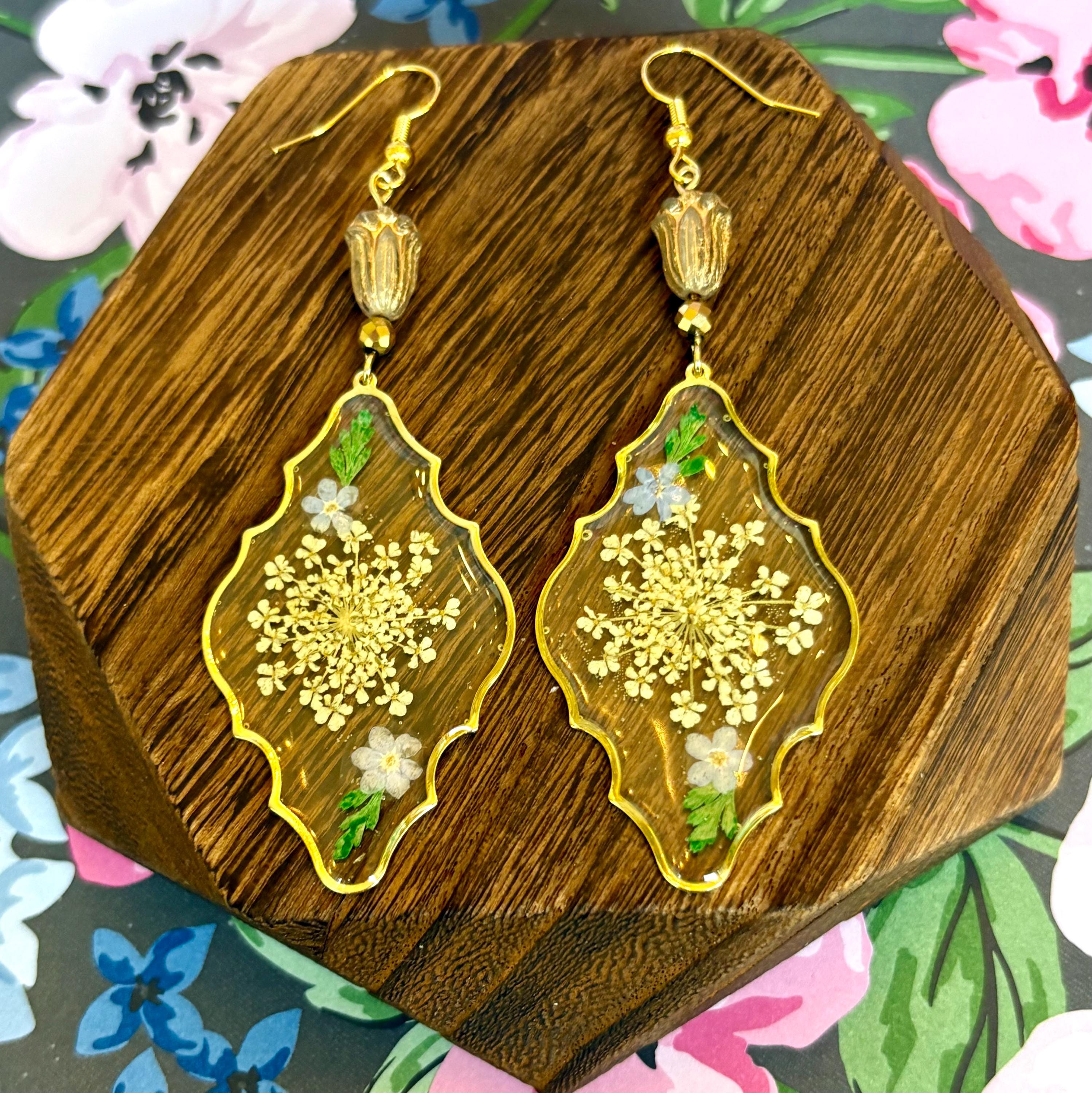 Enchanted Holiday Blossom Earrings – Pressed Flower Resin Statement Earrings | Czech Glass Tulips, Gold Hematite, Hypoallergenic Gold Tone 316L Stainless Steel