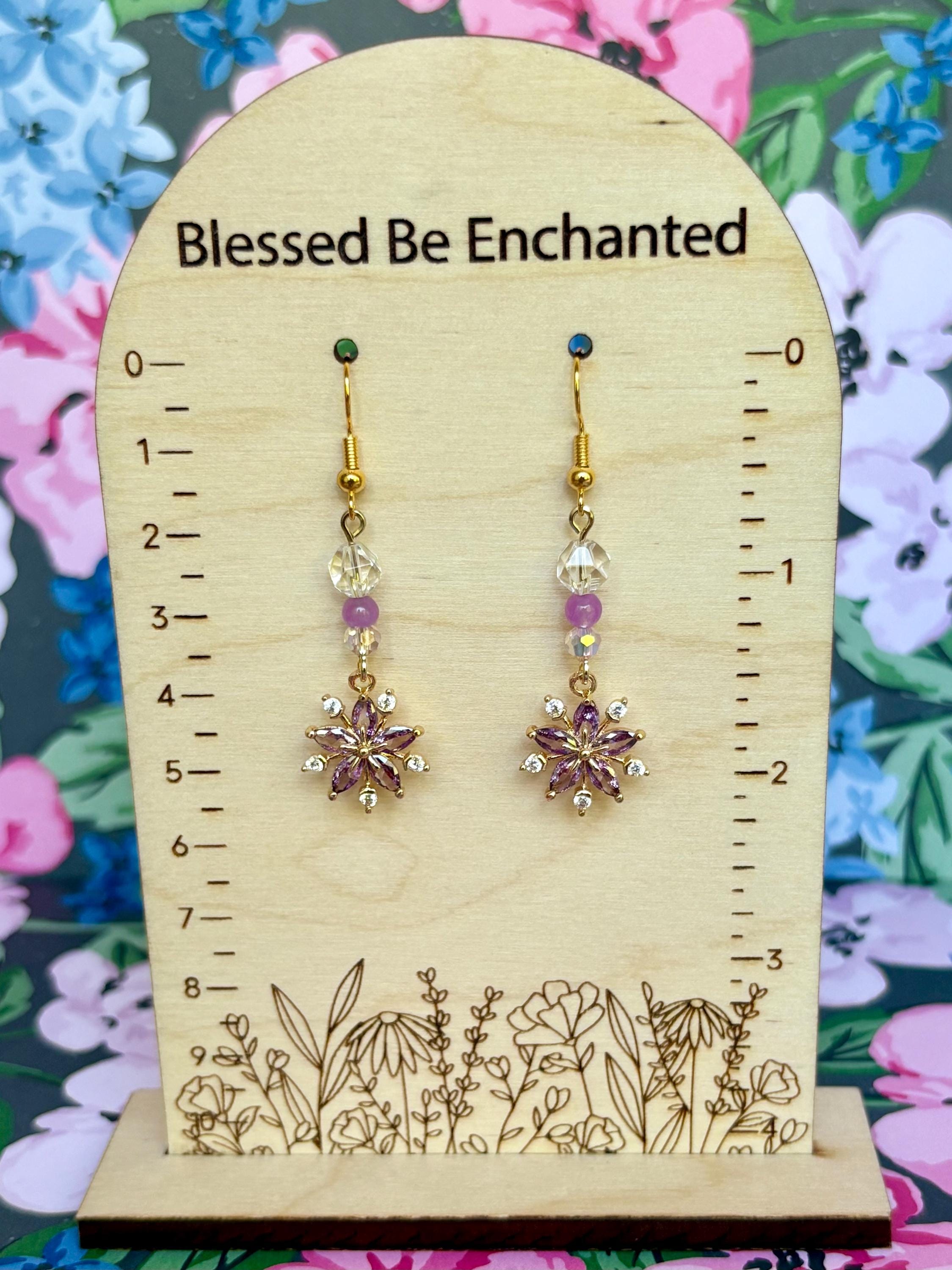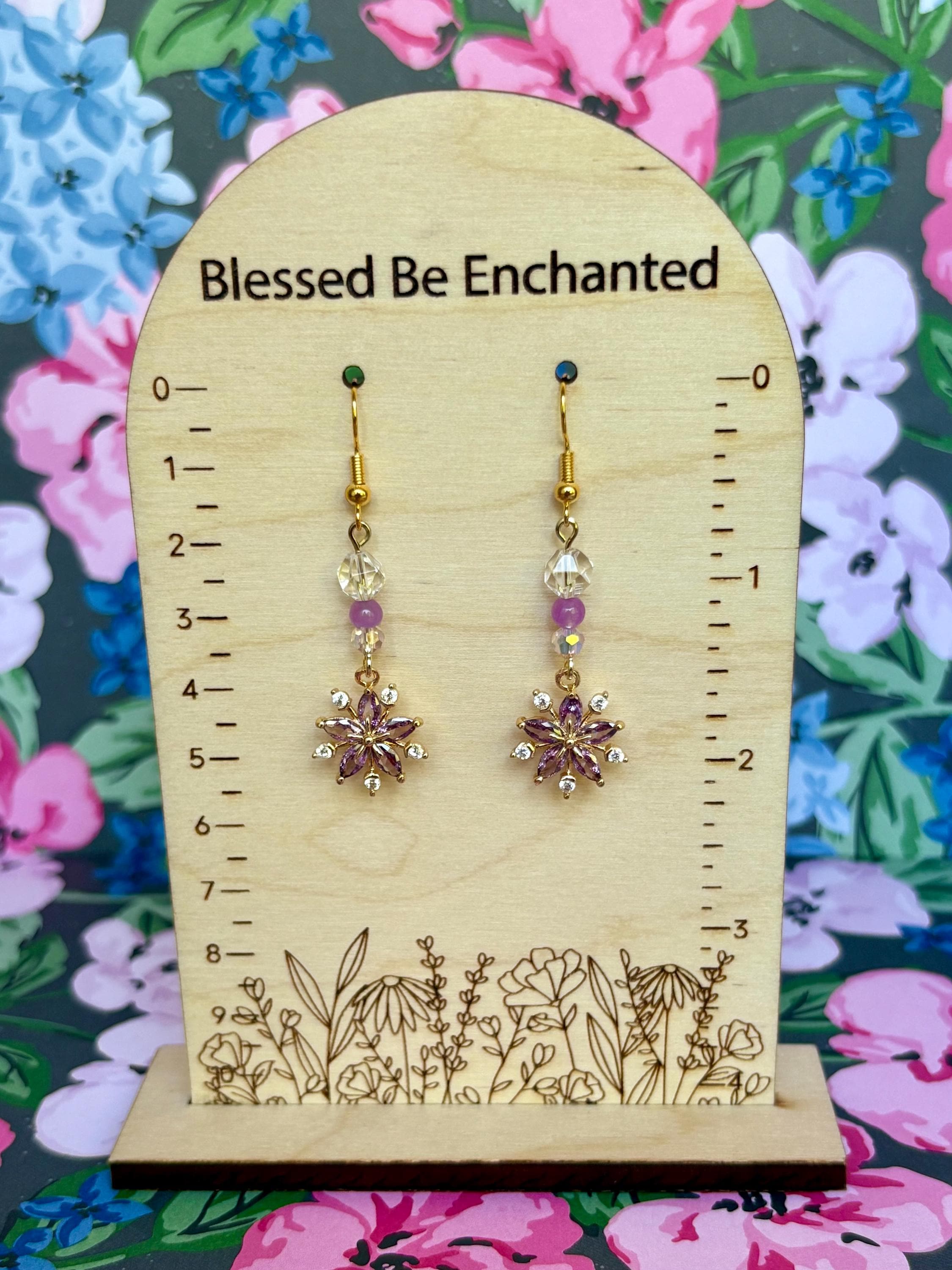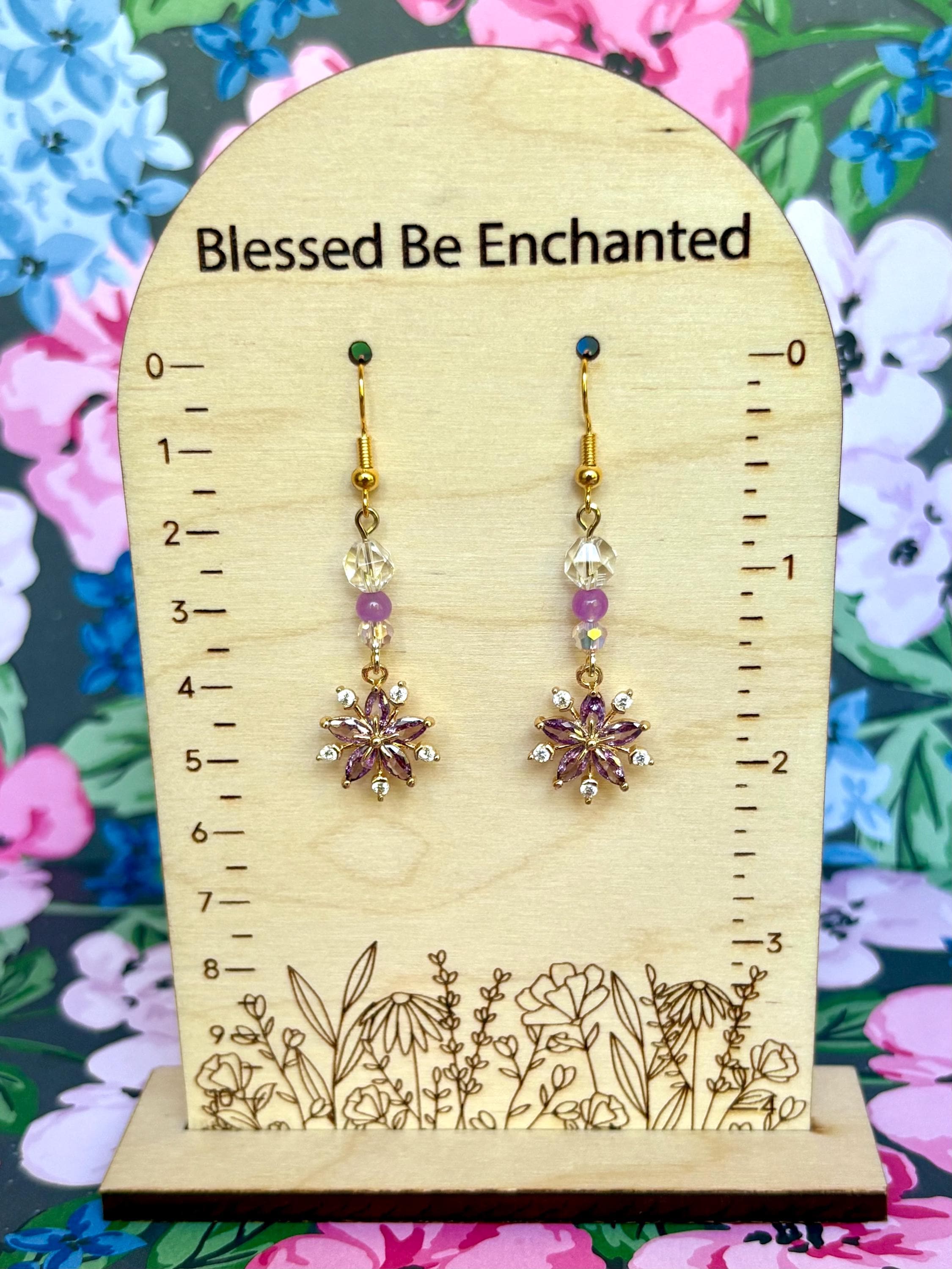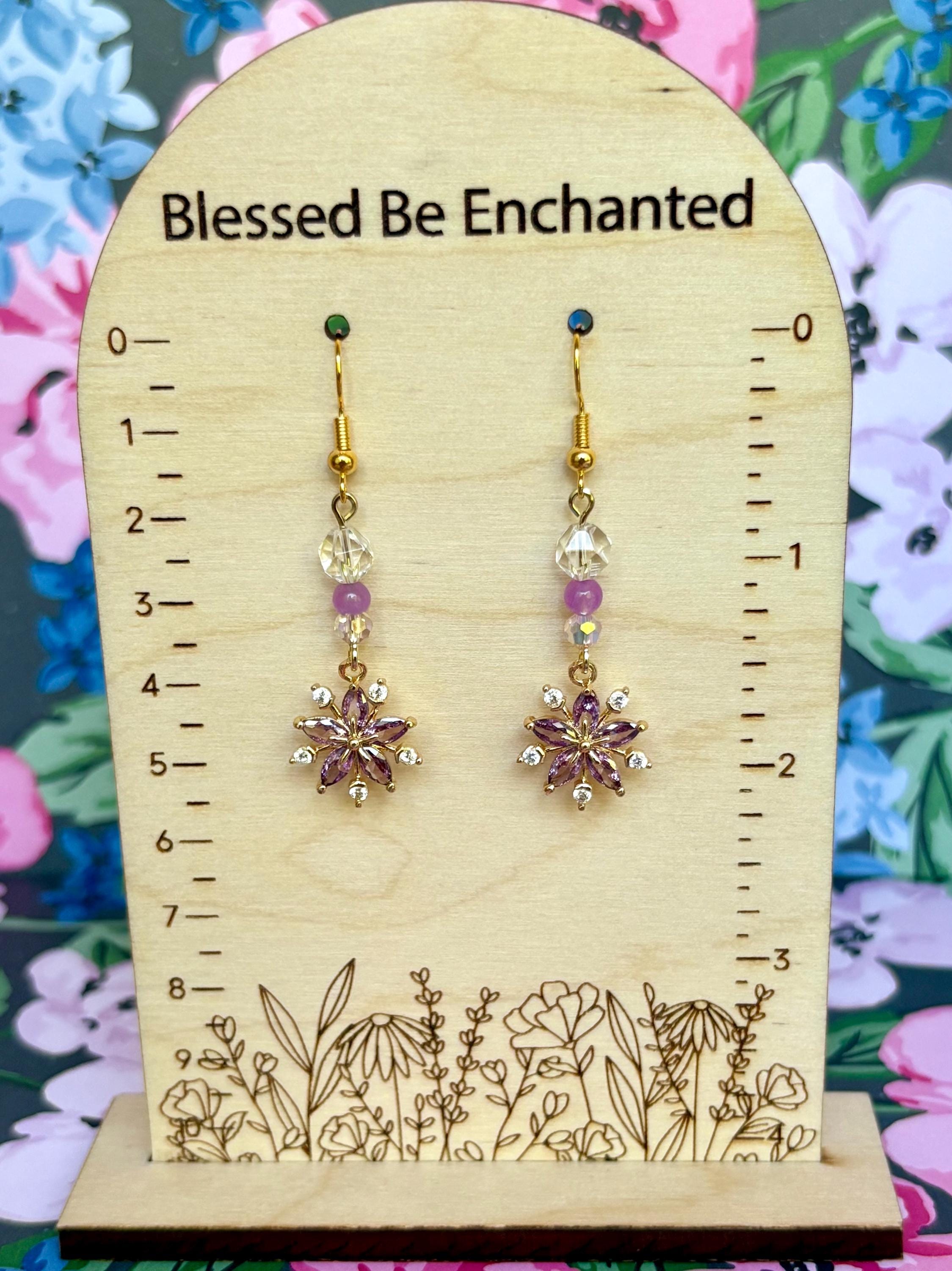 Enchanted Frosted Petal Snowflake Earrings – Clear Quartz, Chalcedony Gemstones, Pink Crystals, Hypoallergenic Holiday Earrings - Purple