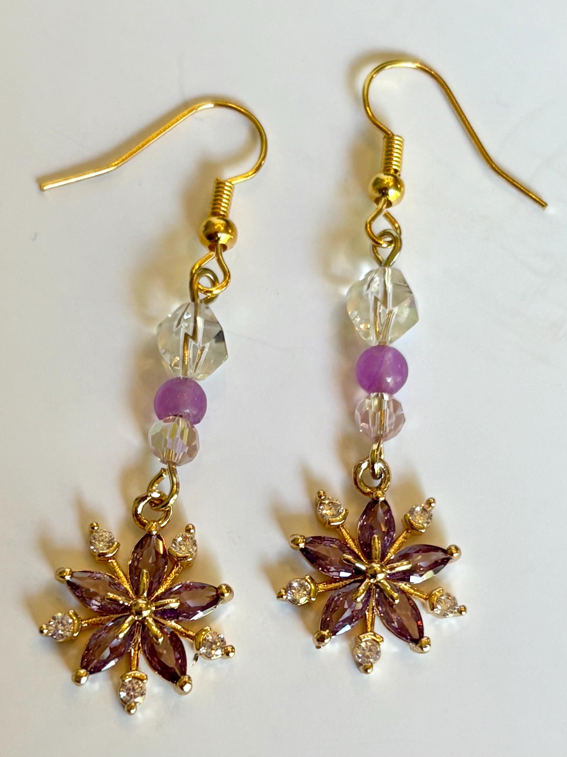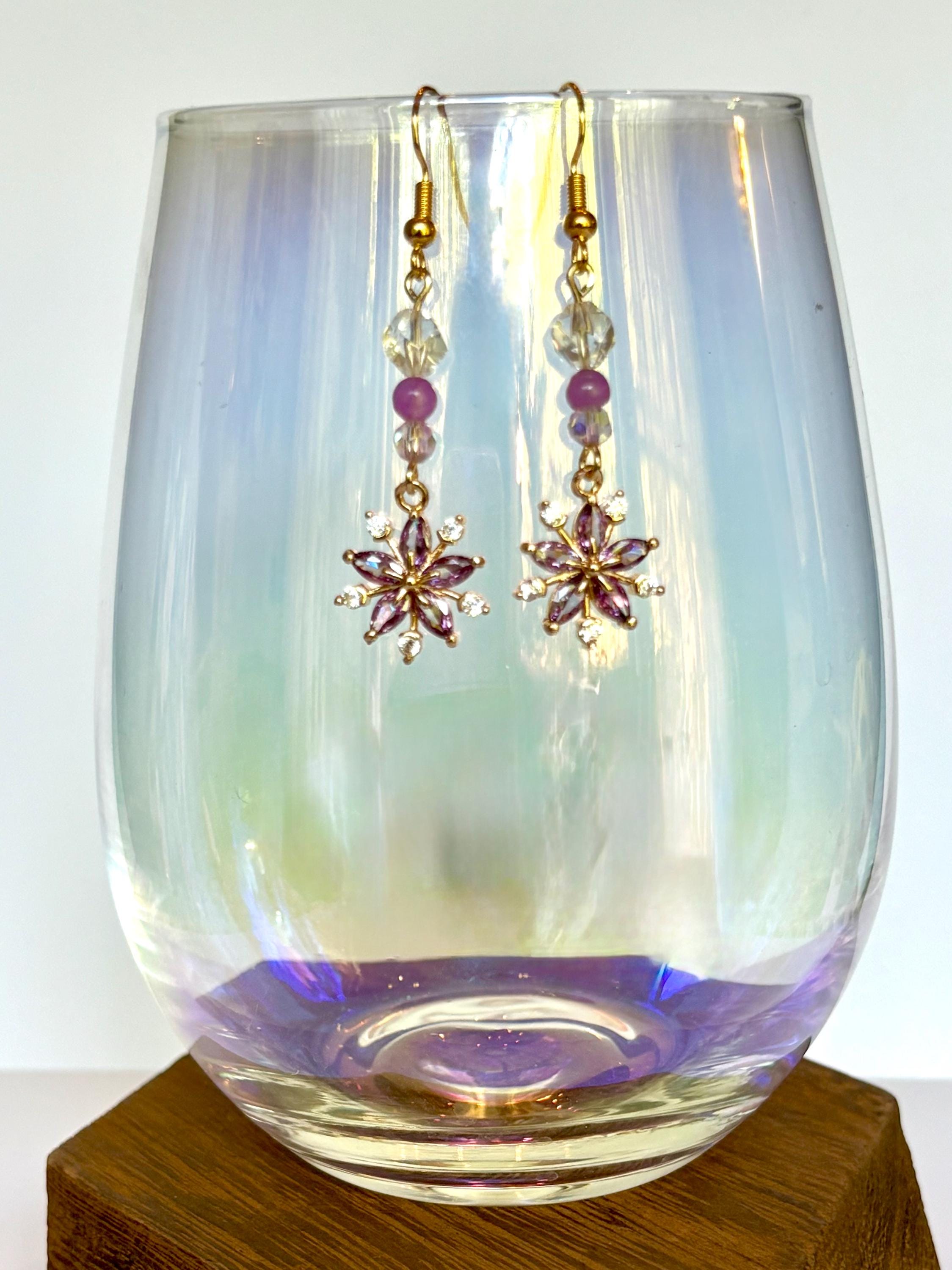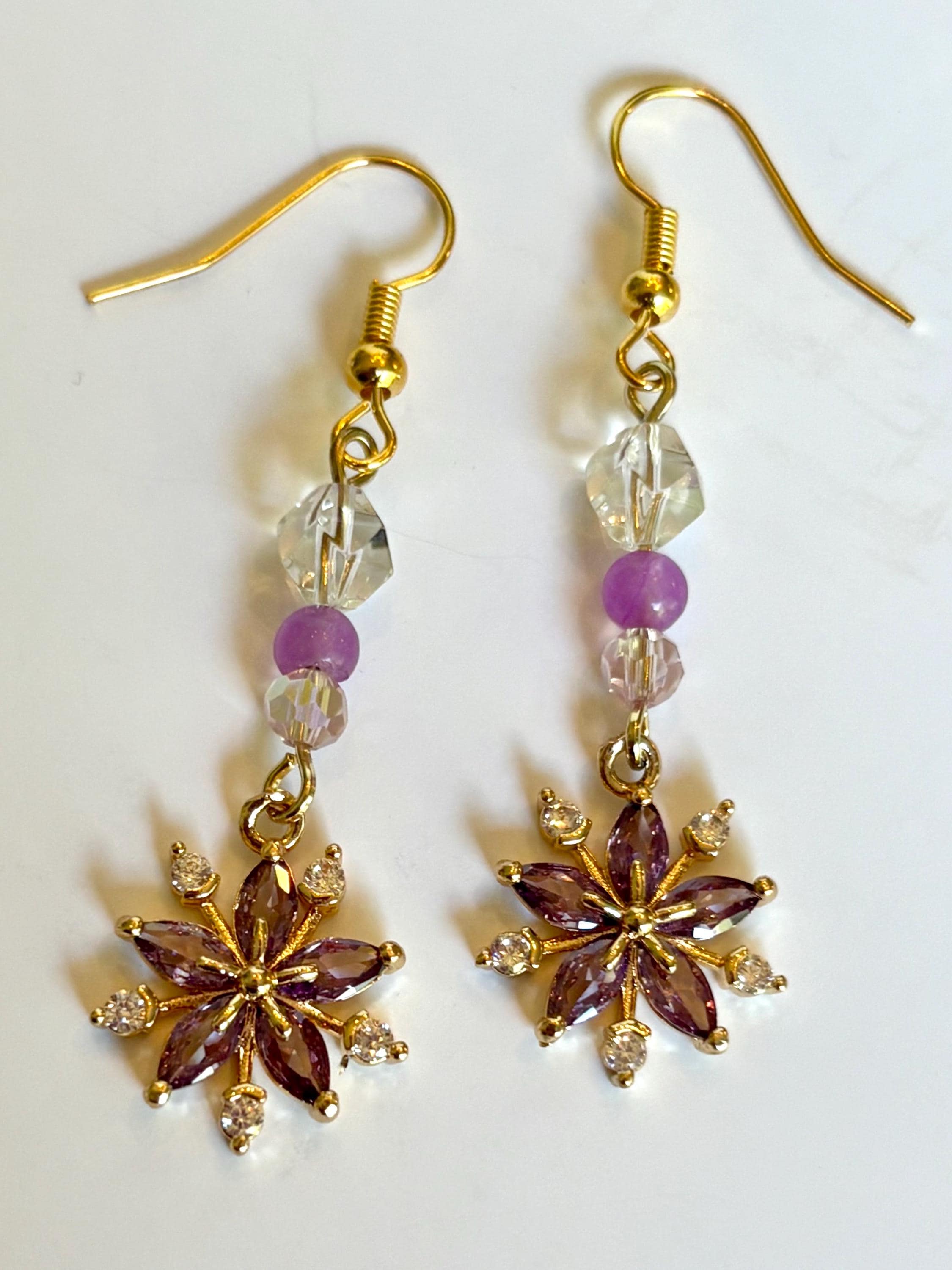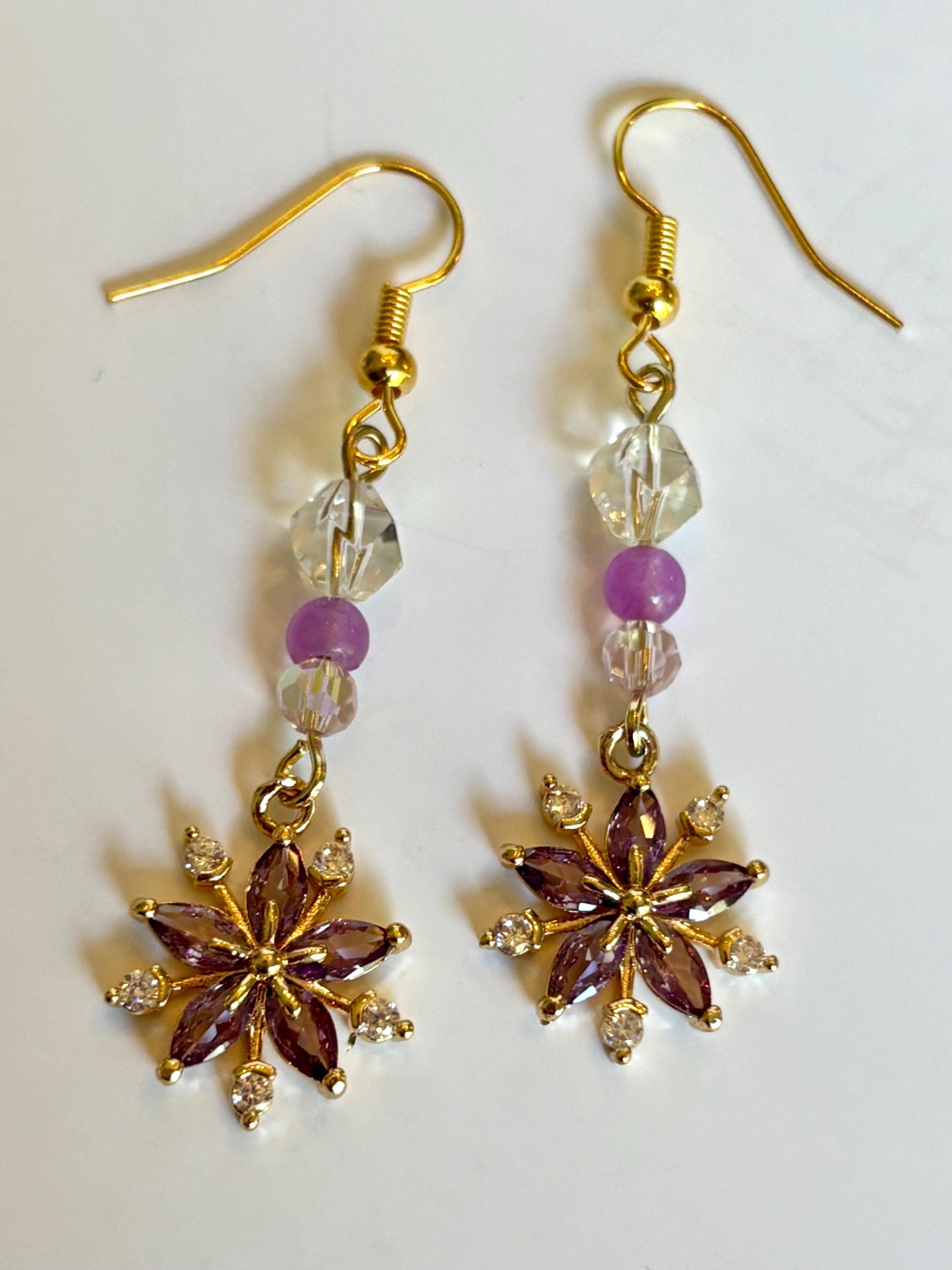 These dazzling handmade earrings feature 316L surgical stainless steel hypoallergenic gold-tone ear wires, star-cut faceted clear quartz gemstones, lavender chalcedony beads, and faceted pink crystals that dance with light. The centerpiece — purple and clear cubic zirconia snowflake charms — sparkle like twinkling petals in freshly fallen snow, making them perfect for festive gatherings, winter weddings, or simply adding a radiant touch to your day.