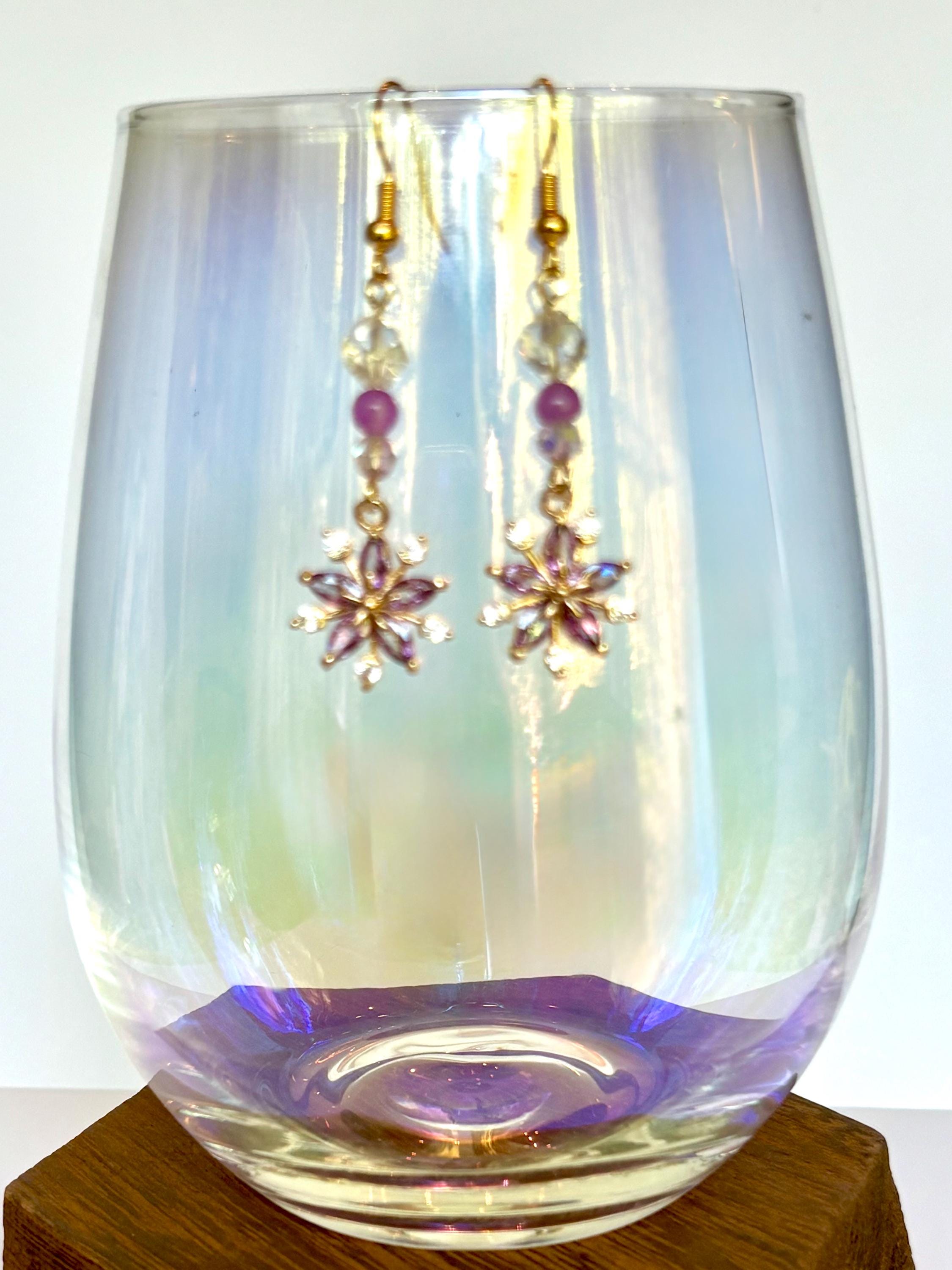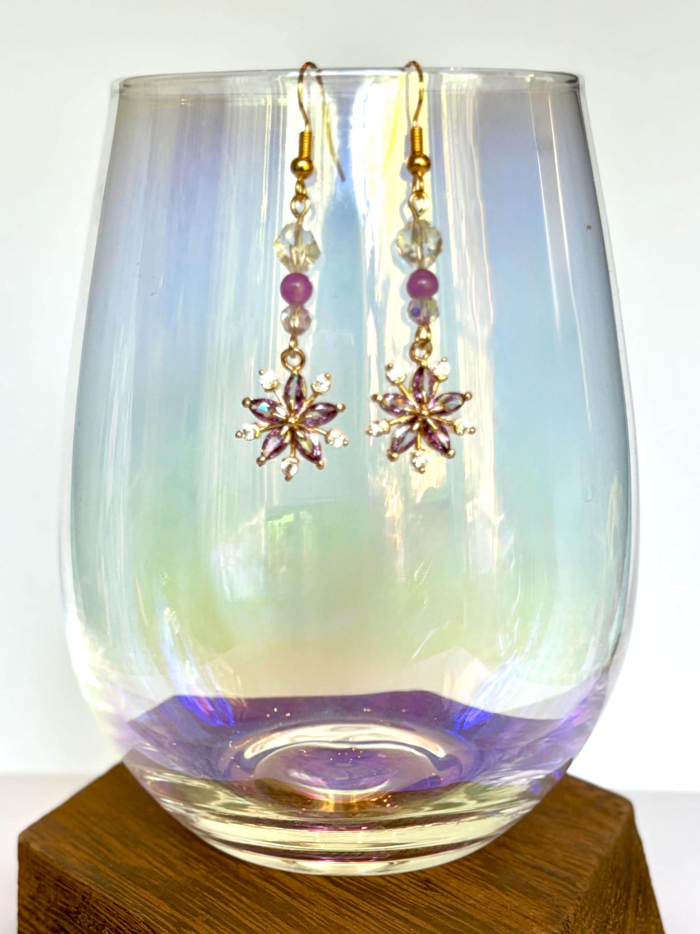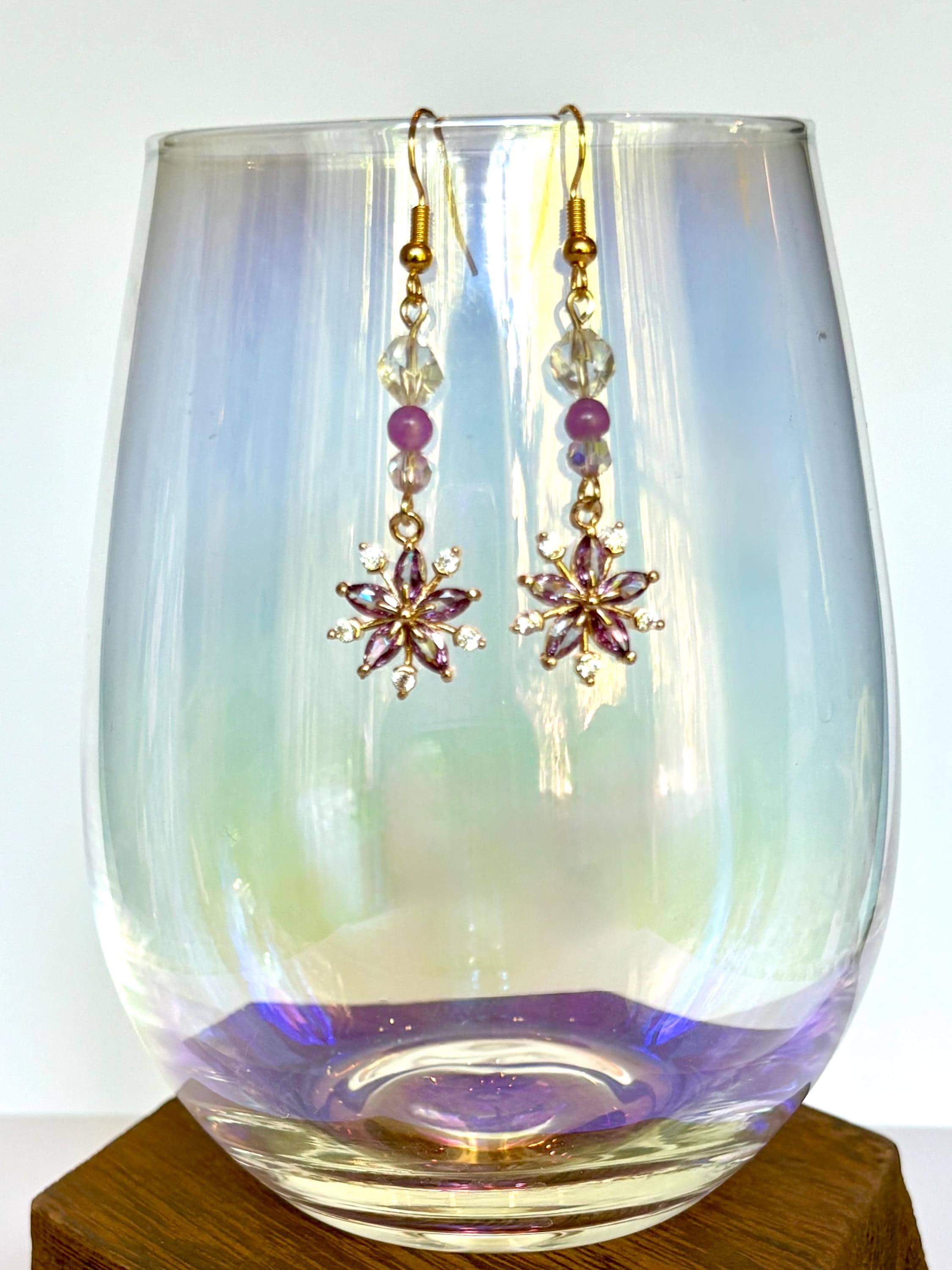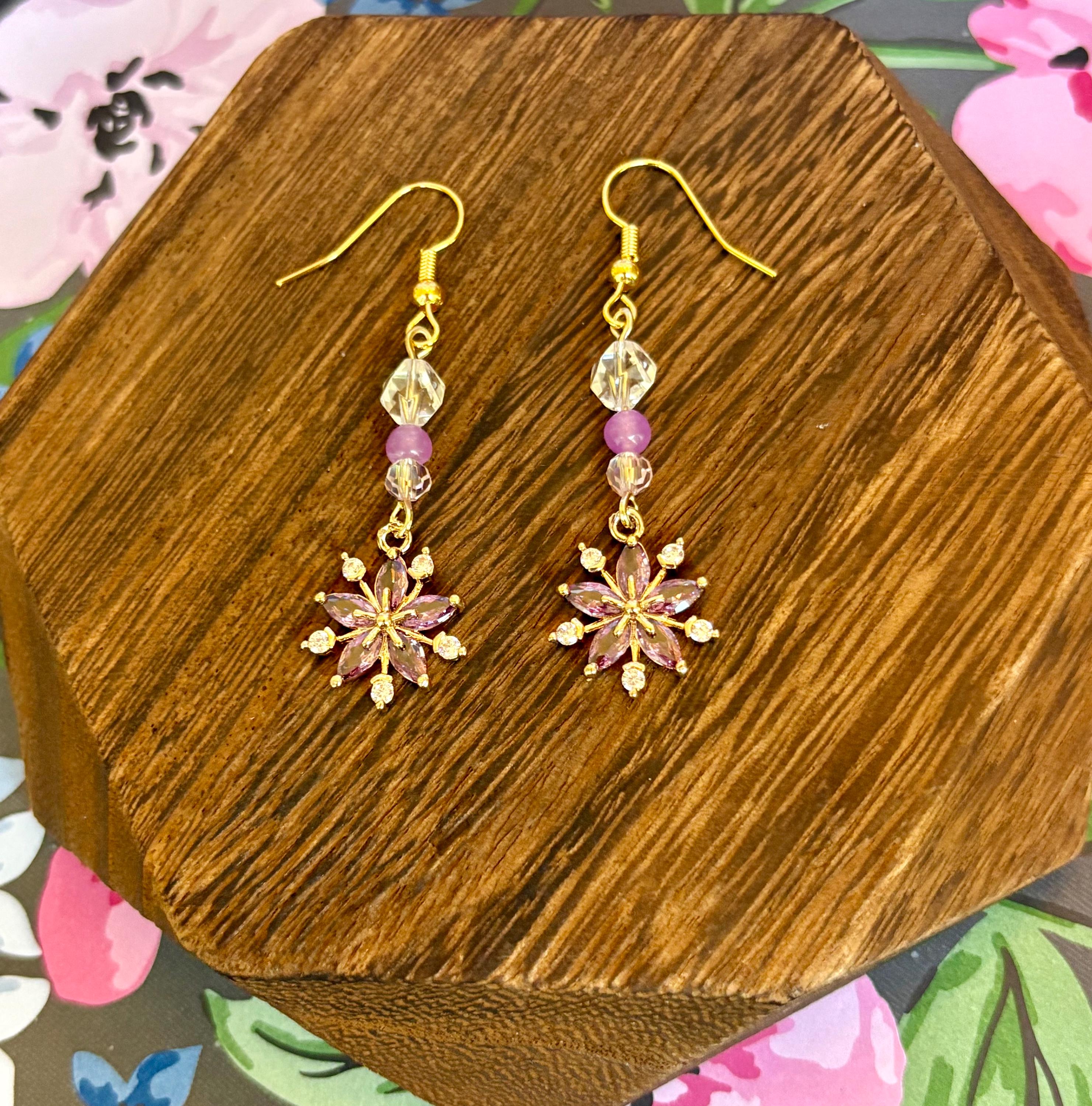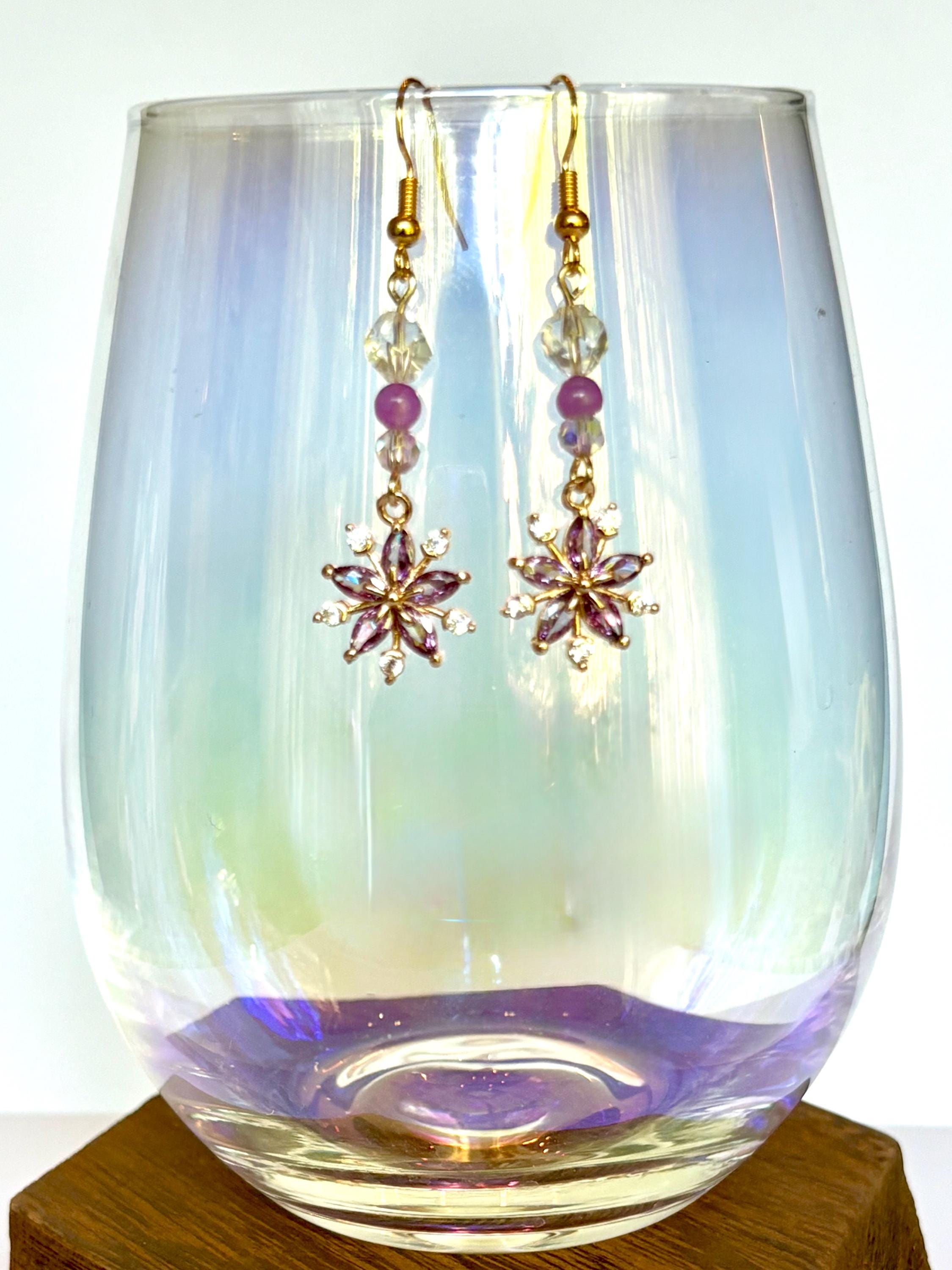 These dazzling handmade earrings feature 316L surgical stainless steel hypoallergenic gold-tone ear wires, star-cut faceted clear quartz gemstones, lavender chalcedony beads, and faceted pink crystals that dance with light. The centerpiece — purple and clear cubic zirconia snowflake charms — sparkle like twinkling petals in freshly fallen snow, making them perfect for festive gatherings, winter weddings, or simply adding a radiant touch to your day.