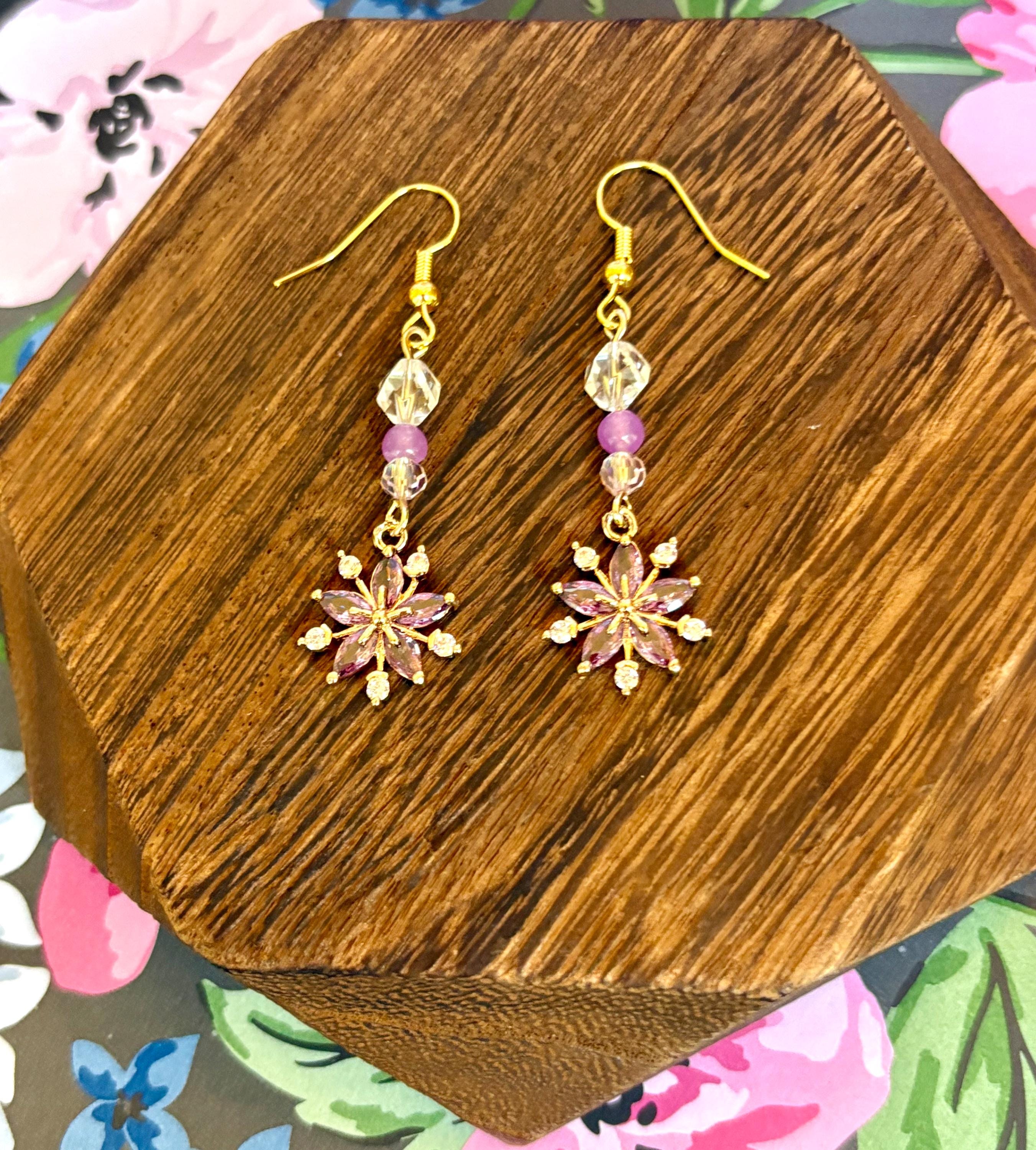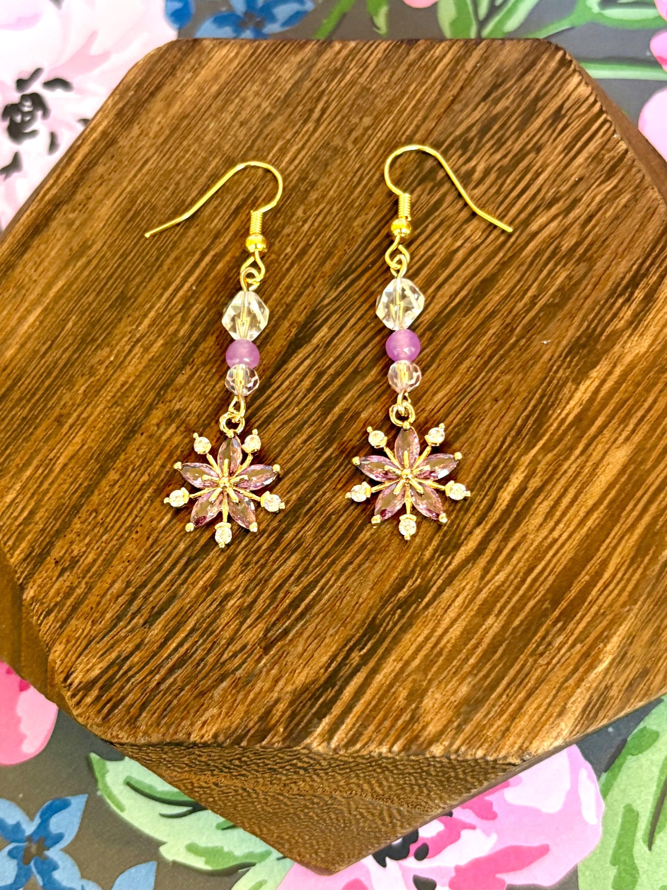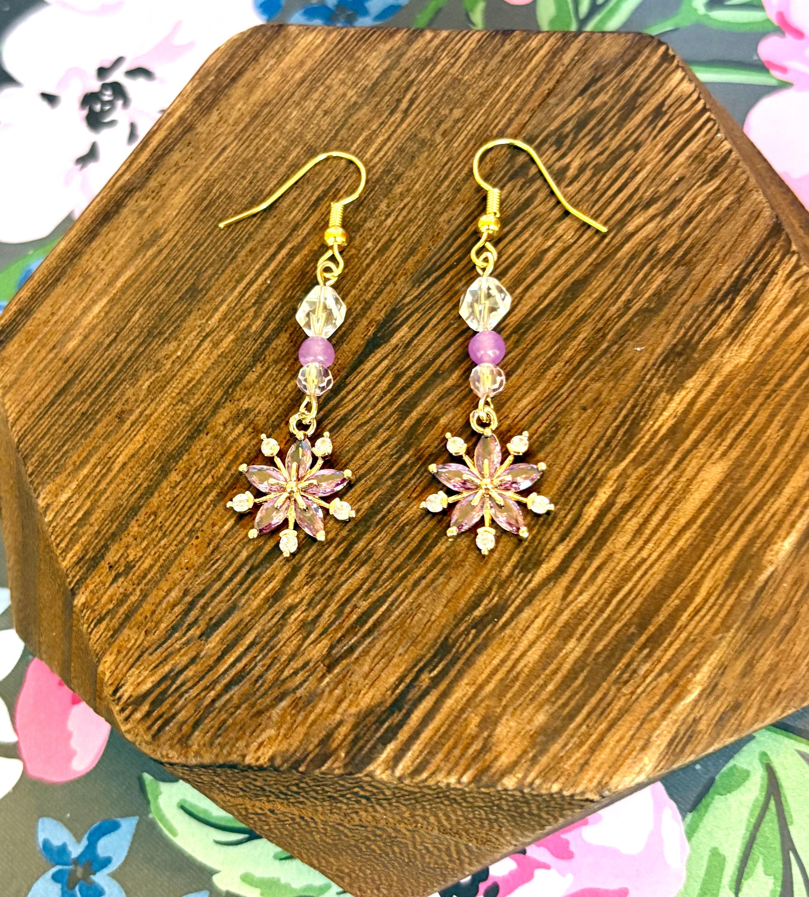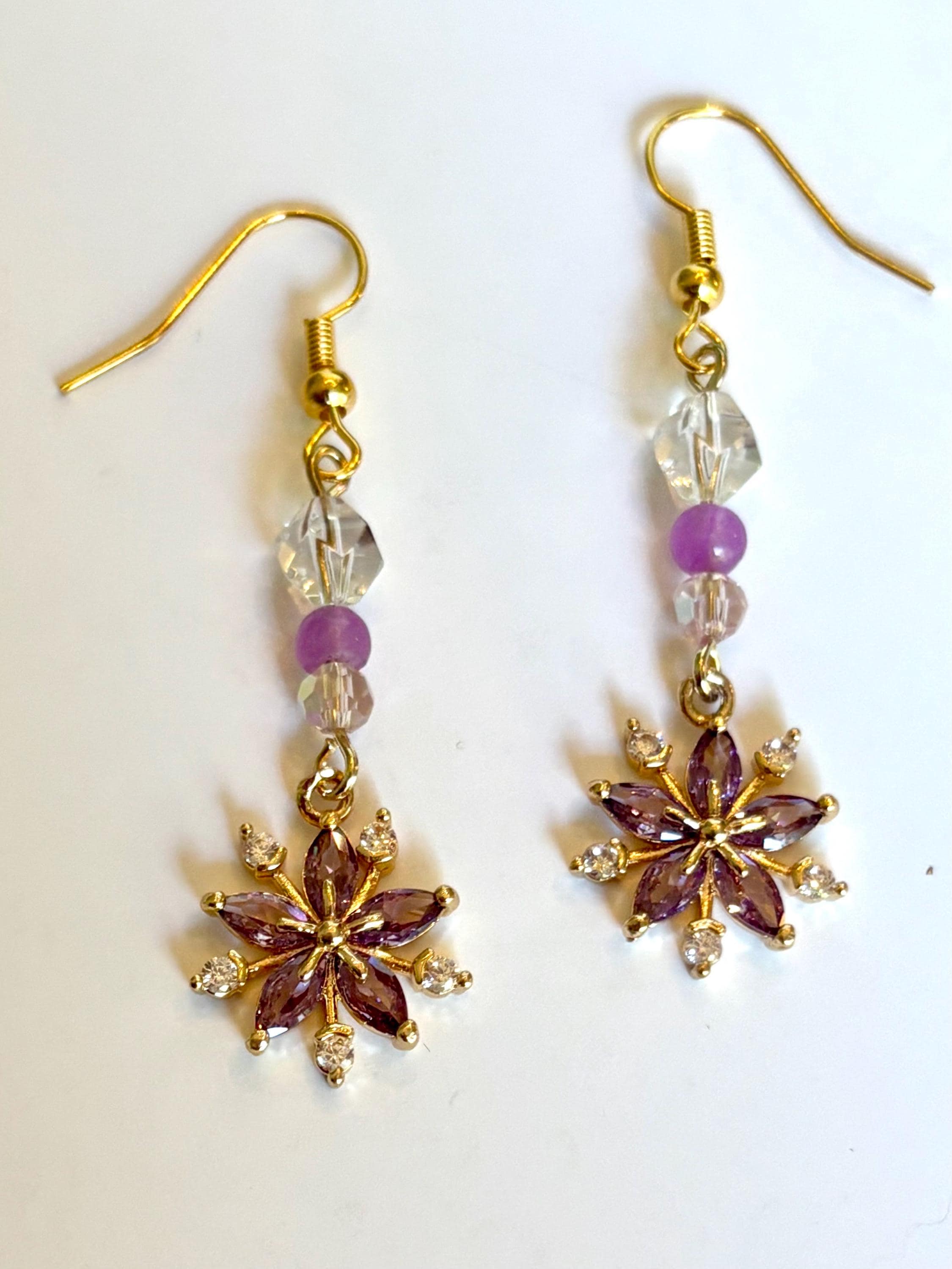 These dazzling handmade earrings feature 316L surgical stainless steel hypoallergenic gold-tone ear wires, star-cut faceted clear quartz gemstones, lavender chalcedony beads, and faceted pink crystals that dance with light. The centerpiece — purple and clear cubic zirconia snowflake charms — sparkle like twinkling petals in freshly fallen snow, making them perfect for festive gatherings, winter weddings, or simply adding a radiant touch to your day.