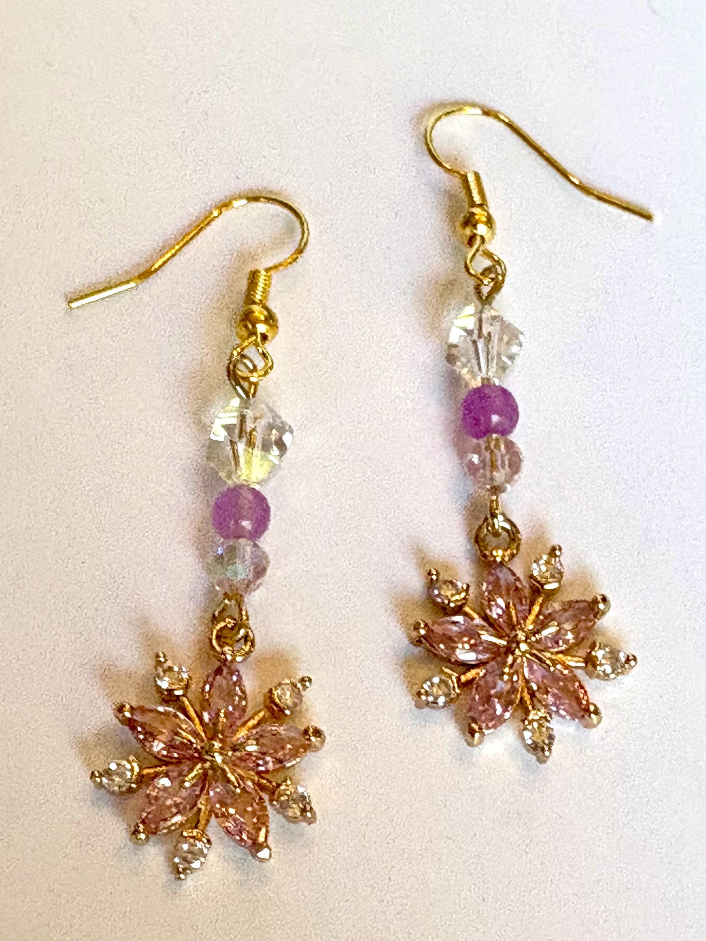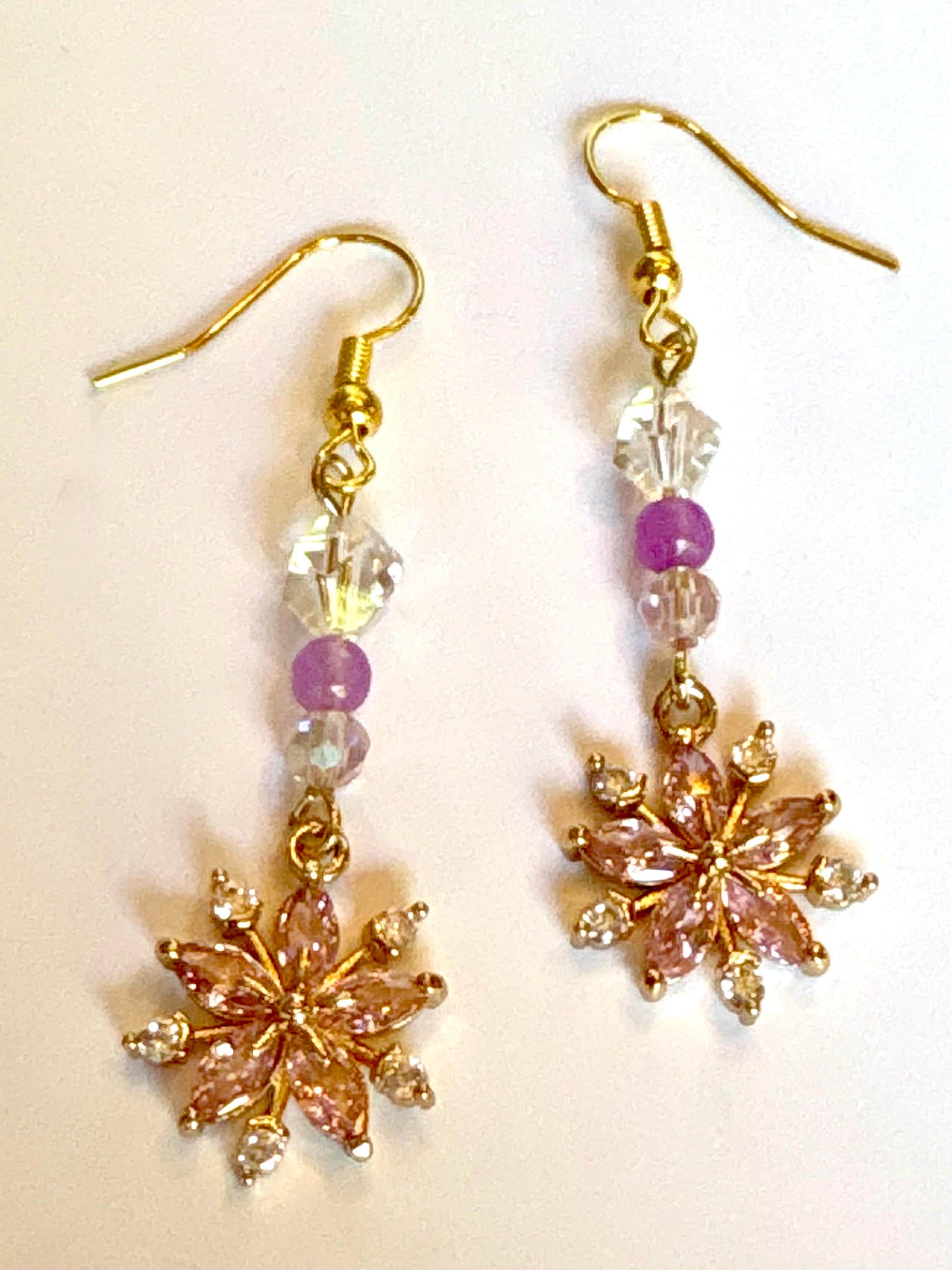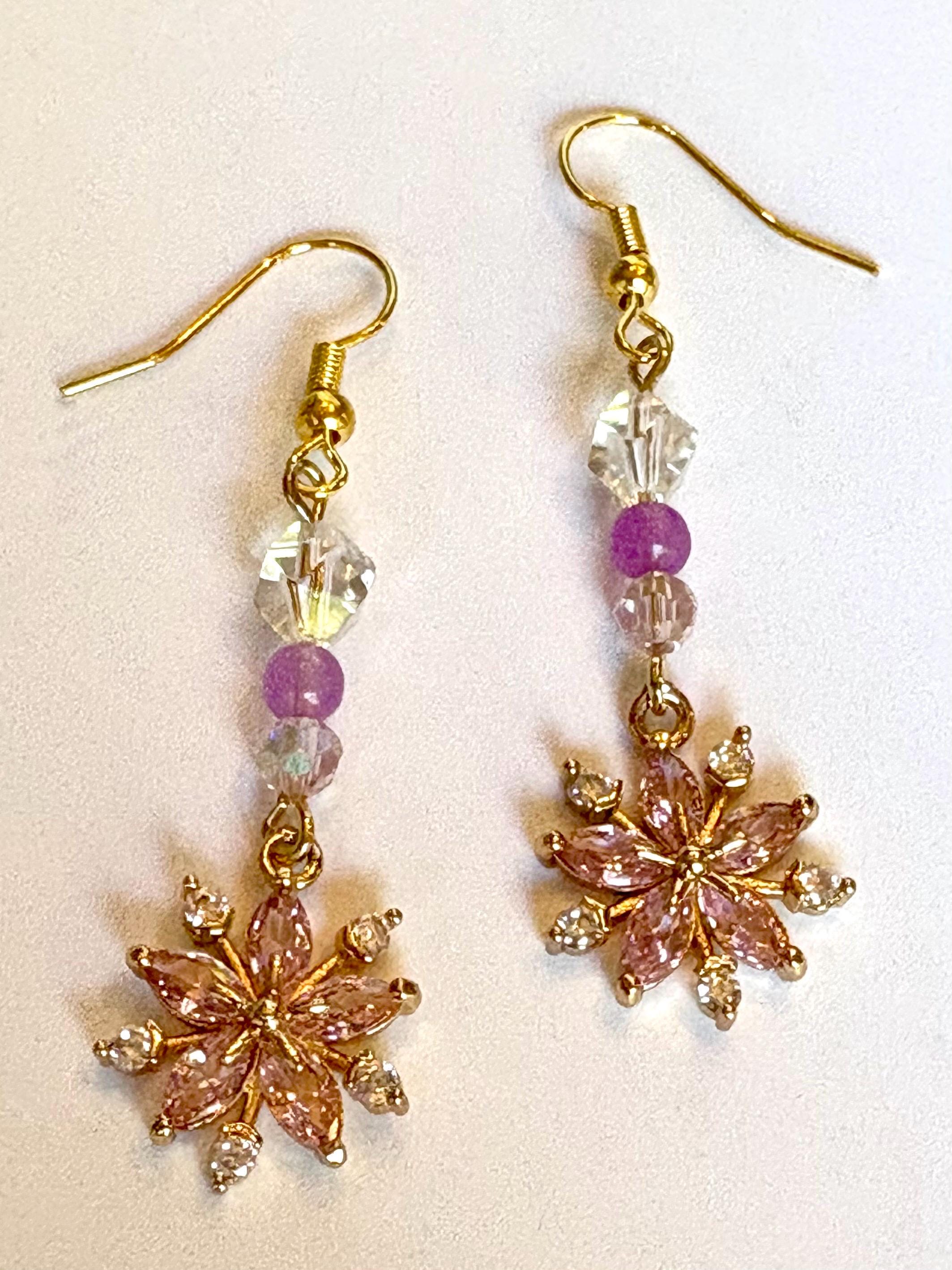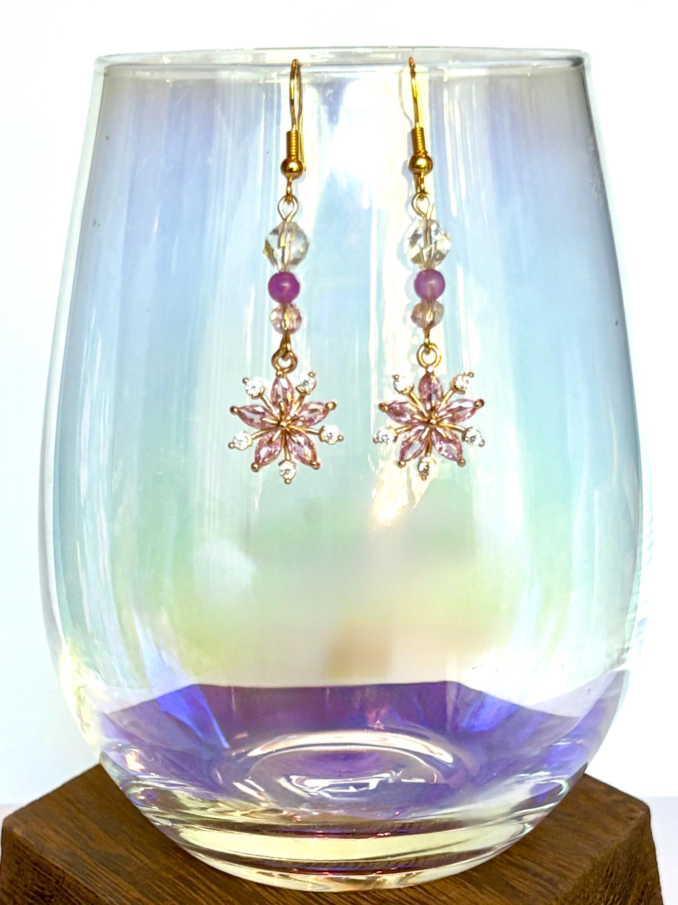 These dazzling handmade earrings feature 316L surgical stainless steel hypoallergenic gold-tone ear wires, star-cut faceted clear quartz gemstones, lavender chalcedony beads, and faceted pink crystals that dance with light. The centerpiece — purple and clear cubic zirconia snowflake charms — sparkle like twinkling petals in freshly fallen snow, making them perfect for festive gatherings, winter weddings, or simply adding a radiant touch to your day.