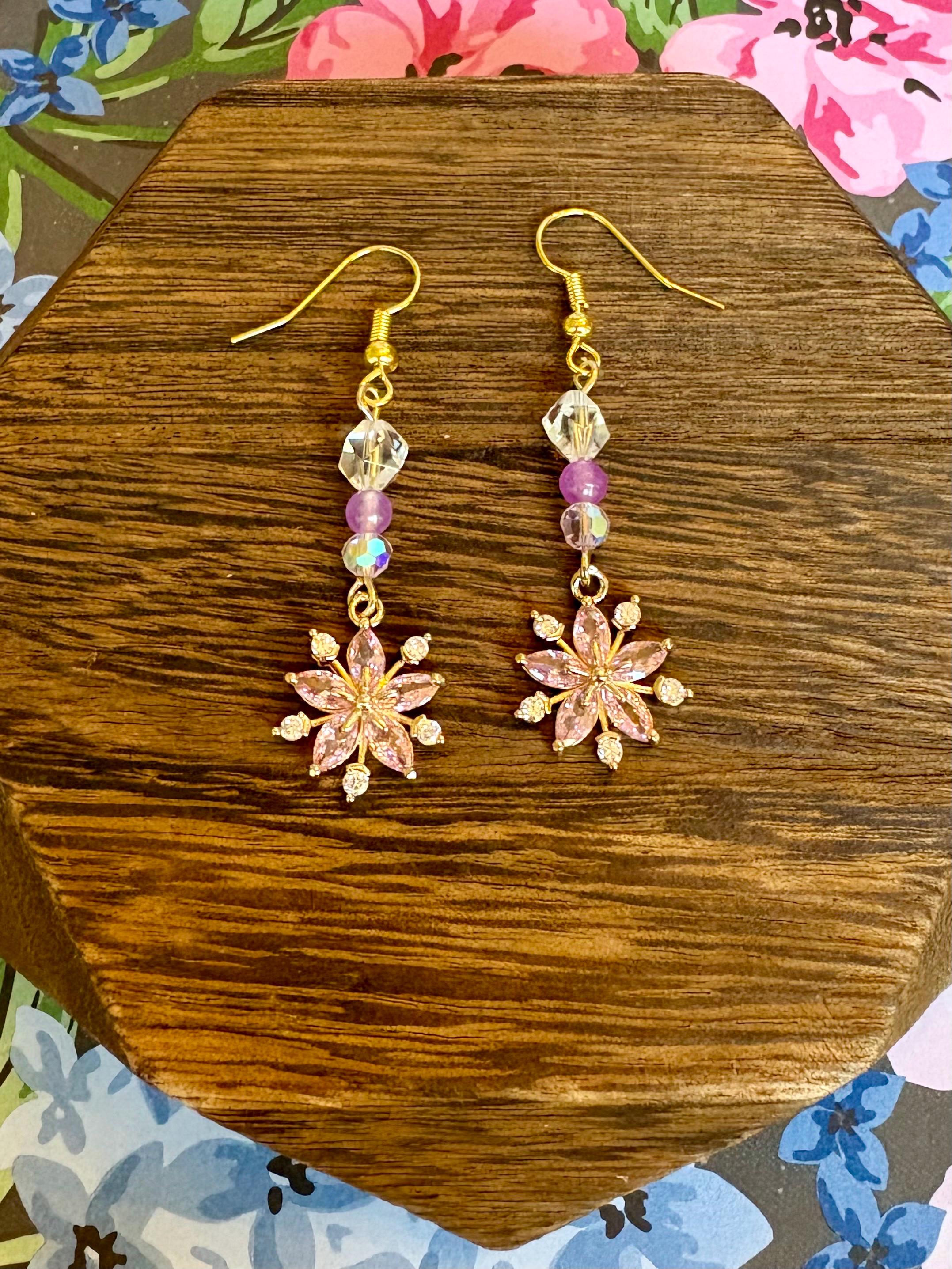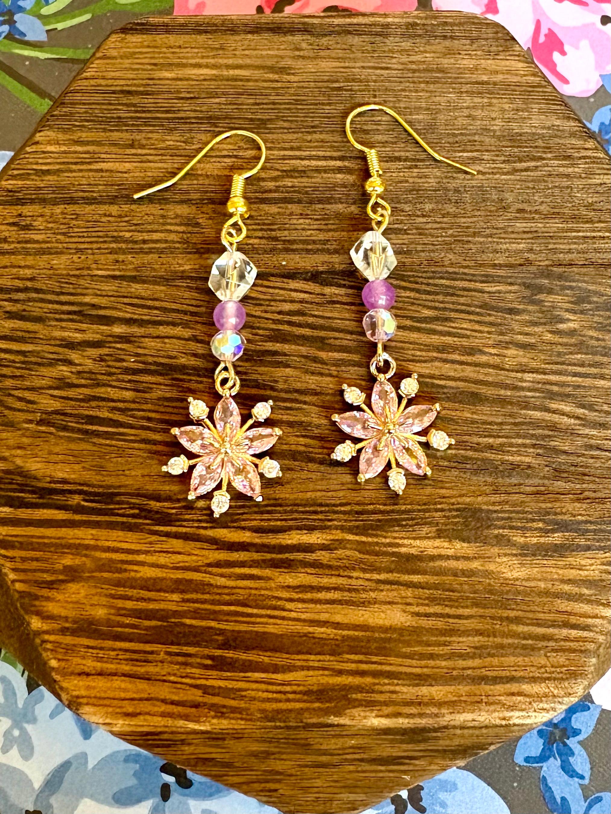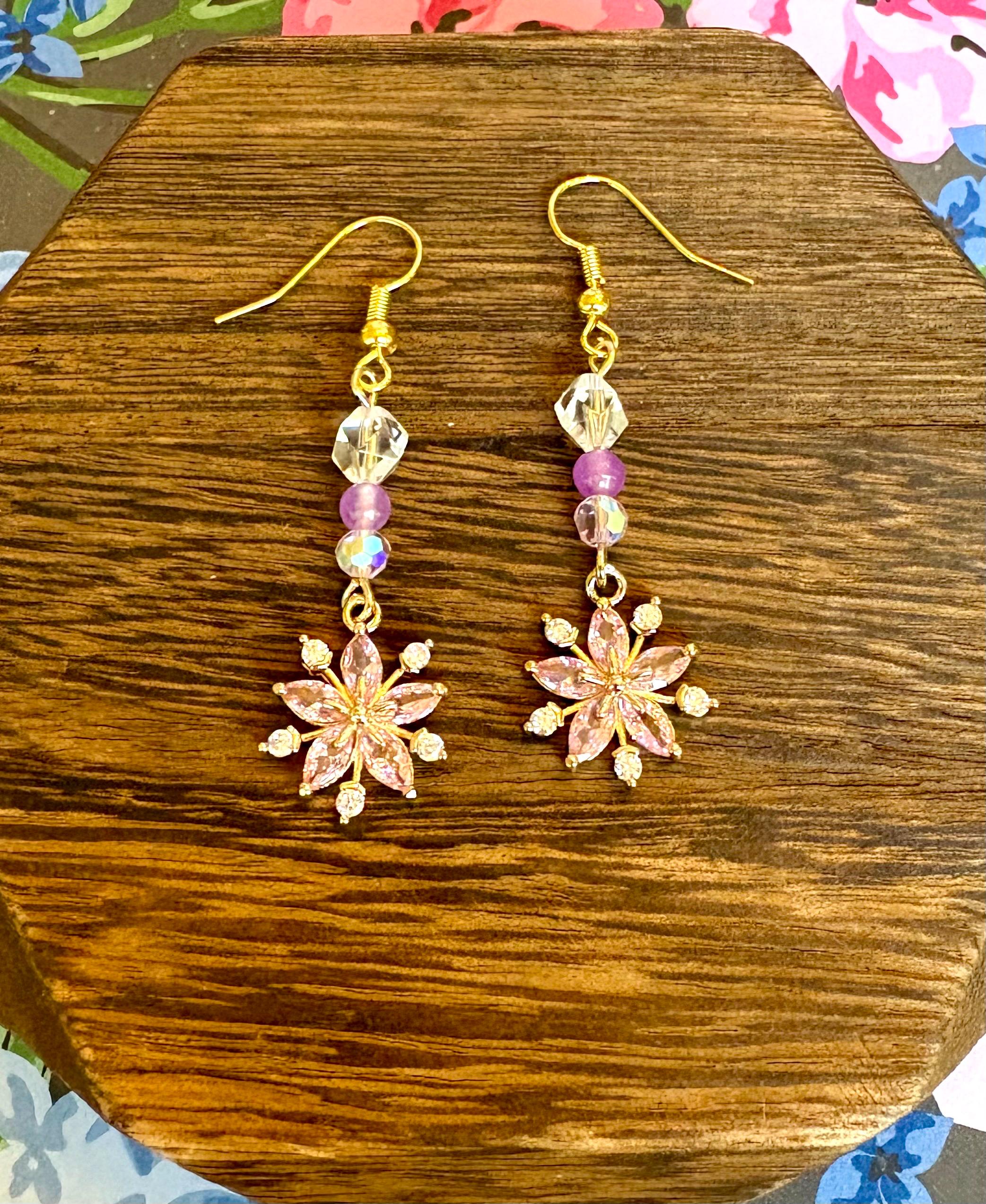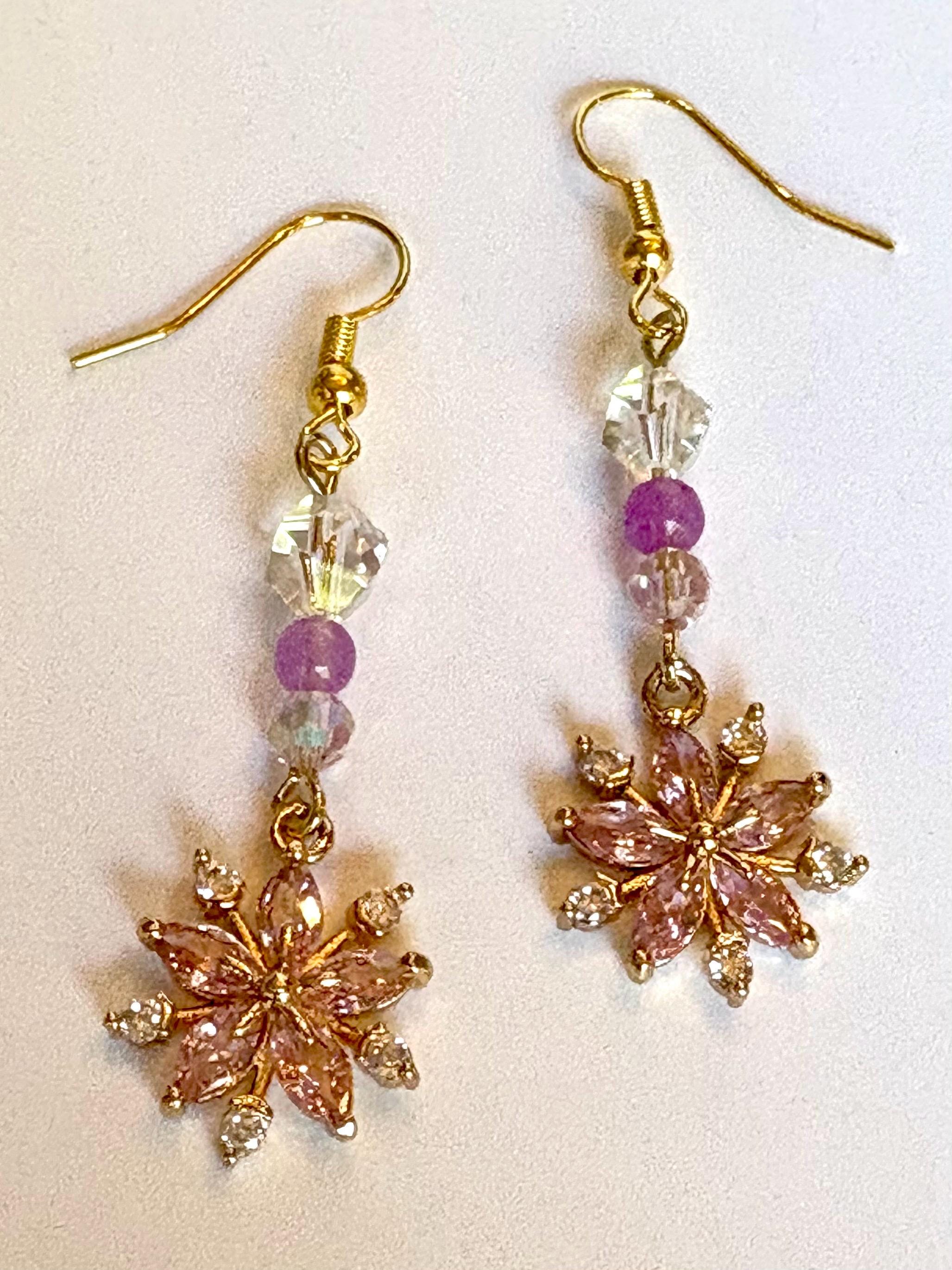 These dazzling handmade earrings feature 316L surgical stainless steel hypoallergenic gold-tone ear wires, star-cut faceted clear quartz gemstones, lavender chalcedony beads, and faceted pink crystals that dance with light. The centerpiece — purple and clear cubic zirconia snowflake charms — sparkle like twinkling petals in freshly fallen snow, making them perfect for festive gatherings, winter weddings, or simply adding a radiant touch to your day.