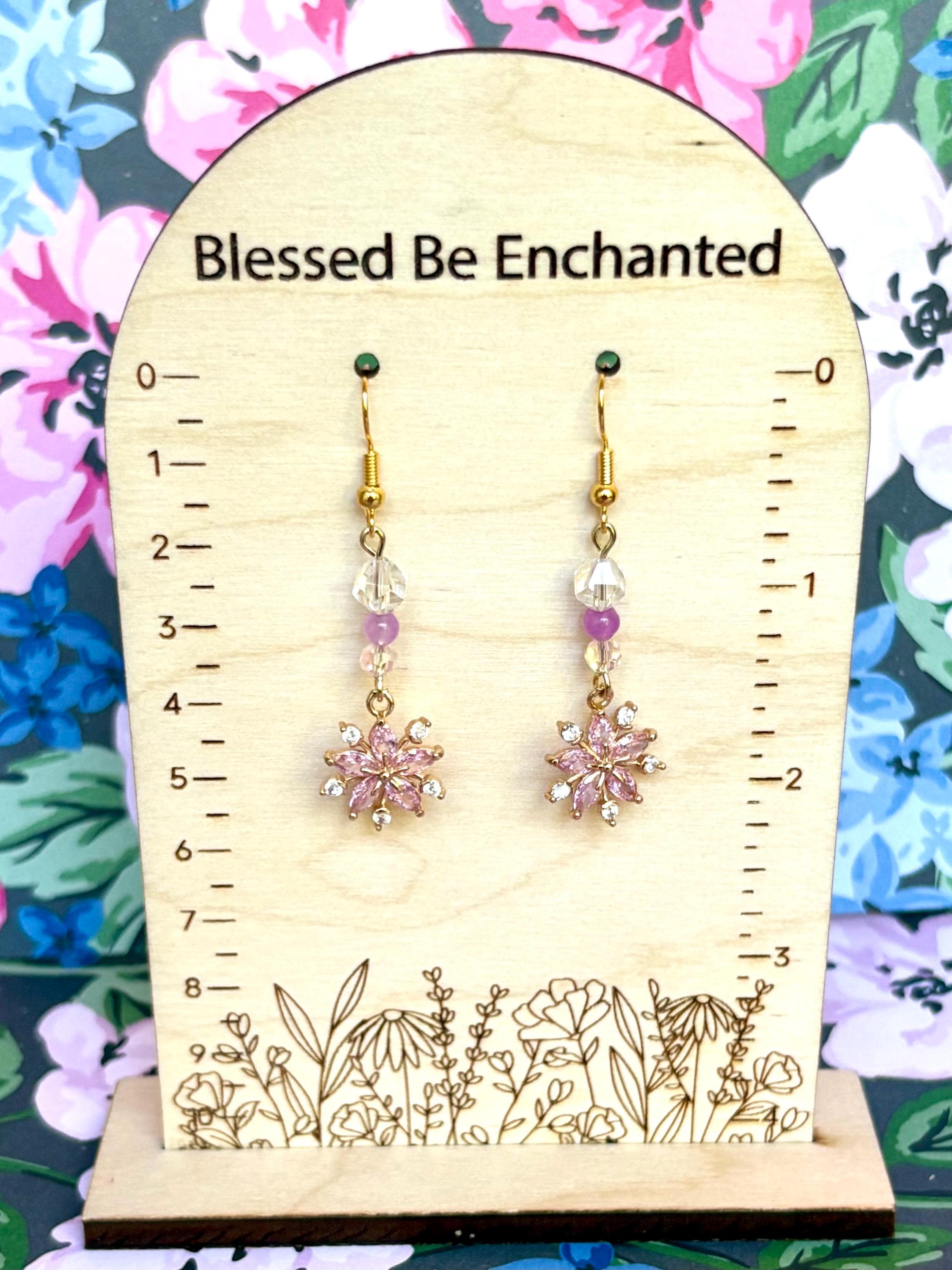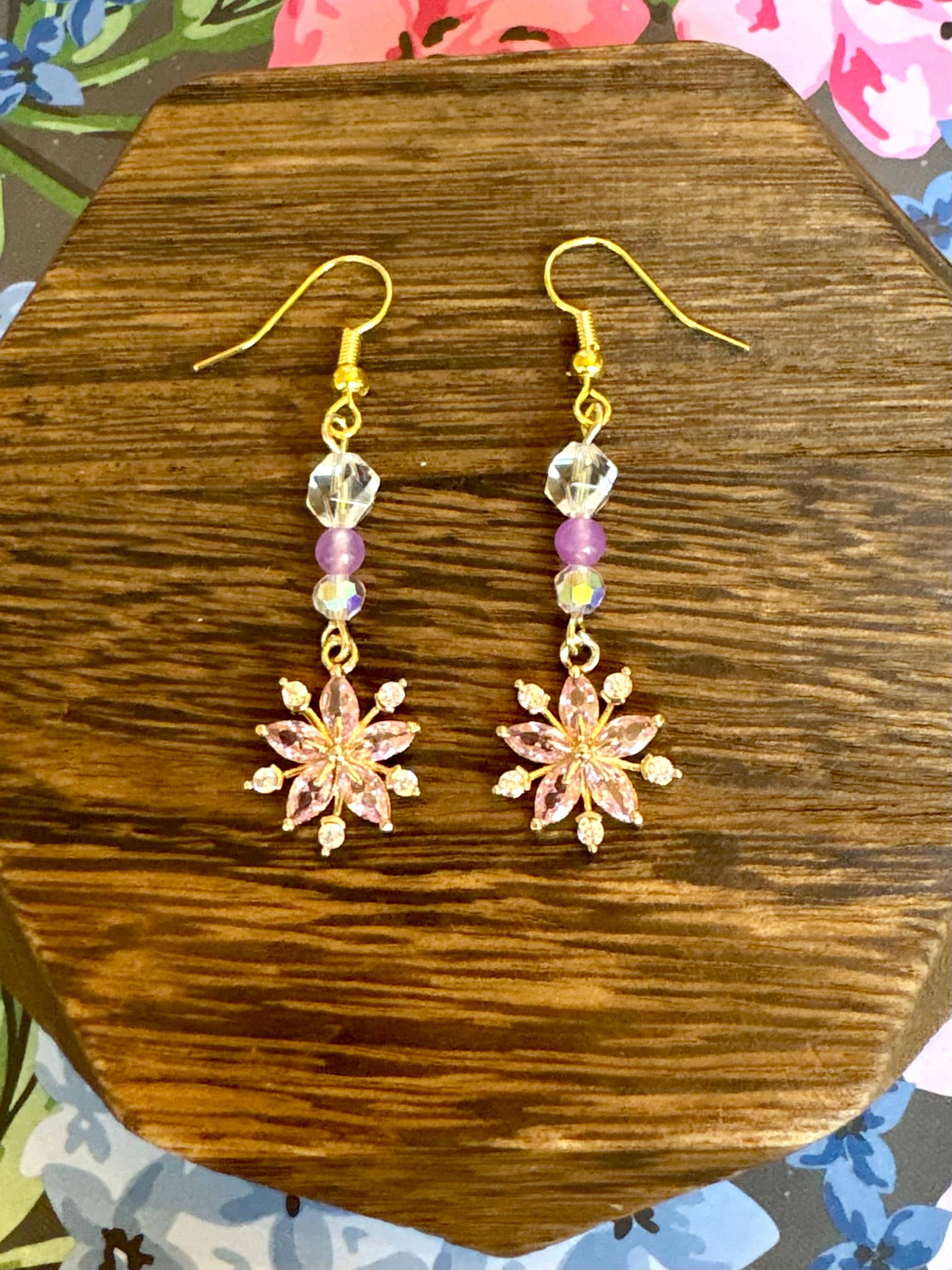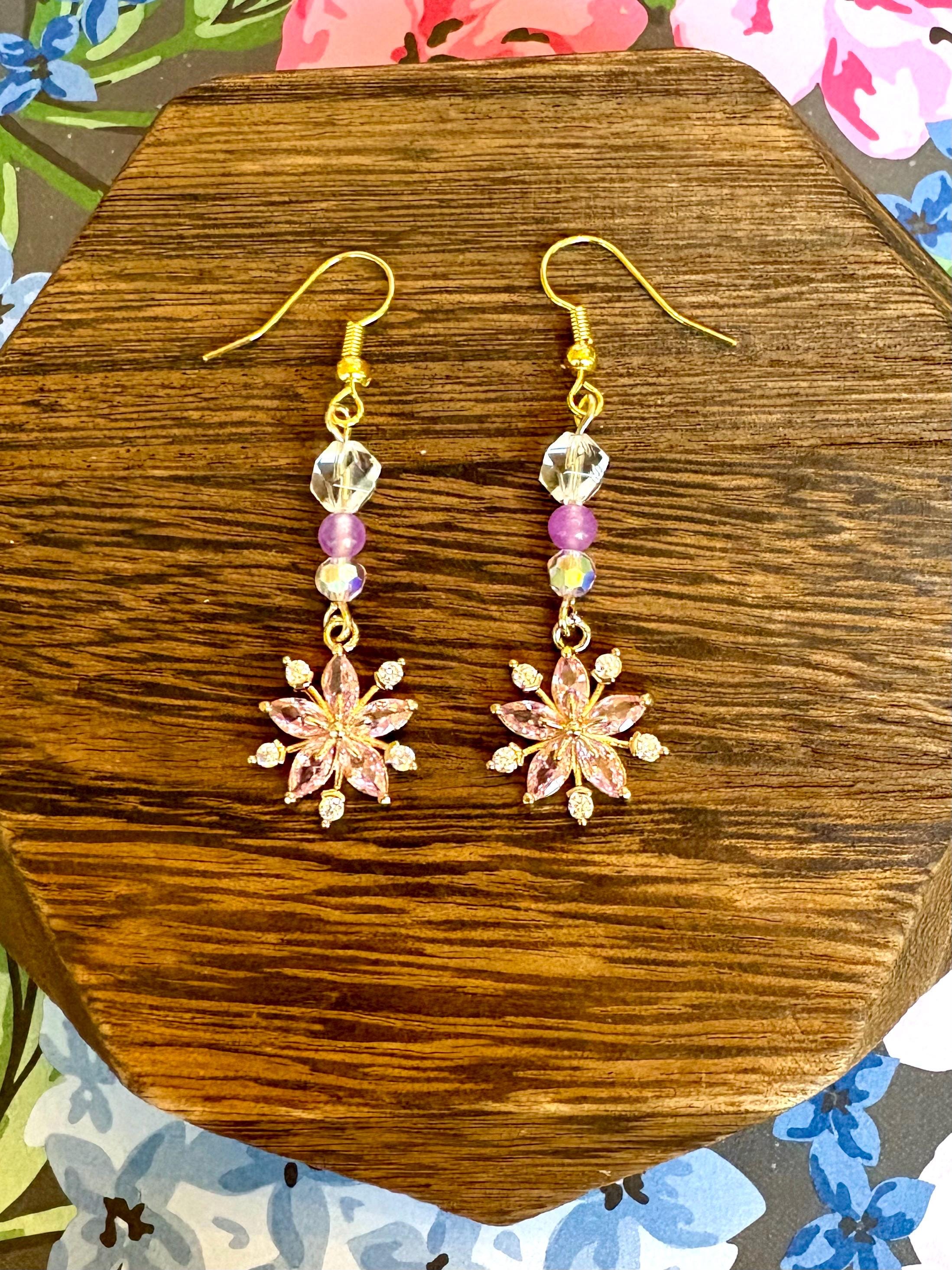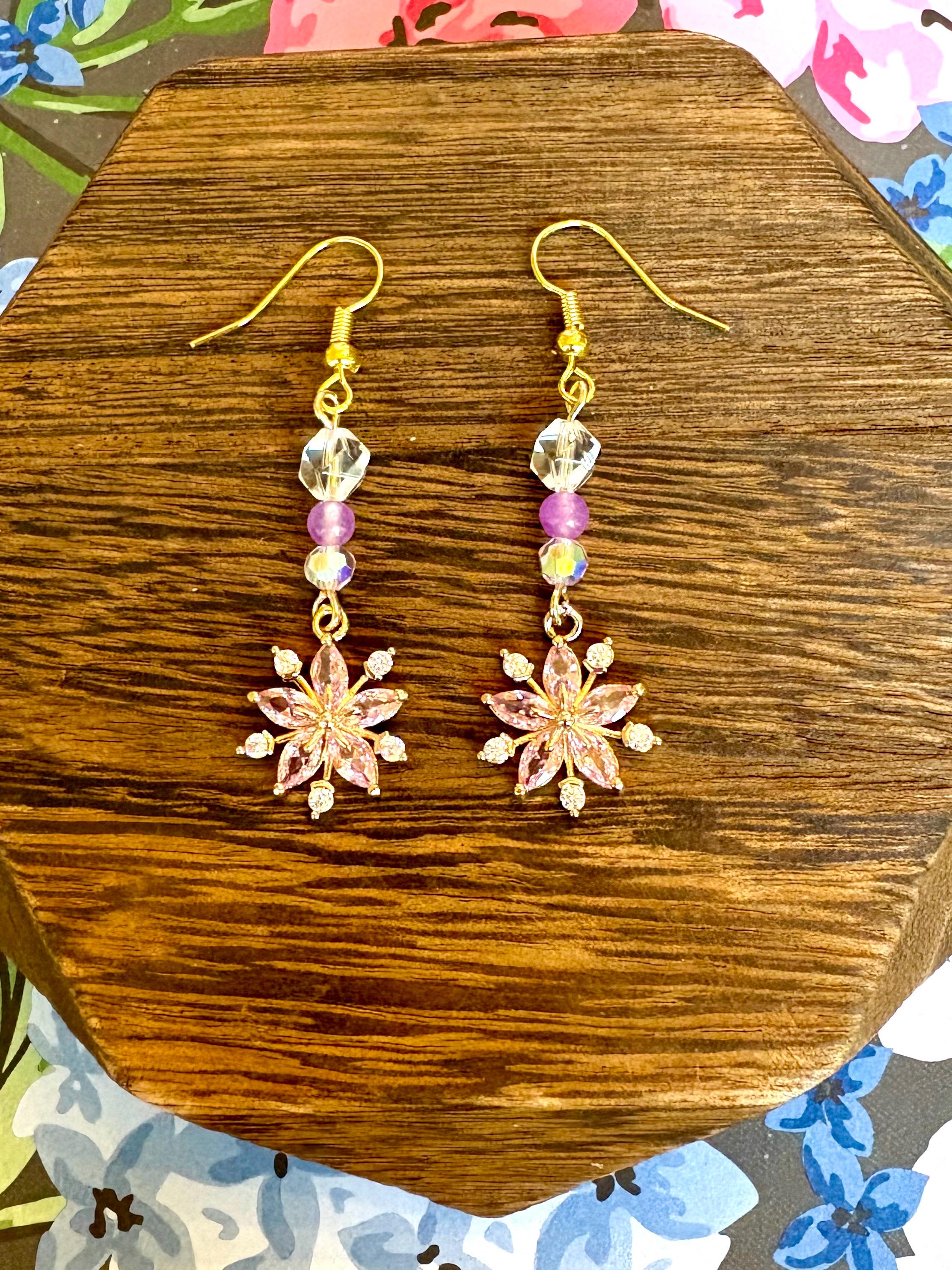 These dazzling handmade earrings feature 316L surgical stainless steel hypoallergenic gold-tone ear wires, star-cut faceted clear quartz gemstones, lavender chalcedony beads, and faceted pink crystals that dance with light. The centerpiece — purple and clear cubic zirconia snowflake charms — sparkle like twinkling petals in freshly fallen snow, making them perfect for festive gatherings, winter weddings, or simply adding a radiant touch to your day.