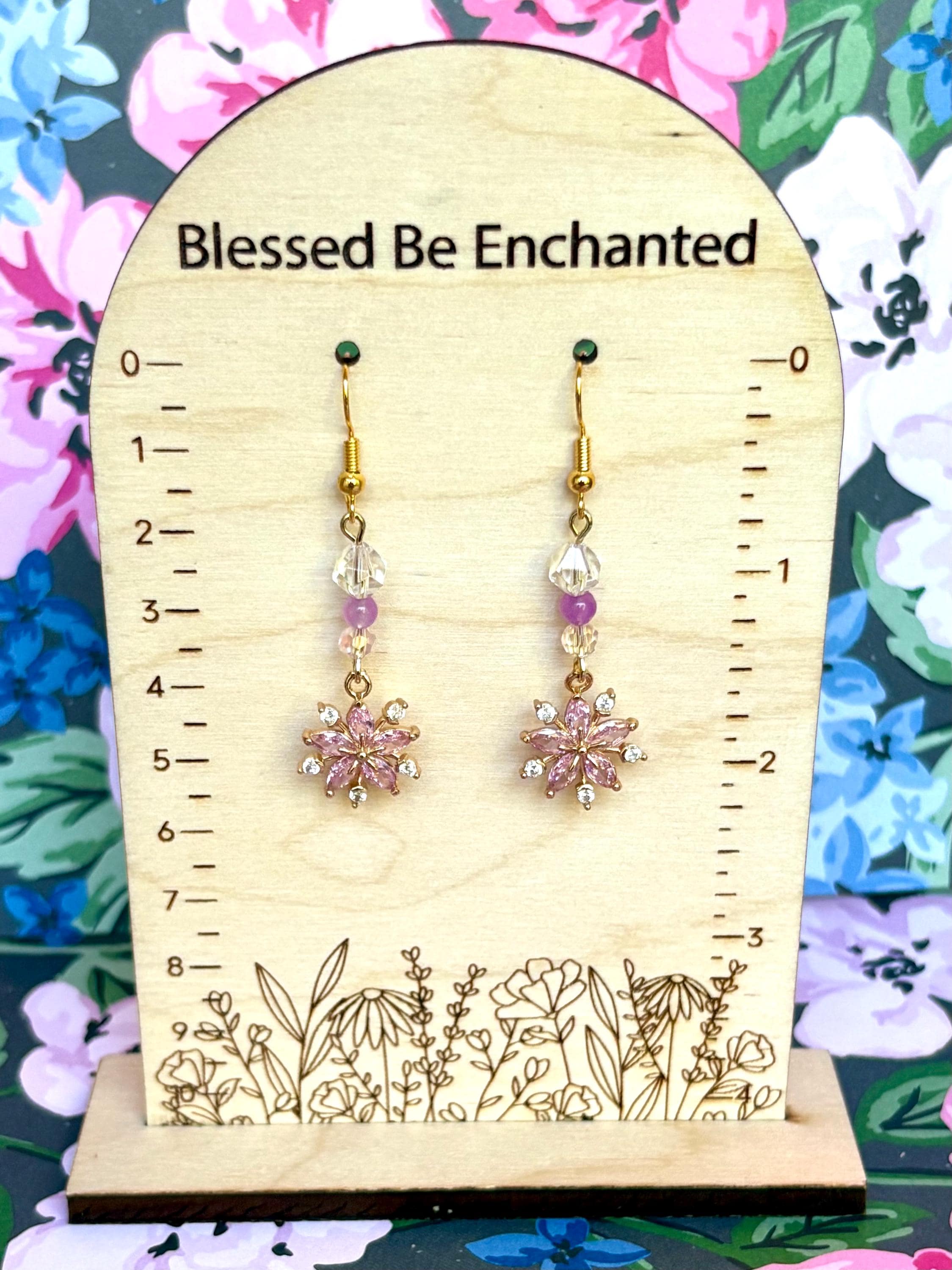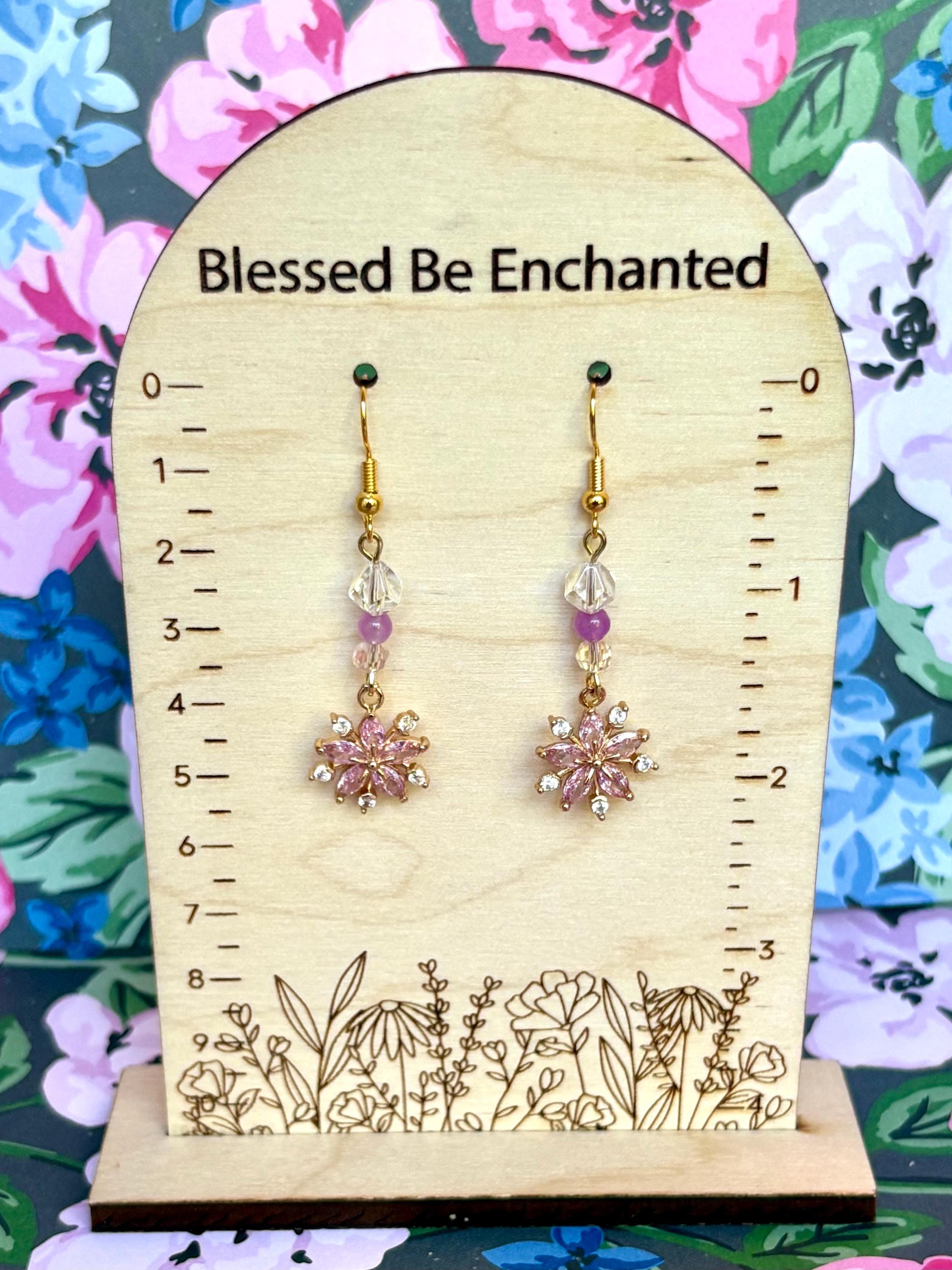 Enchanted Frosted Petal Snowflake Earrings – Clear Quartz, Chalcedony Gemstones, Pink Crystals, Hypoallergenic Holiday Earrings - Pink