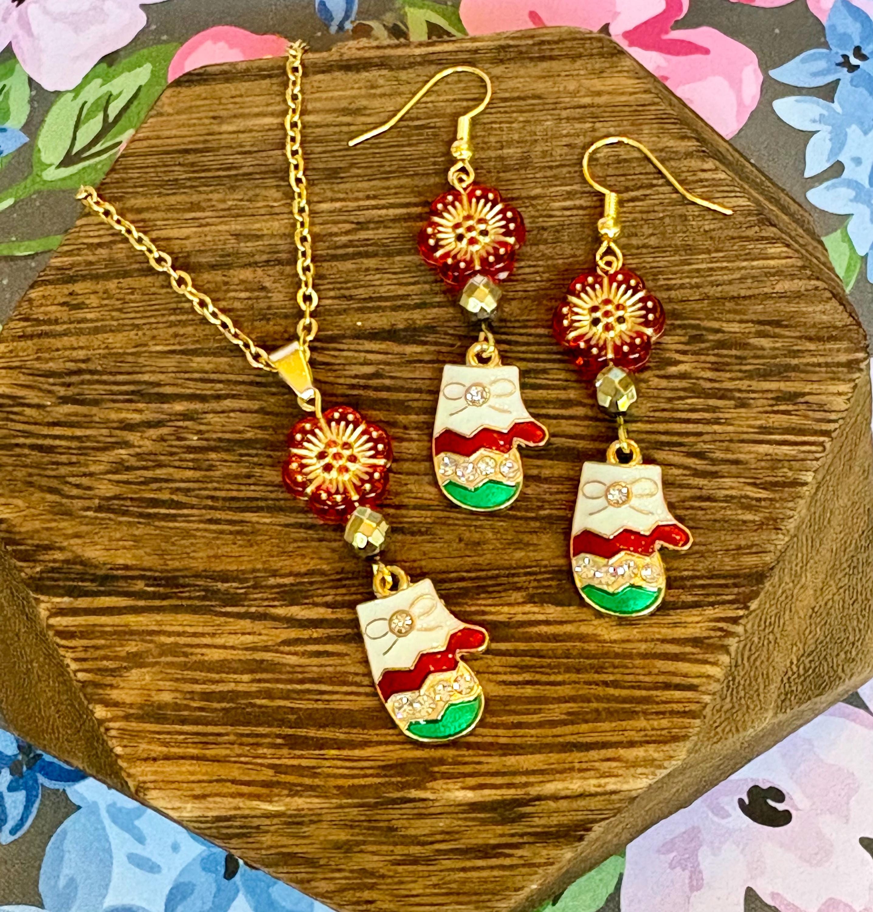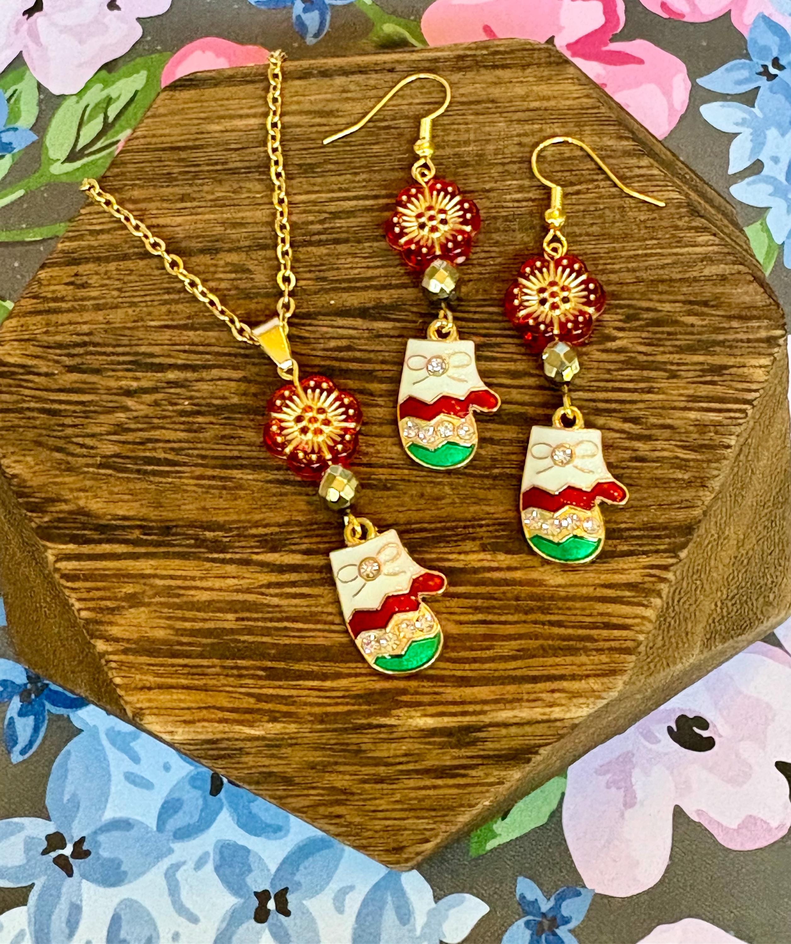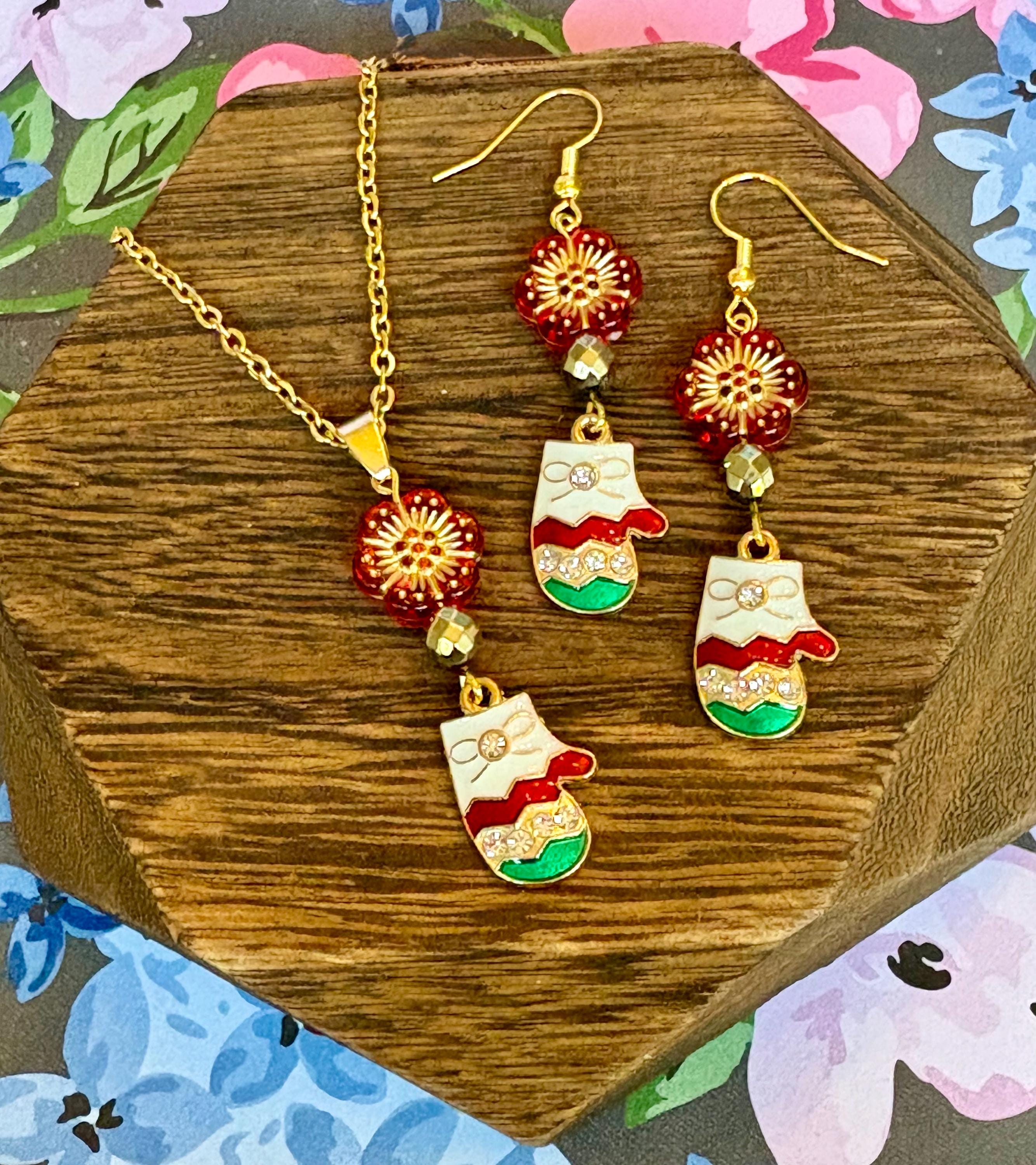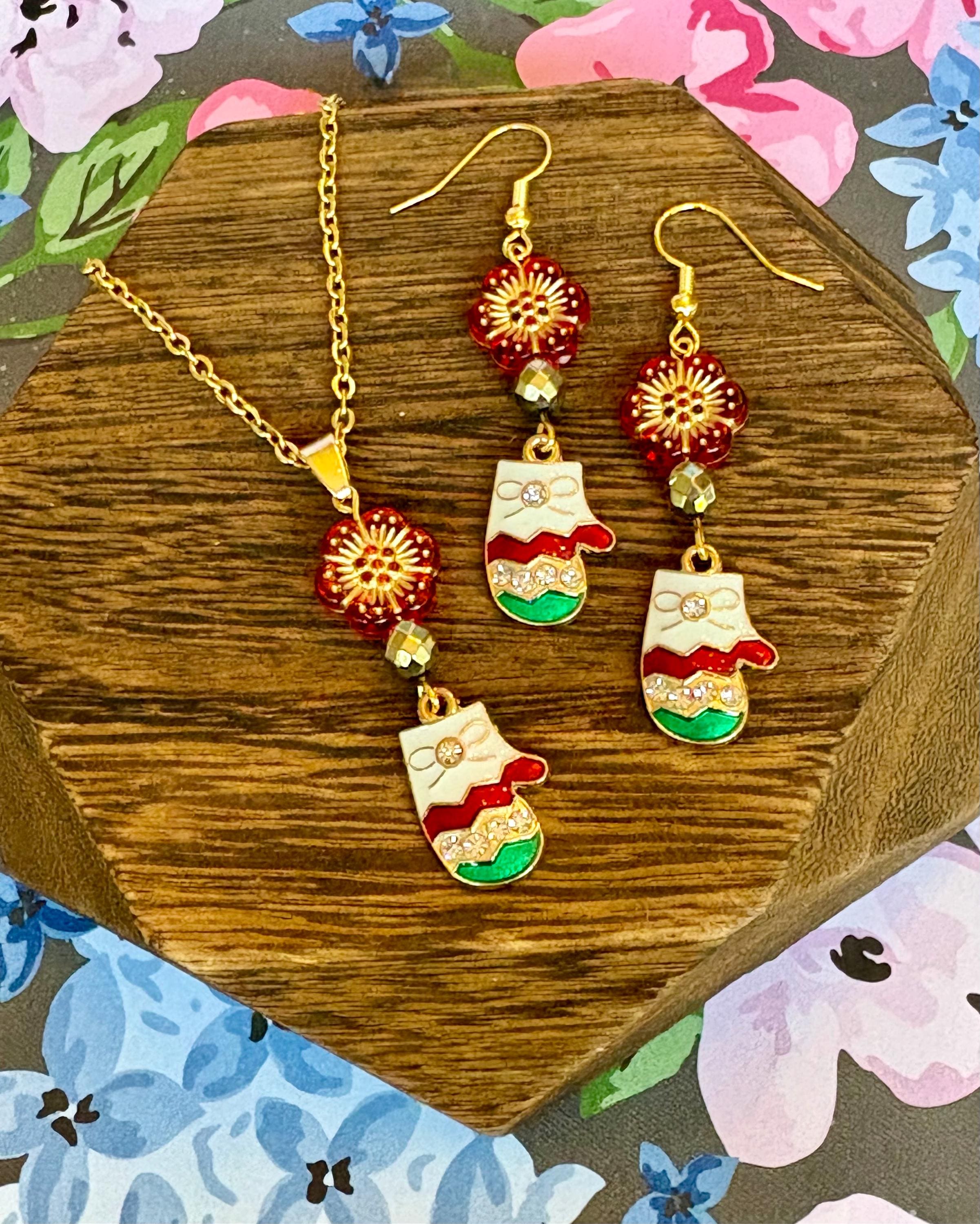 Enchanted Cozy Mitten Sparkle Jewelry Set – Holiday Necklace & Earrings | Gold Hypoallergenic, Red Czech Glass Flowers, Hematite Gemstones