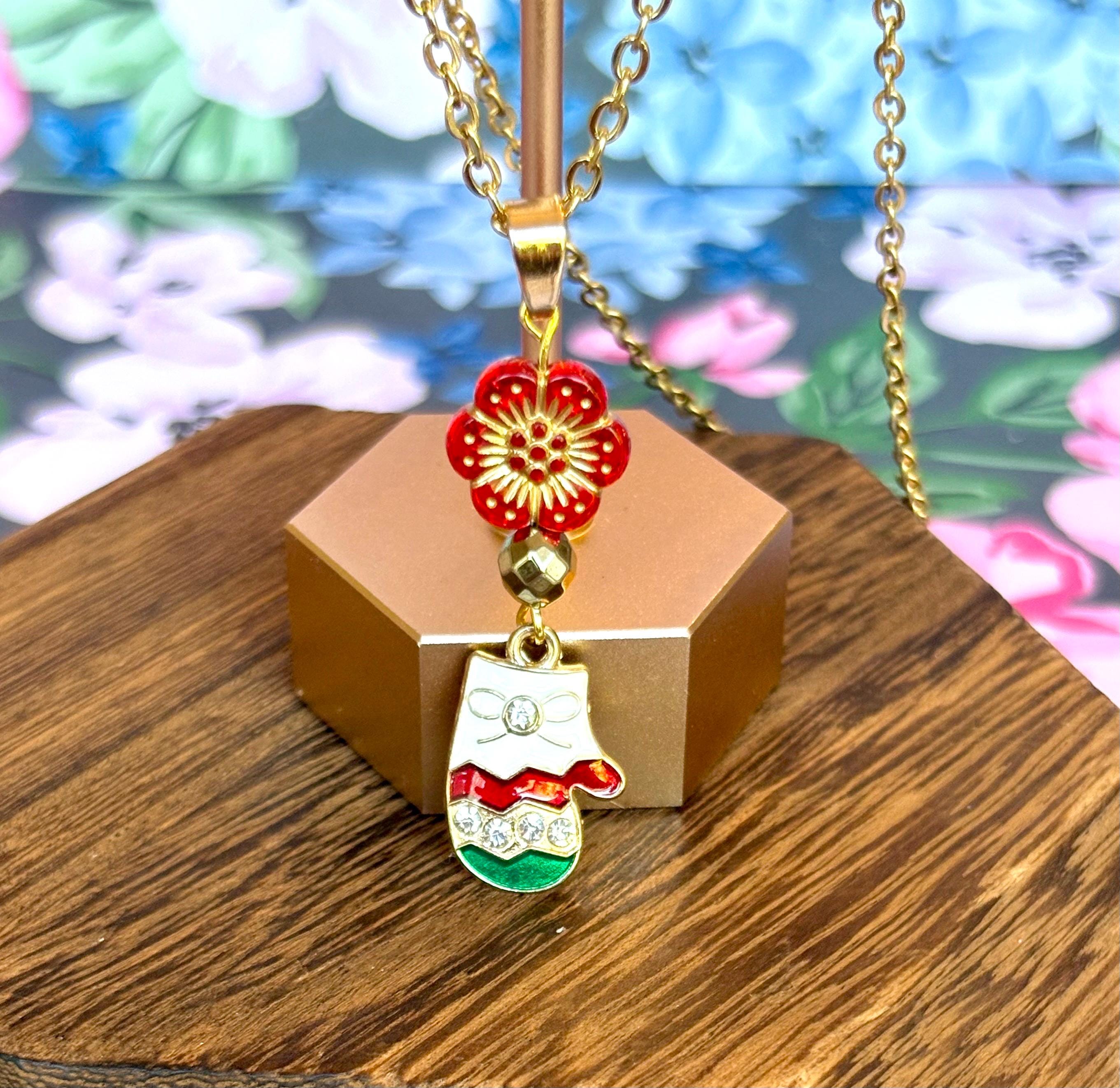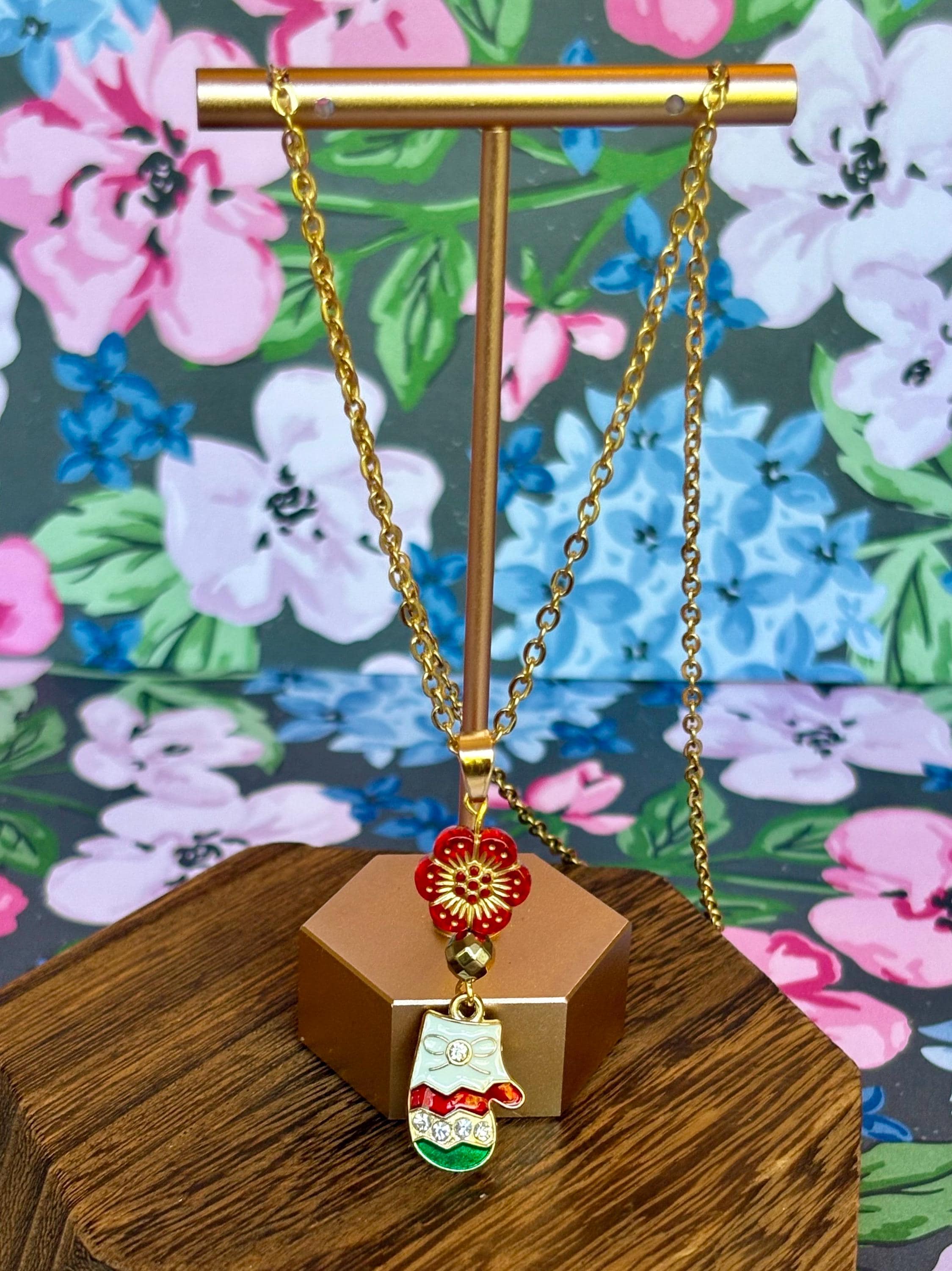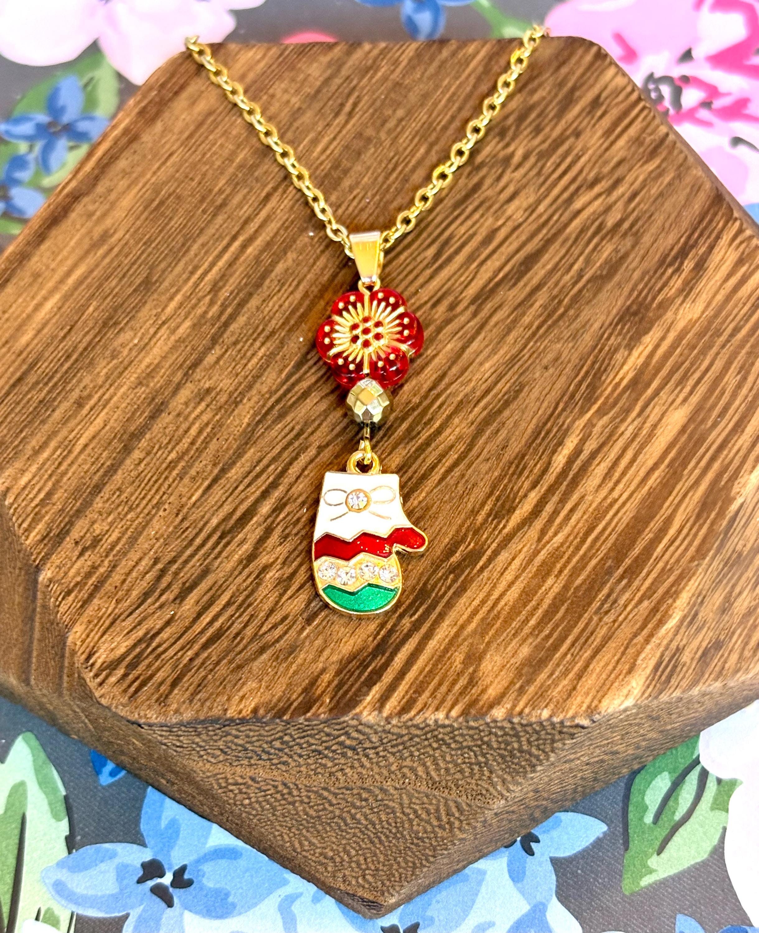 Enchanted Cozy Mitten Sparkle Jewelry Set – Holiday Necklace & Earrings | Gold Hypoallergenic, Red Czech Glass Flowers, Hematite Gemstones