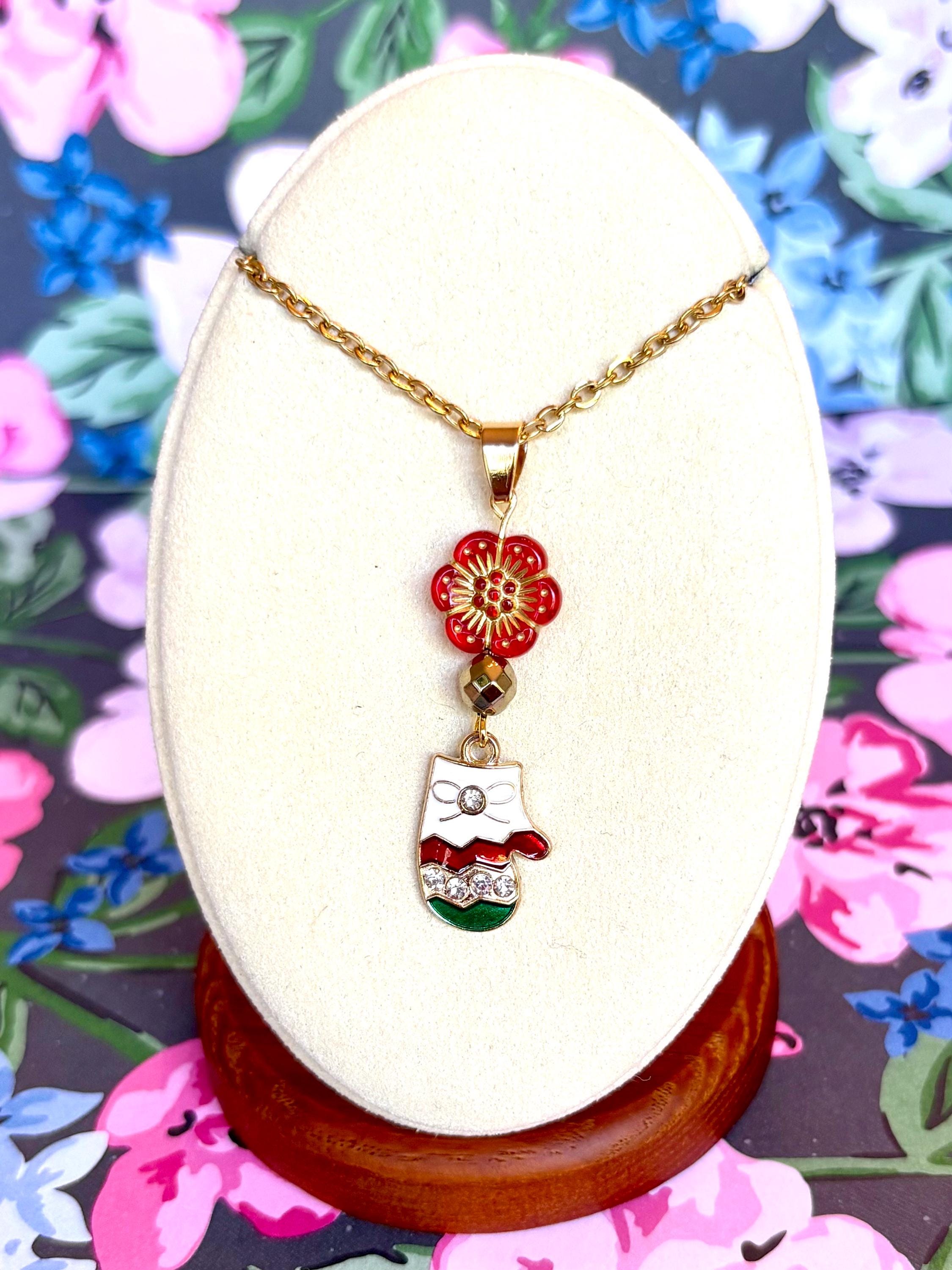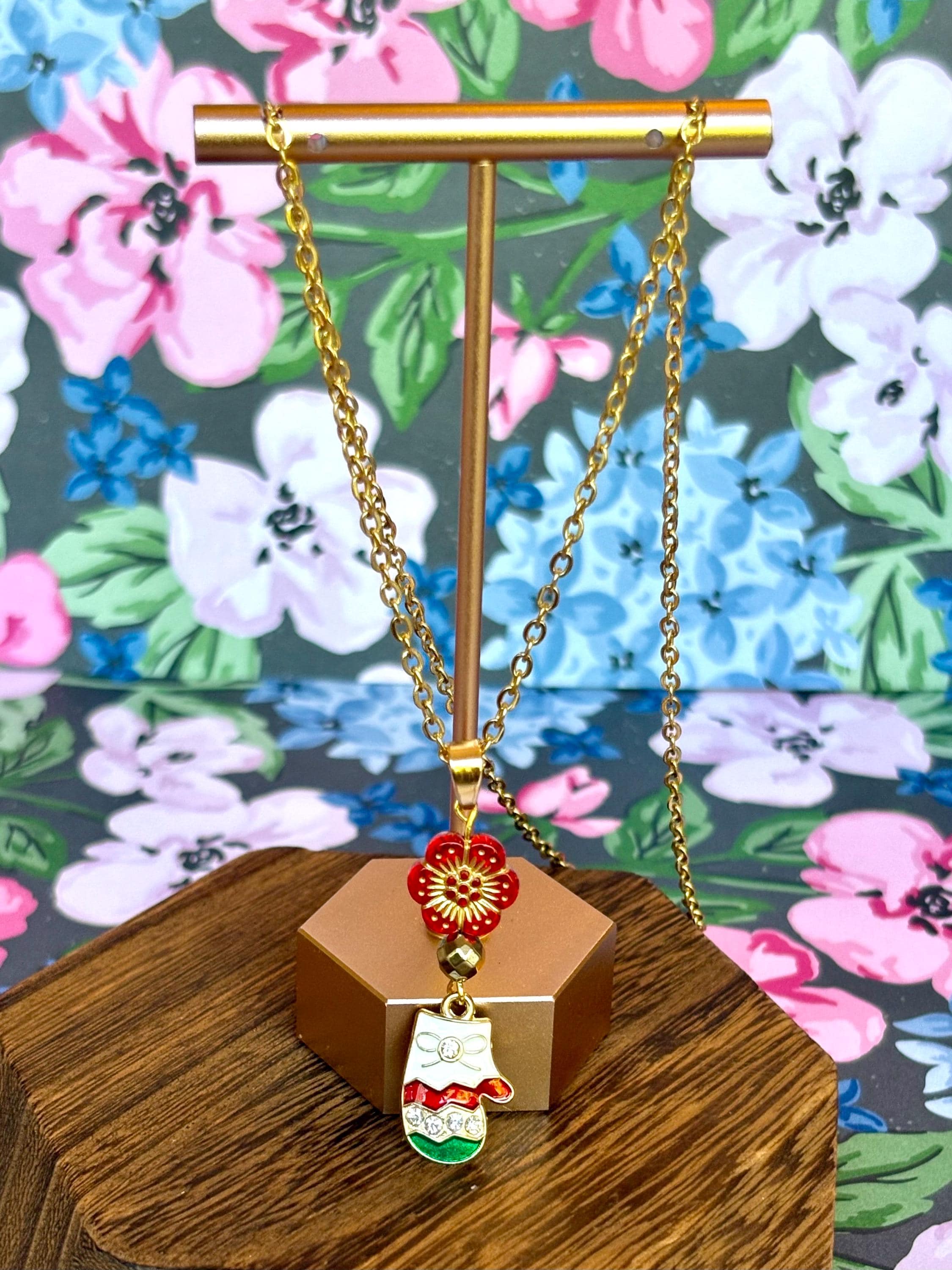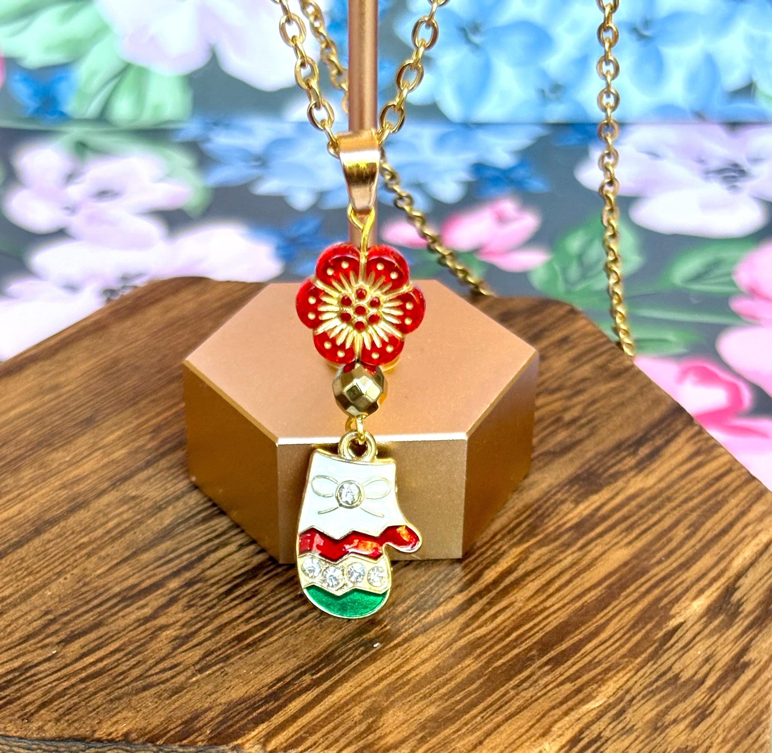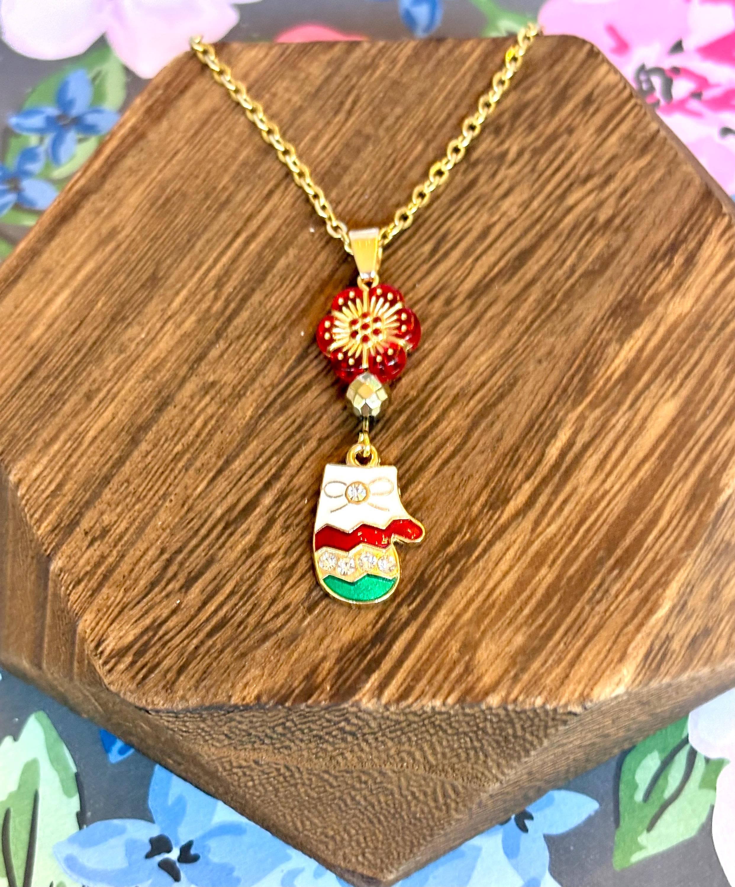 Enchanted Cozy Mitten Sparkle Jewelry Set – Holiday Necklace & Earrings | Gold Hypoallergenic, Red Czech Glass Flowers, Hematite Gemstones