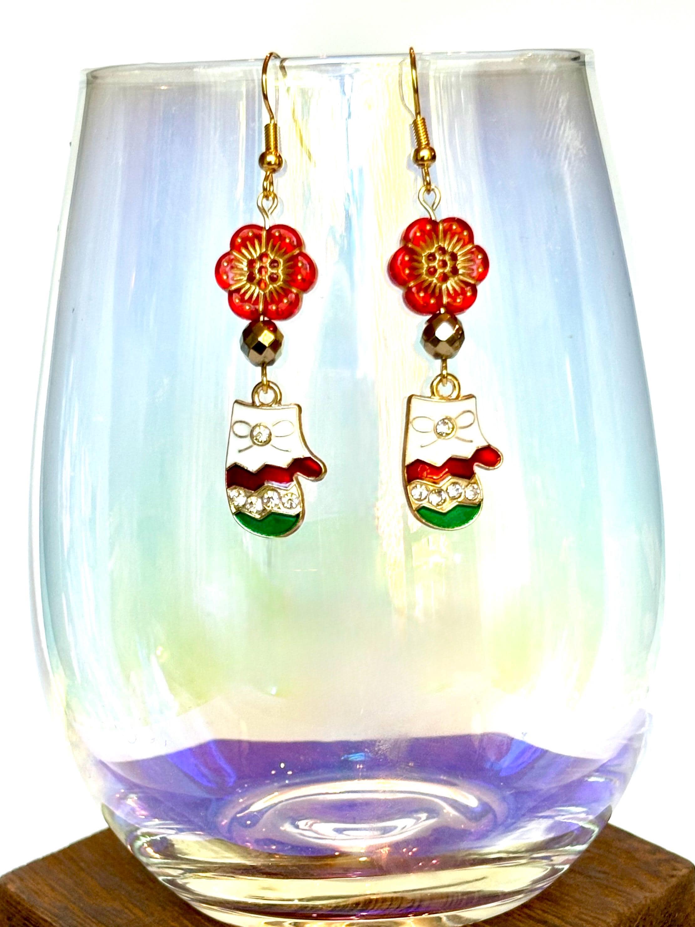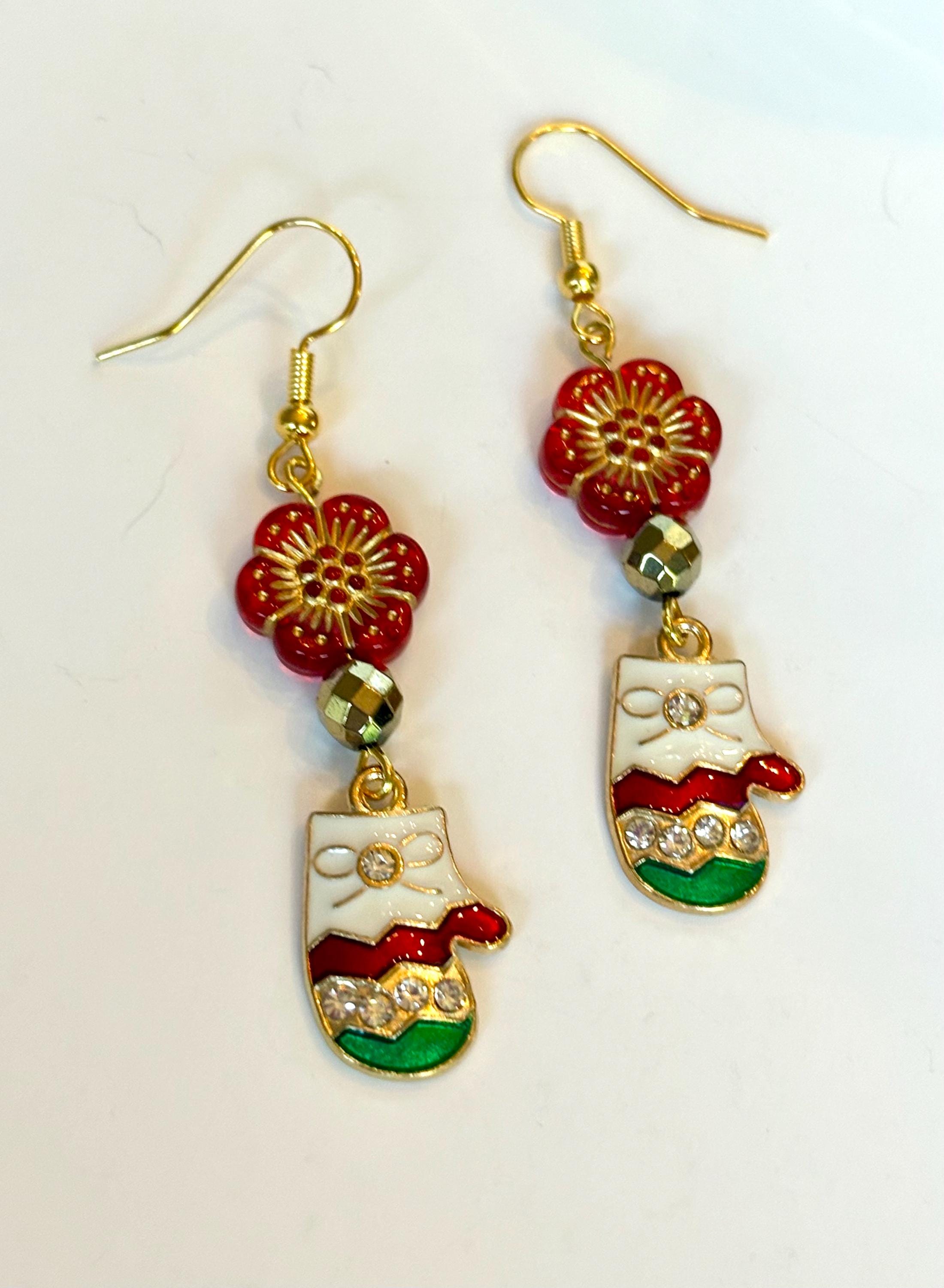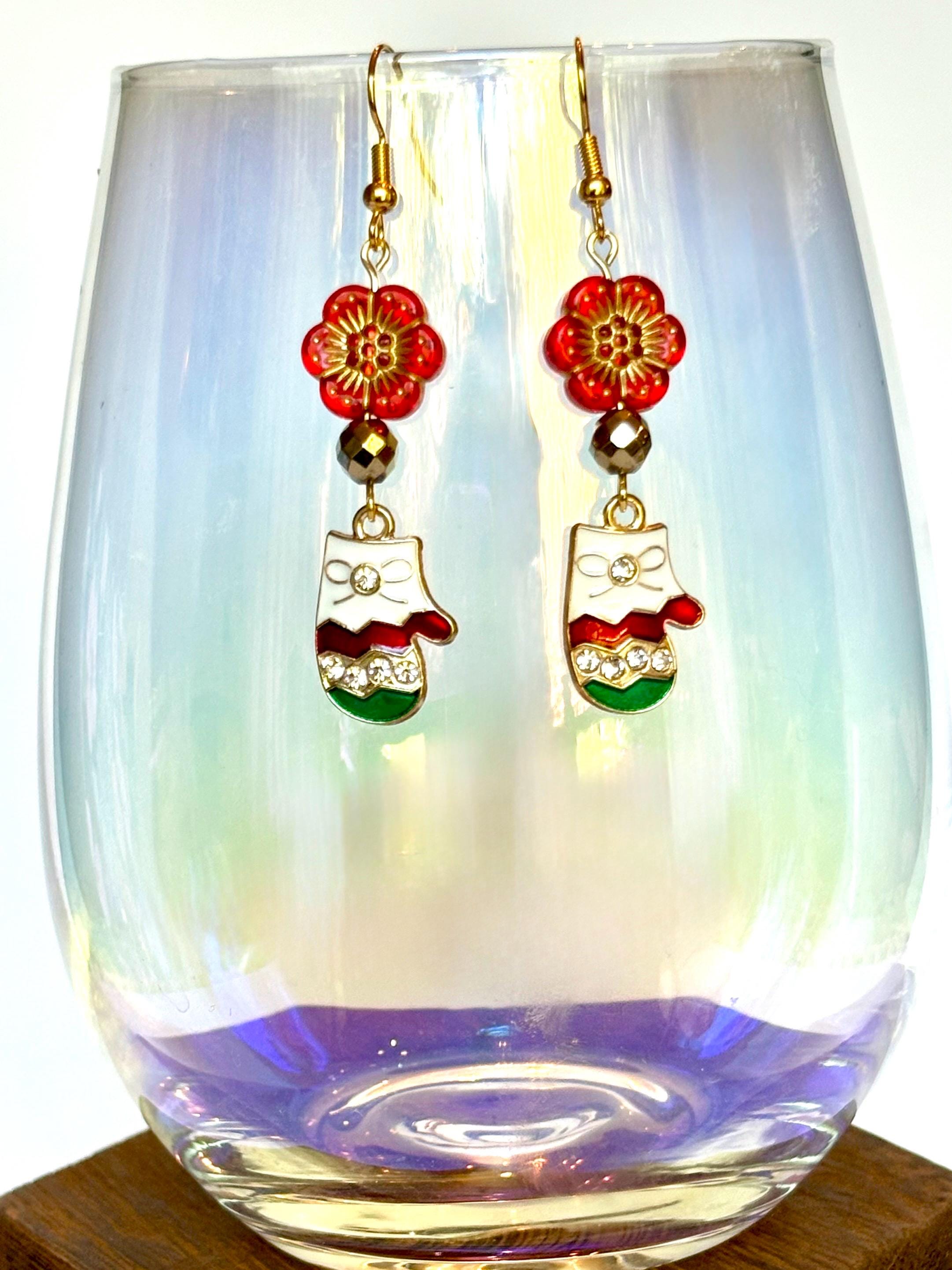 Each piece is accented with Czech glass red flowers with gold wash, faceted gold hematite gemstones, and sparkling enamel mitten charms detailed in red, white, and green for a touch of festive delight. The earrings measure approximately 2.5 inches long, creating a perfect balance of holiday whimsy and elegant shimmer.