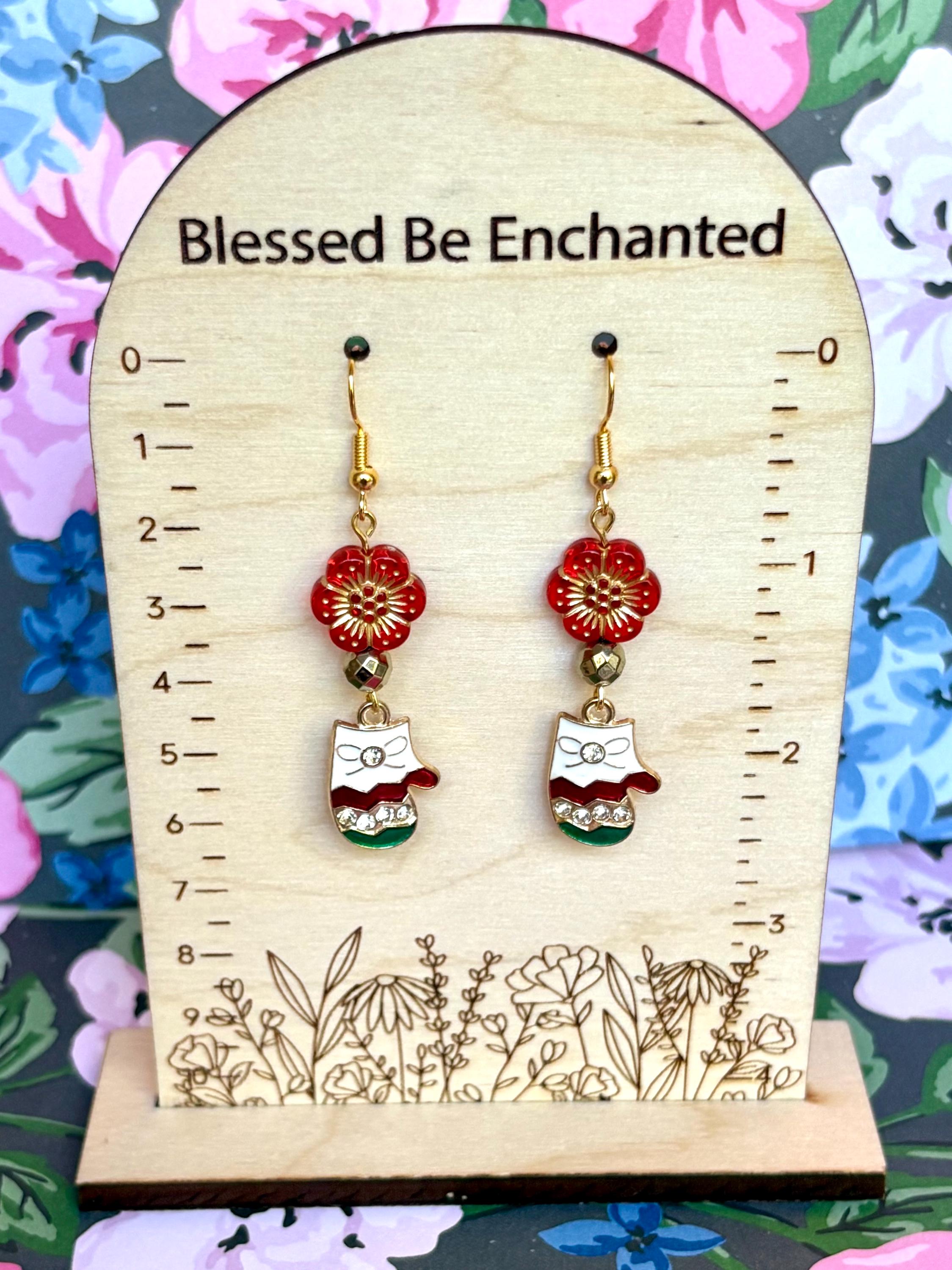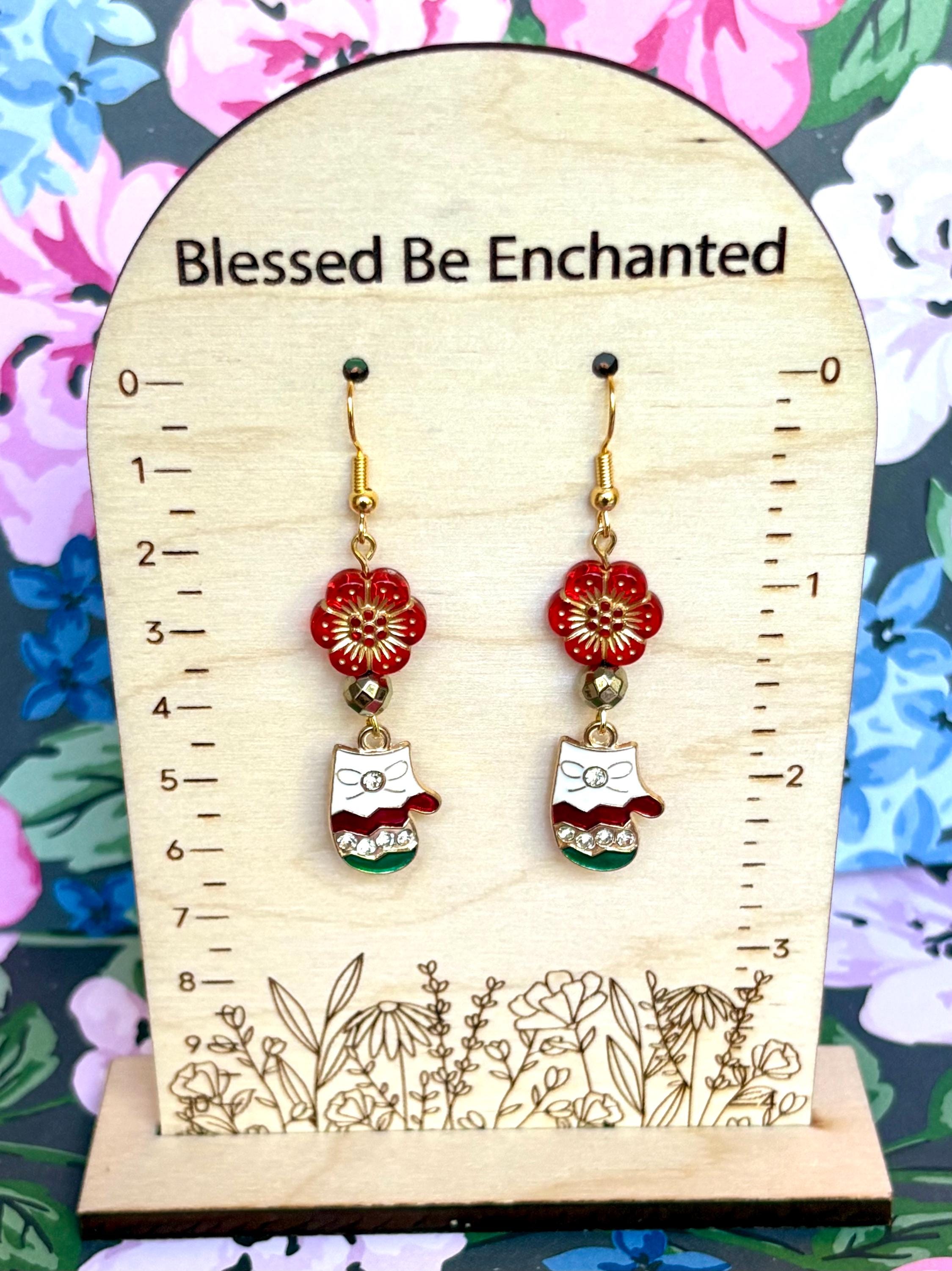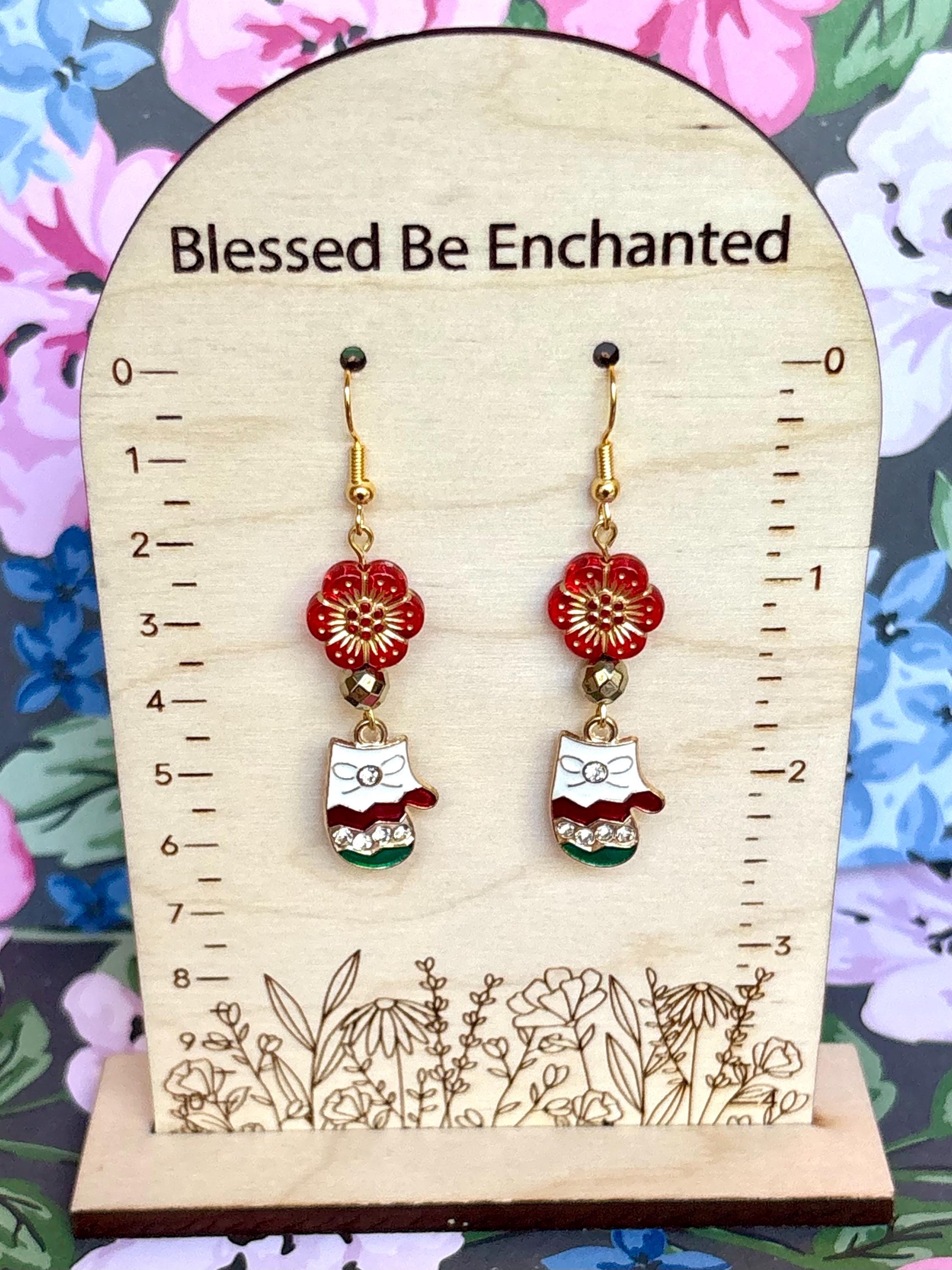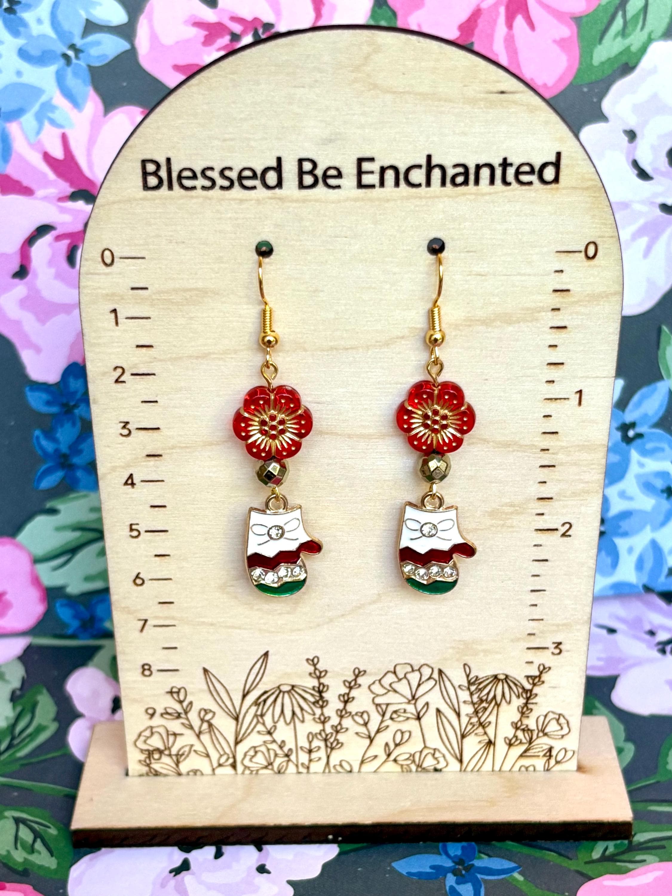 Each piece is accented with Czech glass red flowers with gold wash, faceted gold hematite gemstones, and sparkling enamel mitten charms detailed in red, white, and green for a touch of festive delight. The earrings measure approximately 2.5 inches long, creating a perfect balance of holiday whimsy and elegant shimmer.