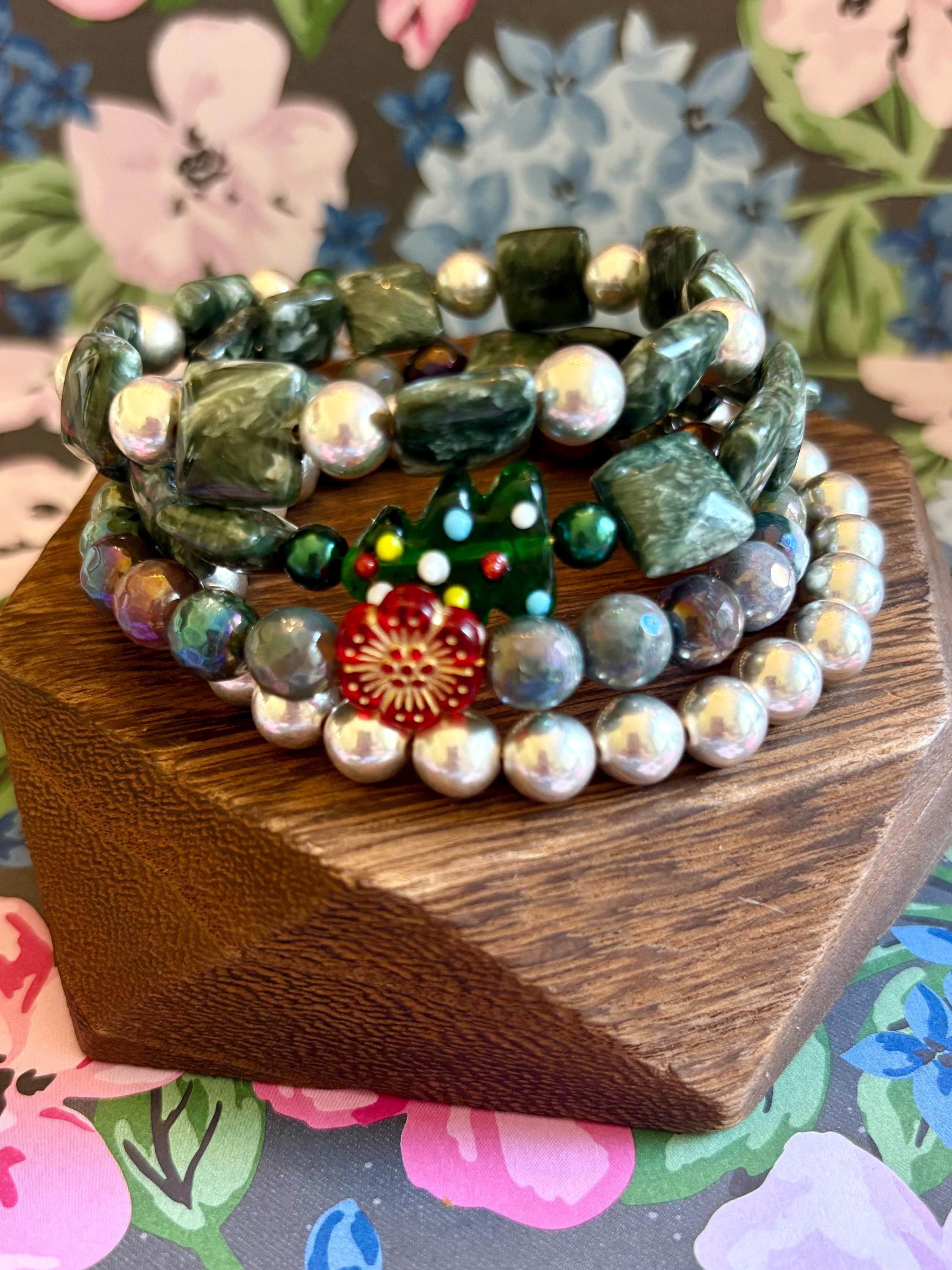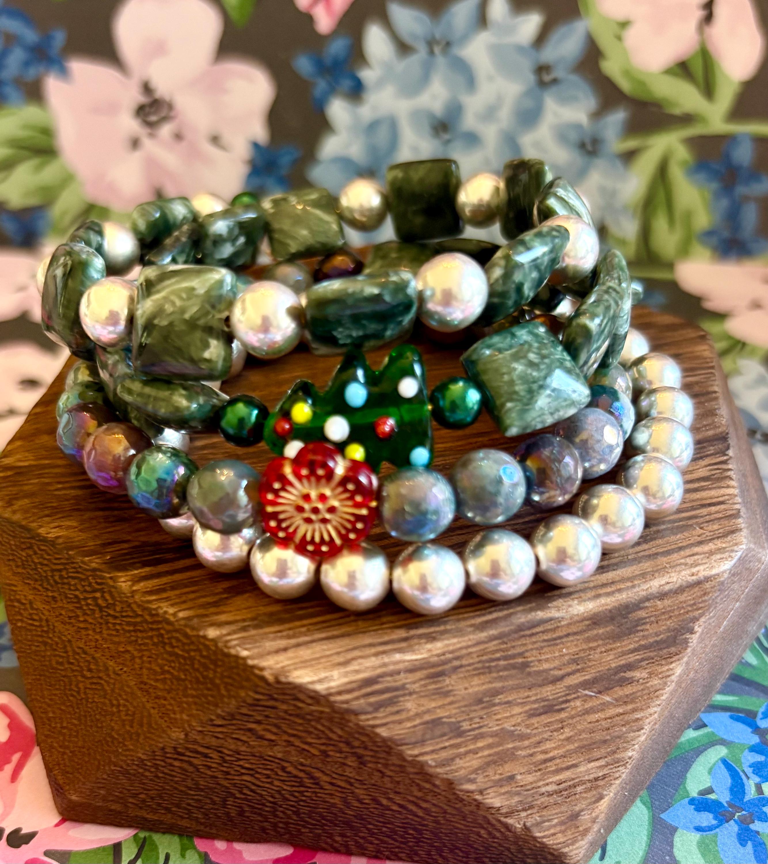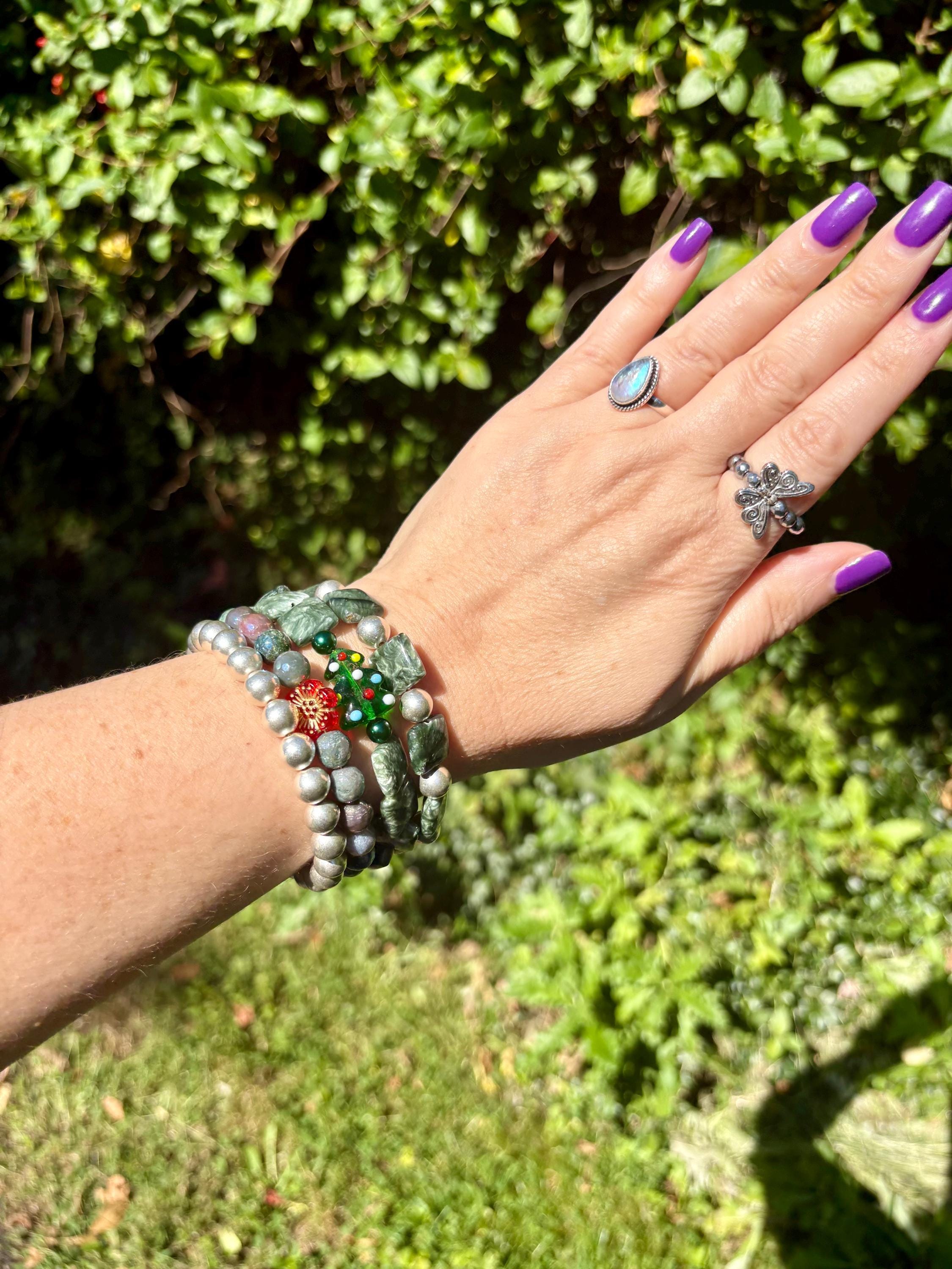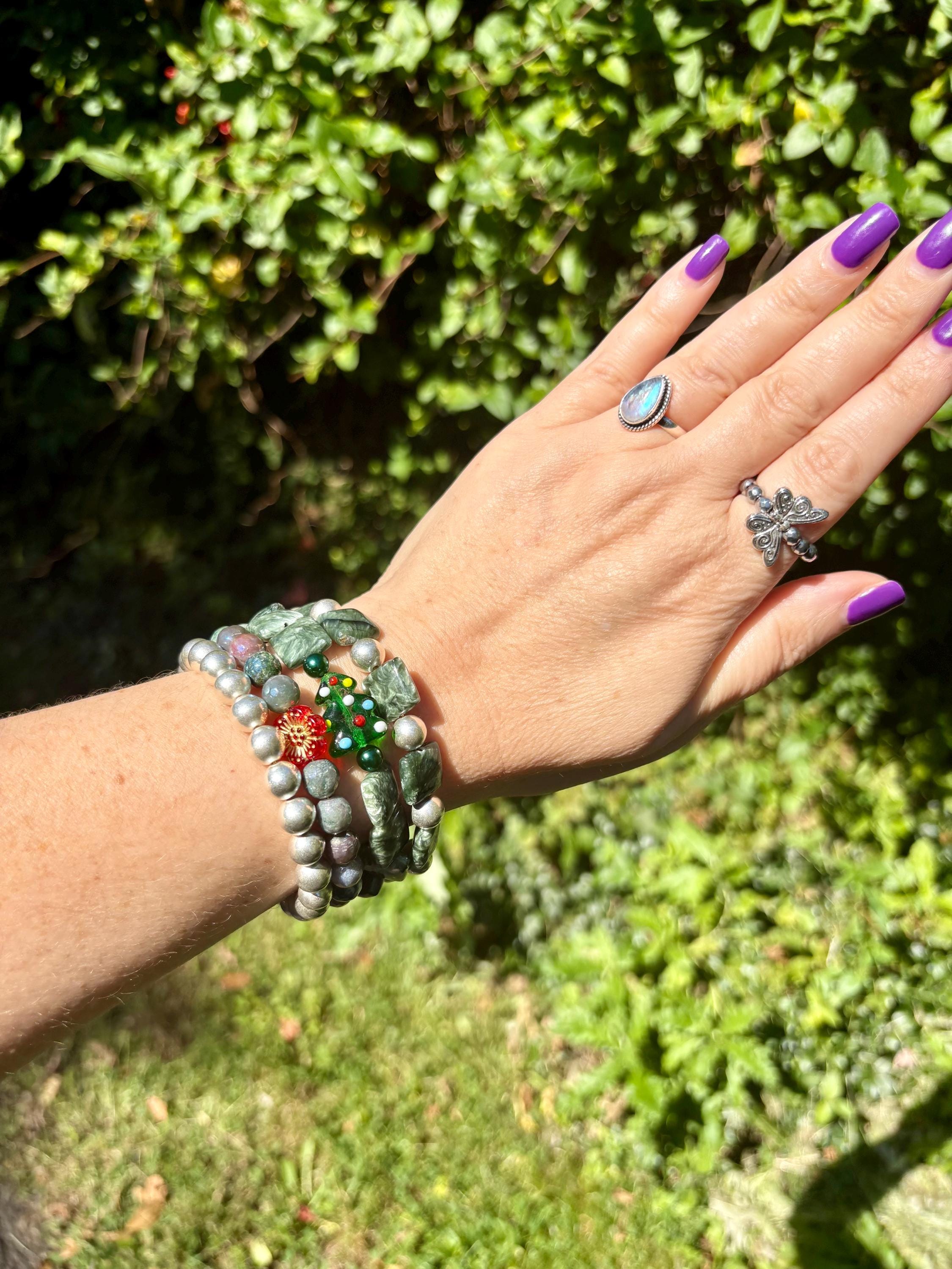 This festive gemstone wrap bracelet features the soft, ethereal glow of Seraphinite gemstones, known for their silvery green angel-wing patterns that bring peace and divine connection. Shimmering metallic pearls and mystic Indian agate chalcedony gemstones add grounding, protection, and joyful energy. The bracelet is accented with a handmade lampwork glass Christmas tree focal bead, a cheerful red Czech glass flower, and two sparkling charms — a tiny cubic zirconia Christmas tree and a colorful enamel snowflake for a touch of winter magic.