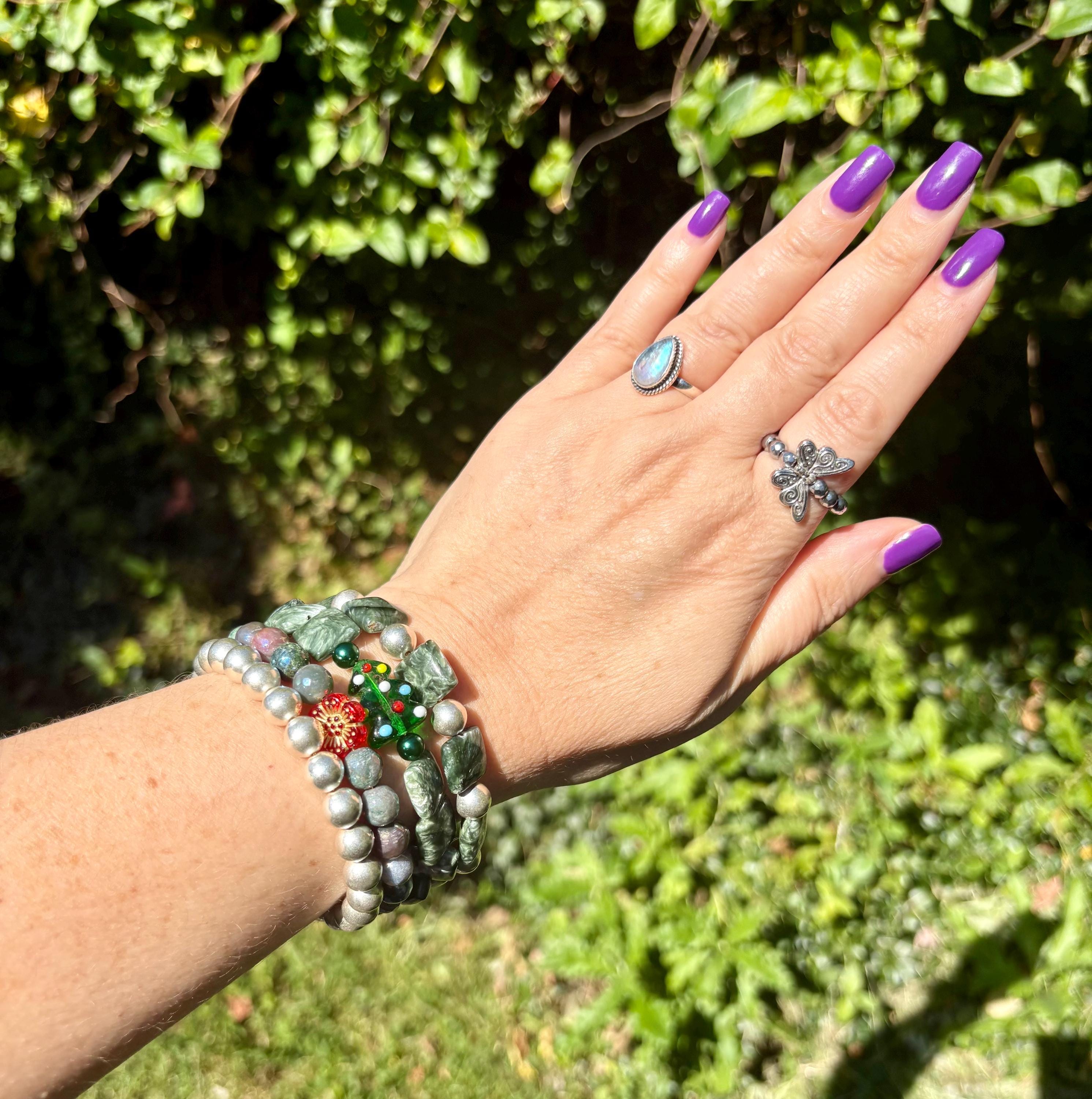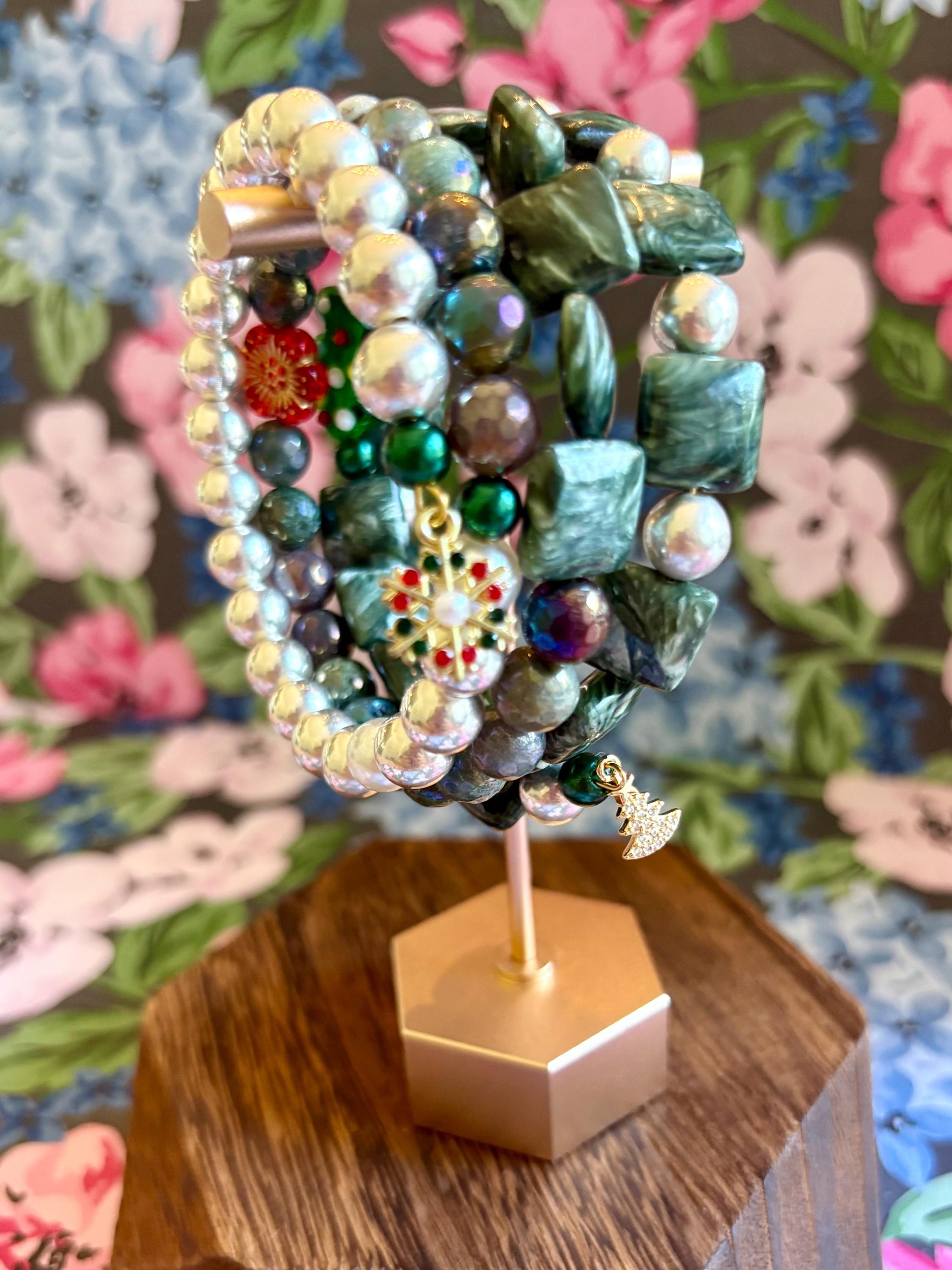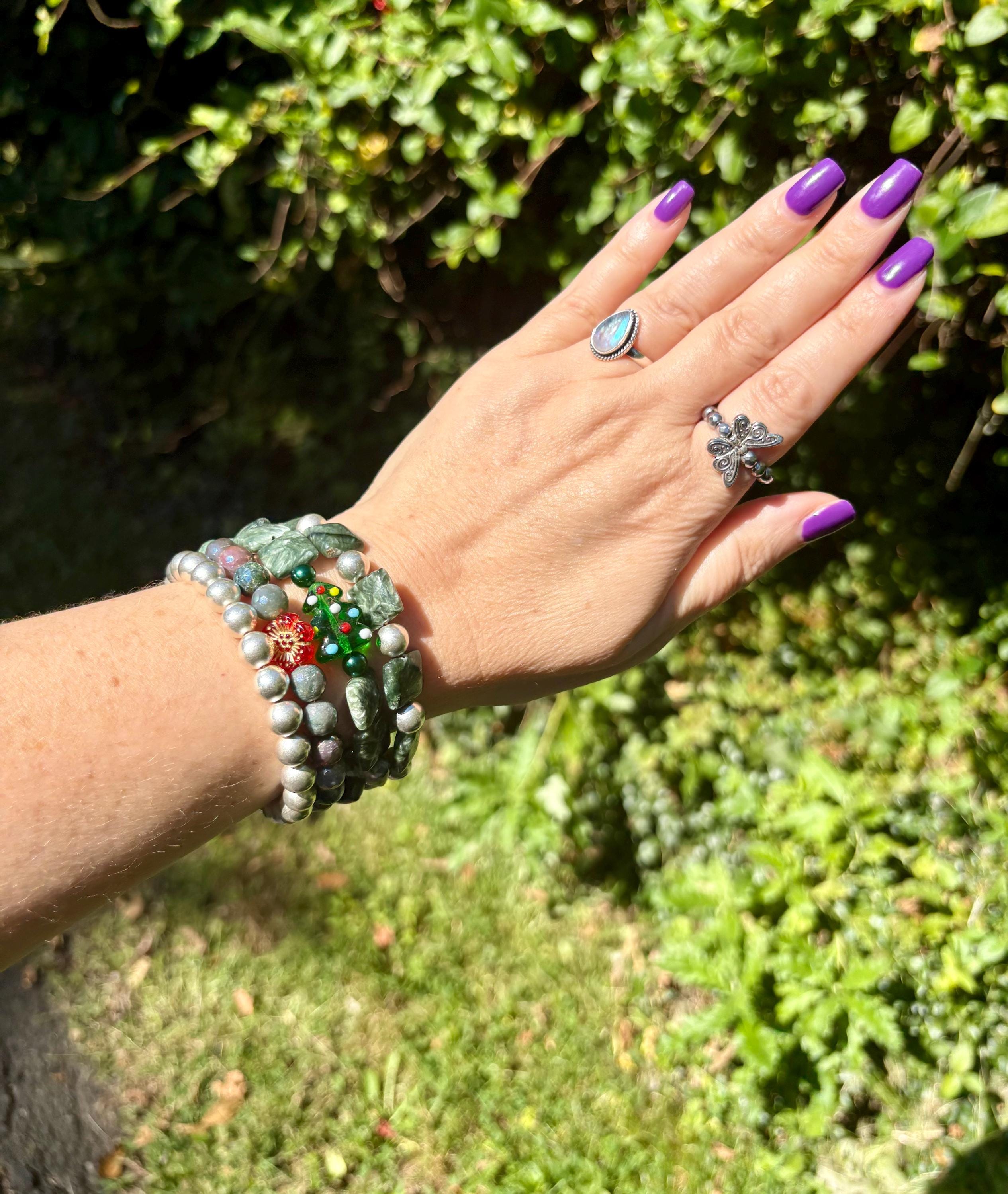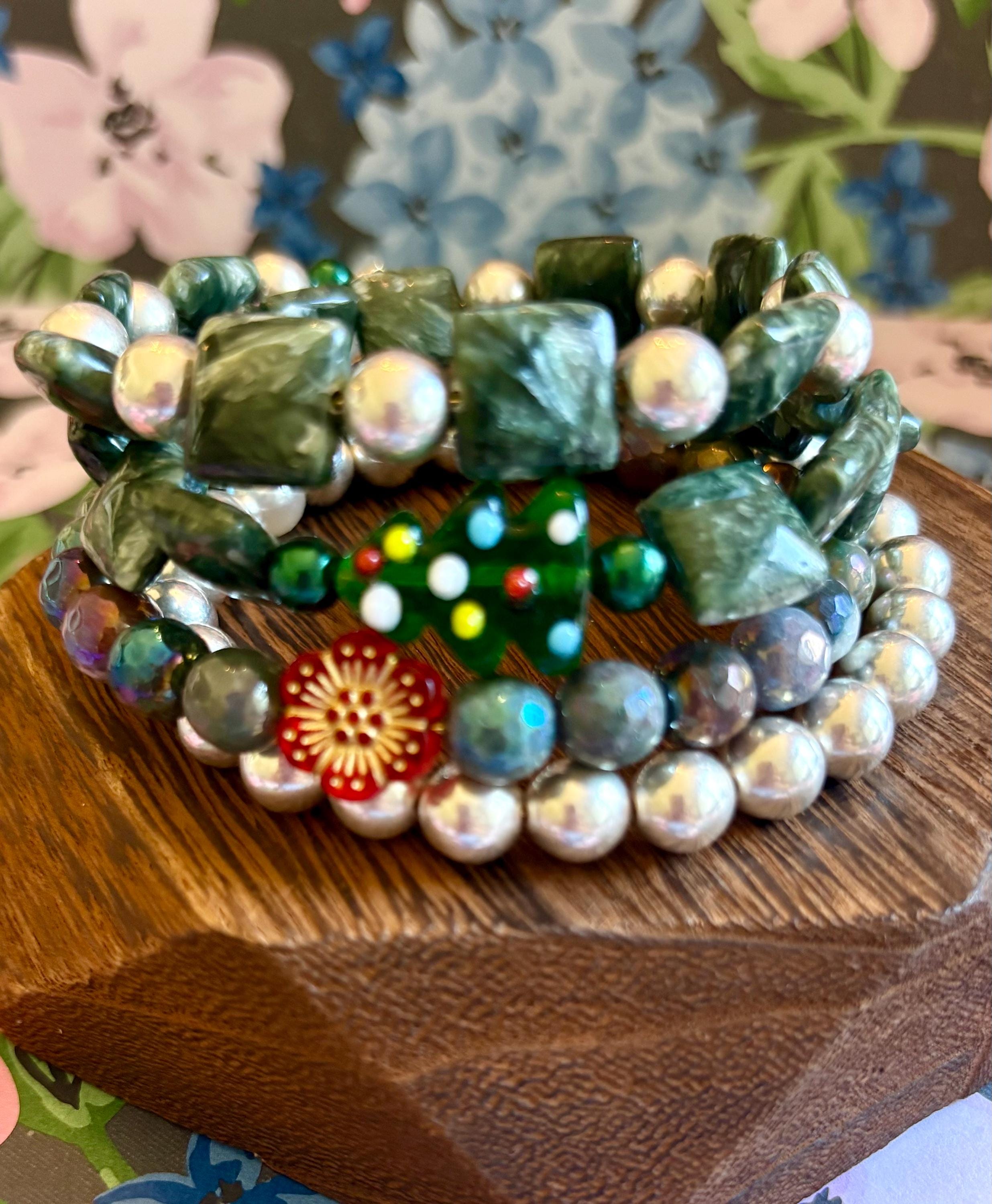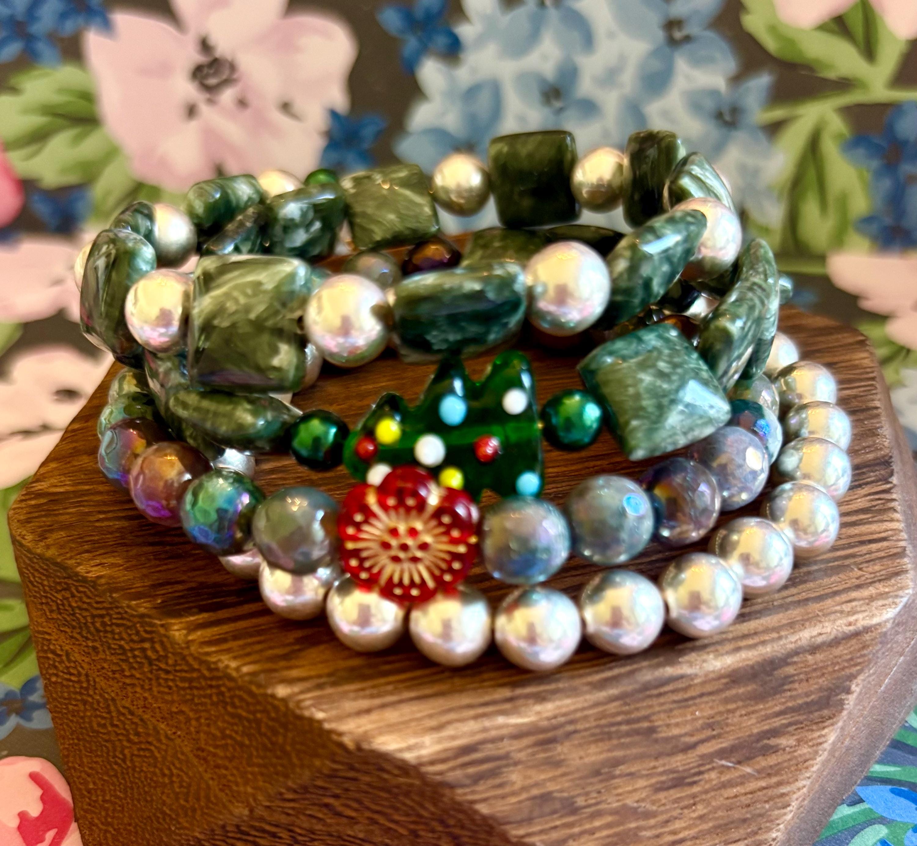 This festive gemstone wrap bracelet features the soft, ethereal glow of Seraphinite gemstones, known for their silvery green angel-wing patterns that bring peace and divine connection. Shimmering metallic pearls and mystic Indian agate chalcedony gemstones add grounding, protection, and joyful energy. The bracelet is accented with a handmade lampwork glass Christmas tree focal bead, a cheerful red Czech glass flower, and two sparkling charms — a tiny cubic zirconia Christmas tree and a colorful enamel snowflake for a touch of winter magic.