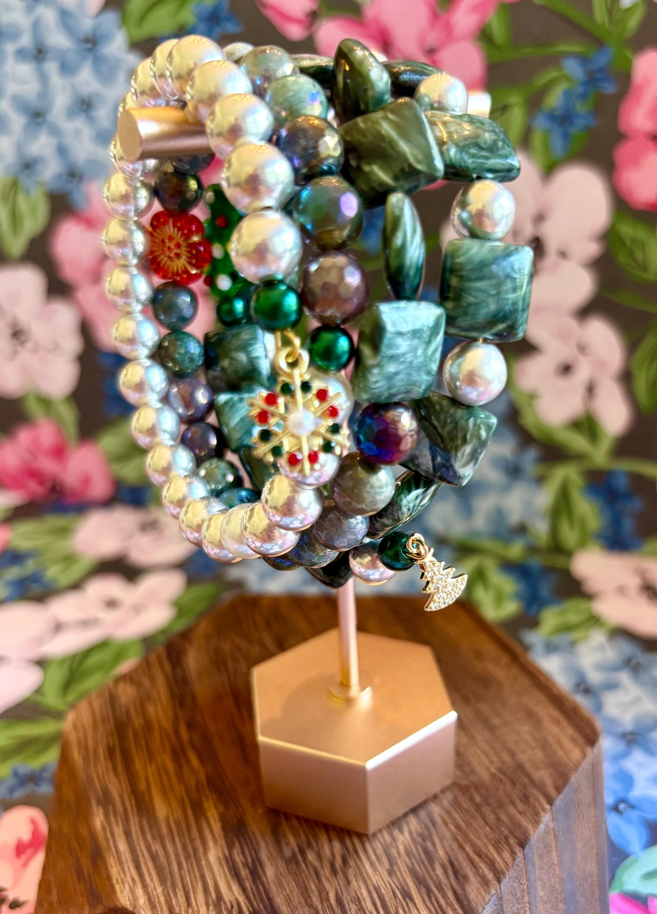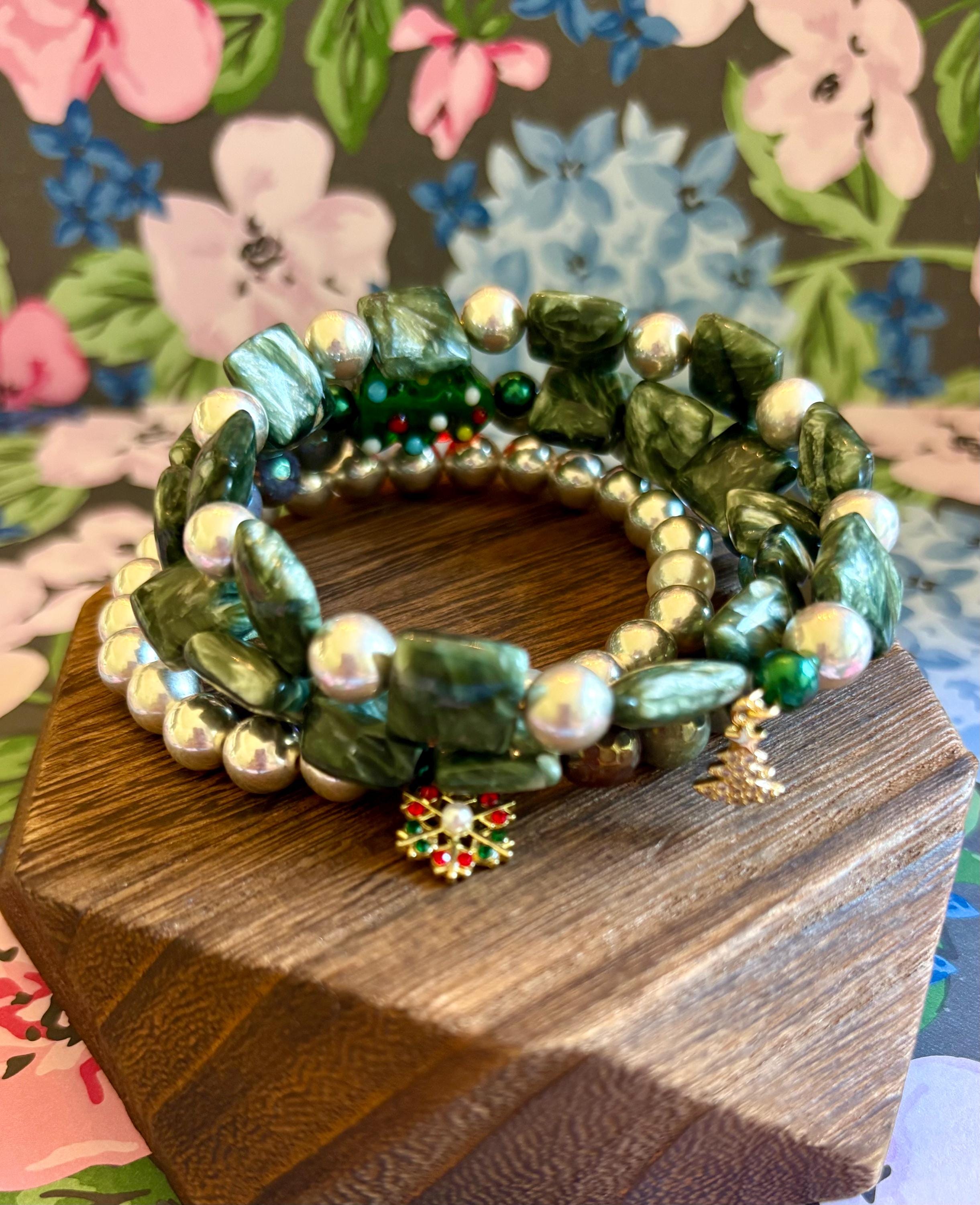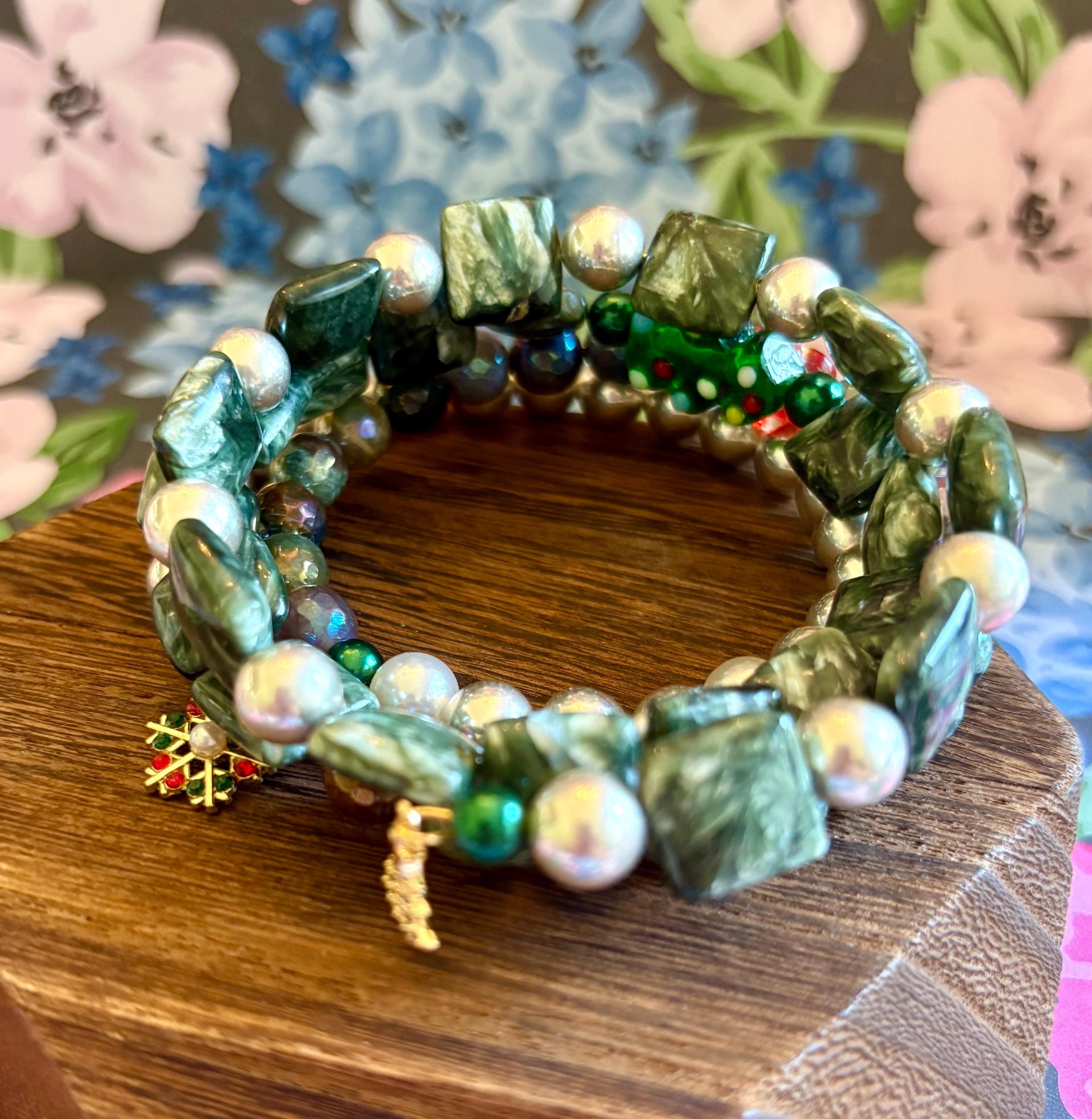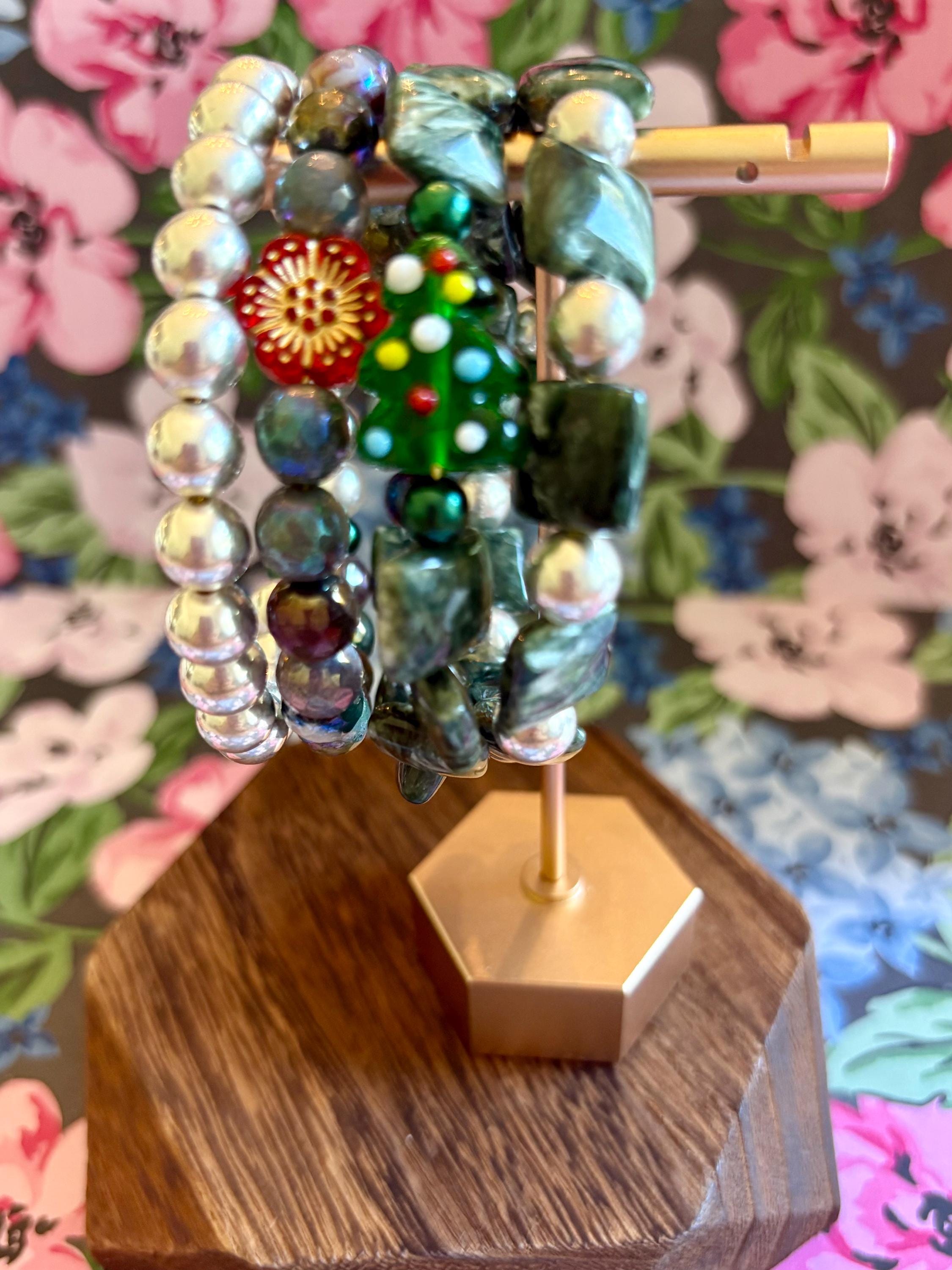 This festive gemstone wrap bracelet features the soft, ethereal glow of Seraphinite gemstones, known for their silvery green angel-wing patterns that bring peace and divine connection. Shimmering metallic pearls and mystic Indian agate chalcedony gemstones add grounding, protection, and joyful energy. The bracelet is accented with a handmade lampwork glass Christmas tree focal bead, a cheerful red Czech glass flower, and two sparkling charms — a tiny cubic zirconia Christmas tree and a colorful enamel snowflake for a touch of winter magic.