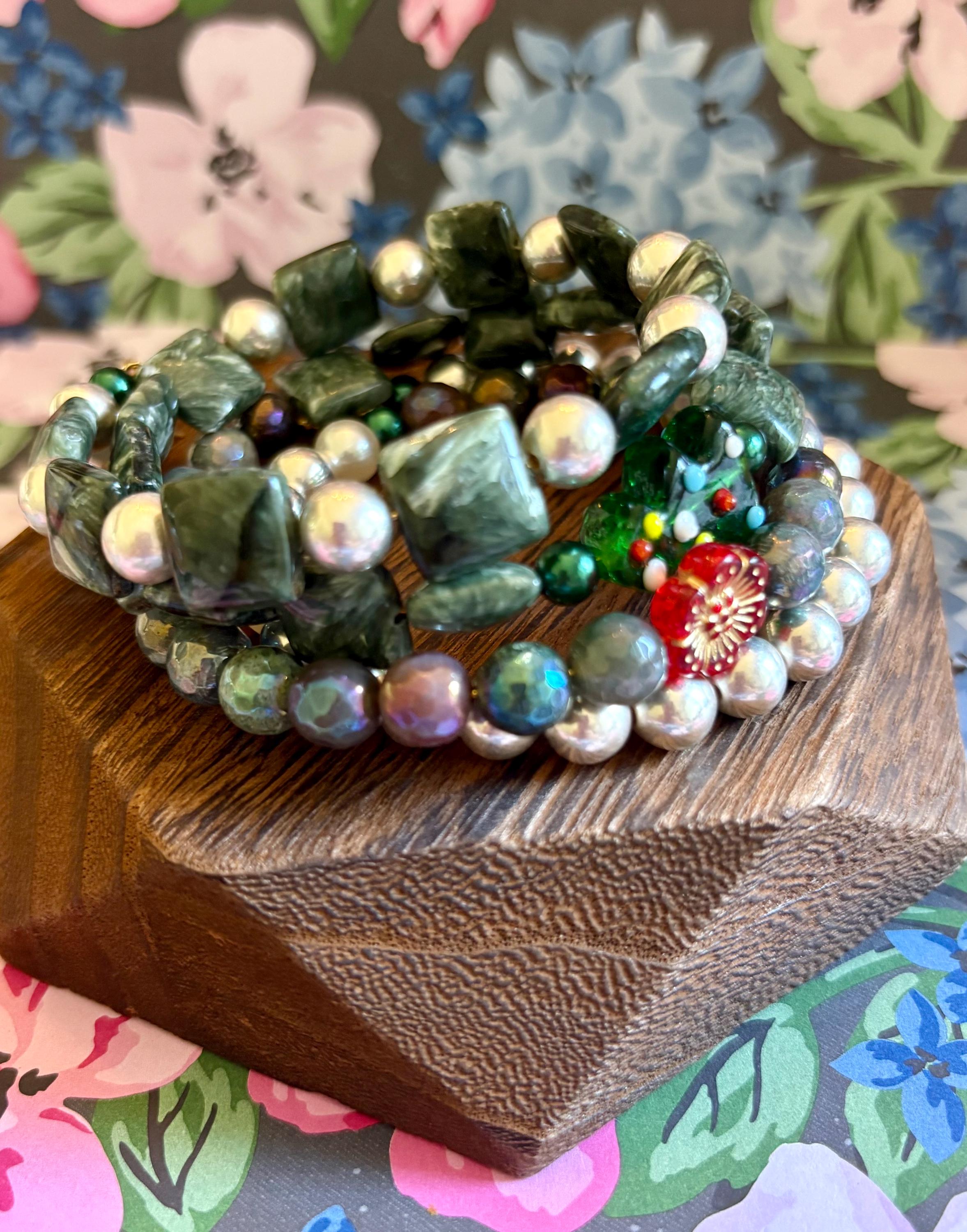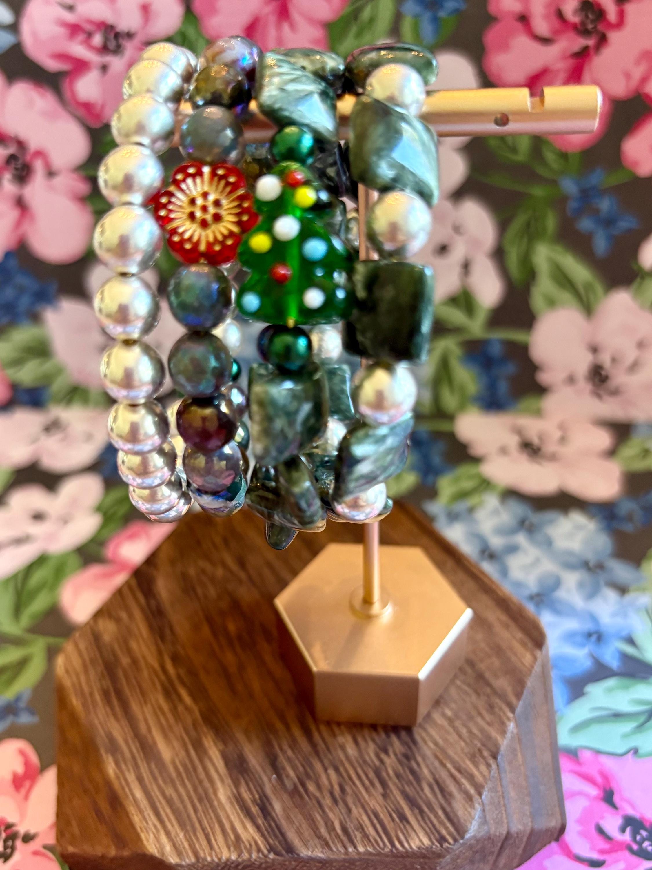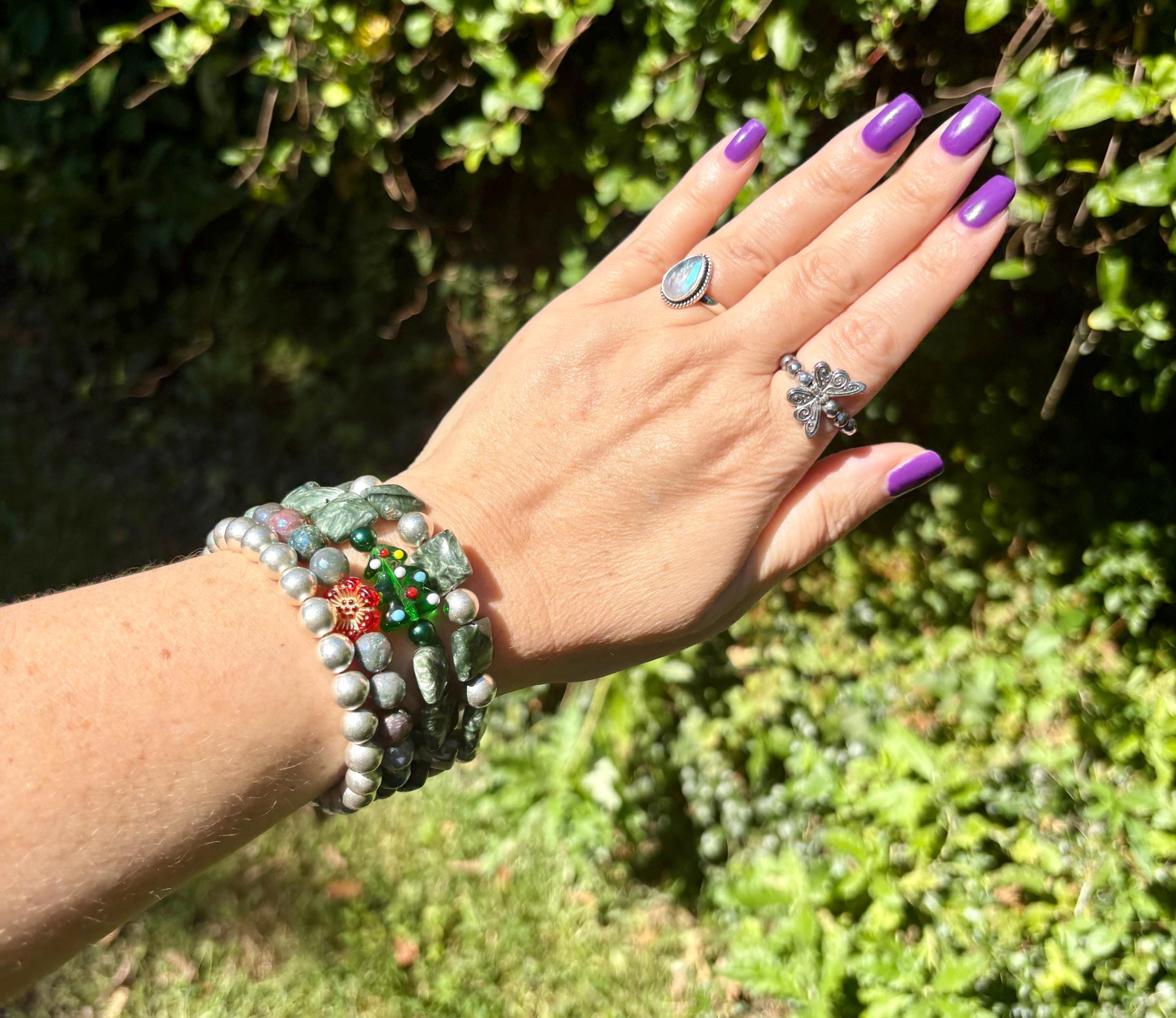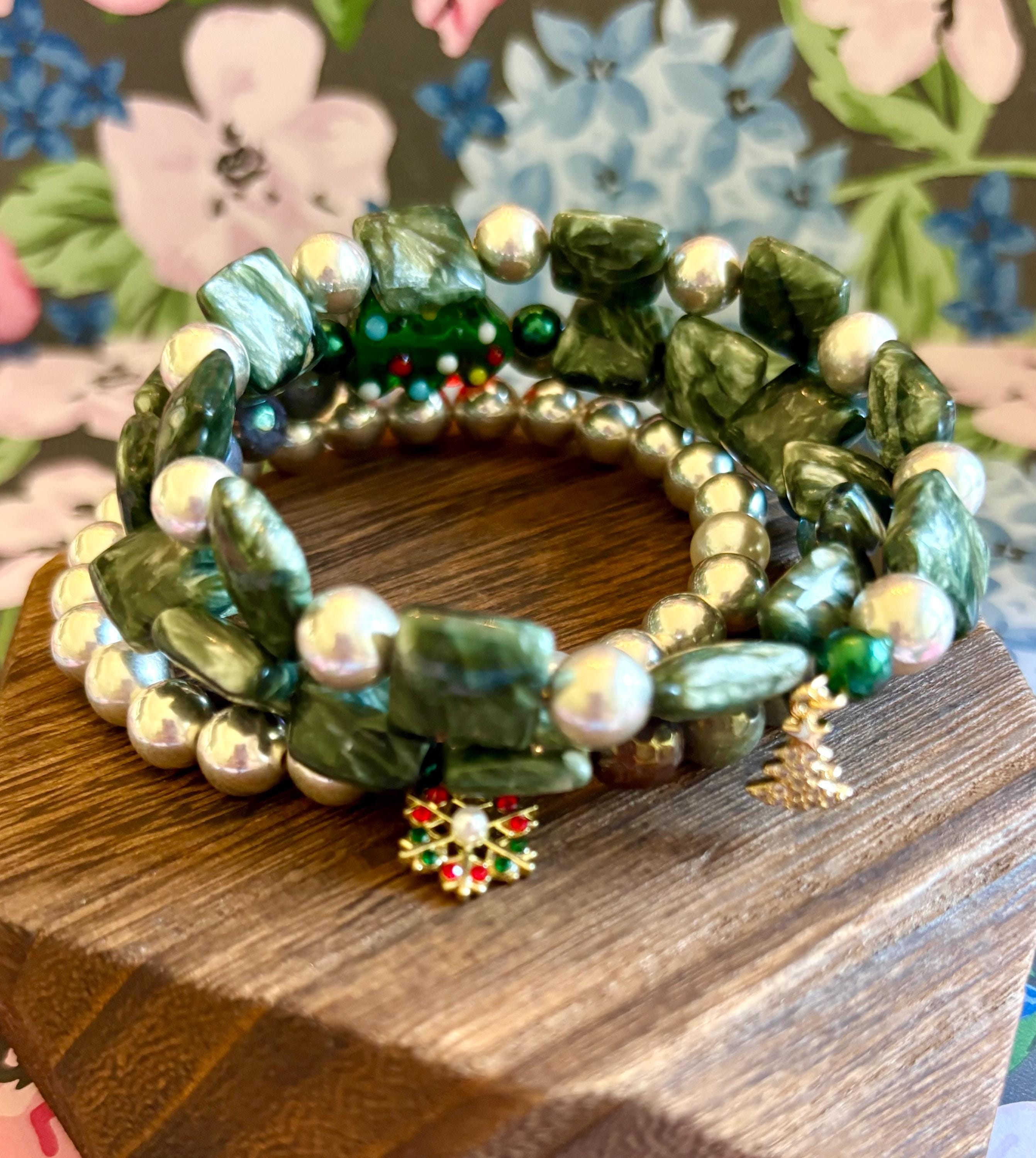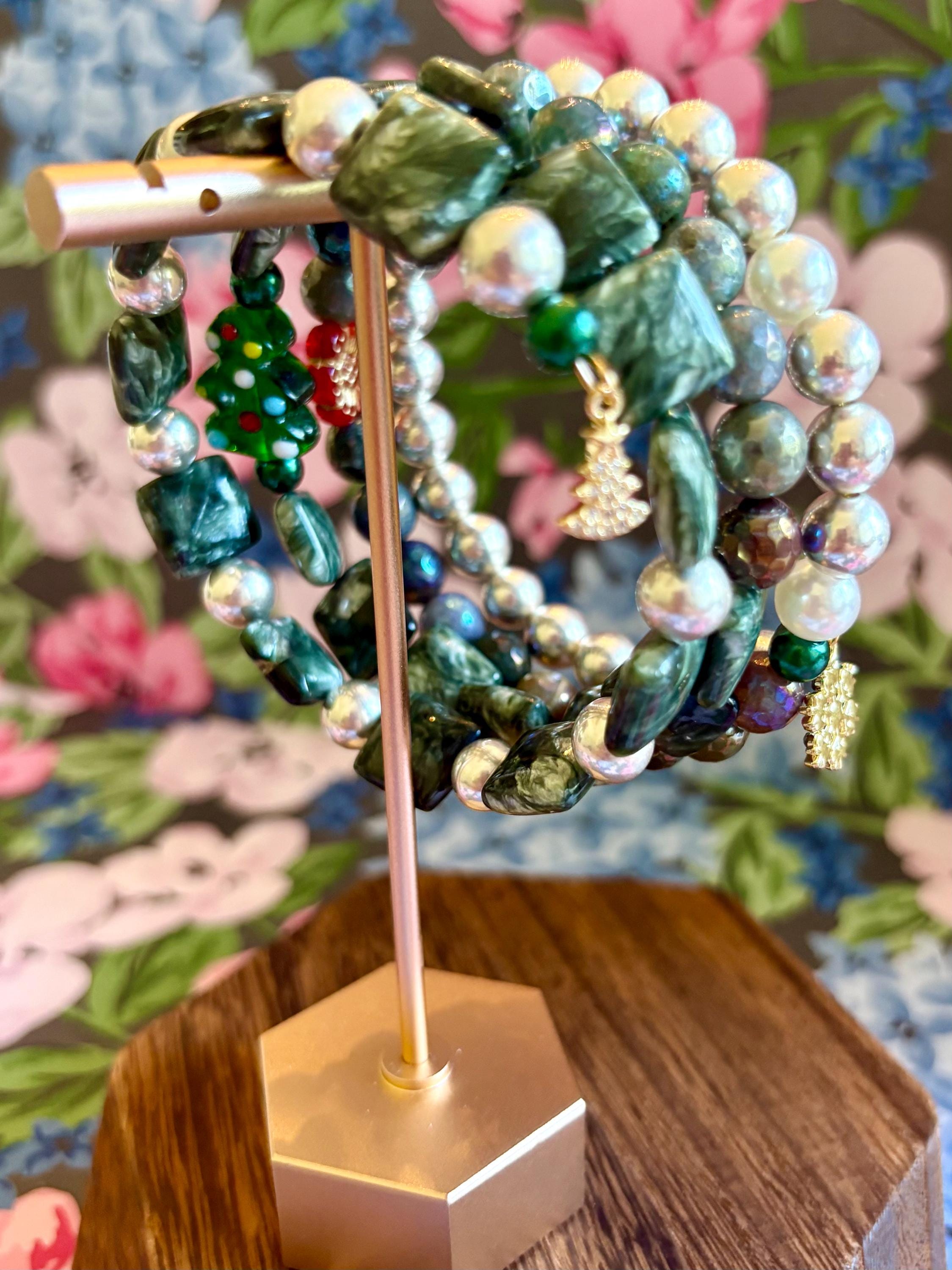 This festive gemstone wrap bracelet features the soft, ethereal glow of Seraphinite gemstones, known for their silvery green angel-wing patterns that bring peace and divine connection. Shimmering metallic pearls and mystic Indian agate chalcedony gemstones add grounding, protection, and joyful energy. The bracelet is accented with a handmade lampwork glass Christmas tree focal bead, a cheerful red Czech glass flower, and two sparkling charms — a tiny cubic zirconia Christmas tree and a colorful enamel snowflake for a touch of winter magic.