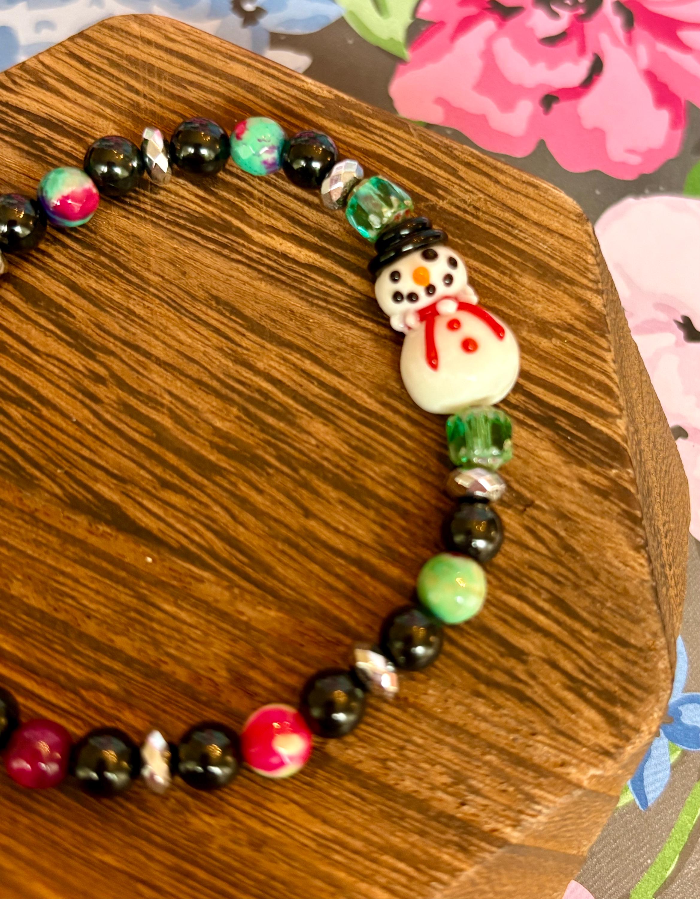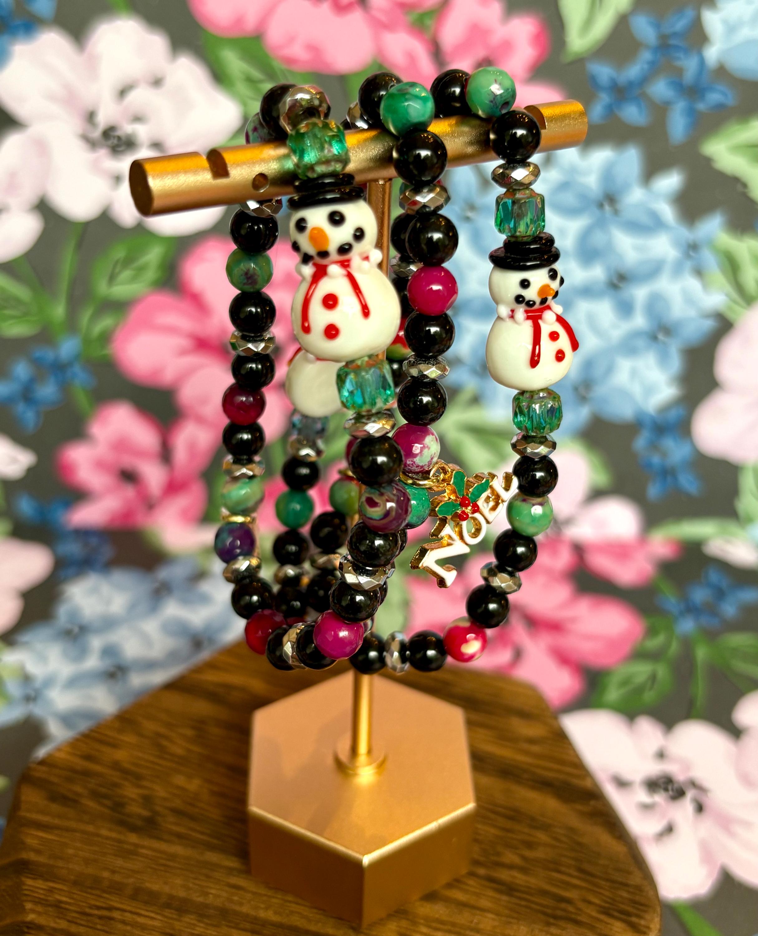 Celebrate the magic of the season with the Frosted Noel Gemstone Bracelets, handmade with joy, light, and festive energy! These charming stretch-to-fit bracelets feature lampwork glass snowman beads, Czech glass cathedral crystals, colorful jade gemstones, silver faceted hematite, and black obsidian — each bead chosen for its sparkle and spiritual meaning.