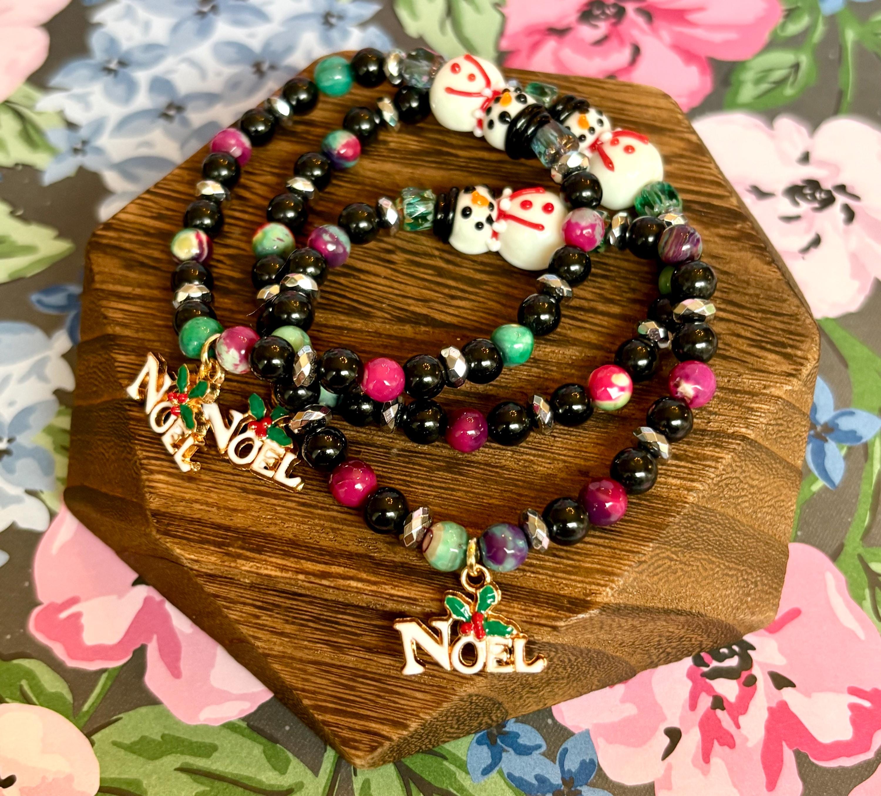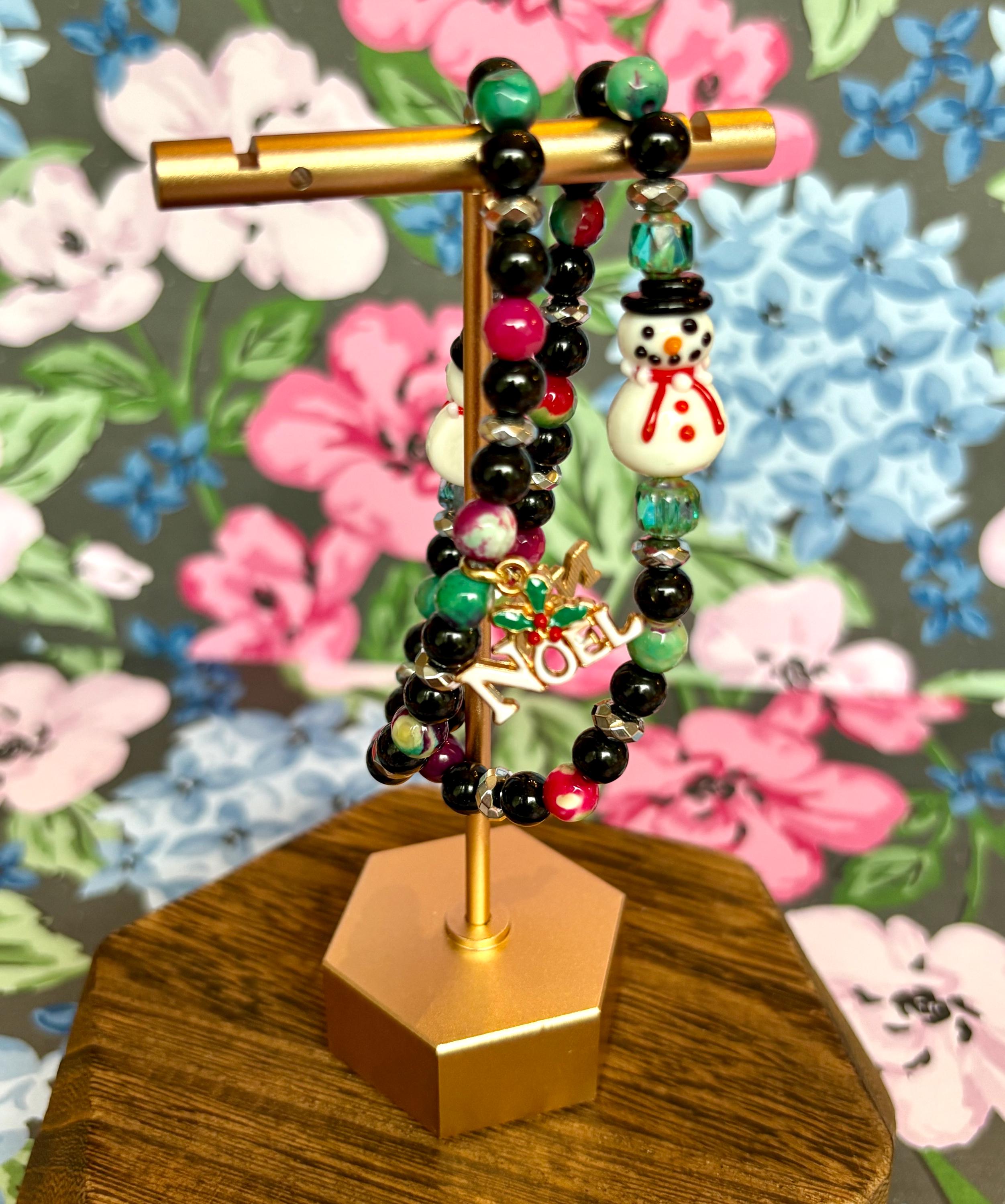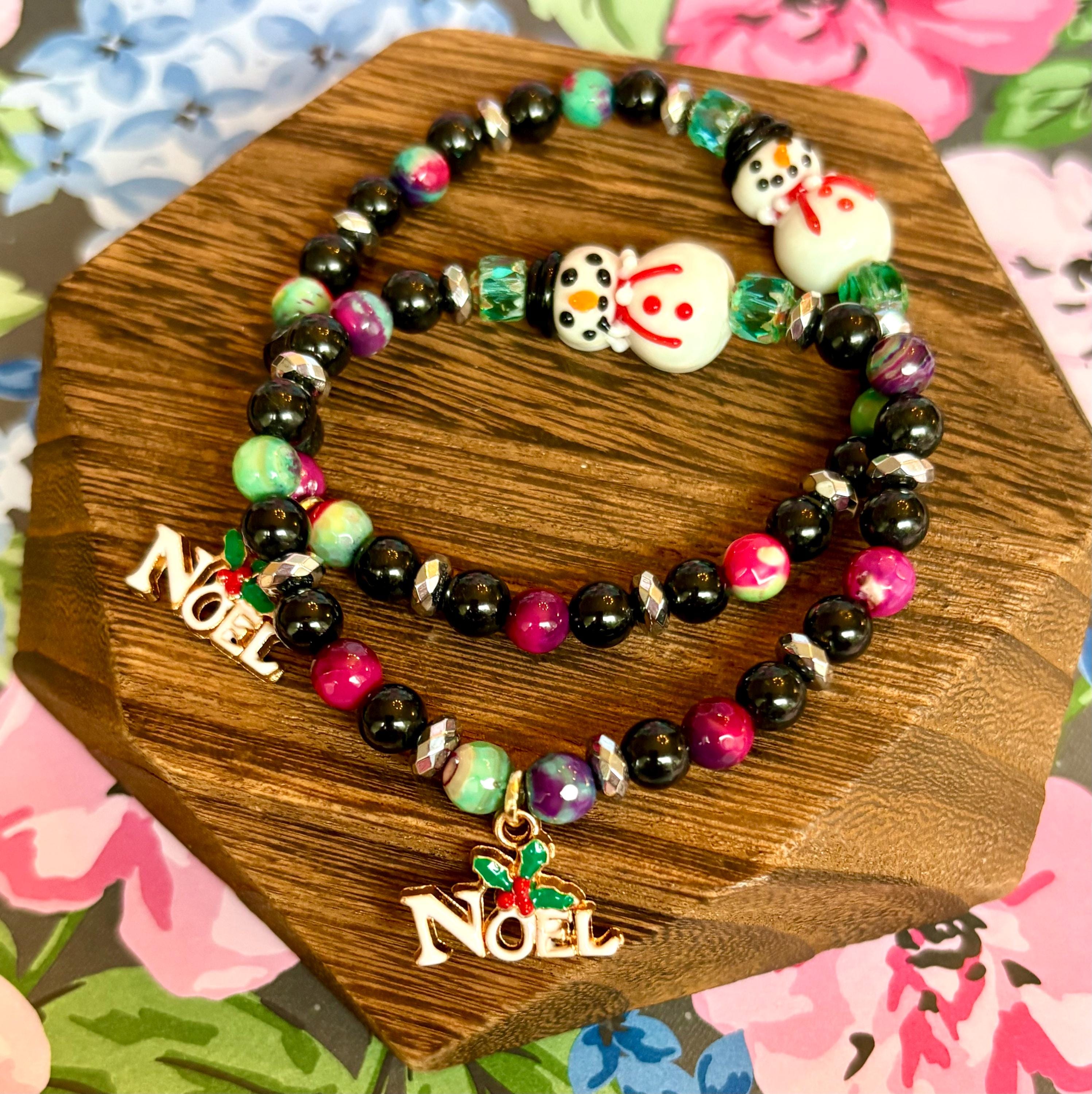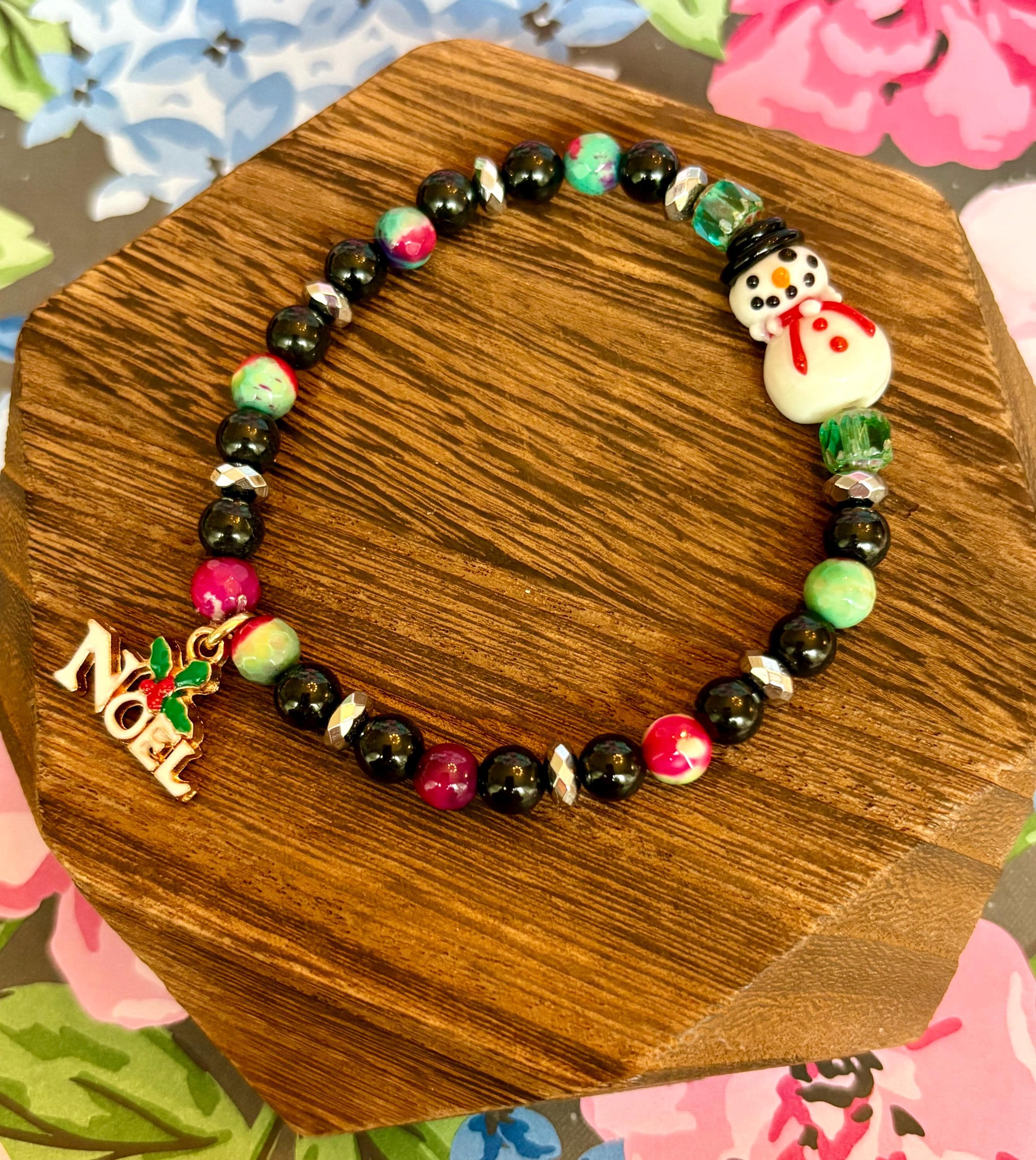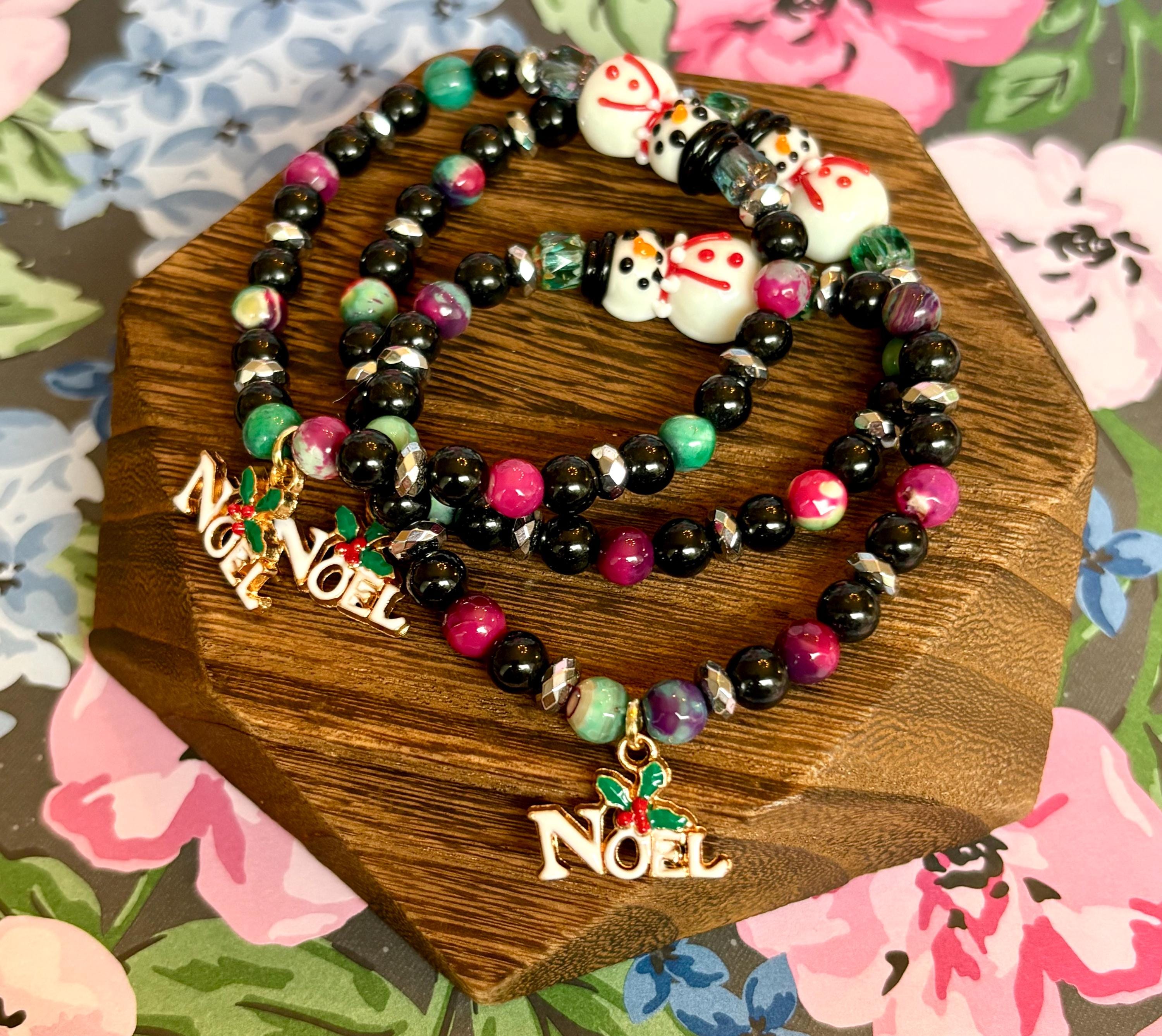 Frosted Noel Gemstone Bracelets – Snowman Lampwork Beads, Colorful Jade, Silver Hematite & Black Obsidian | Holiday Stretch Bracelet with Enamel Noel Charm