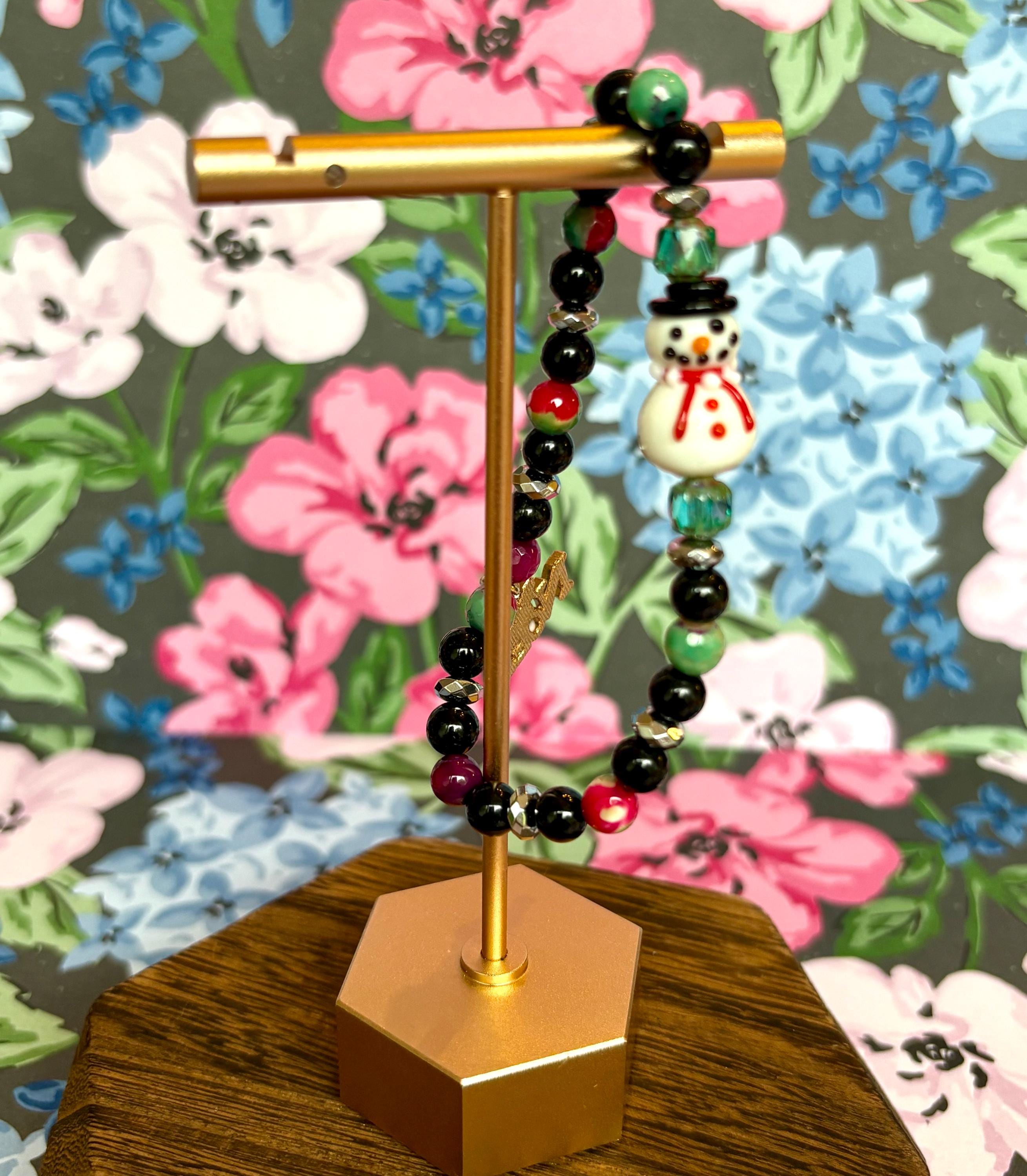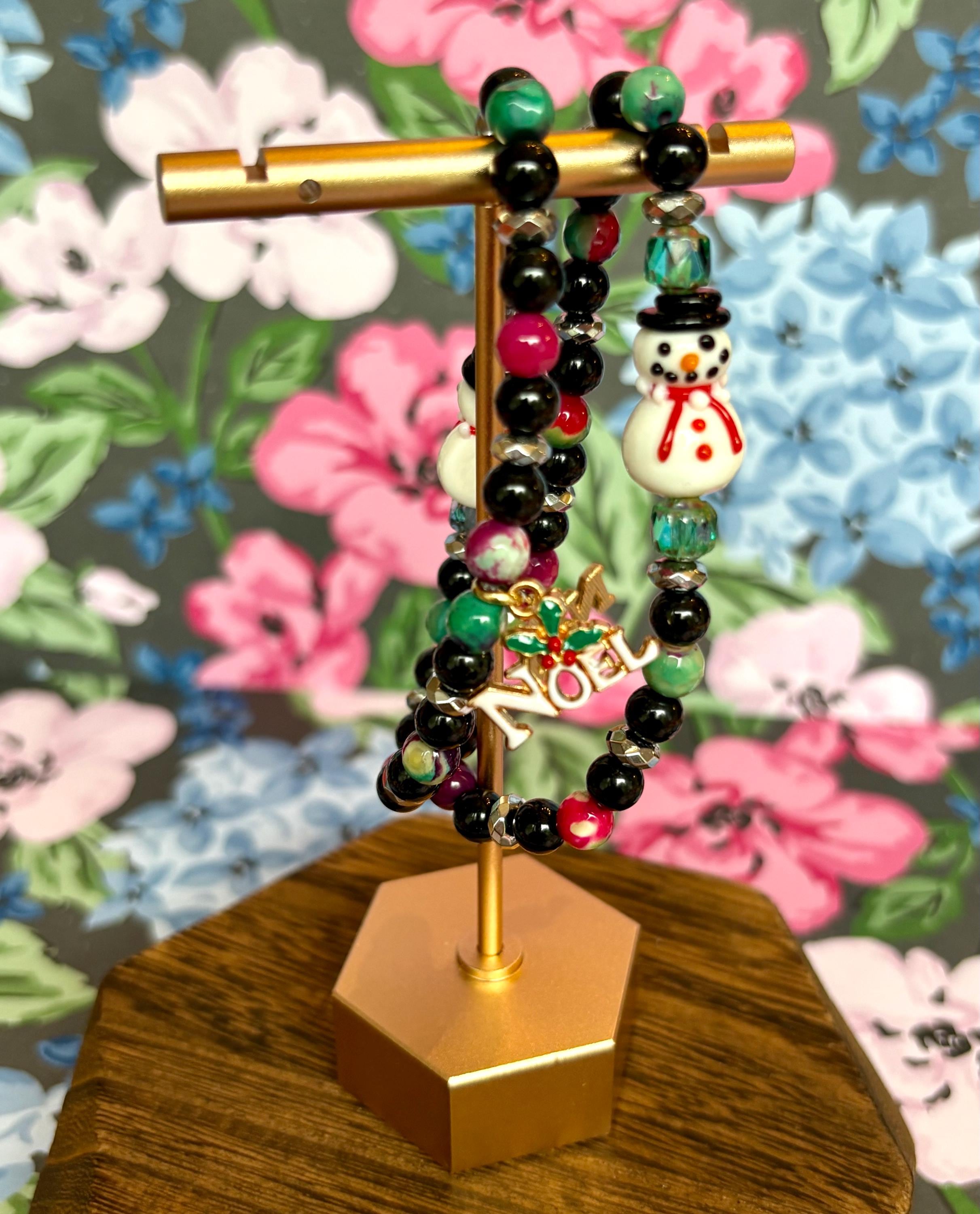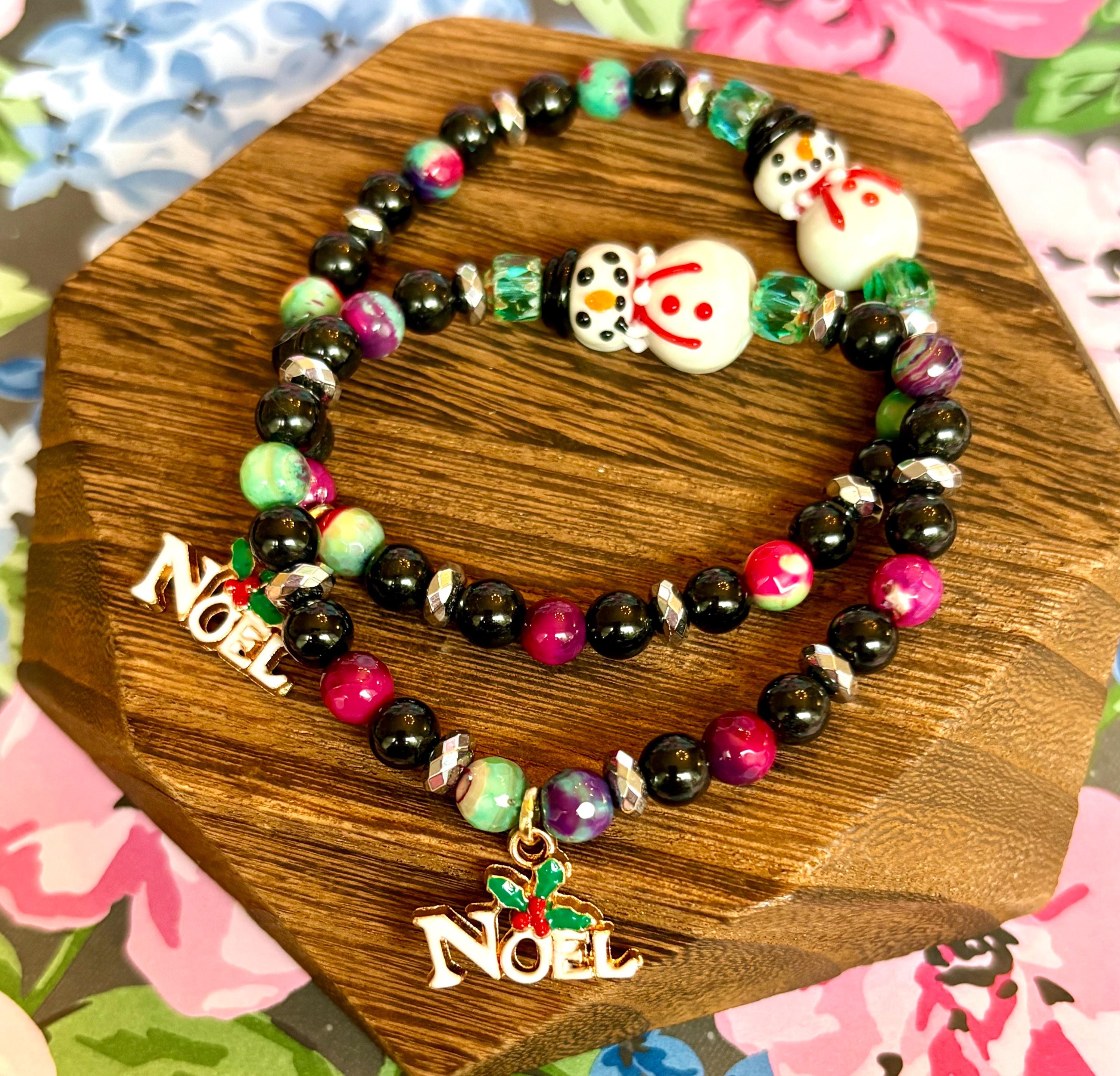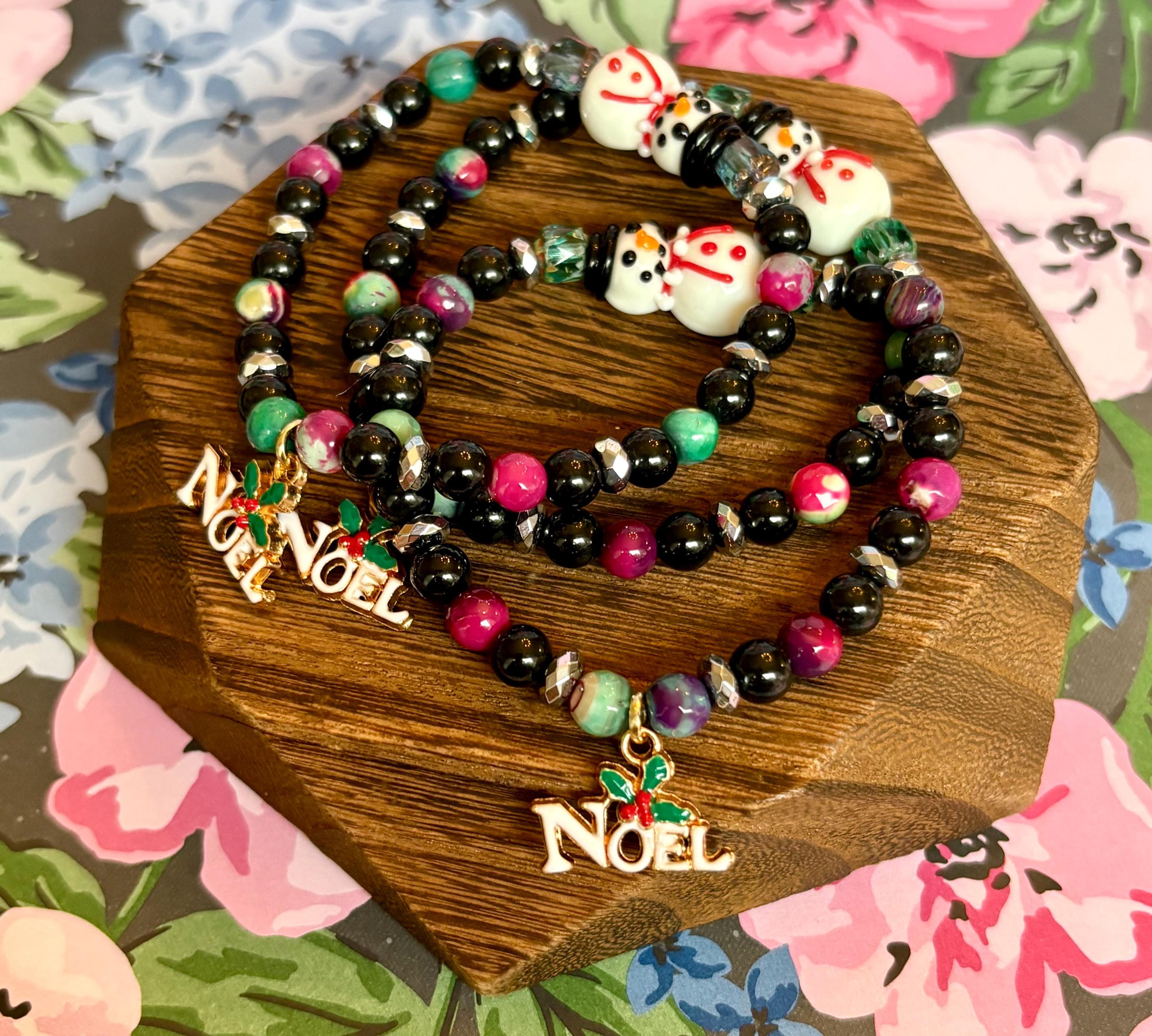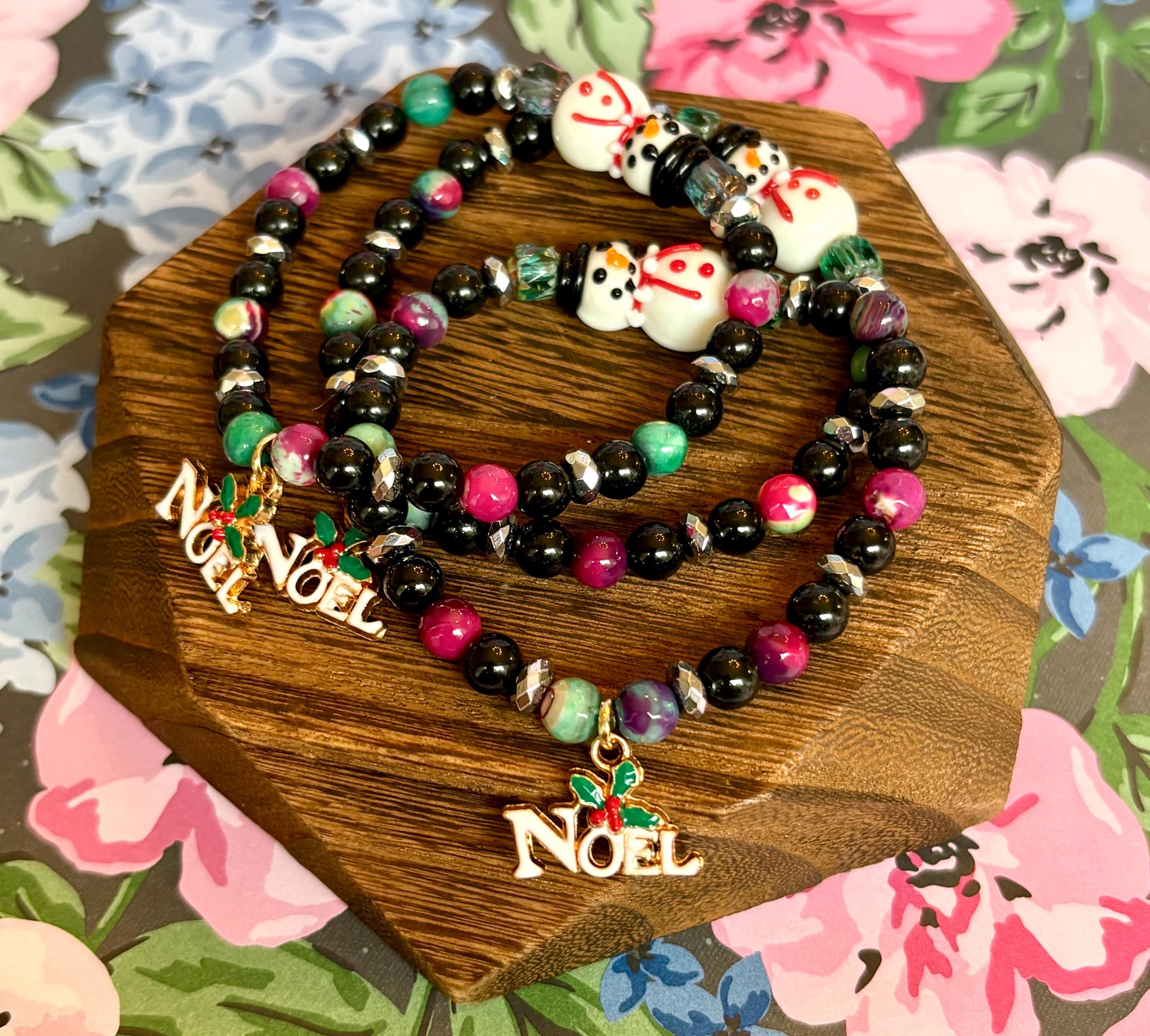 Frosted Noel Gemstone Bracelets – Snowman Lampwork Beads, Colorful Jade, Silver Hematite & Black Obsidian | Holiday Stretch Bracelet with Enamel Noel Charm