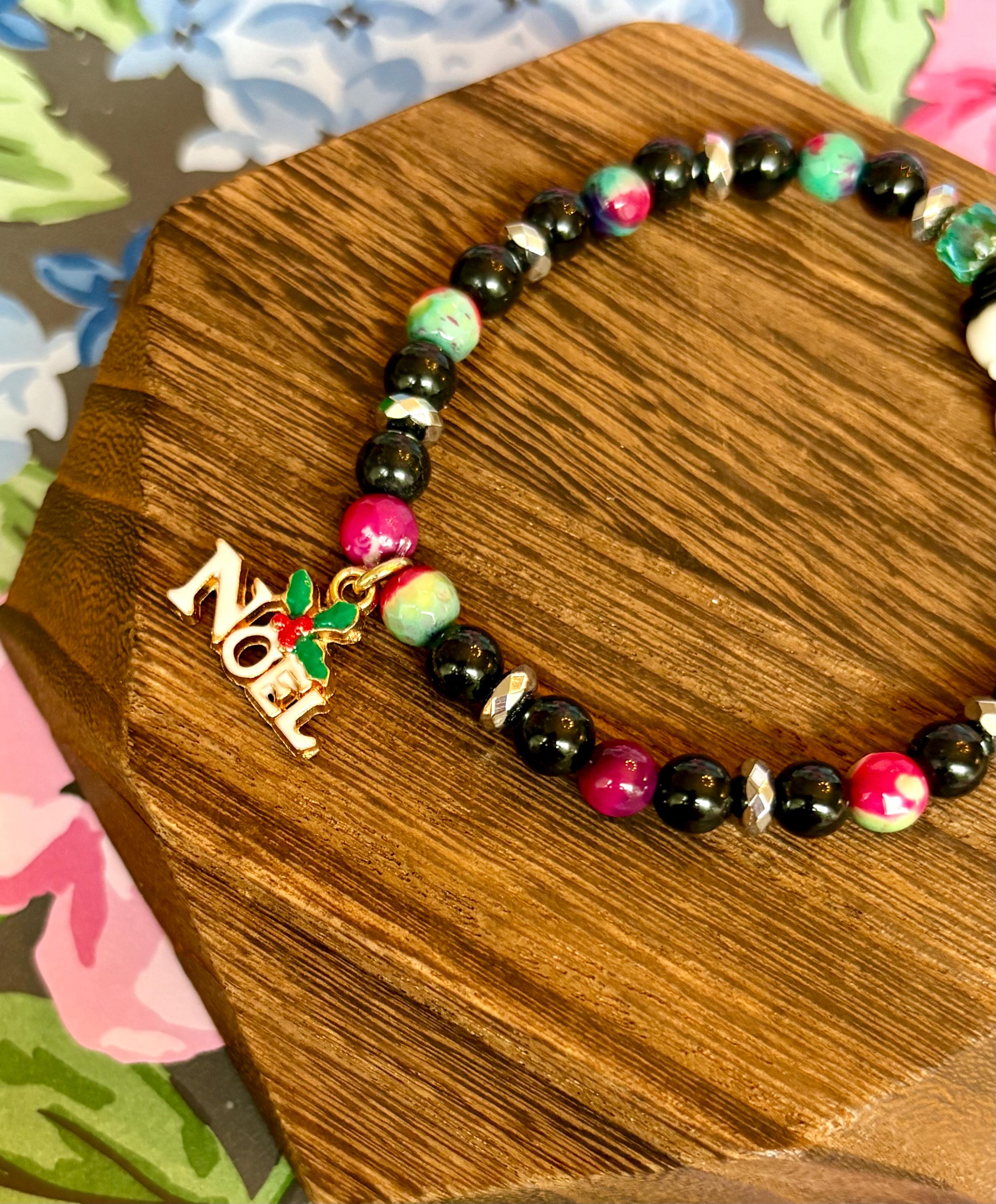 Finished with a gold-tone enamel Noel charm adorned with holly accents, this design radiates Christmas cheer and a touch of winter wonder. Perfect for stacking, gifting, or adding a merry touch to your own holiday look!