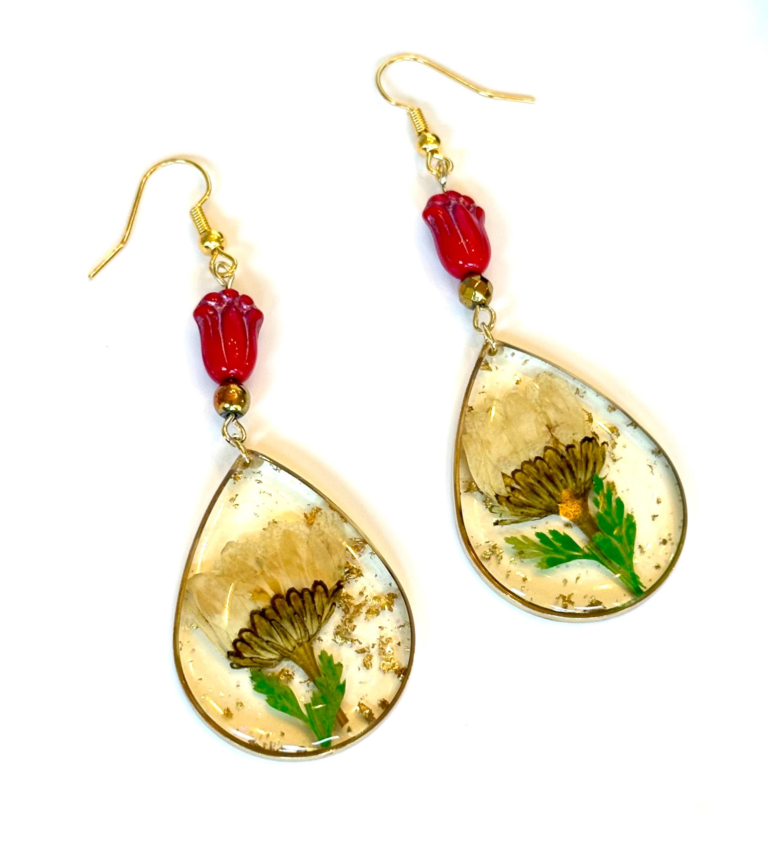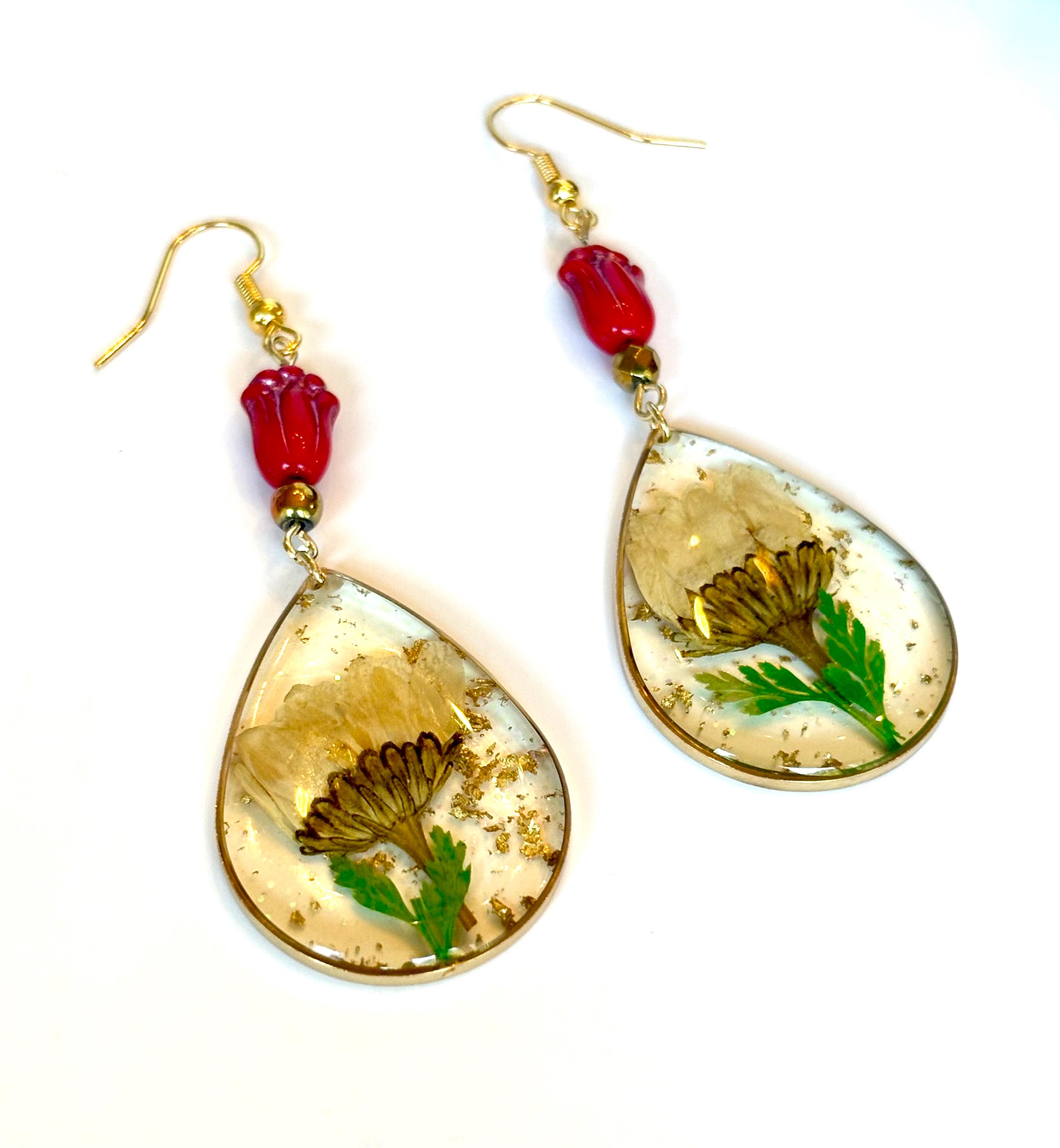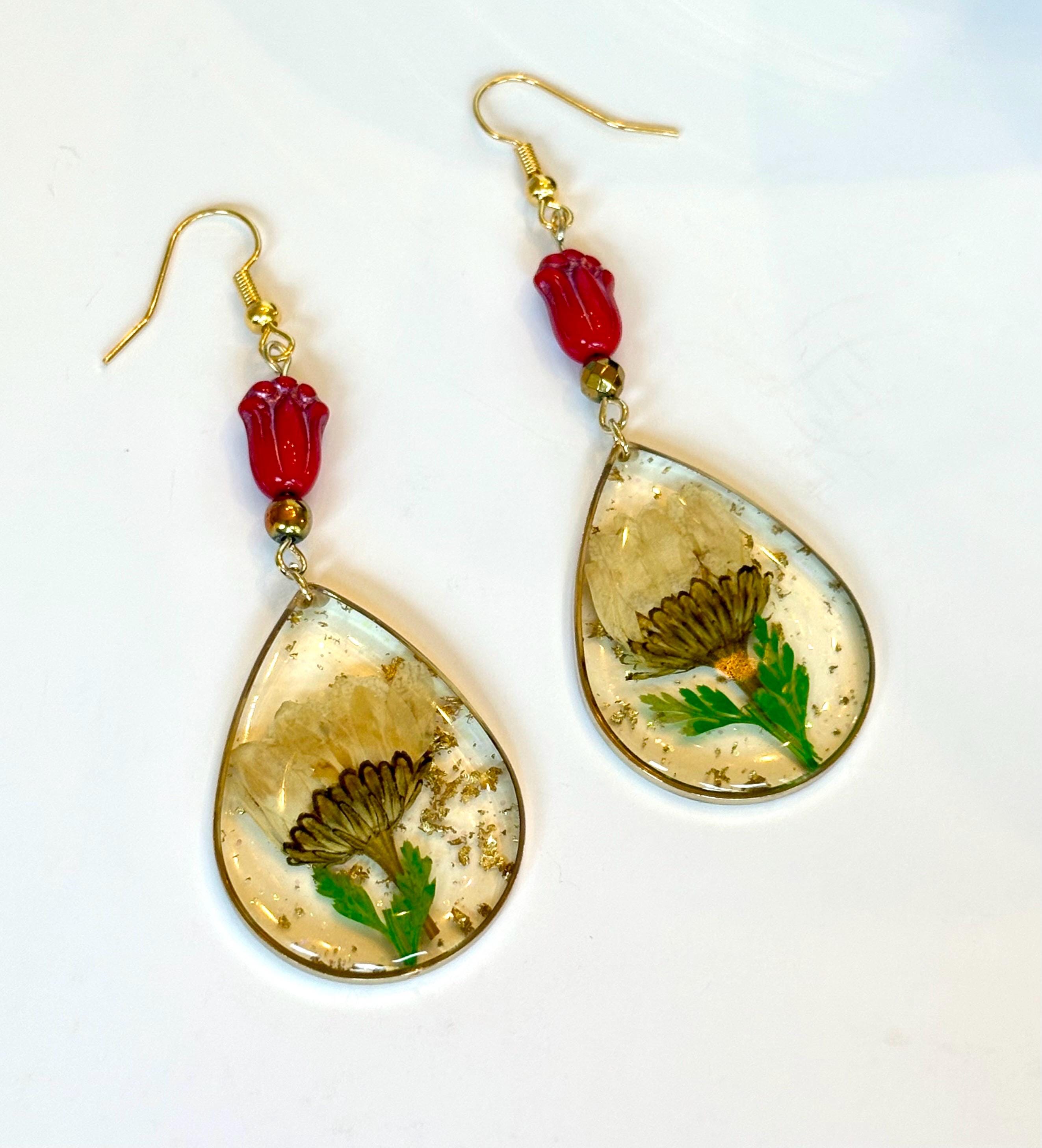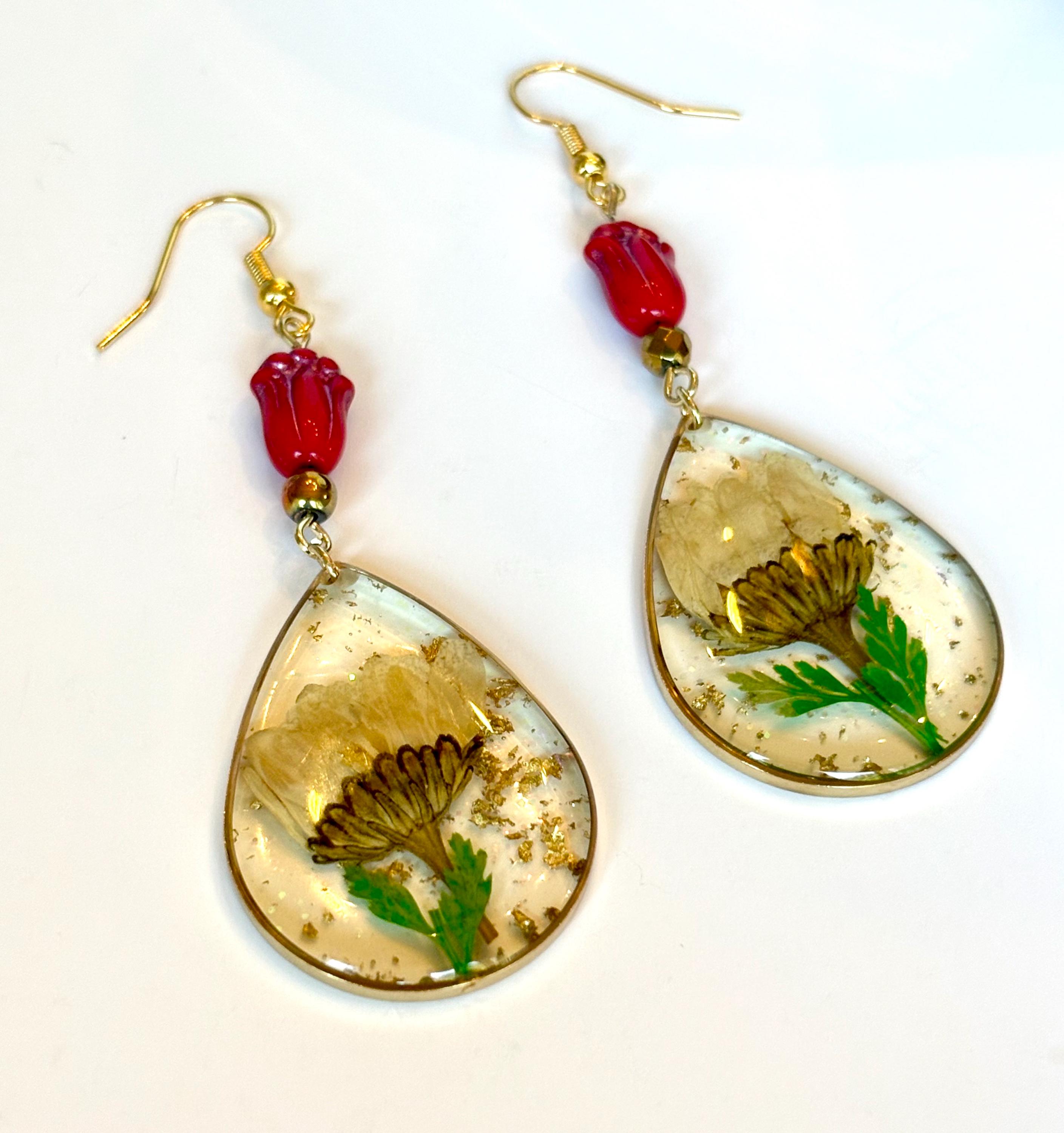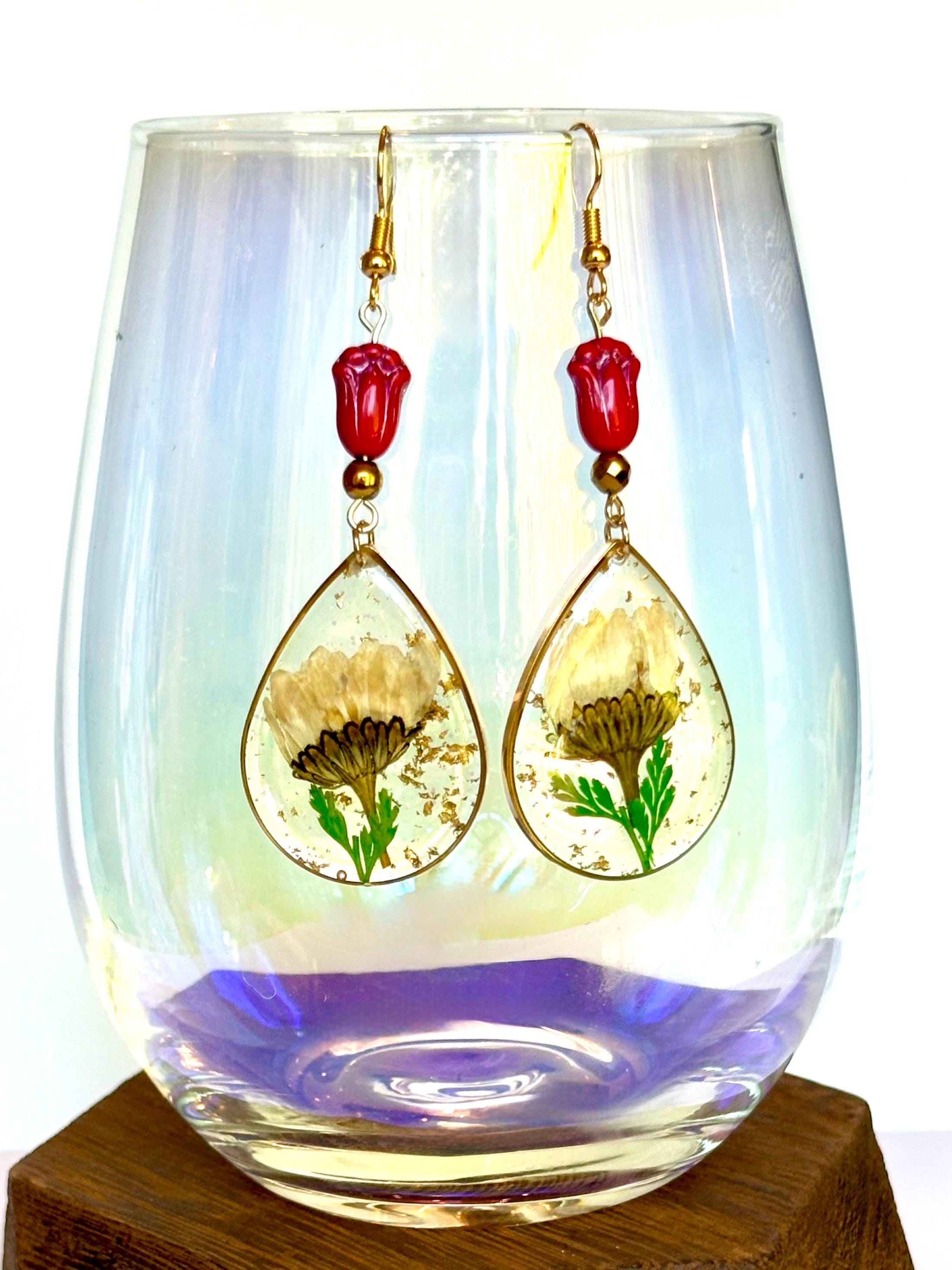 Celebrate the beauty of the season with the Enchanted Majestic Holiday Bouquet Earrings, where nature’s grace meets festive elegance! These stunning handmade earrings feature Czech glass red tulip beads, radiant gold hematite gemstones, and shimmering resin teardrop pendants encasing real pressed flowers and delicate gold leaf accents — a timeless blend of warmth, nature, and sparkle.