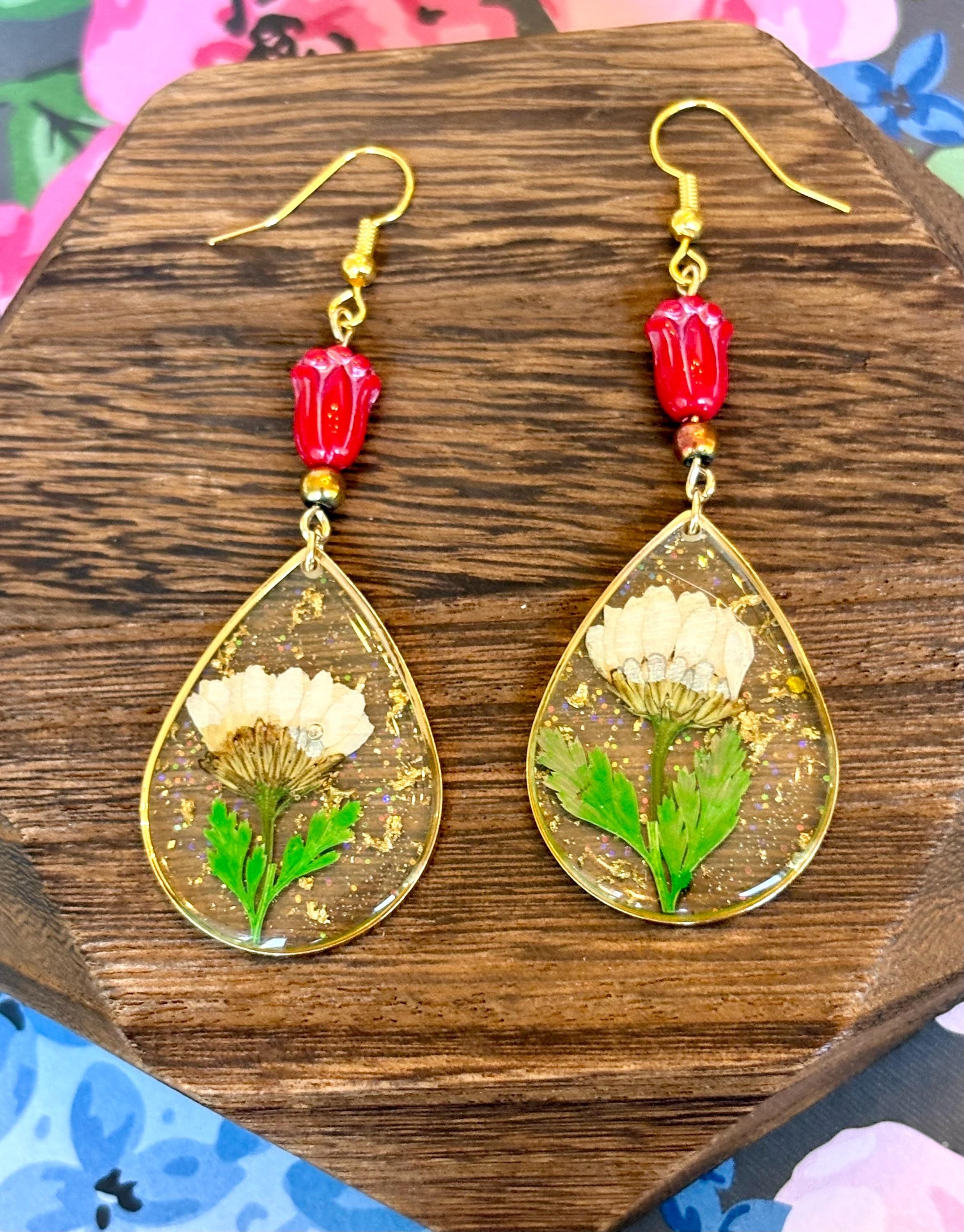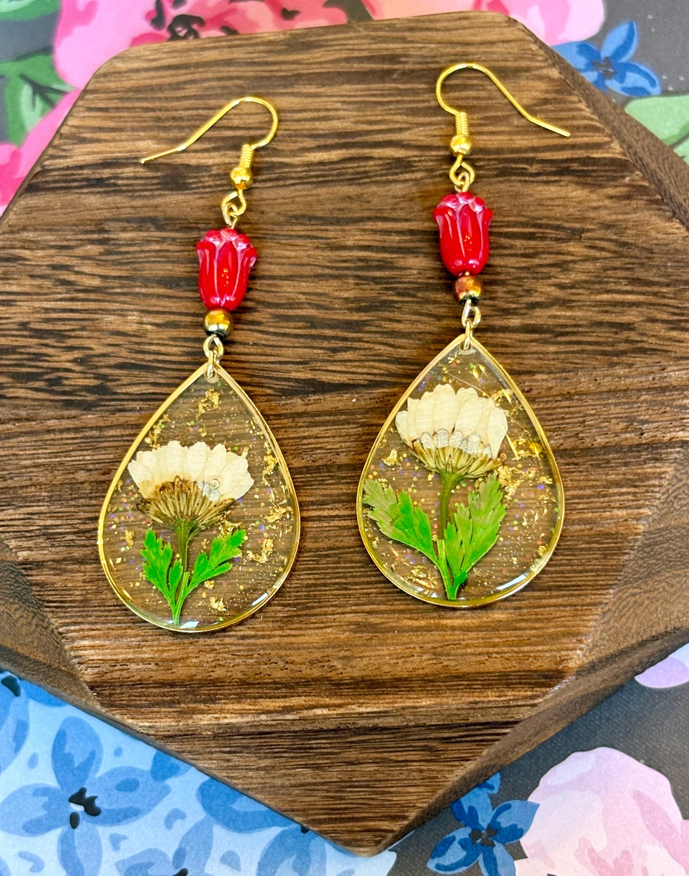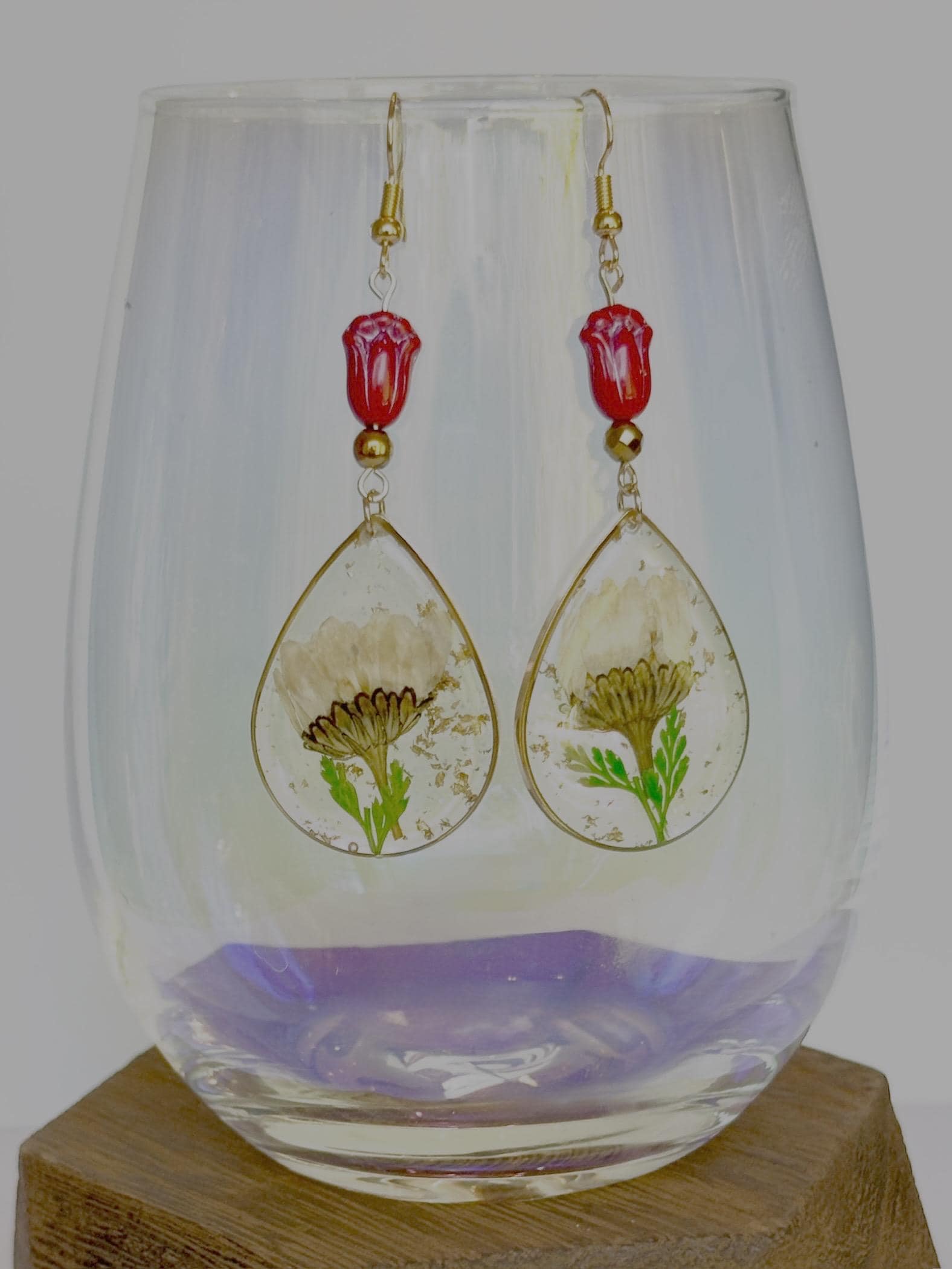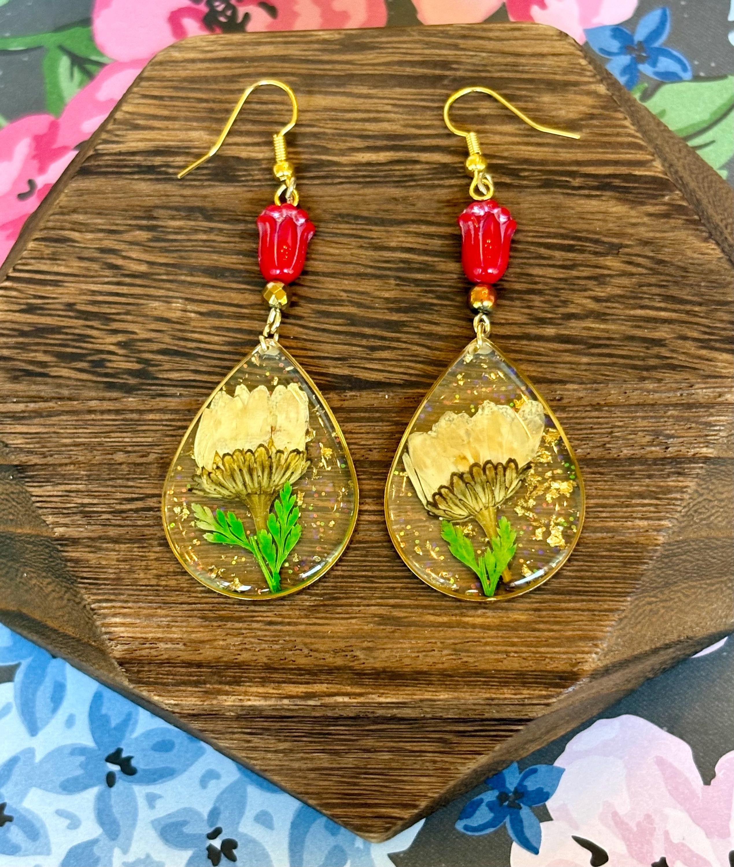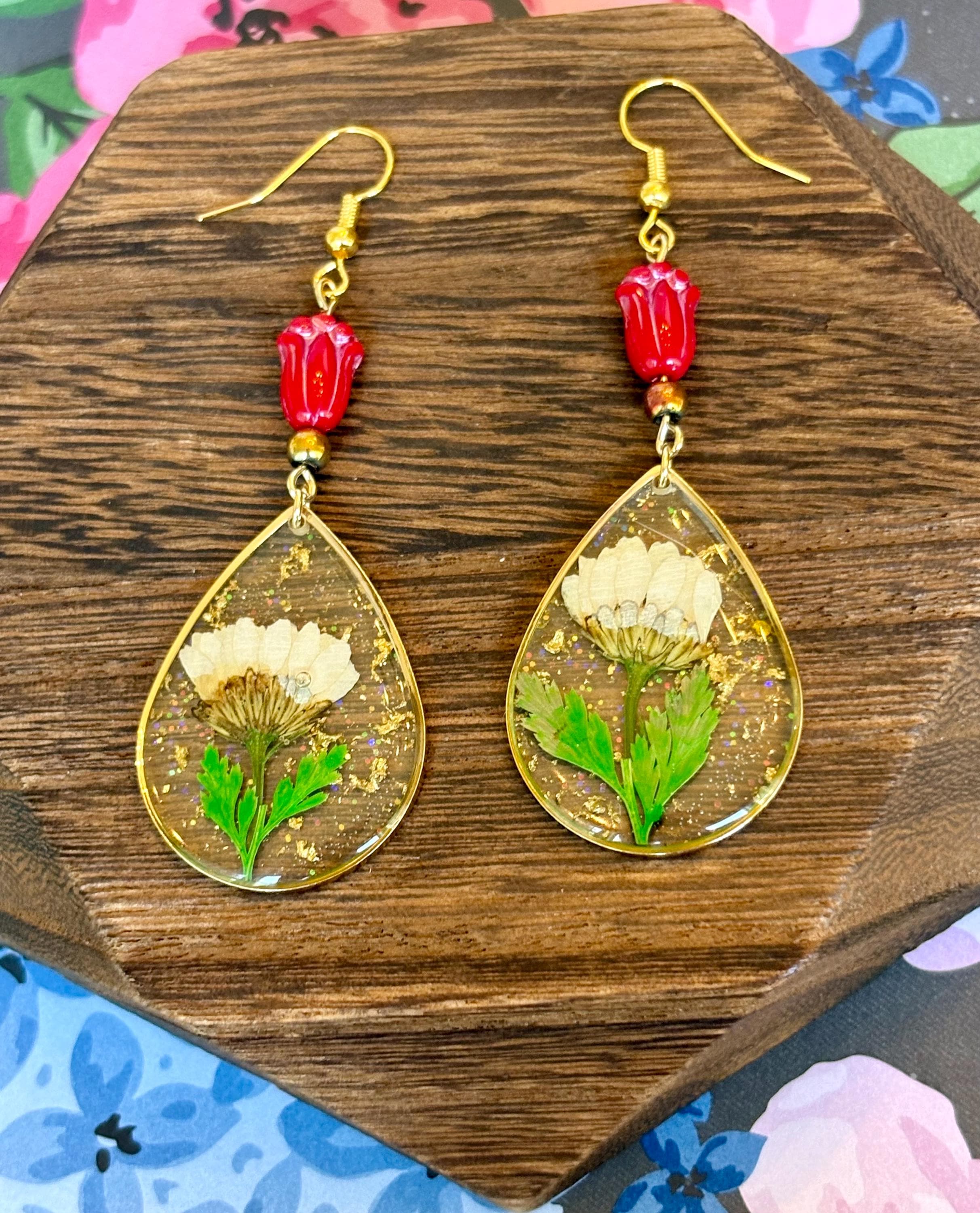 Celebrate the beauty of the season with the Enchanted Majestic Holiday Bouquet Earrings, where nature’s grace meets festive elegance! These stunning handmade earrings feature Czech glass red tulip beads, radiant gold hematite gemstones, and shimmering resin teardrop pendants encasing real pressed flowers and delicate gold leaf accents — a timeless blend of warmth, nature, and sparkle.