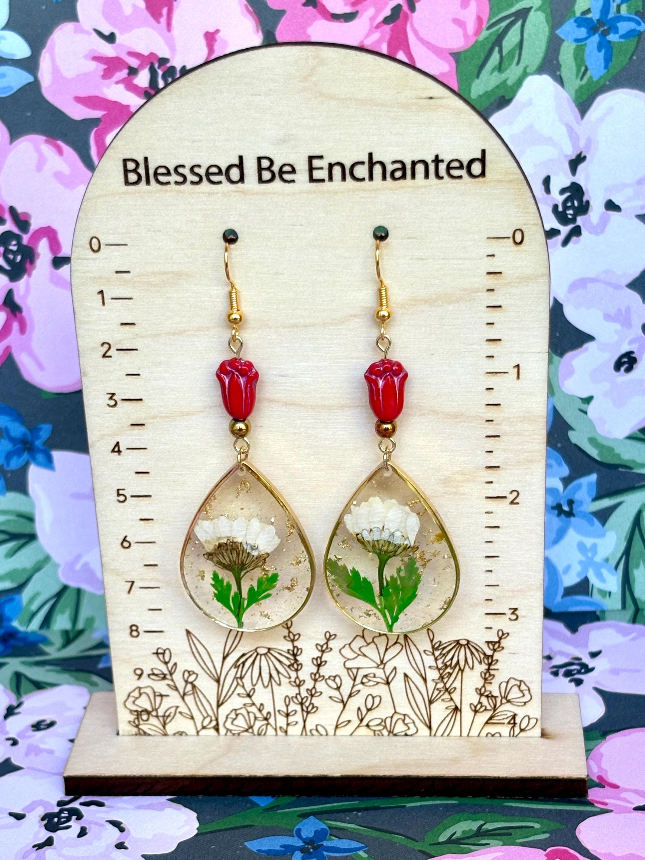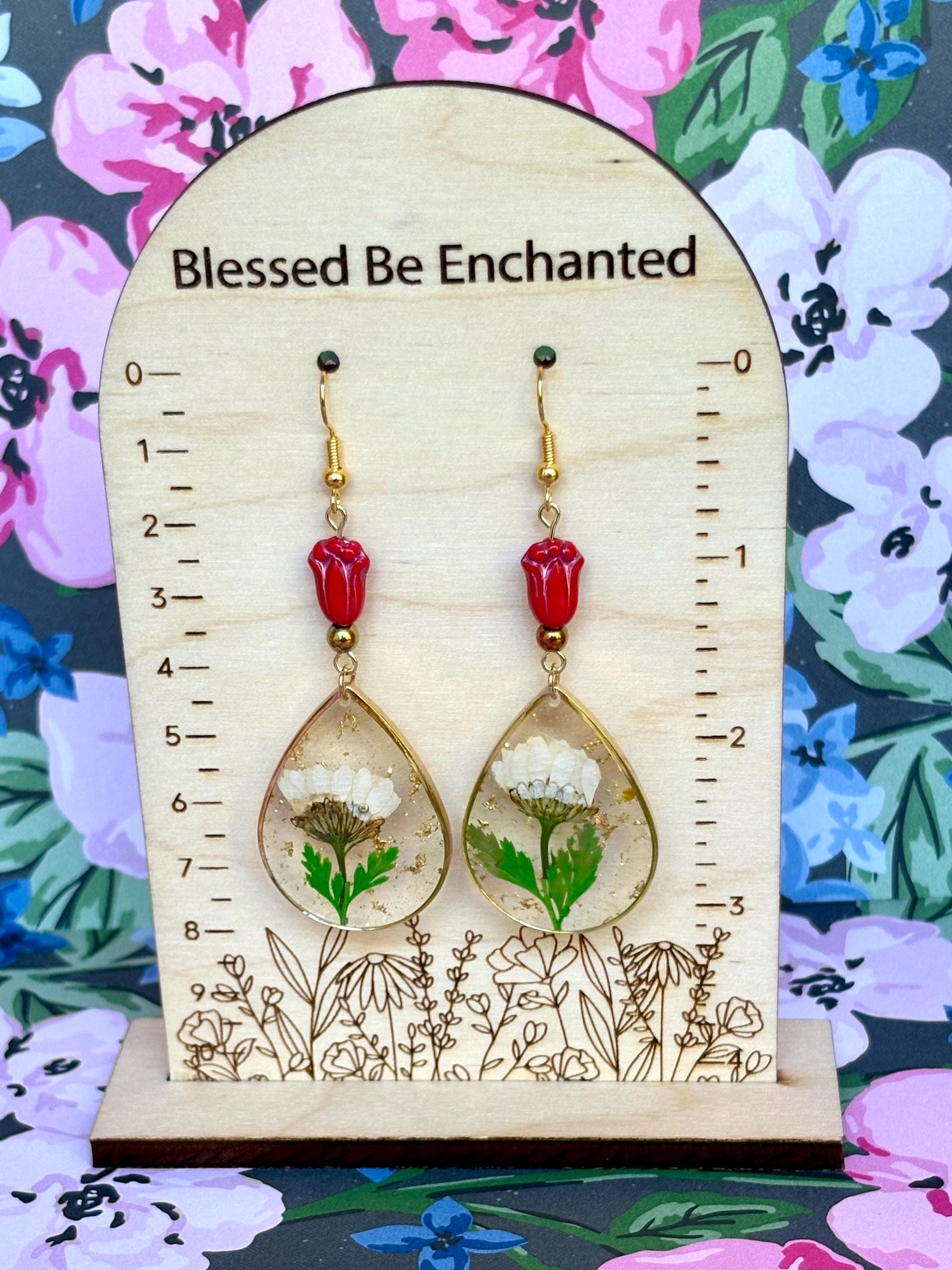 Enchanted Majestic Holiday Bouquet Earrings – Czech Glass Red Tulips, Gold Hematite & Pressed Flower Resin Pendants | Hypoallergenic 316L Stainless Steel