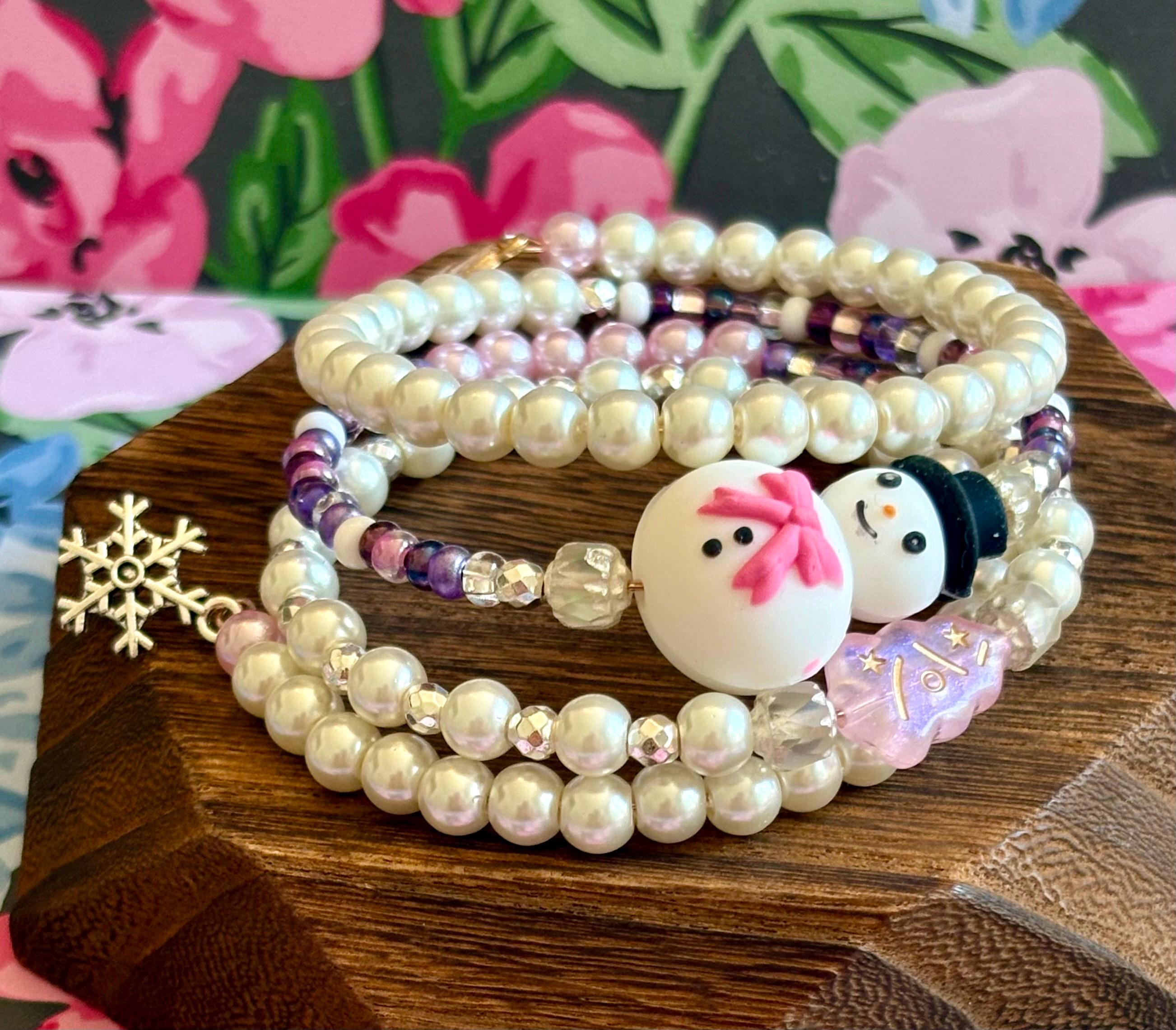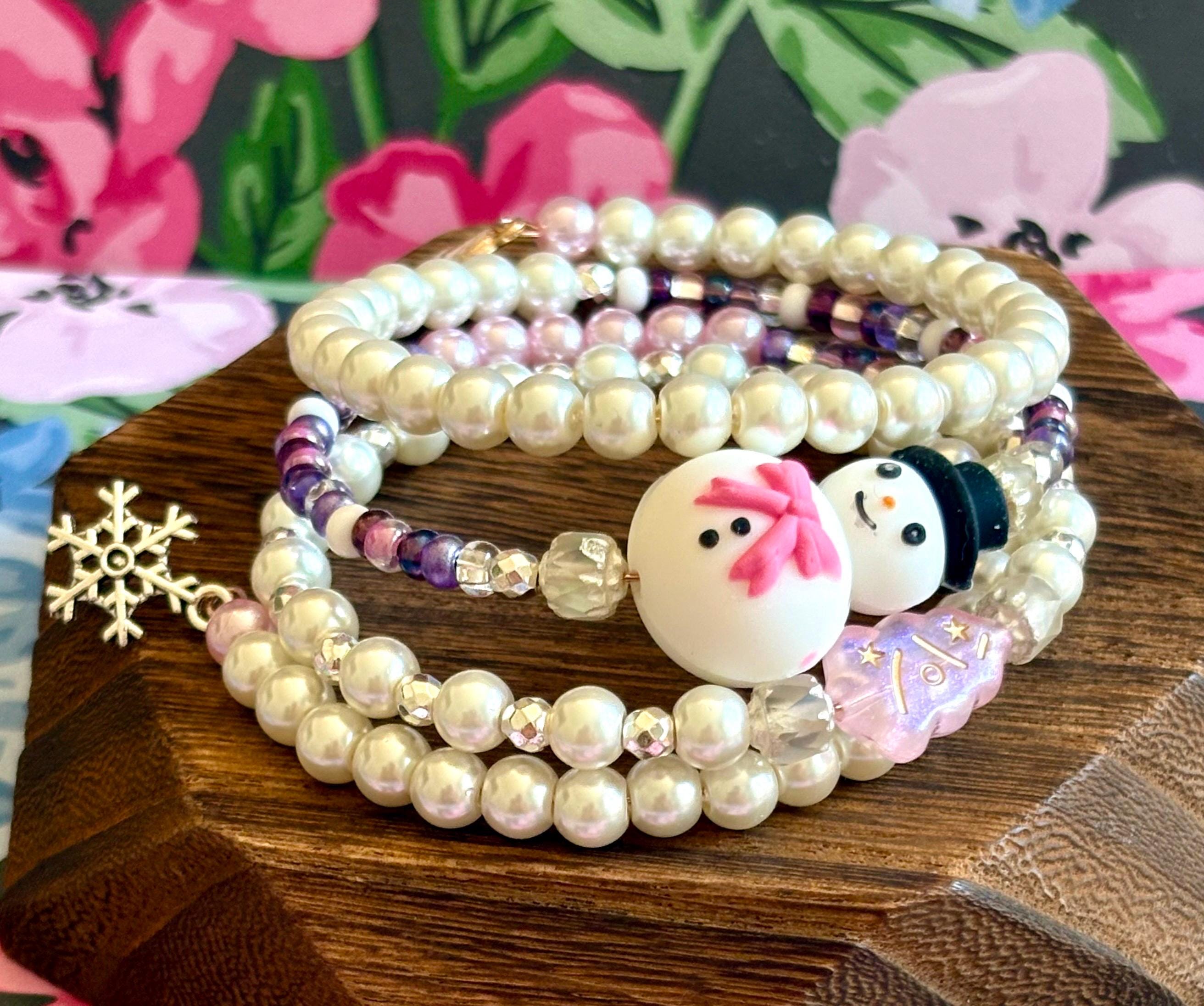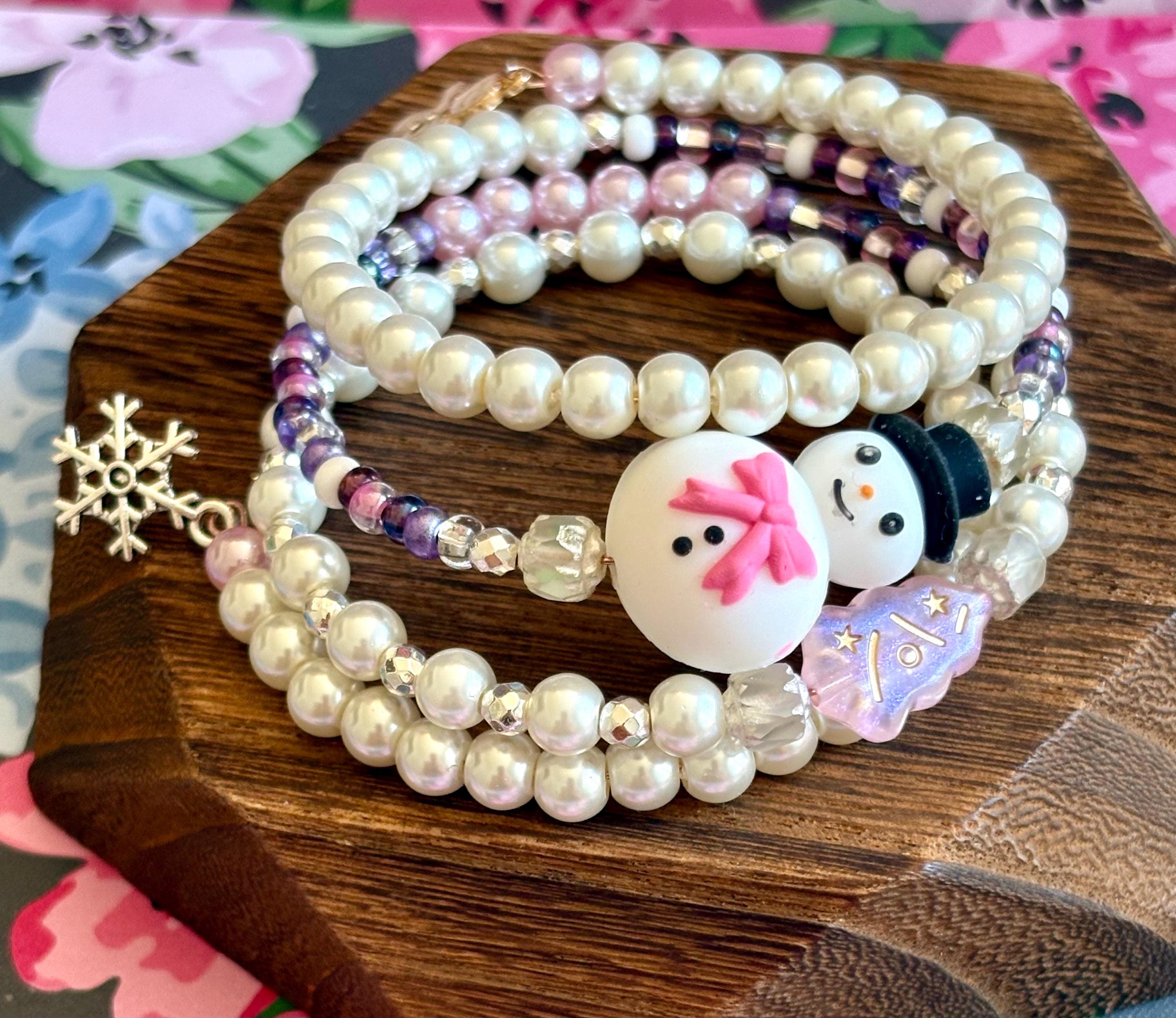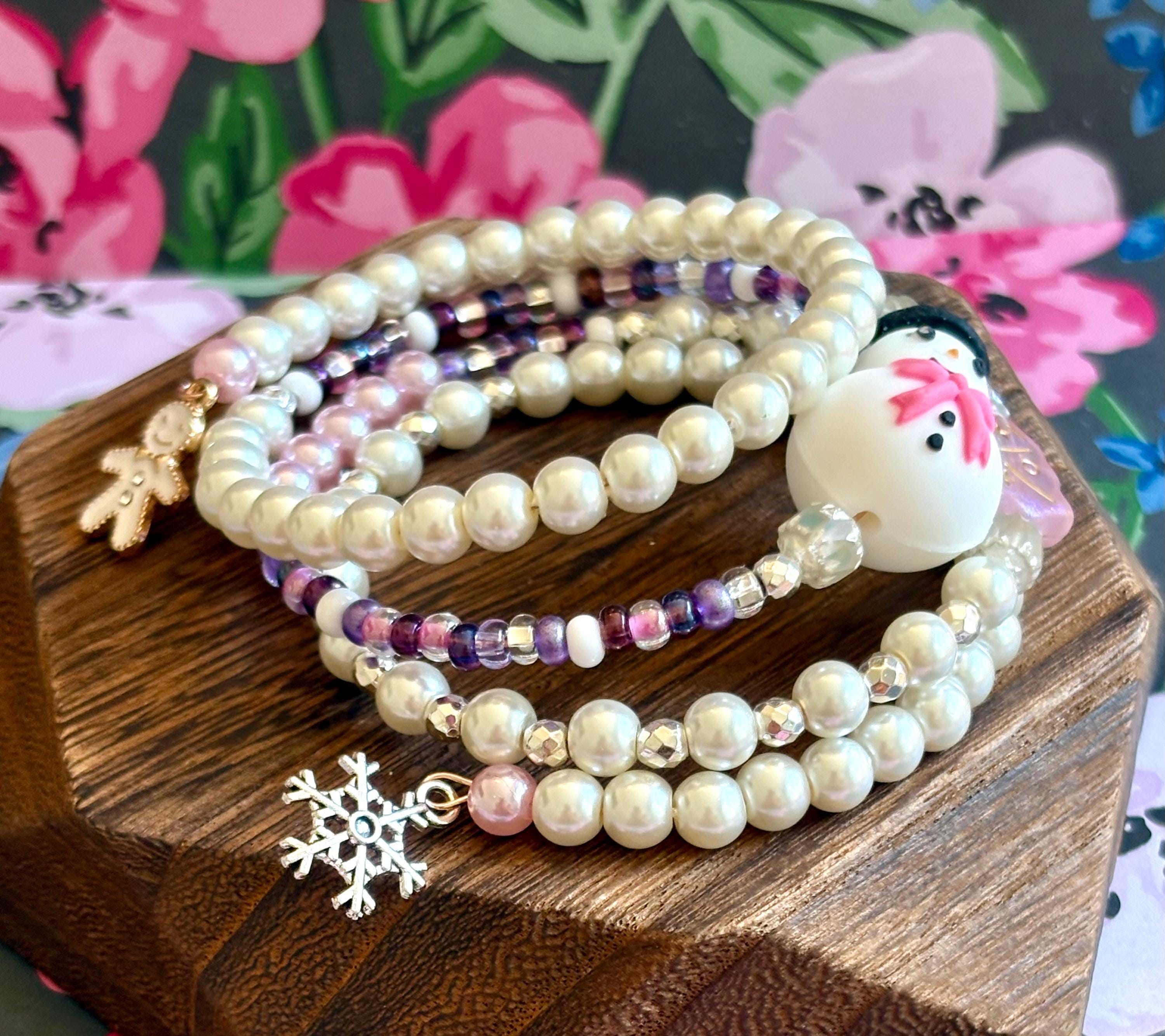 Enchanted Frosted Friends Holiday Wrap Bracelet – Snowman Beads, Metallic Pearls & Hematite Gemstones | Holiday Kissed Wrap Collection | Reiki-Infused Gift