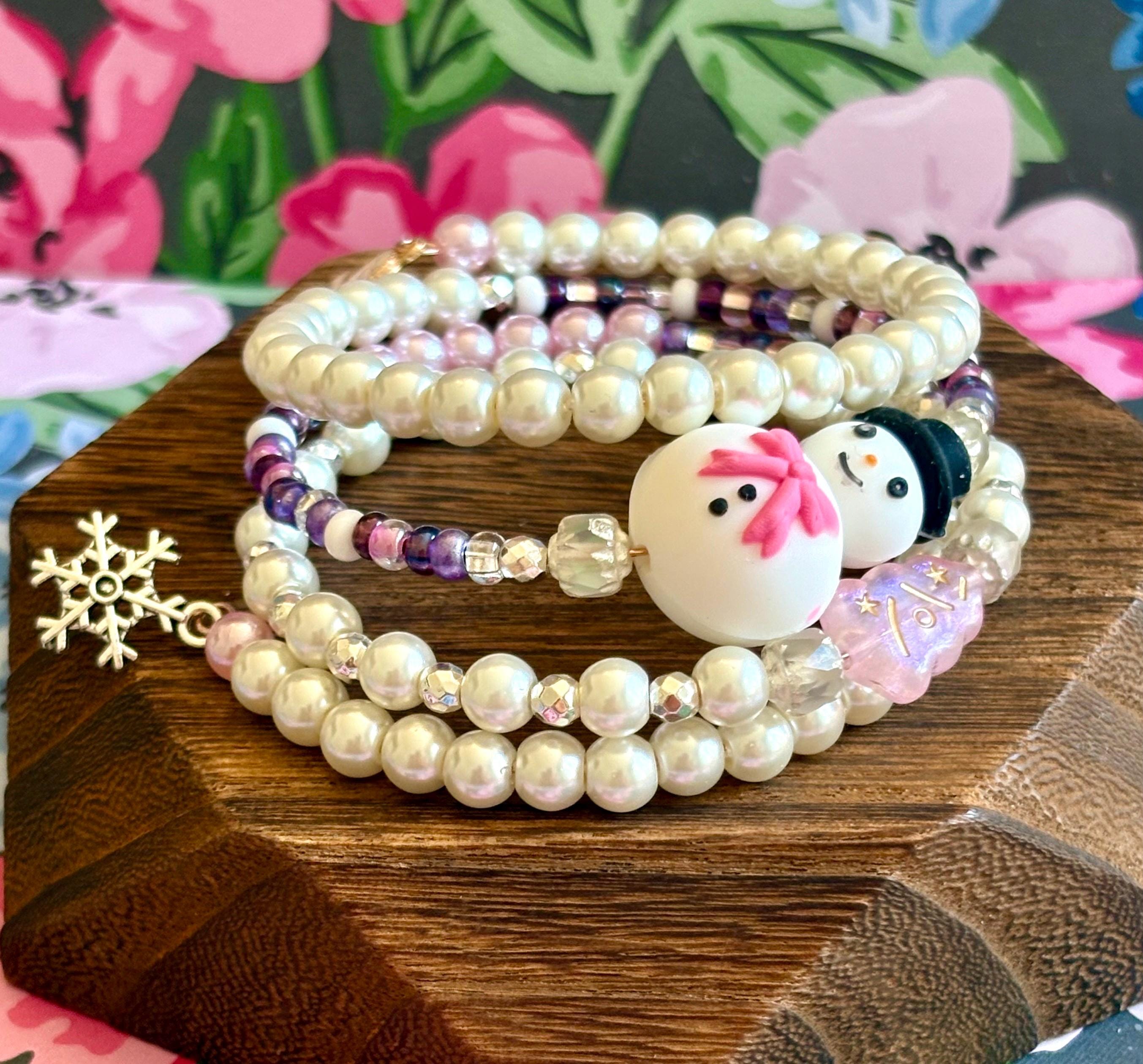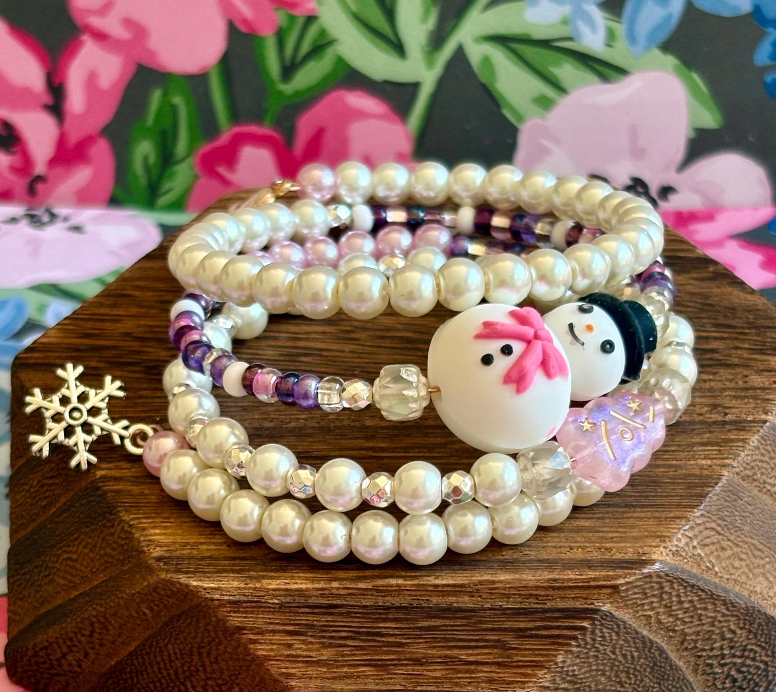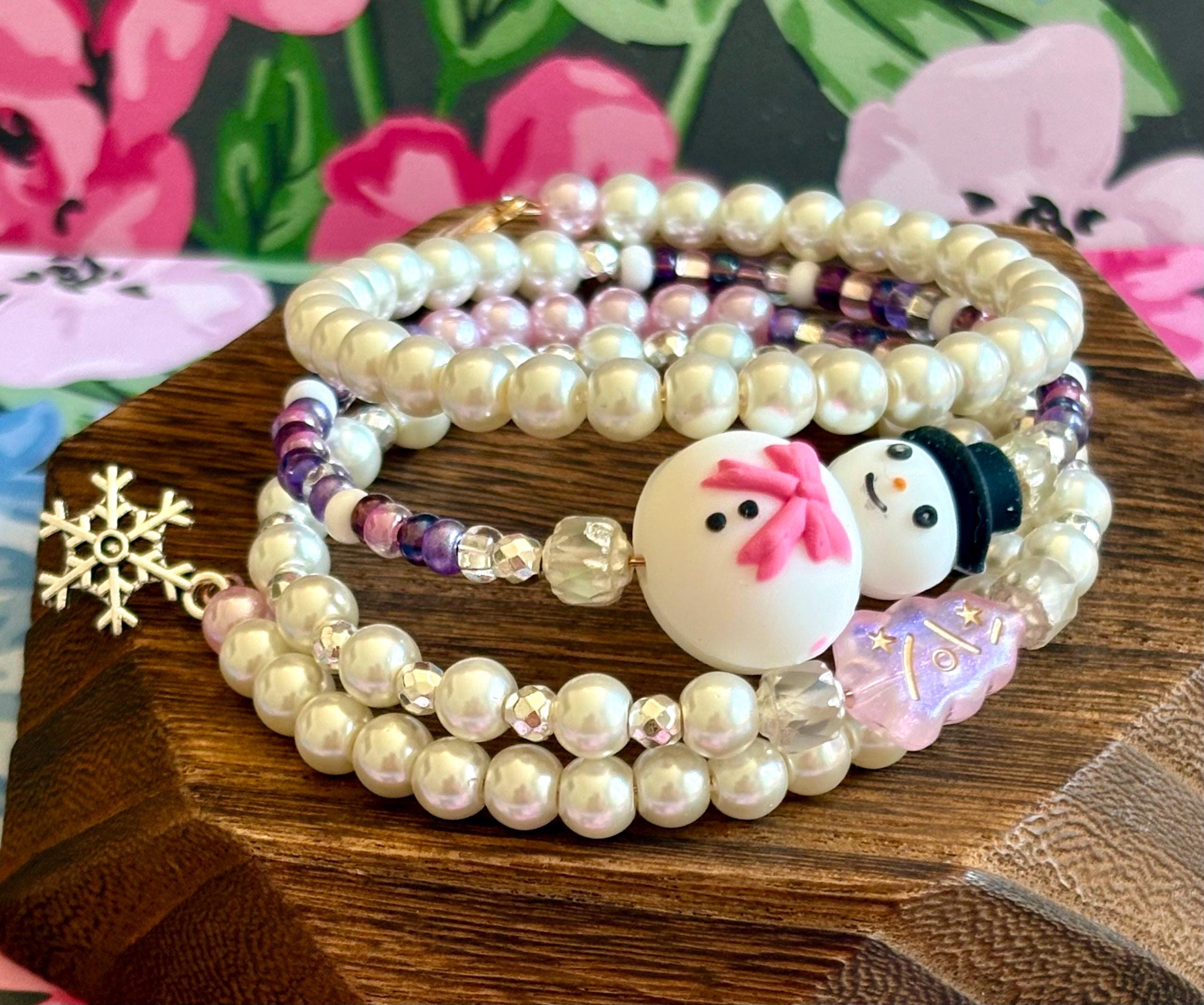 Enchanted Frosted Friends Holiday Wrap Bracelet – Snowman Beads, Metallic Pearls & Hematite Gemstones | Holiday Kissed Wrap Collection | Reiki-Infused Gift