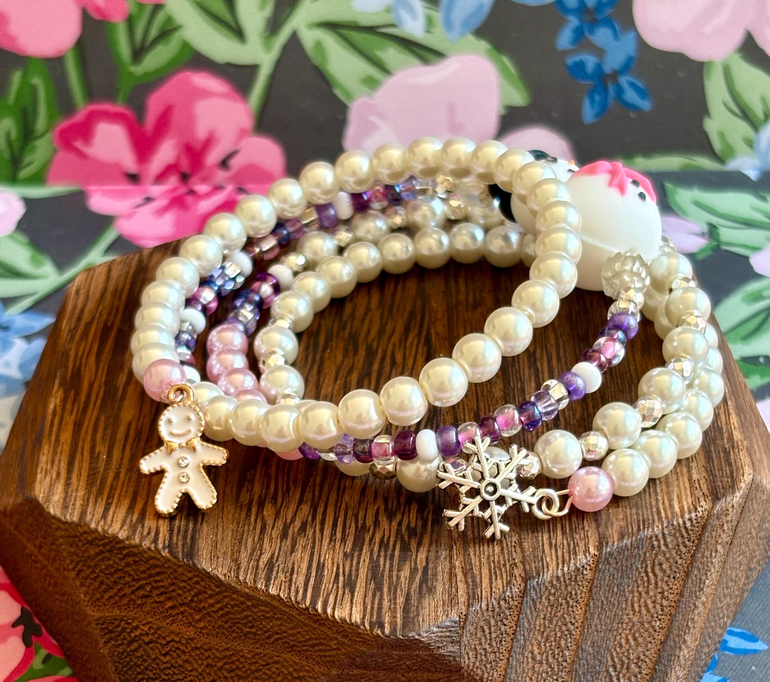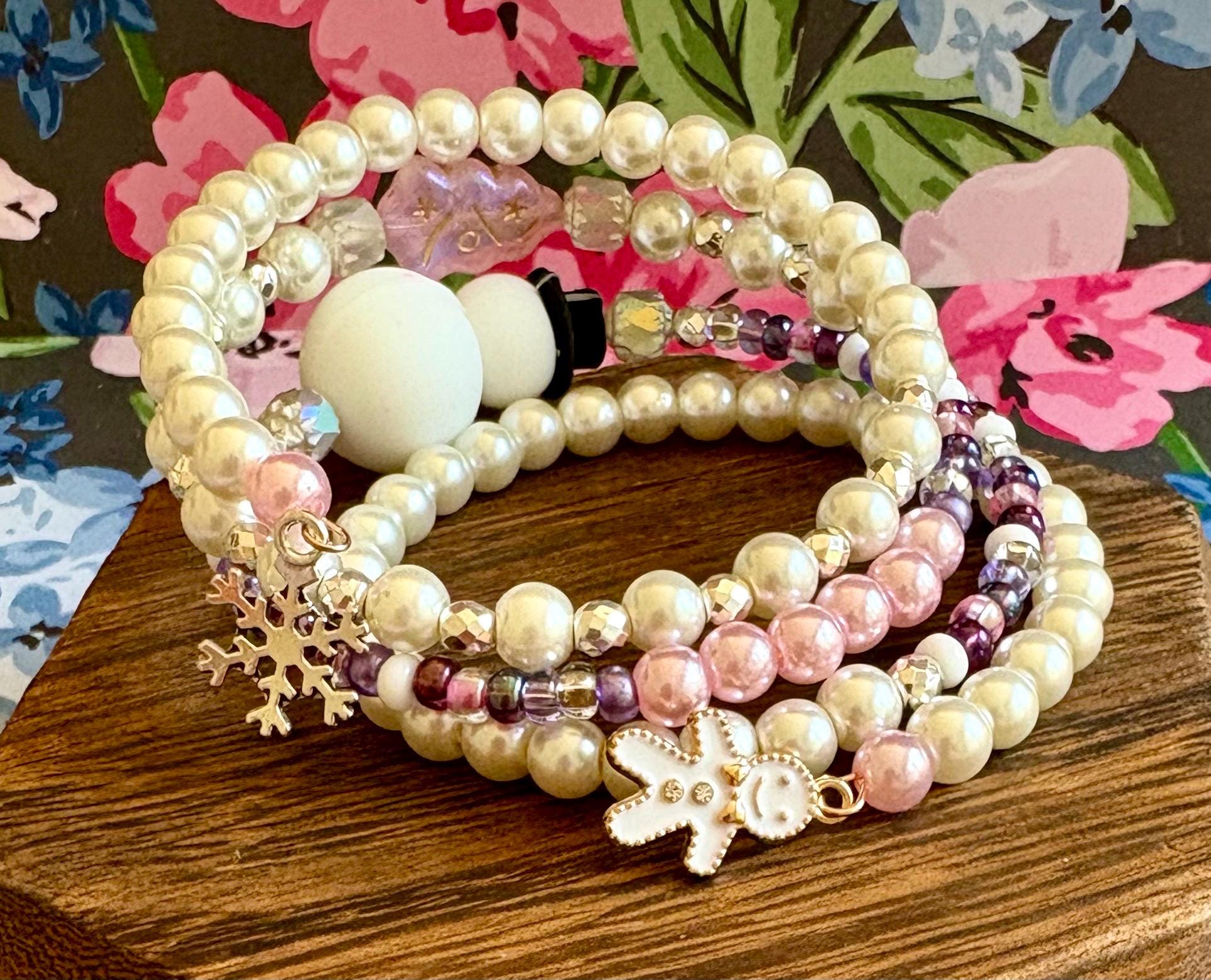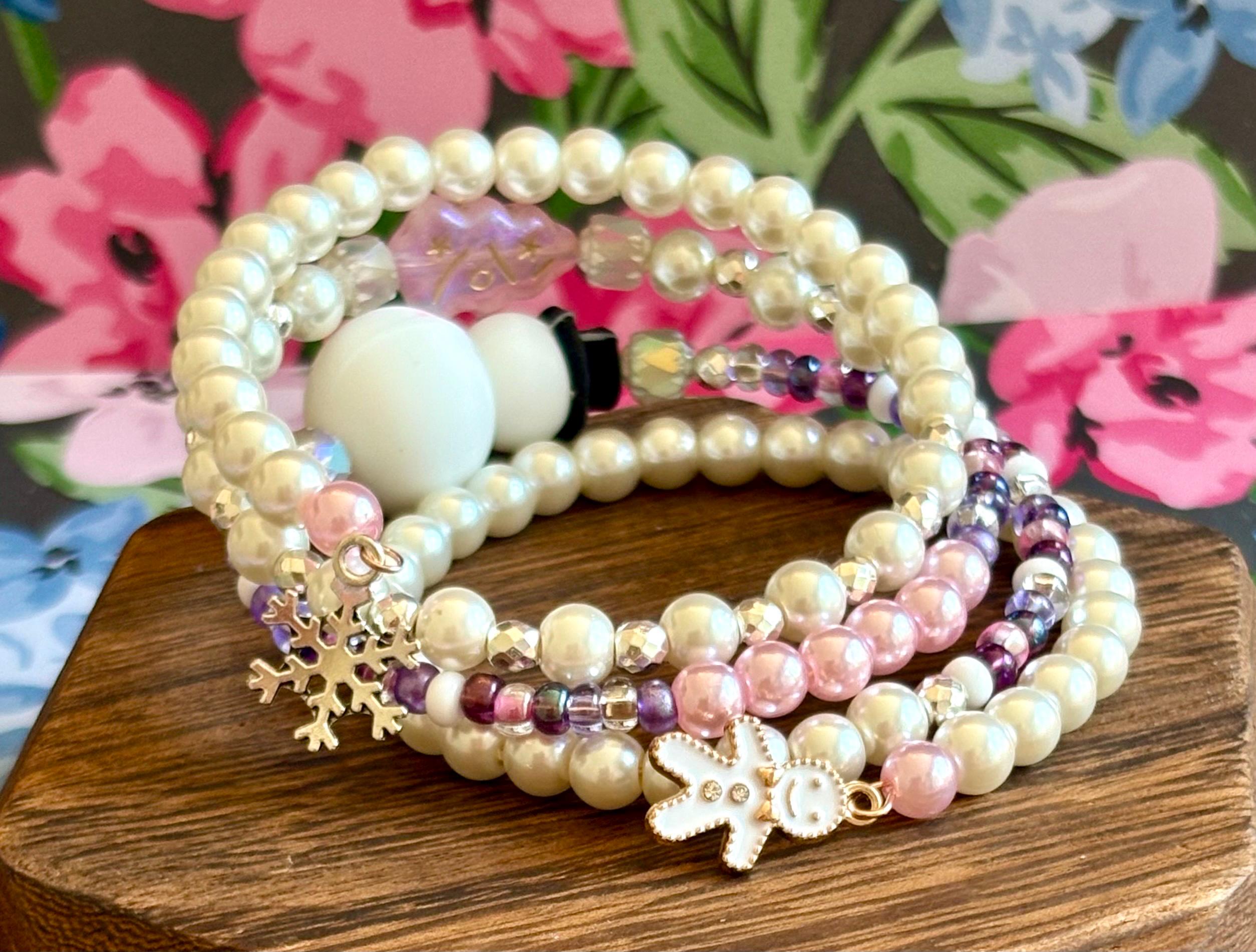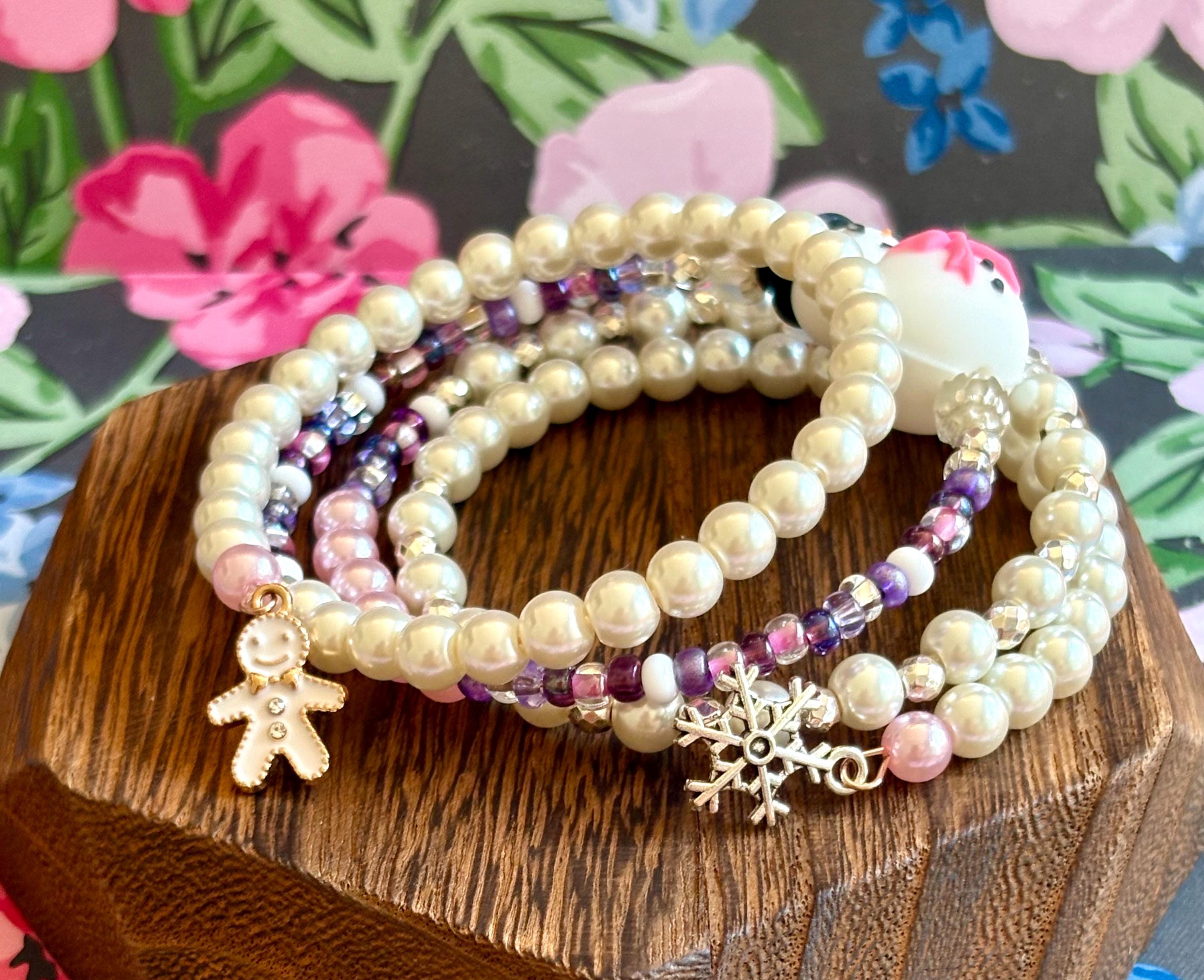 This whimsical multi-layer gemstone wrap captures the magic of the season with metallic pearls, Czech glass cathedral beads, and bright faceted hematite gemstones that shimmer like freshly fallen snow. Adorable snowman silicone beads bring a playful touch, while a white gingerbread man charm, pink Christmas tree accent, and a silver snowflake charm complete the festive look.