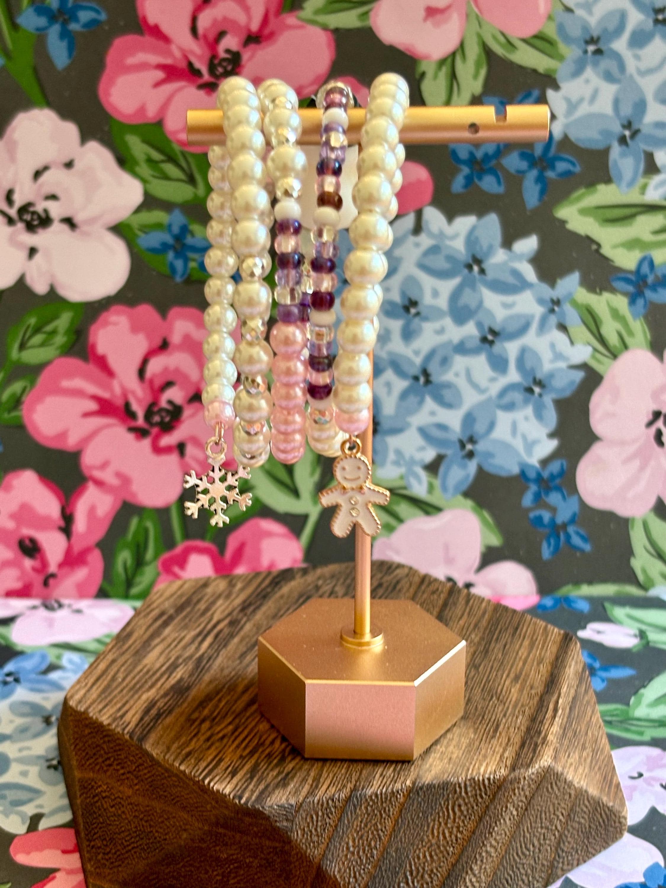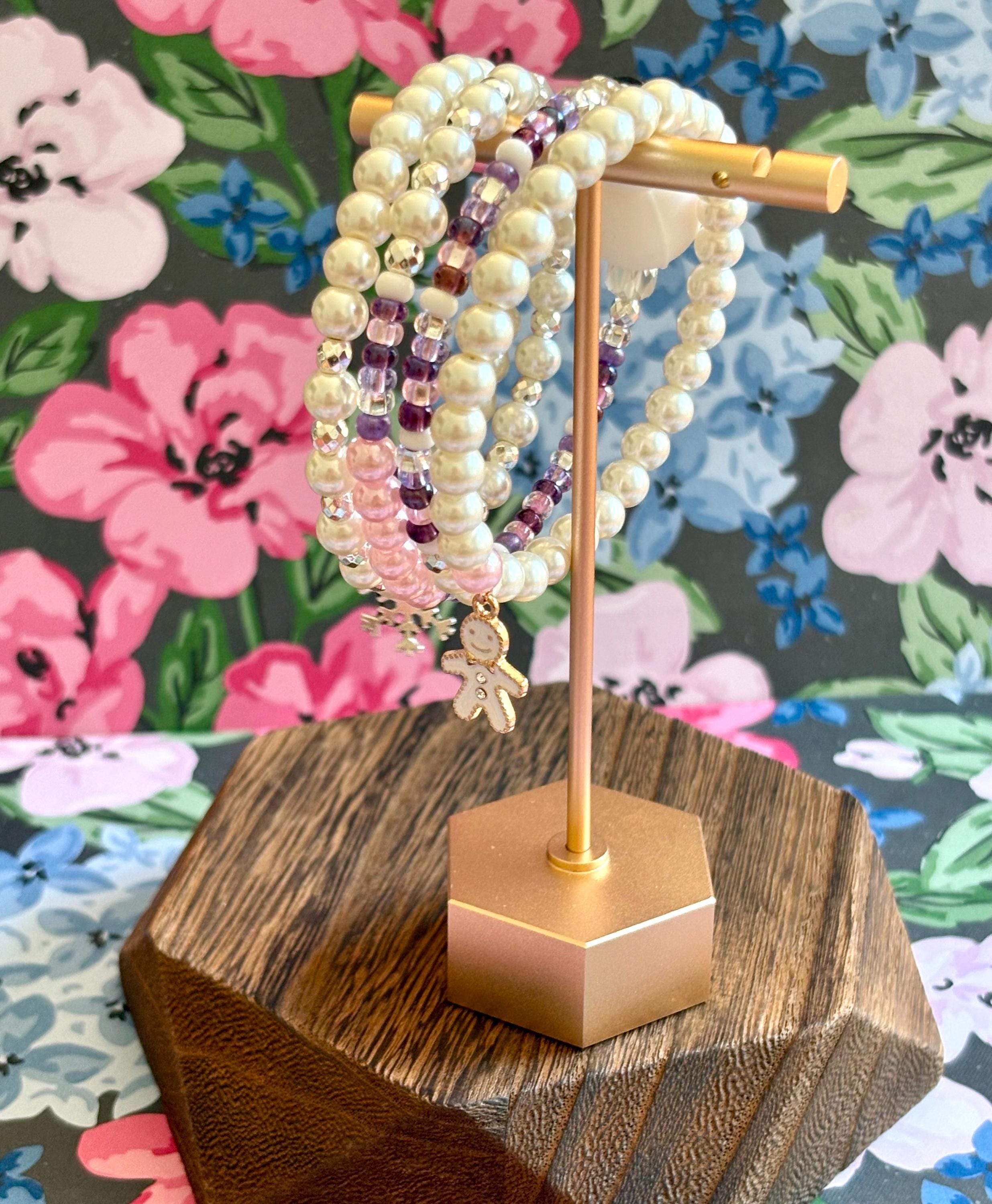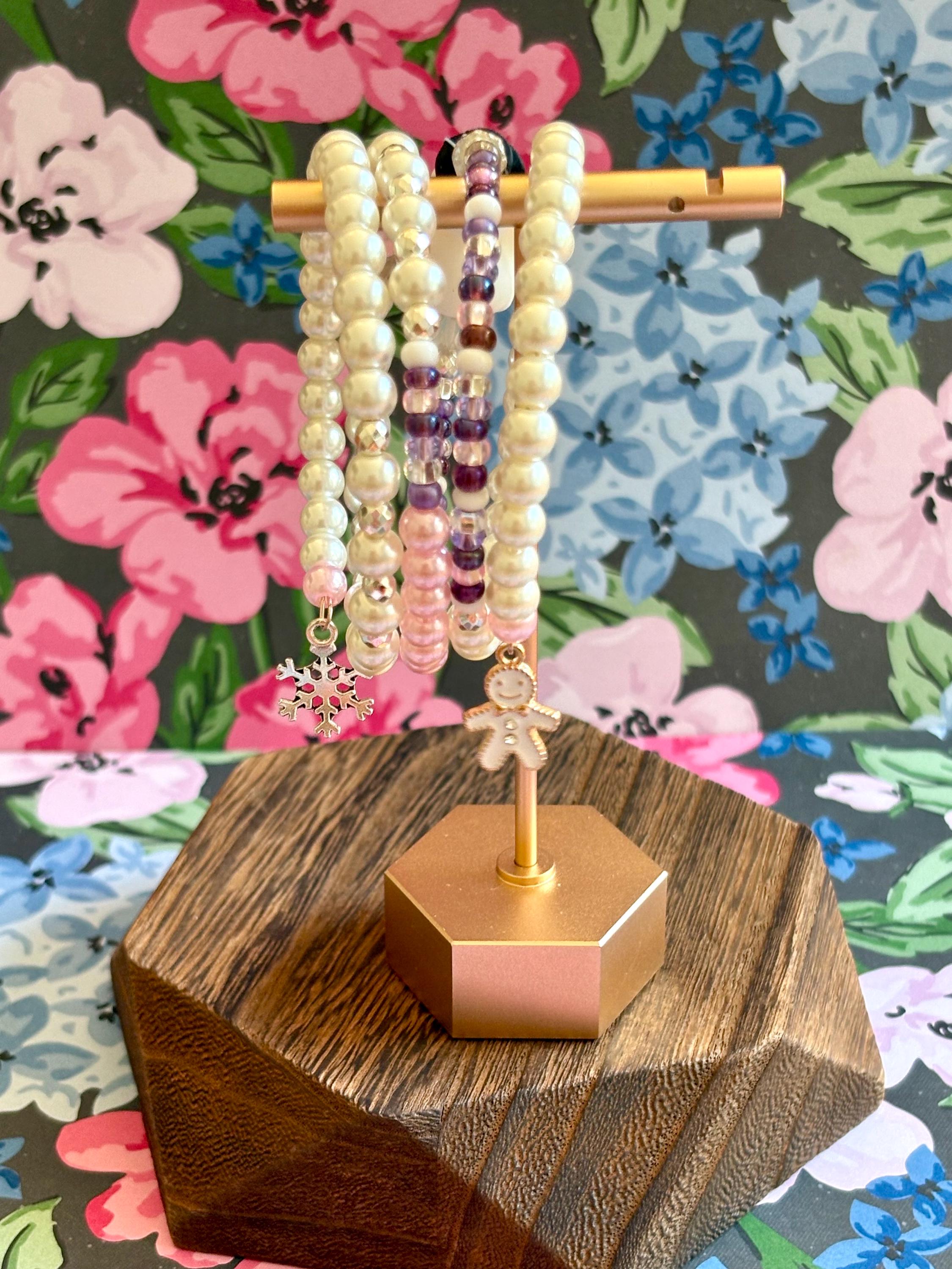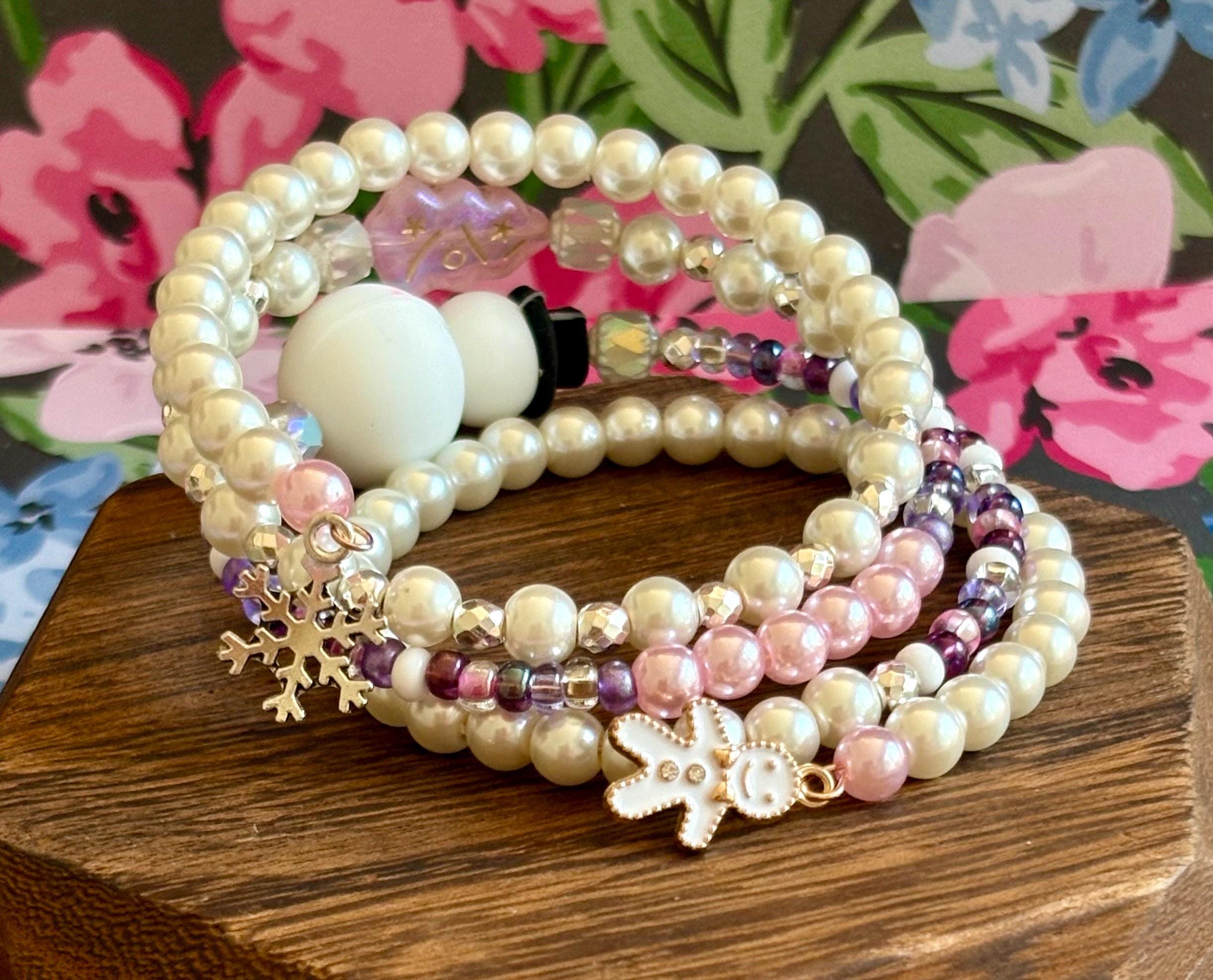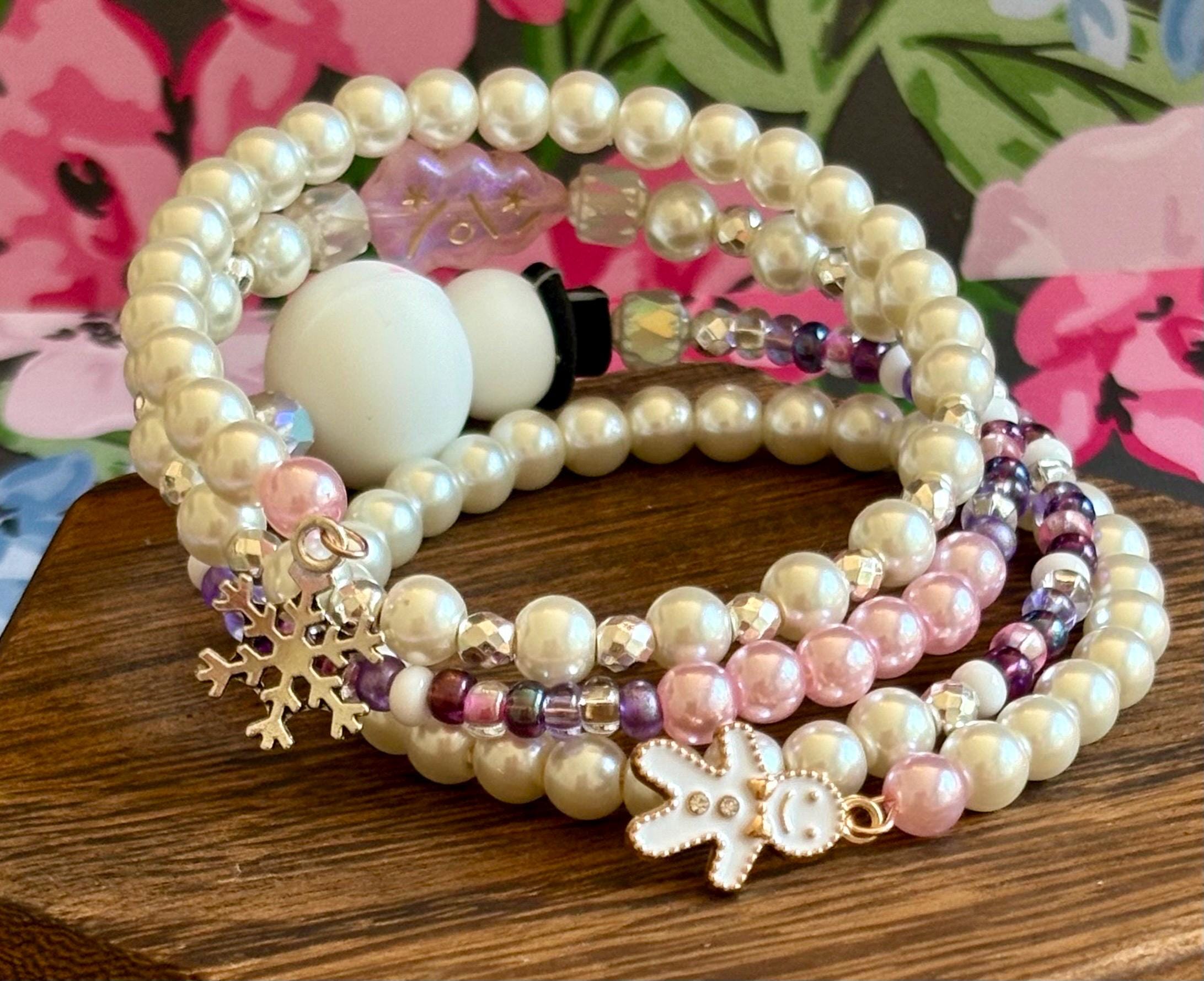 This whimsical multi-layer gemstone wrap captures the magic of the season with metallic pearls, Czech glass cathedral beads, and bright faceted hematite gemstones that shimmer like freshly fallen snow. Adorable snowman silicone beads bring a playful touch, while a white gingerbread man charm, pink Christmas tree accent, and a silver snowflake charm complete the festive look.