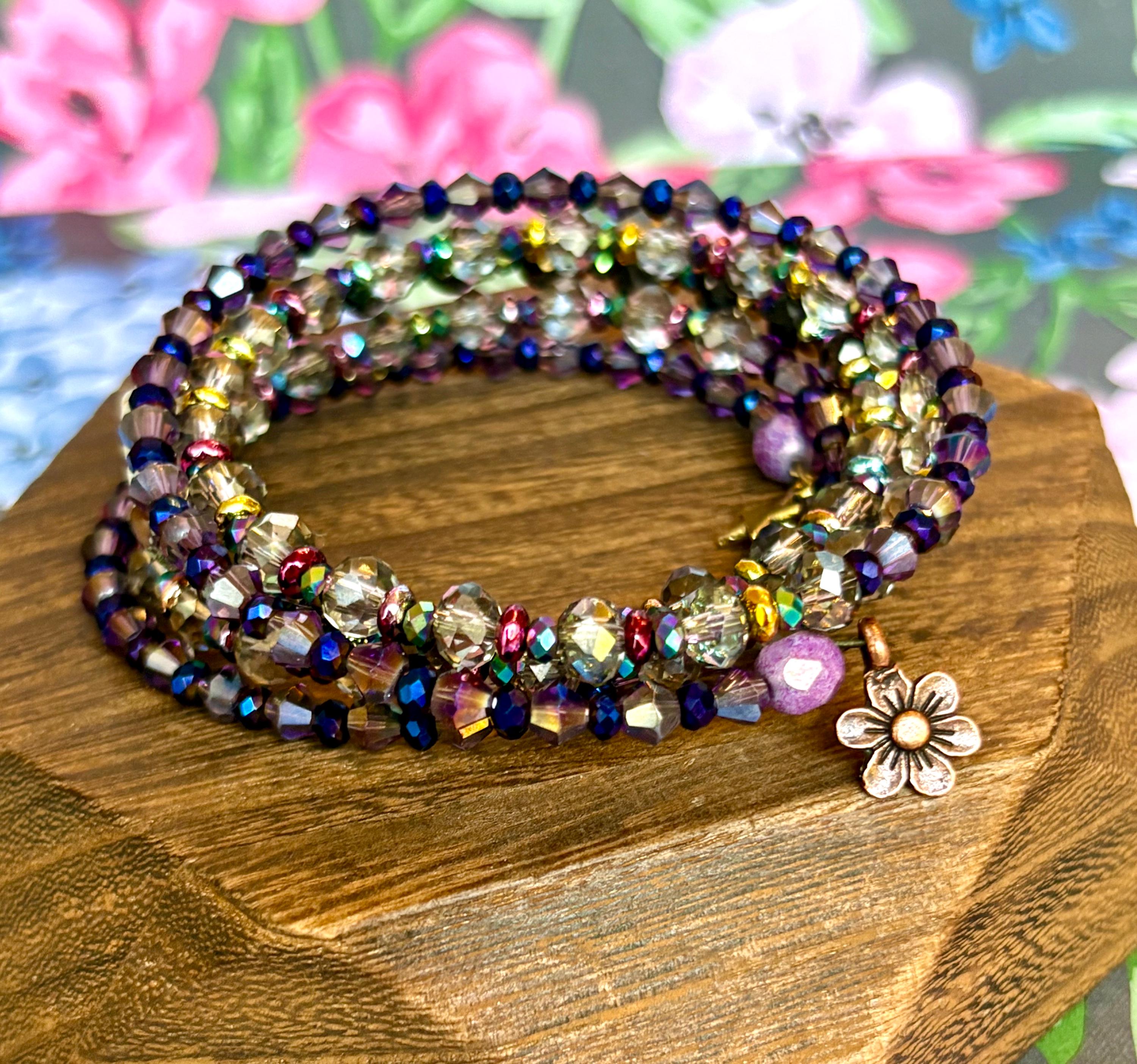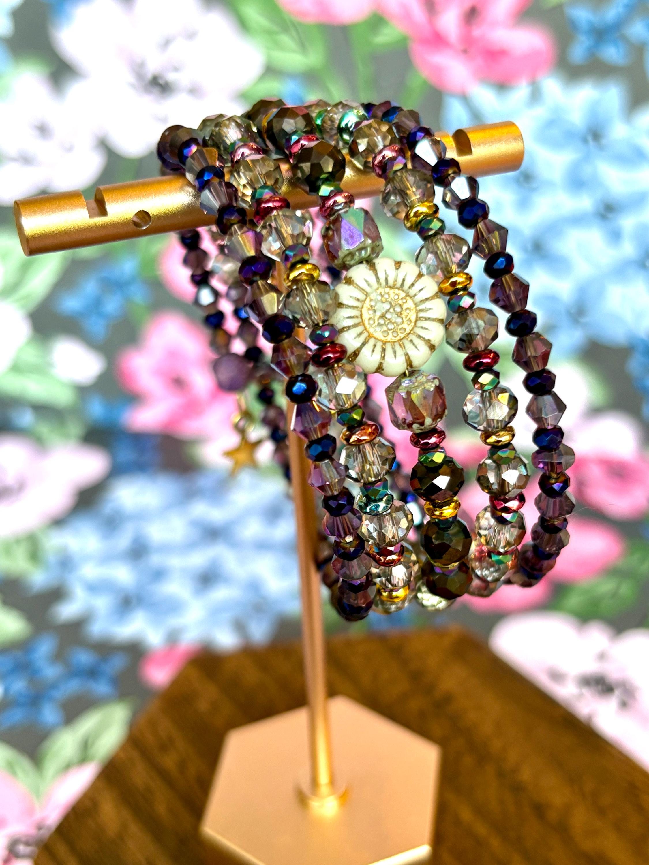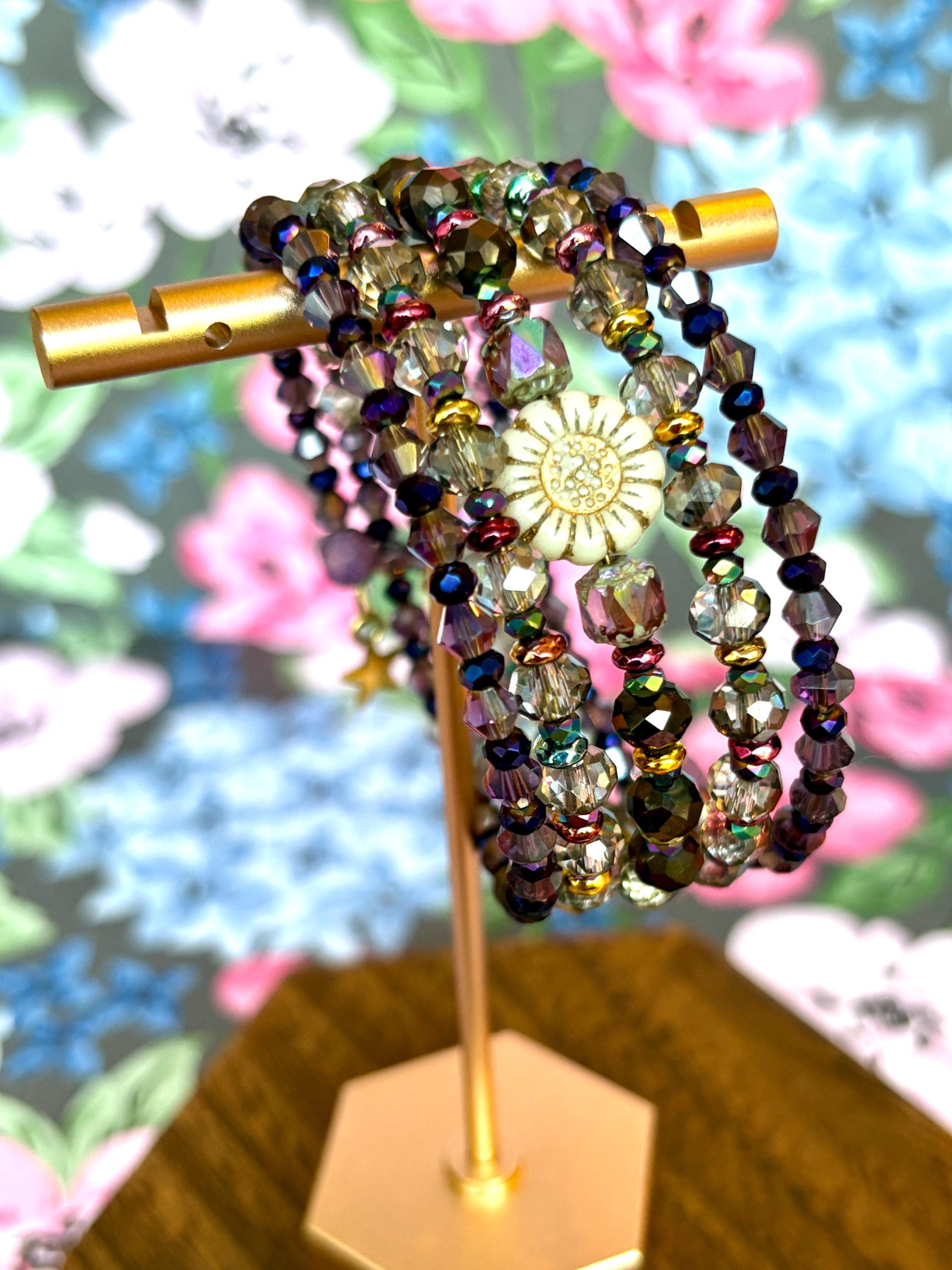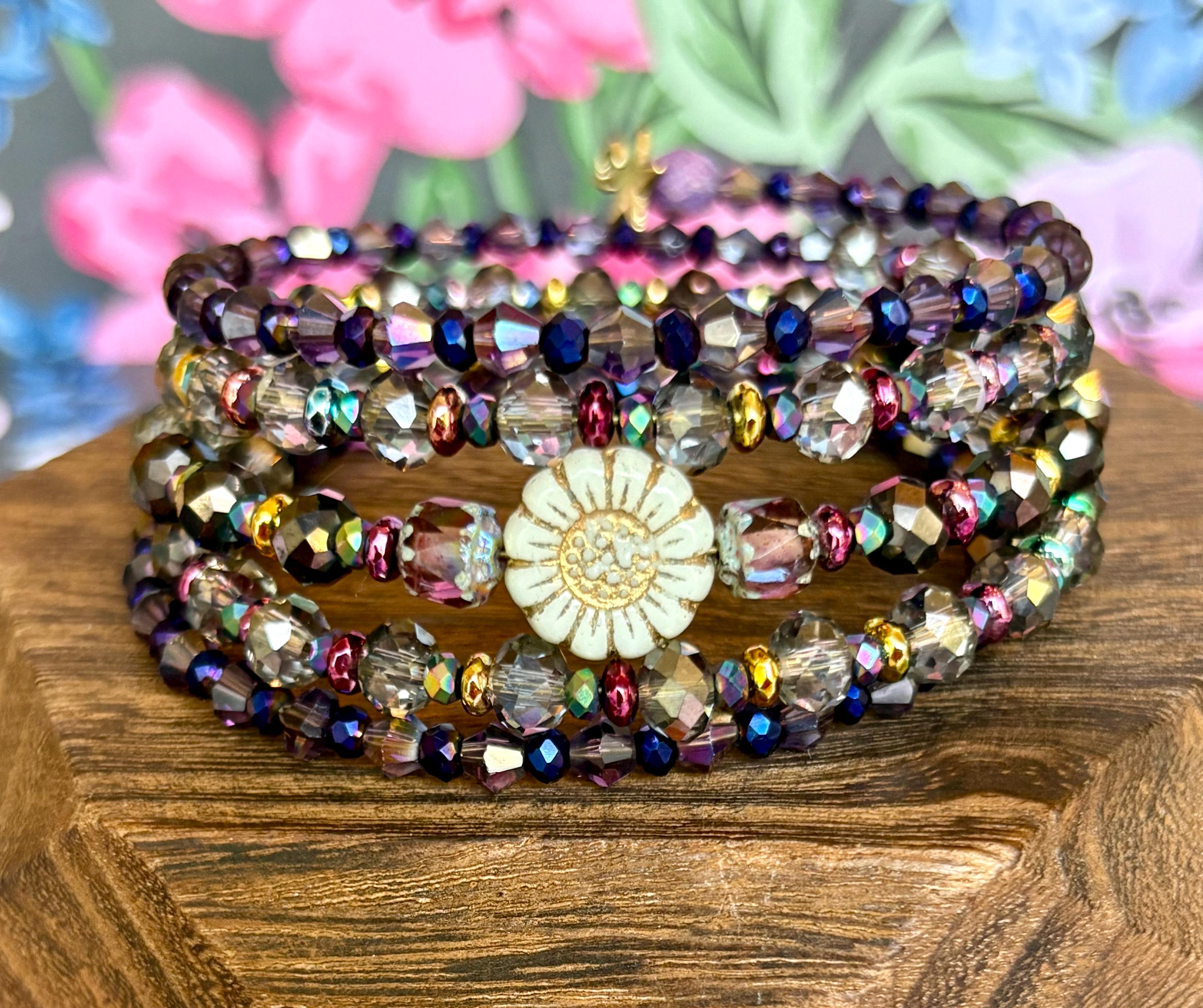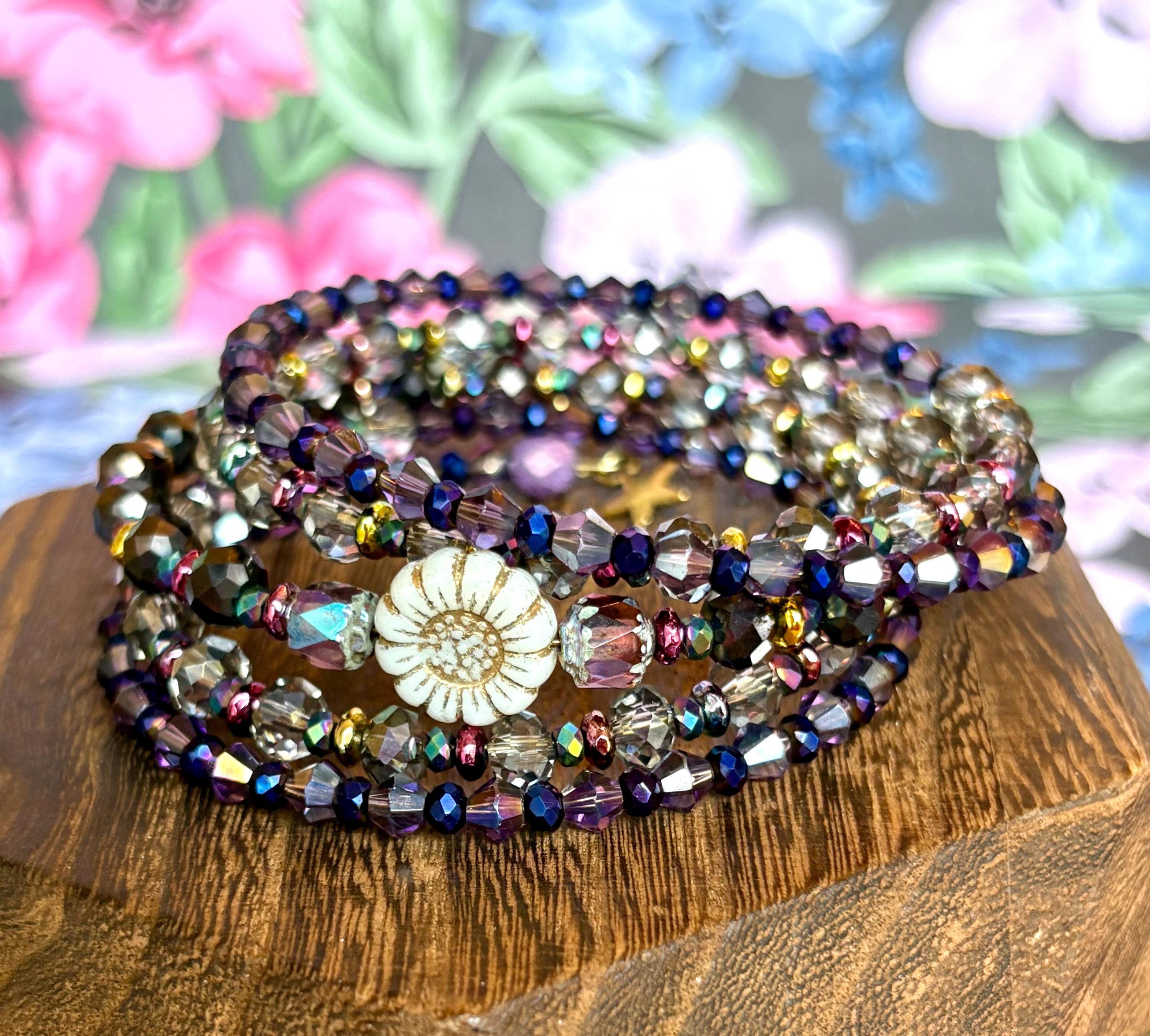 This wrap features an enchanting mix of Czech glass beads in hues of violet, metallic gray, blue, and aurora shimmer, paired with a delicate ivory flower bead with white wash as the centerpiece. Faceted Czech cathedral beads, purple melon beads, and luminous rainbow hematite add celestial sparkle, while the finishing touches — a gold star charm and an antique copper flower charm — bring warmth and harmony to the design.