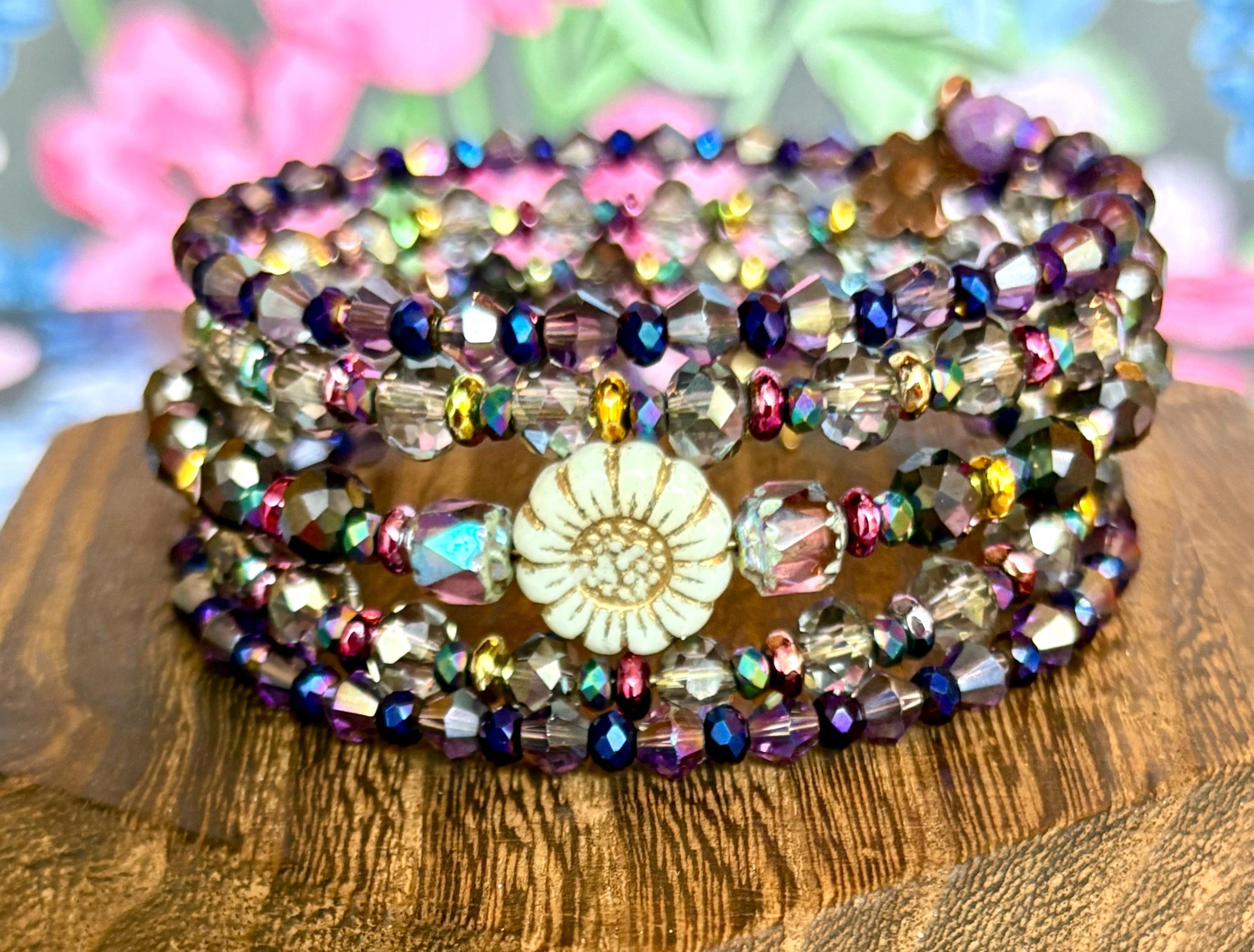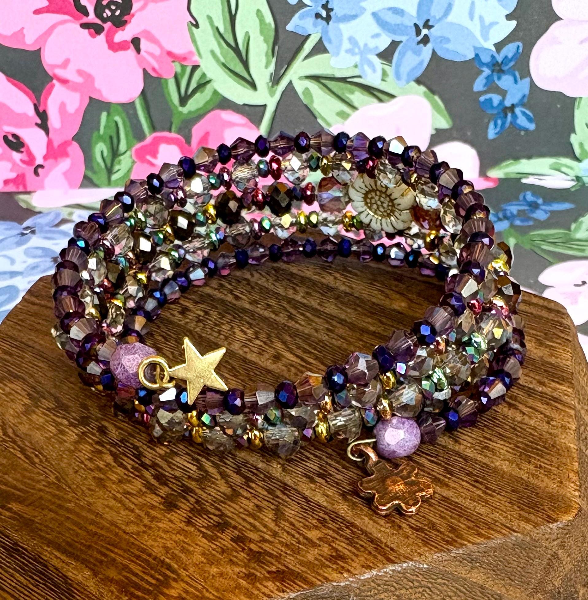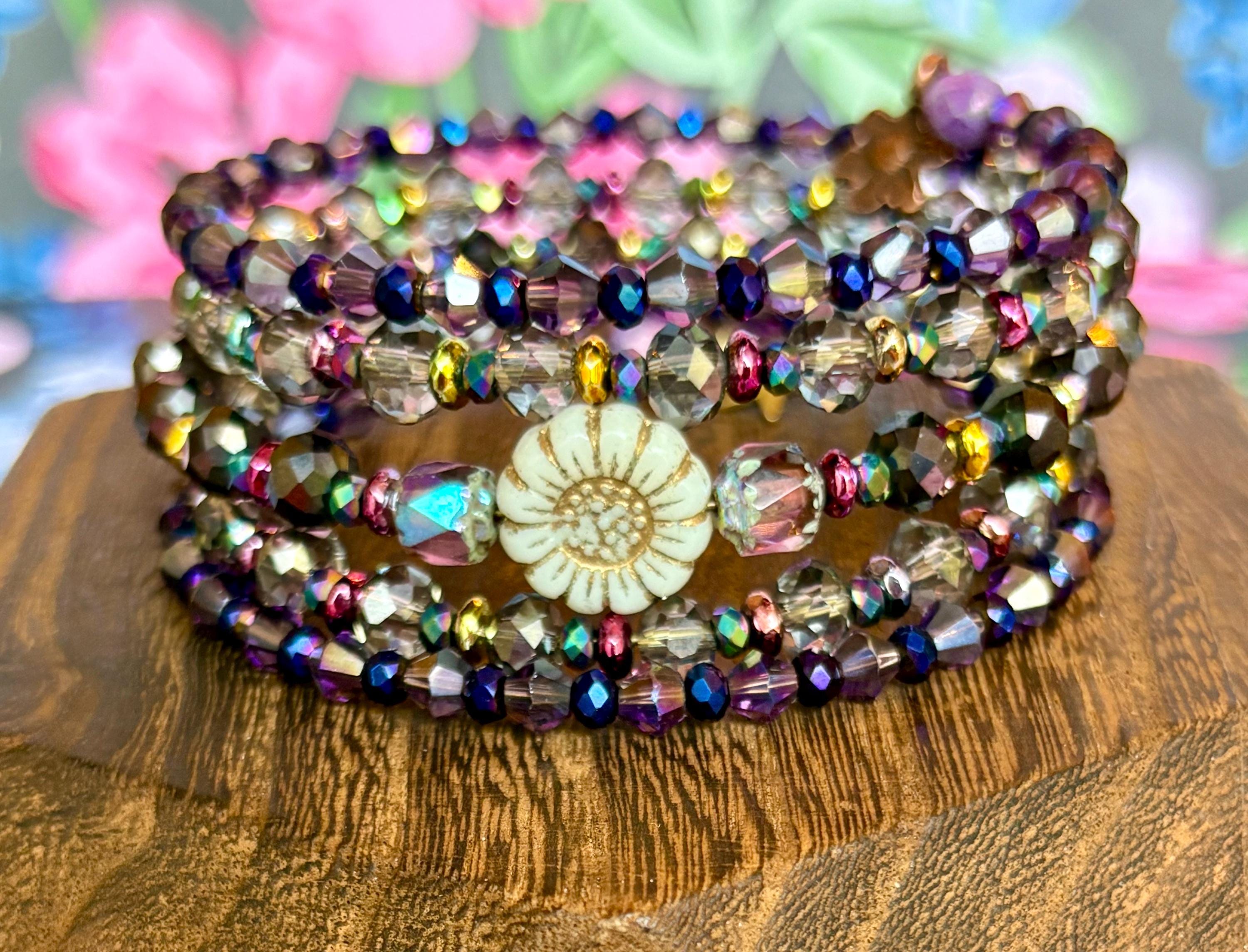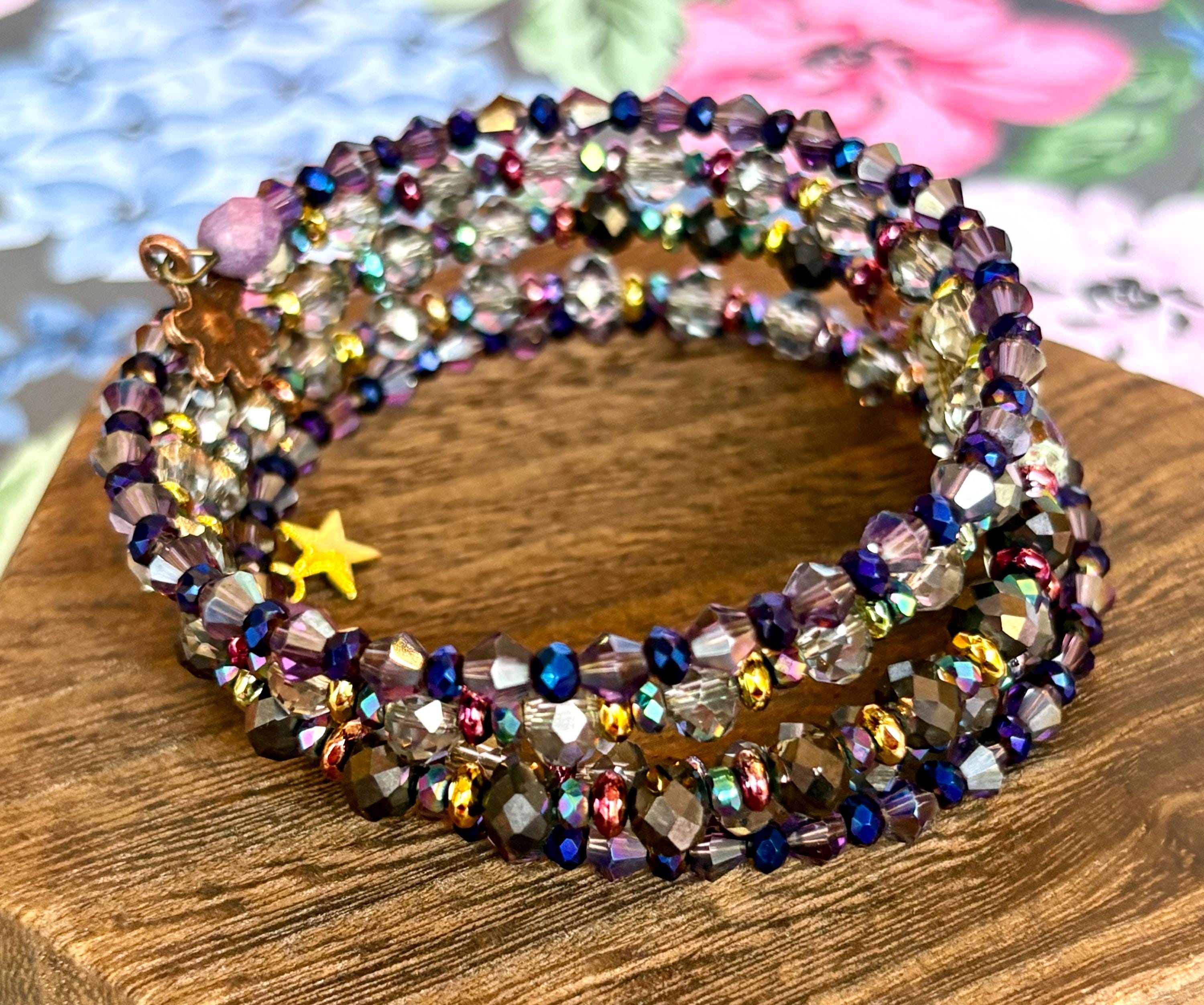 This wrap features an enchanting mix of Czech glass beads in hues of violet, metallic gray, blue, and aurora shimmer, paired with a delicate ivory flower bead with white wash as the centerpiece. Faceted Czech cathedral beads, purple melon beads, and luminous rainbow hematite add celestial sparkle, while the finishing touches — a gold star charm and an antique copper flower charm — bring warmth and harmony to the design.