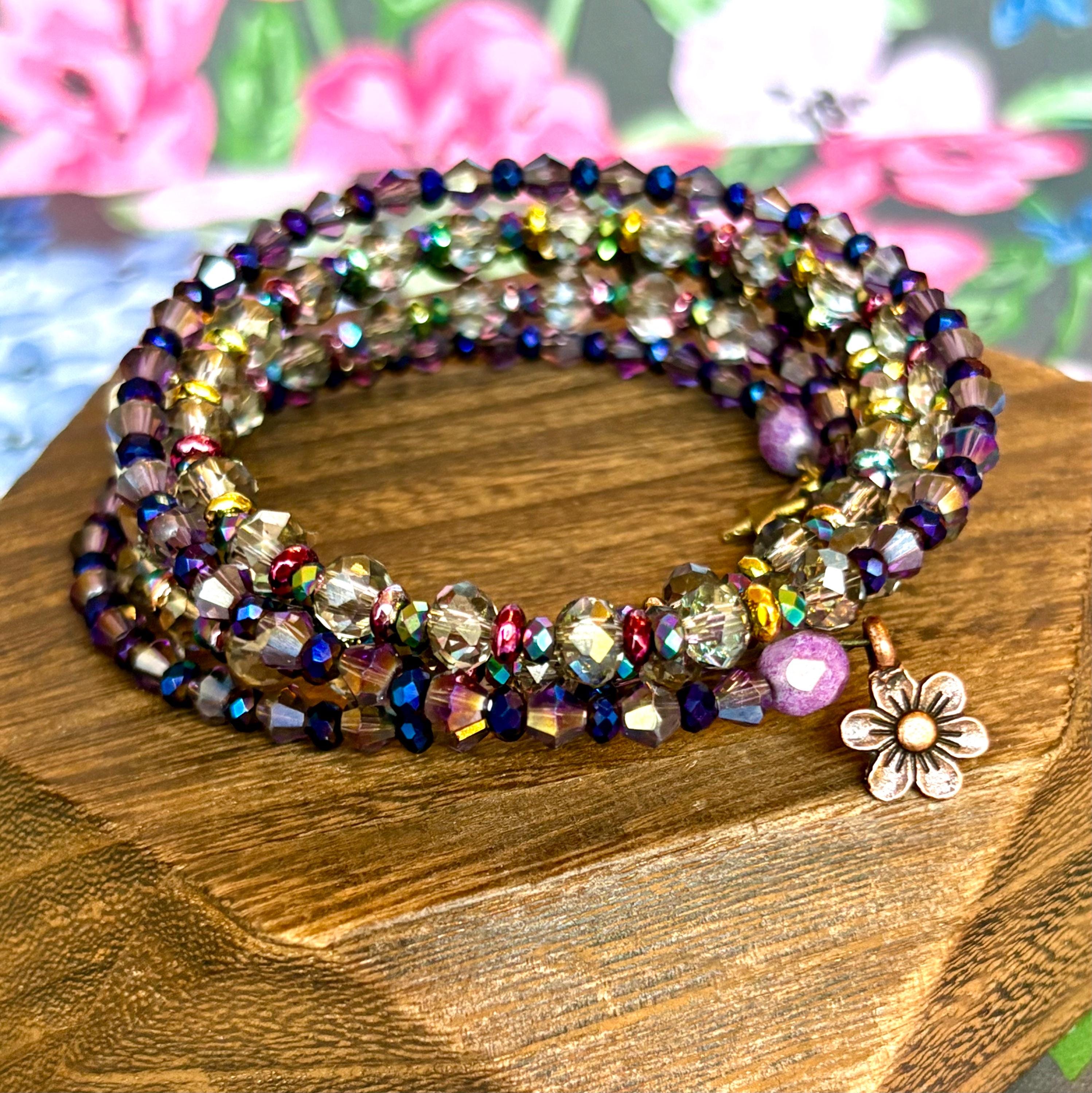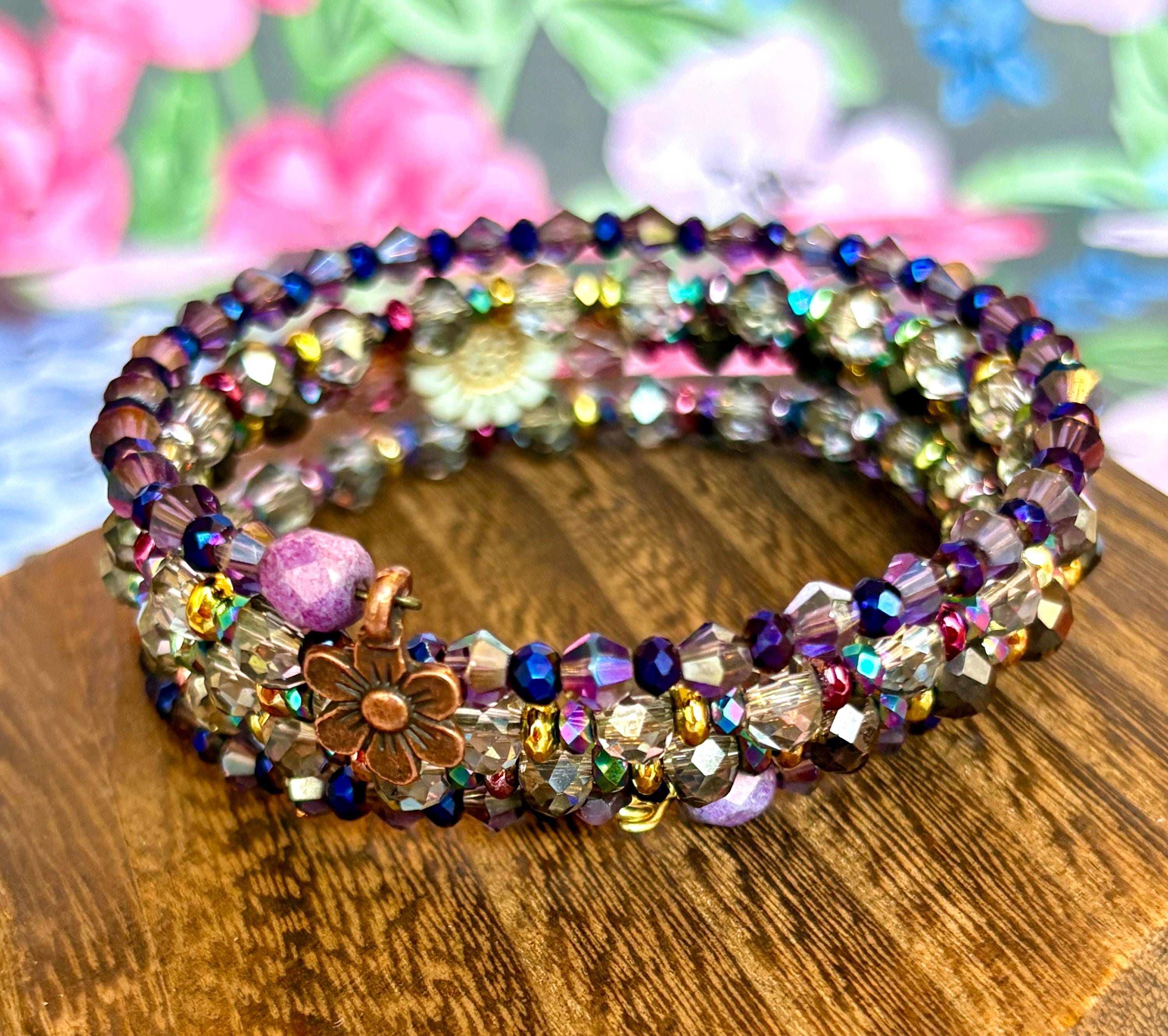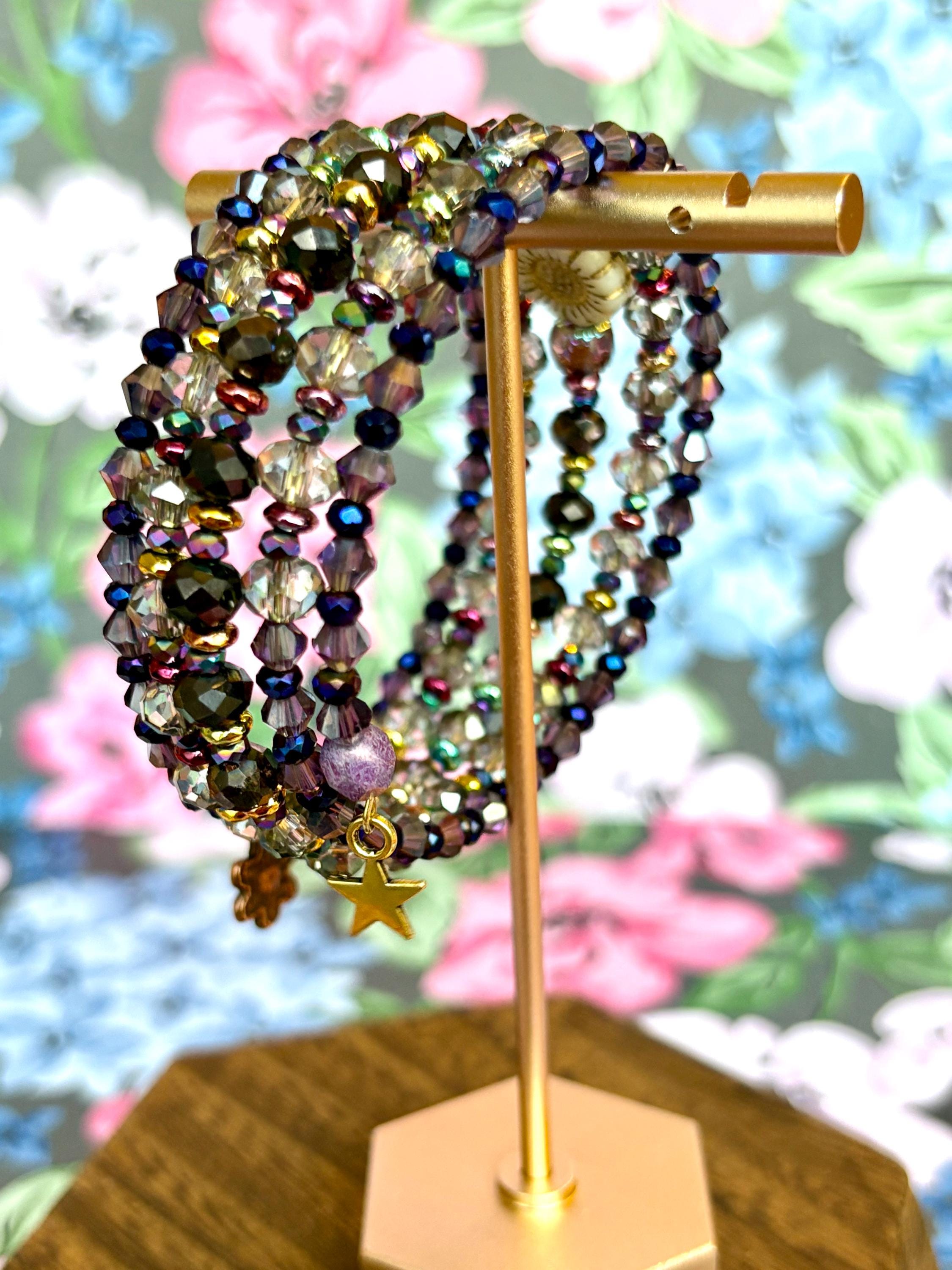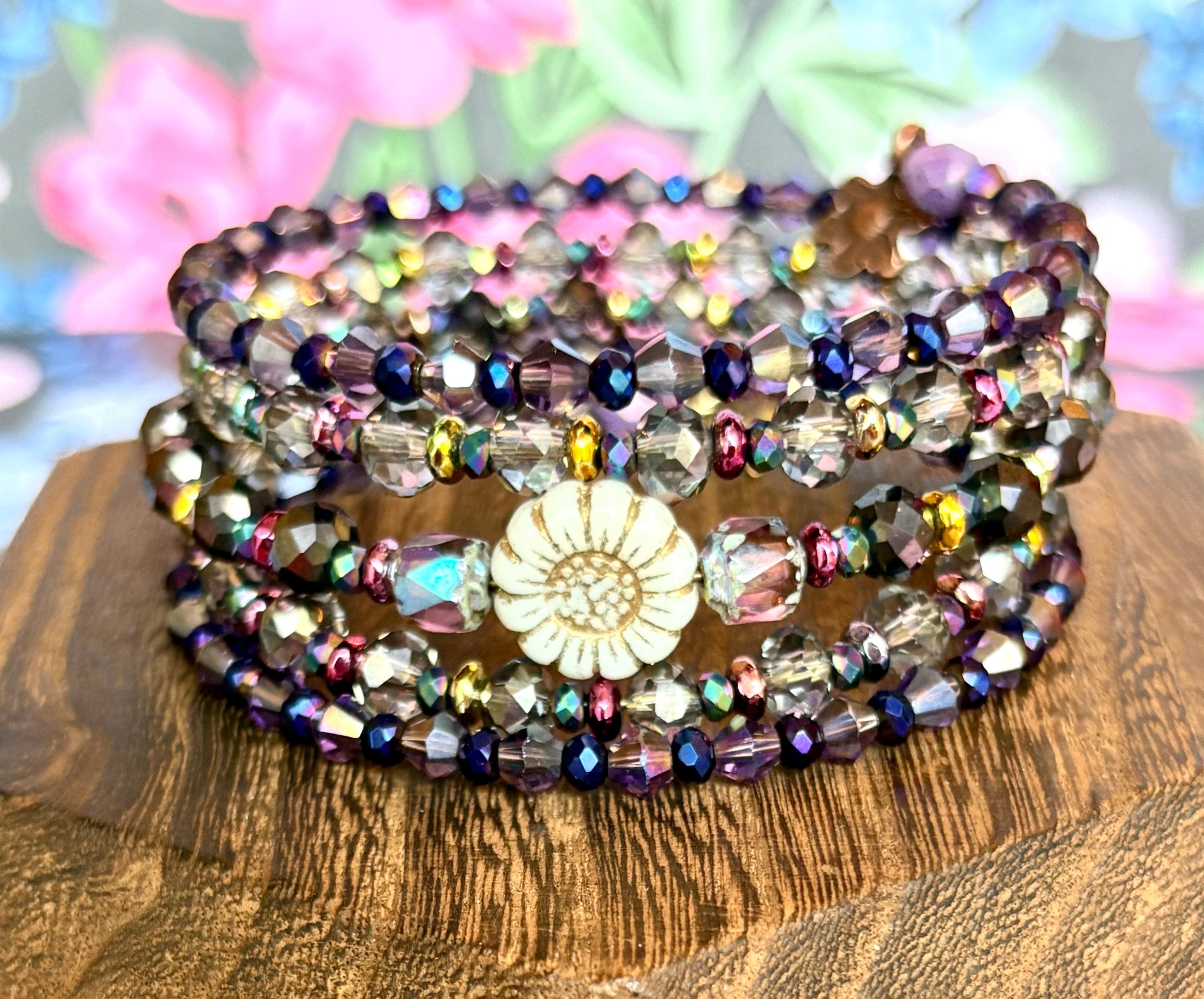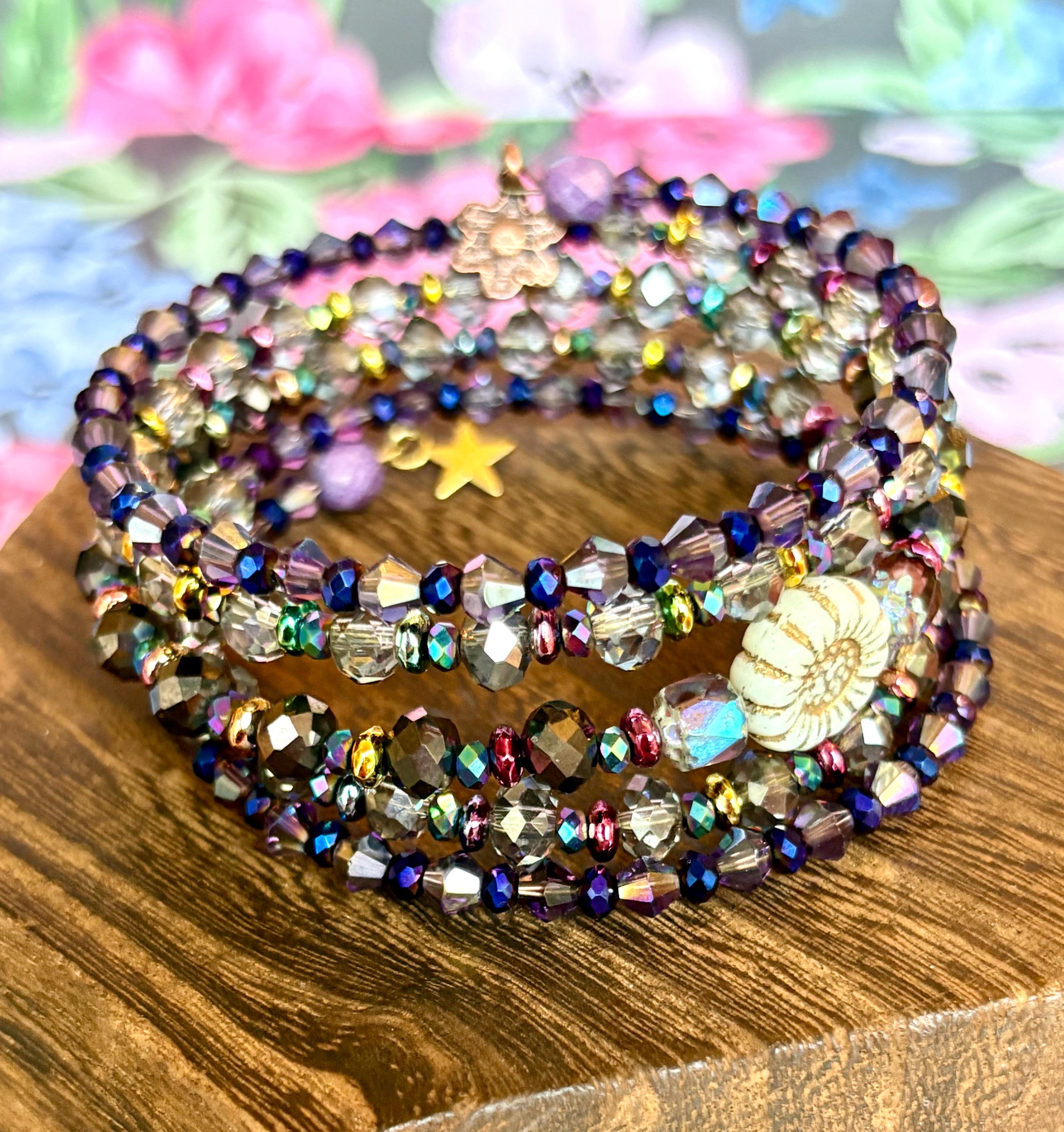 This wrap features an enchanting mix of Czech glass beads in hues of violet, metallic gray, blue, and aurora shimmer, paired with a delicate ivory flower bead with white wash as the centerpiece. Faceted Czech cathedral beads, purple melon beads, and luminous rainbow hematite add celestial sparkle, while the finishing touches — a gold star charm and an antique copper flower charm — bring warmth and harmony to the design.