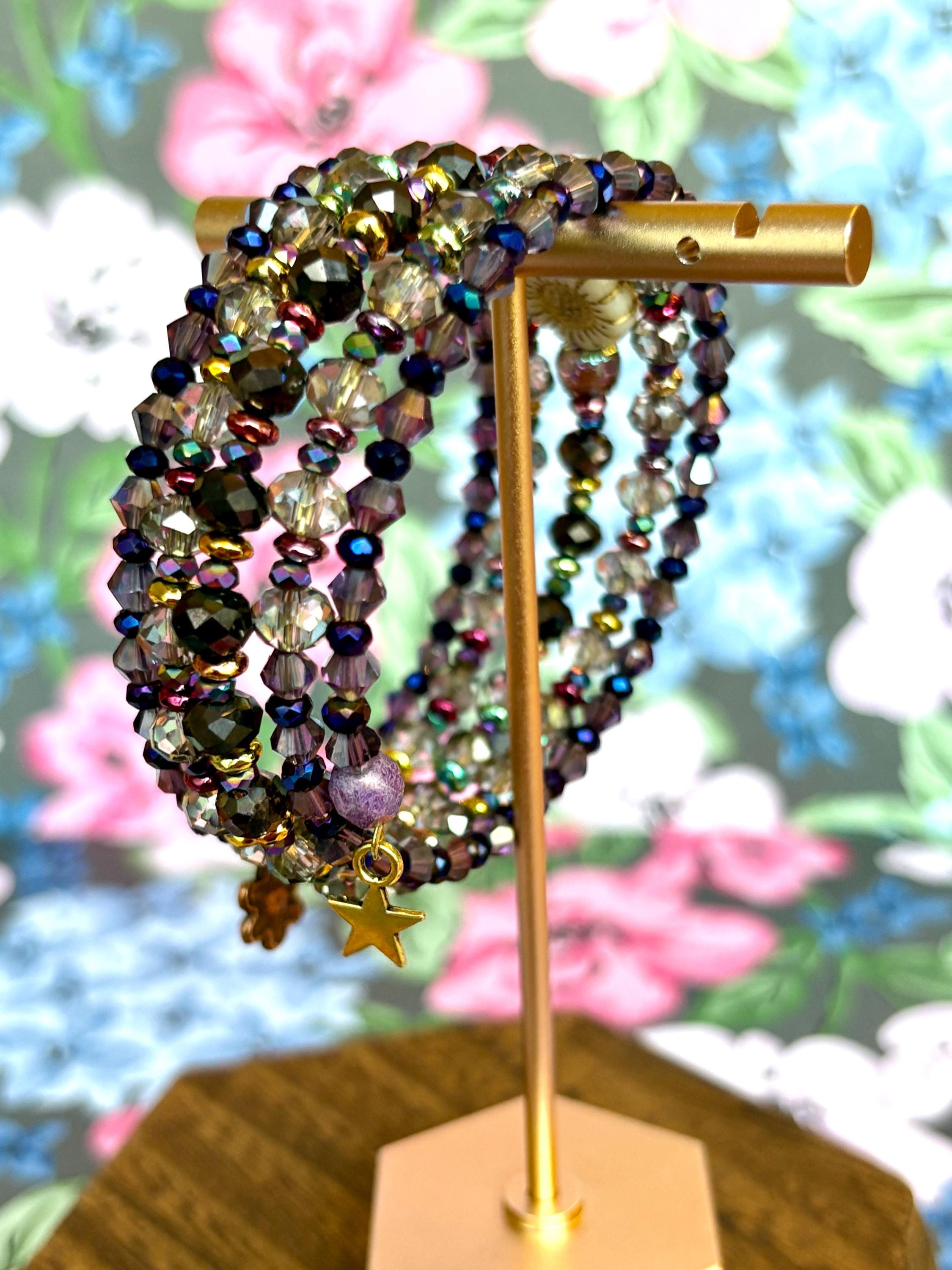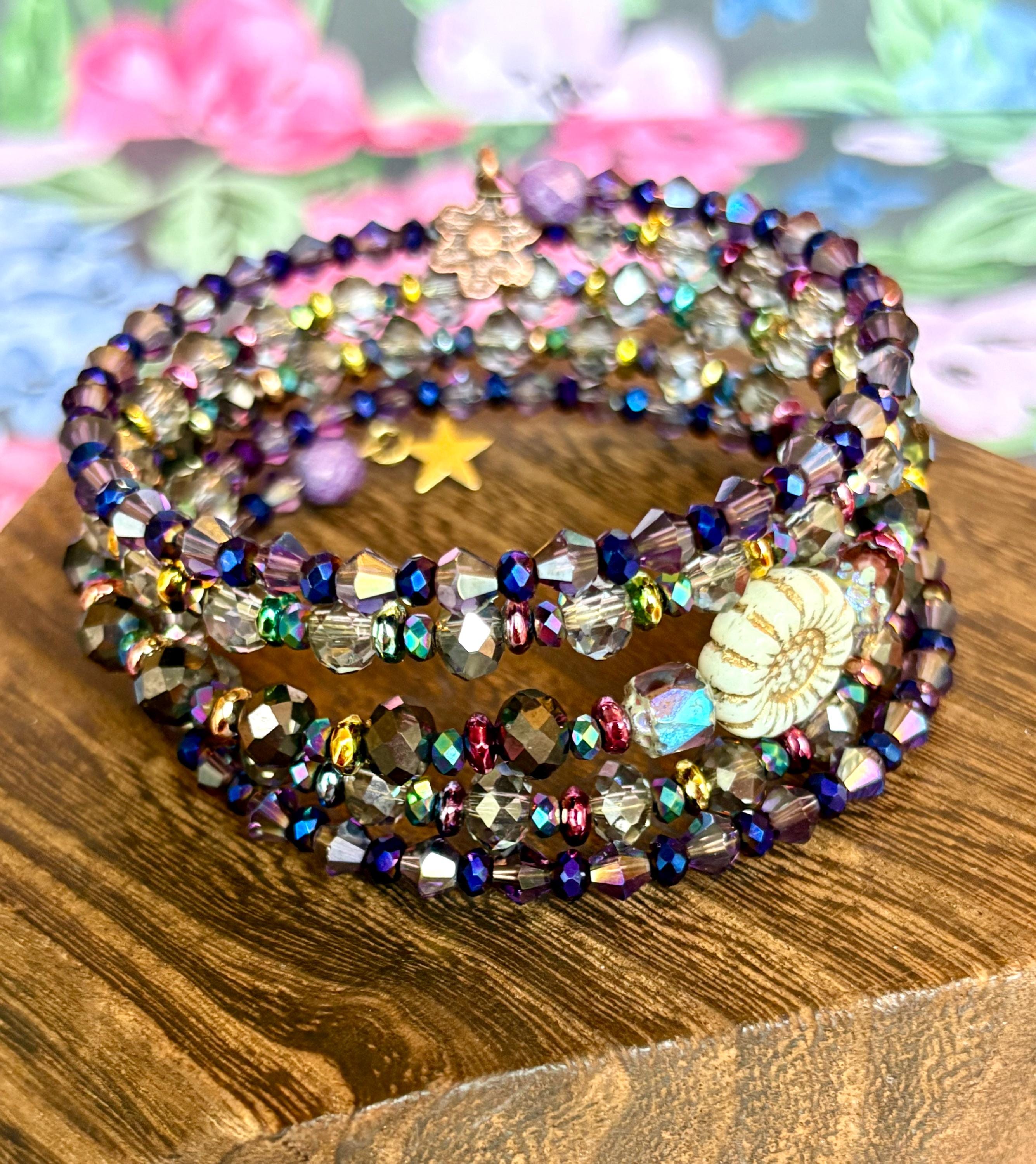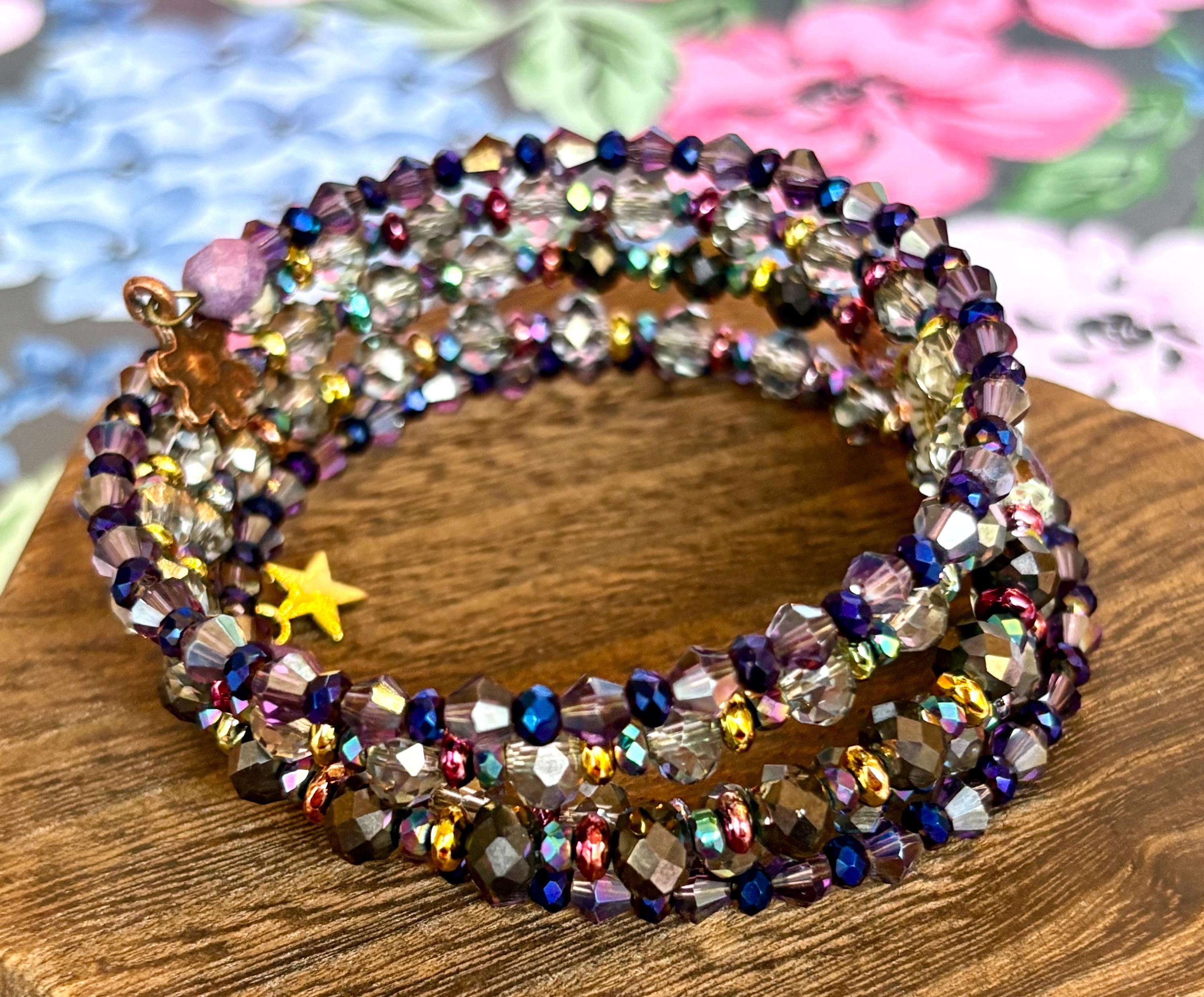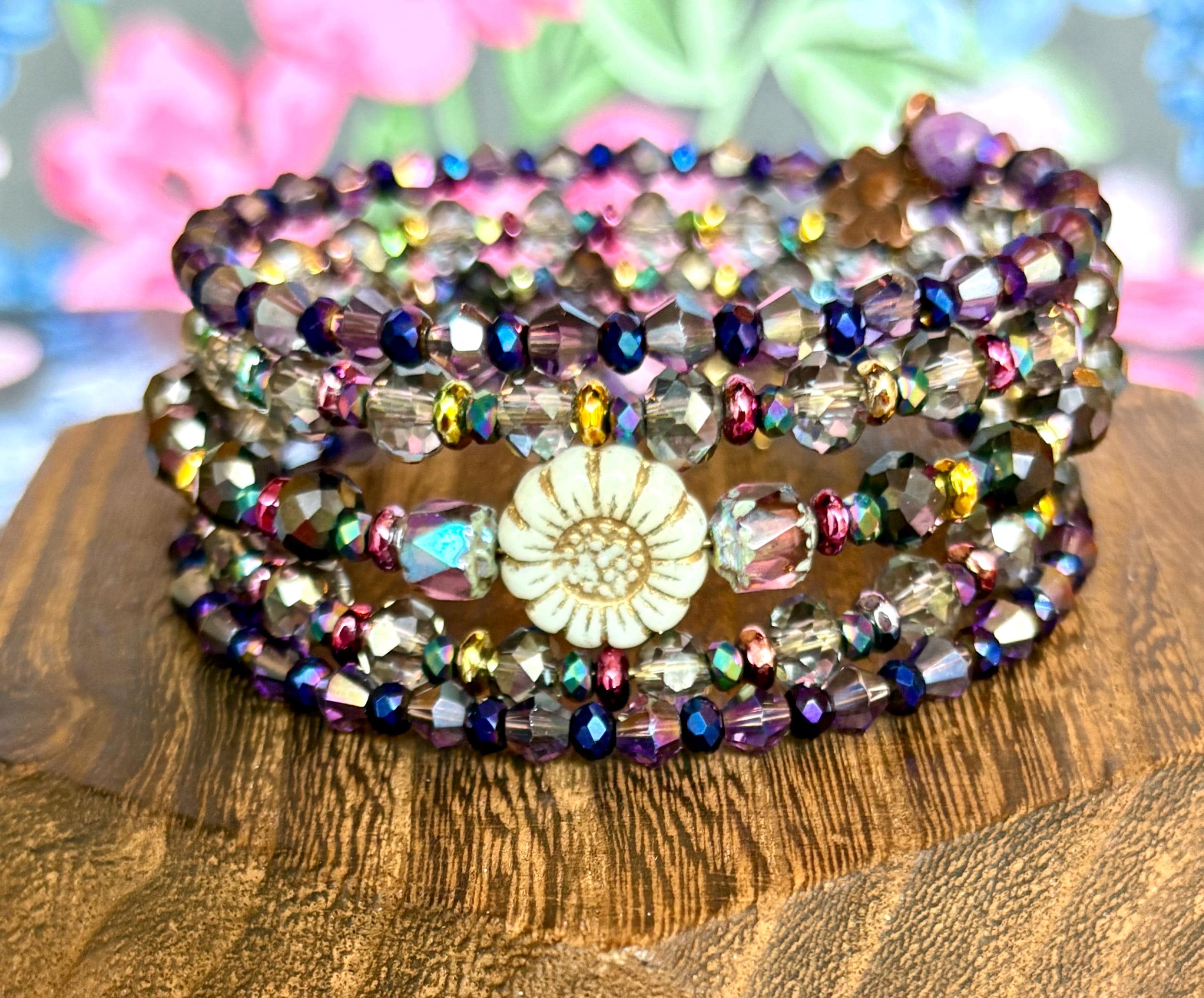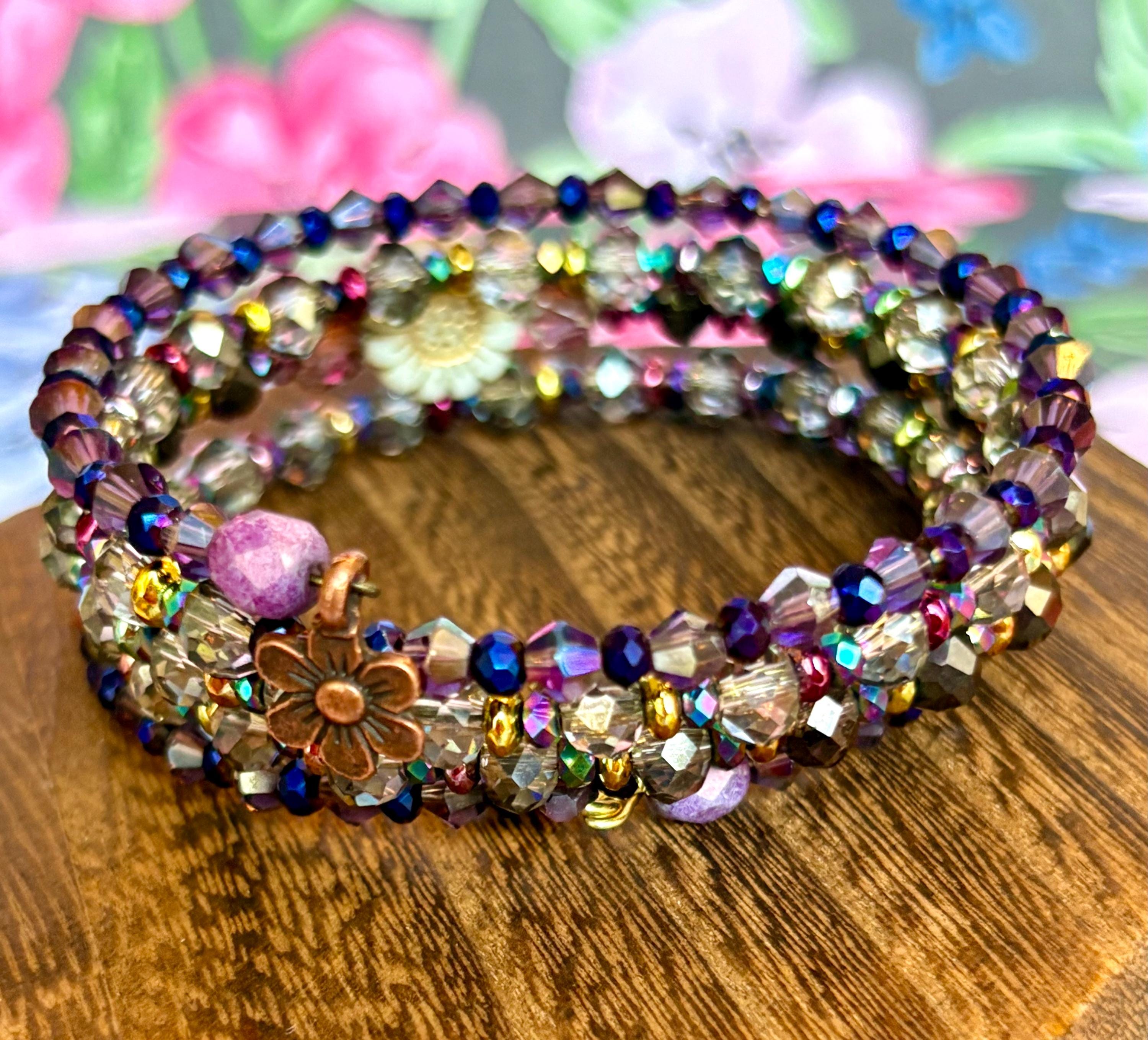 This wrap features an enchanting mix of Czech glass beads in hues of violet, metallic gray, blue, and aurora shimmer, paired with a delicate ivory flower bead with white wash as the centerpiece. Faceted Czech cathedral beads, purple melon beads, and luminous rainbow hematite add celestial sparkle, while the finishing touches — a gold star charm and an antique copper flower charm — bring warmth and harmony to the design.