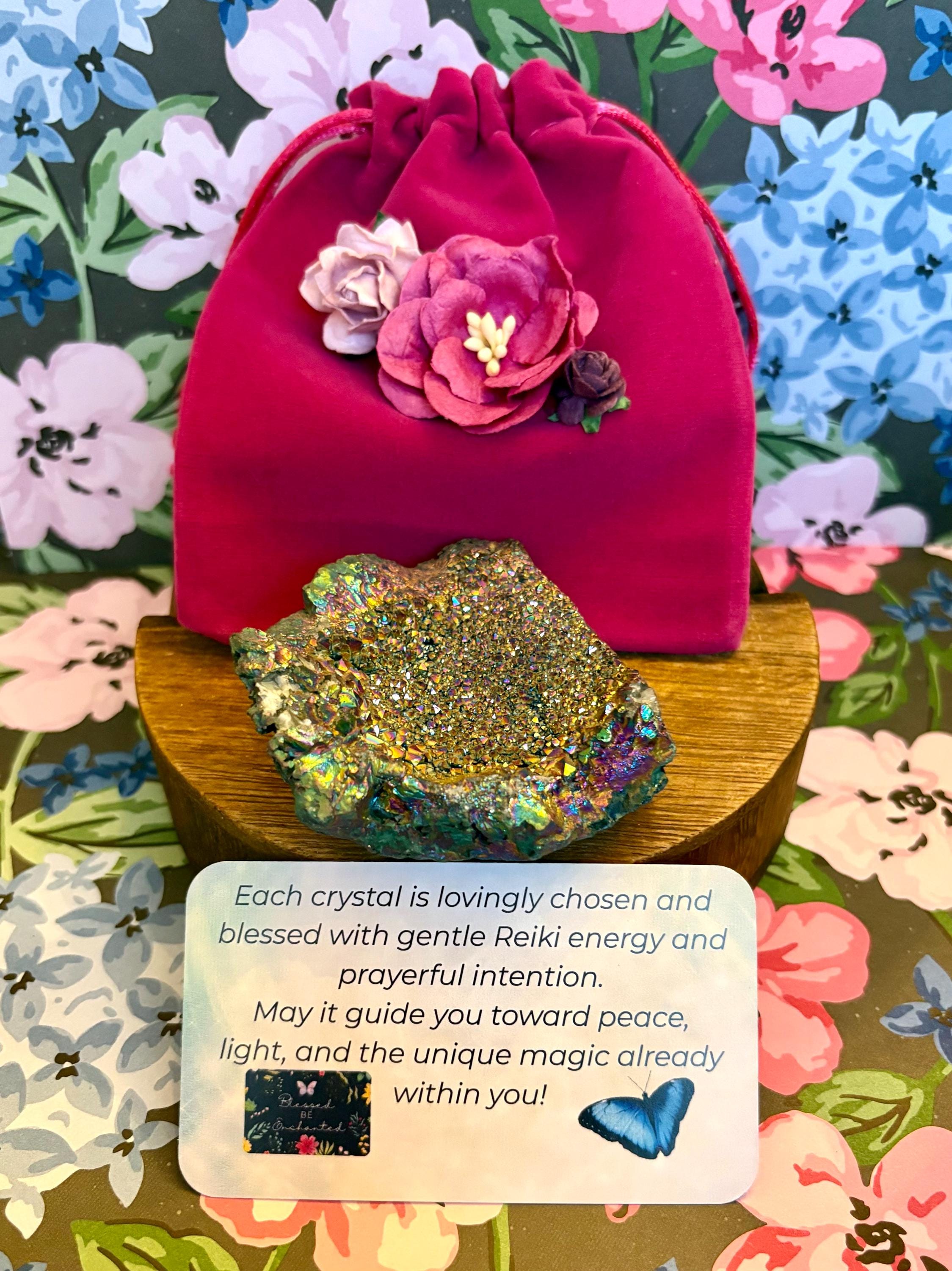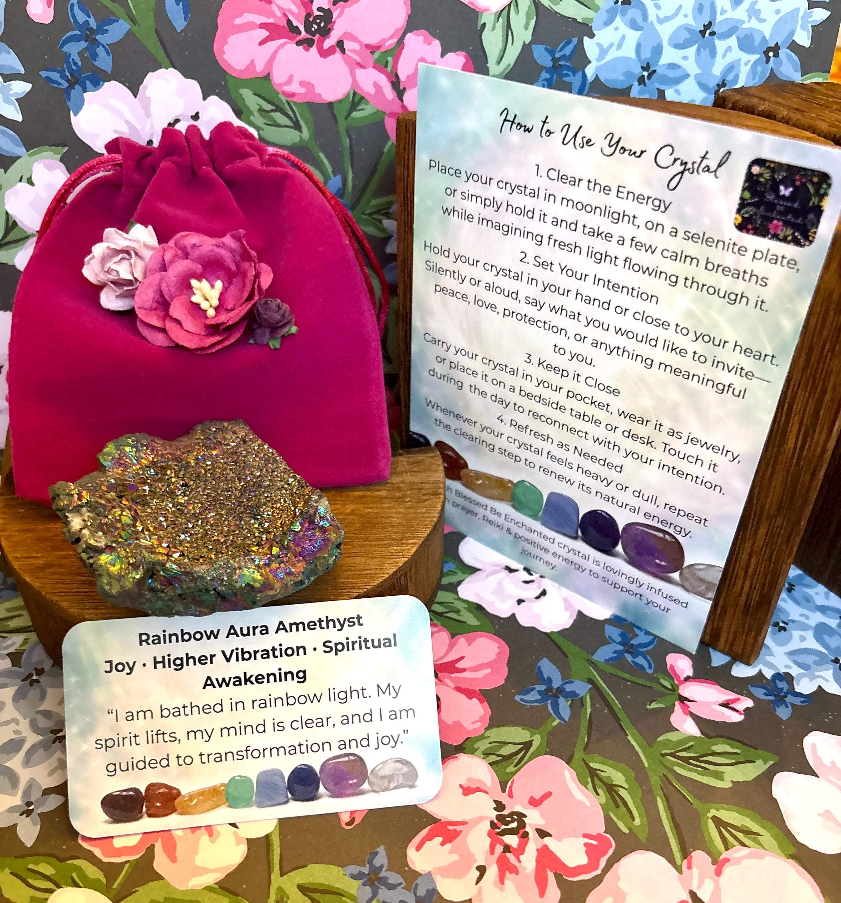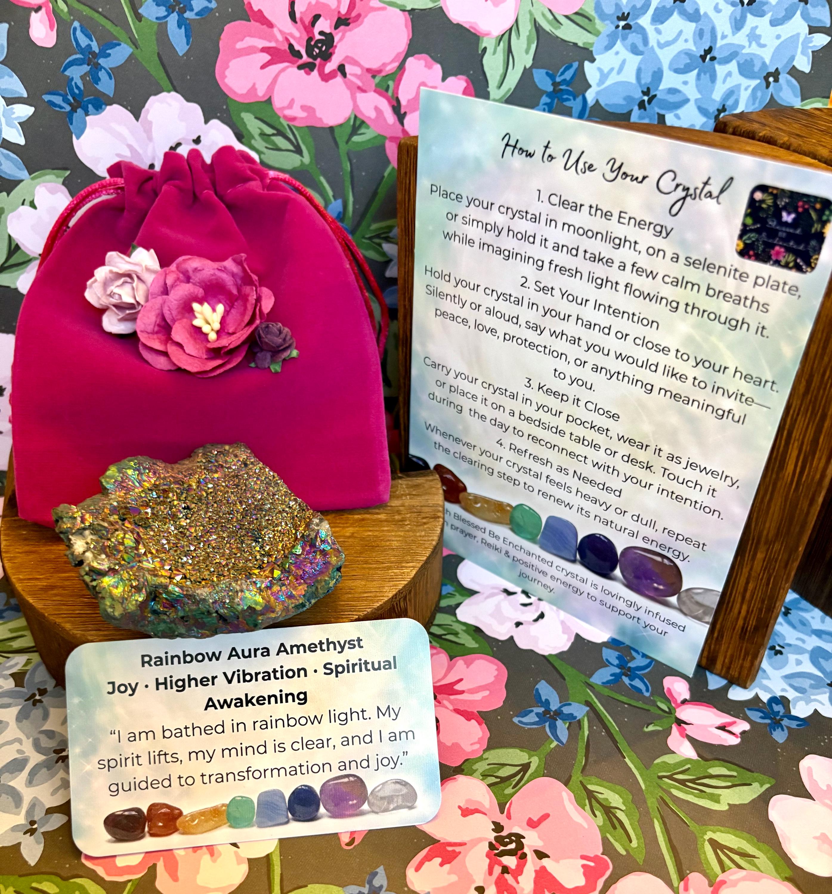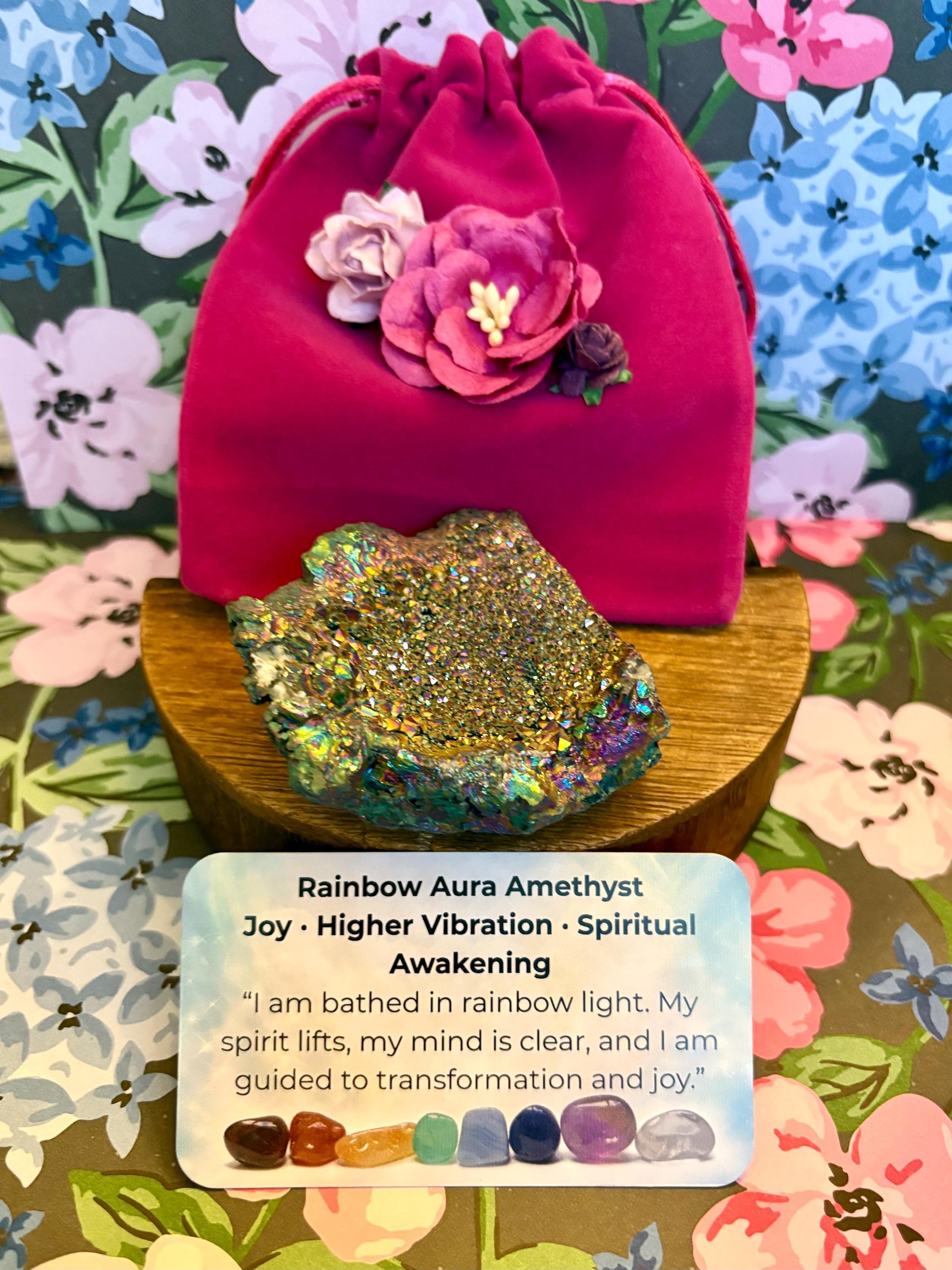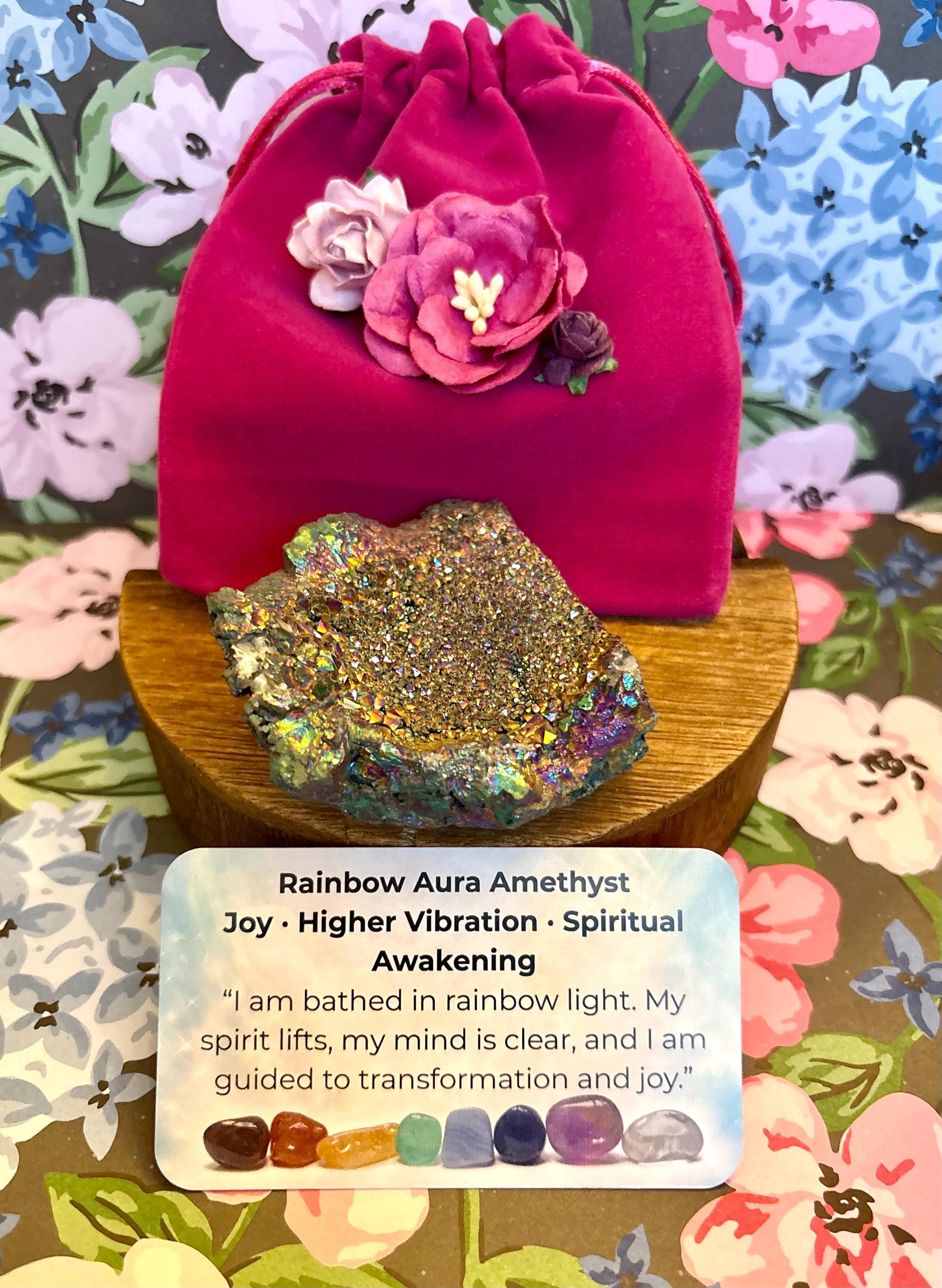 Rainbow Aura Amethyst Cluster Angel Crystal Bag | Reiki Blessed Gemstone Gift | Velvet Flower Pouch with Blessing & How to Use Card | Crystal Healing Gift