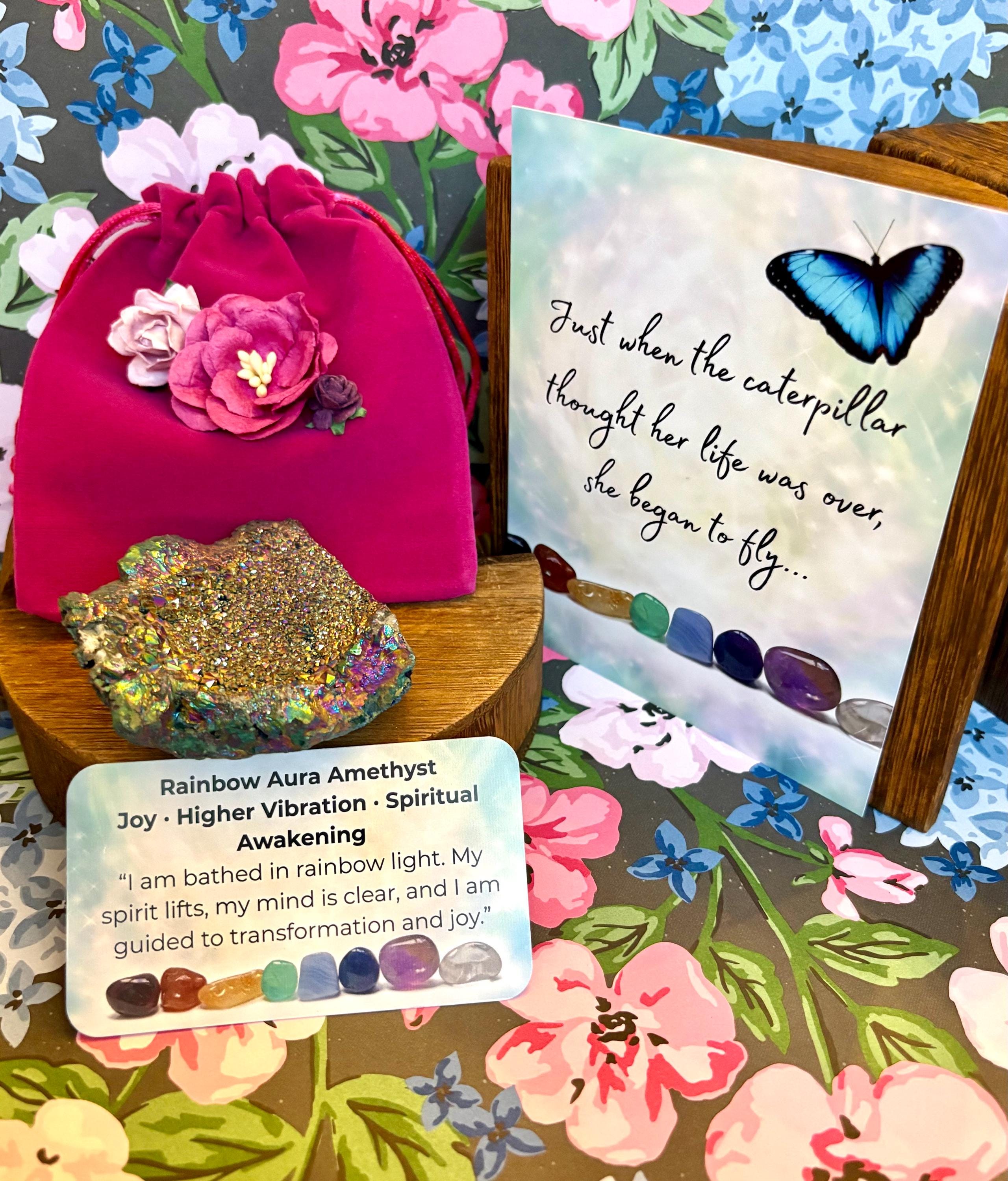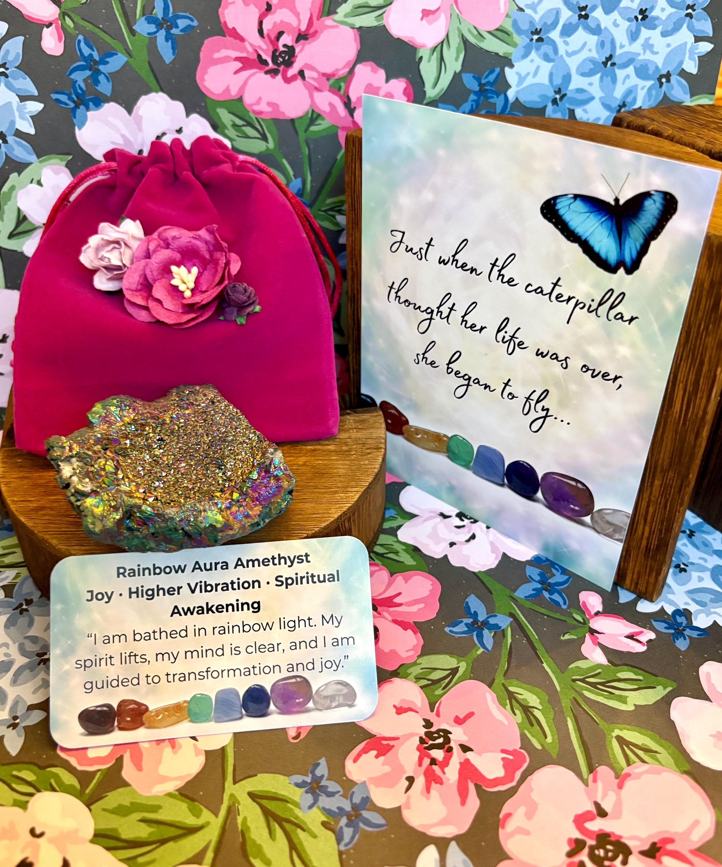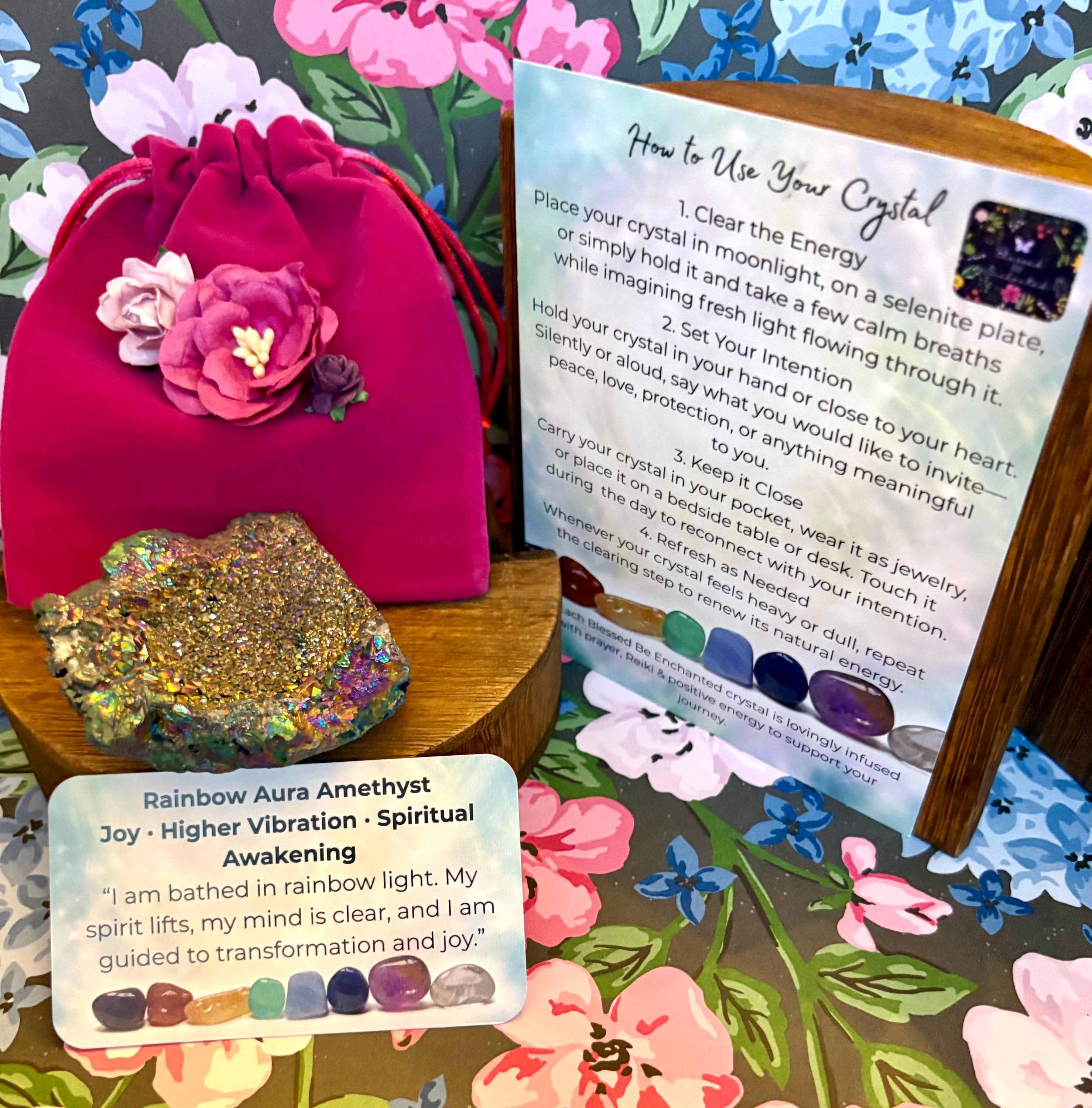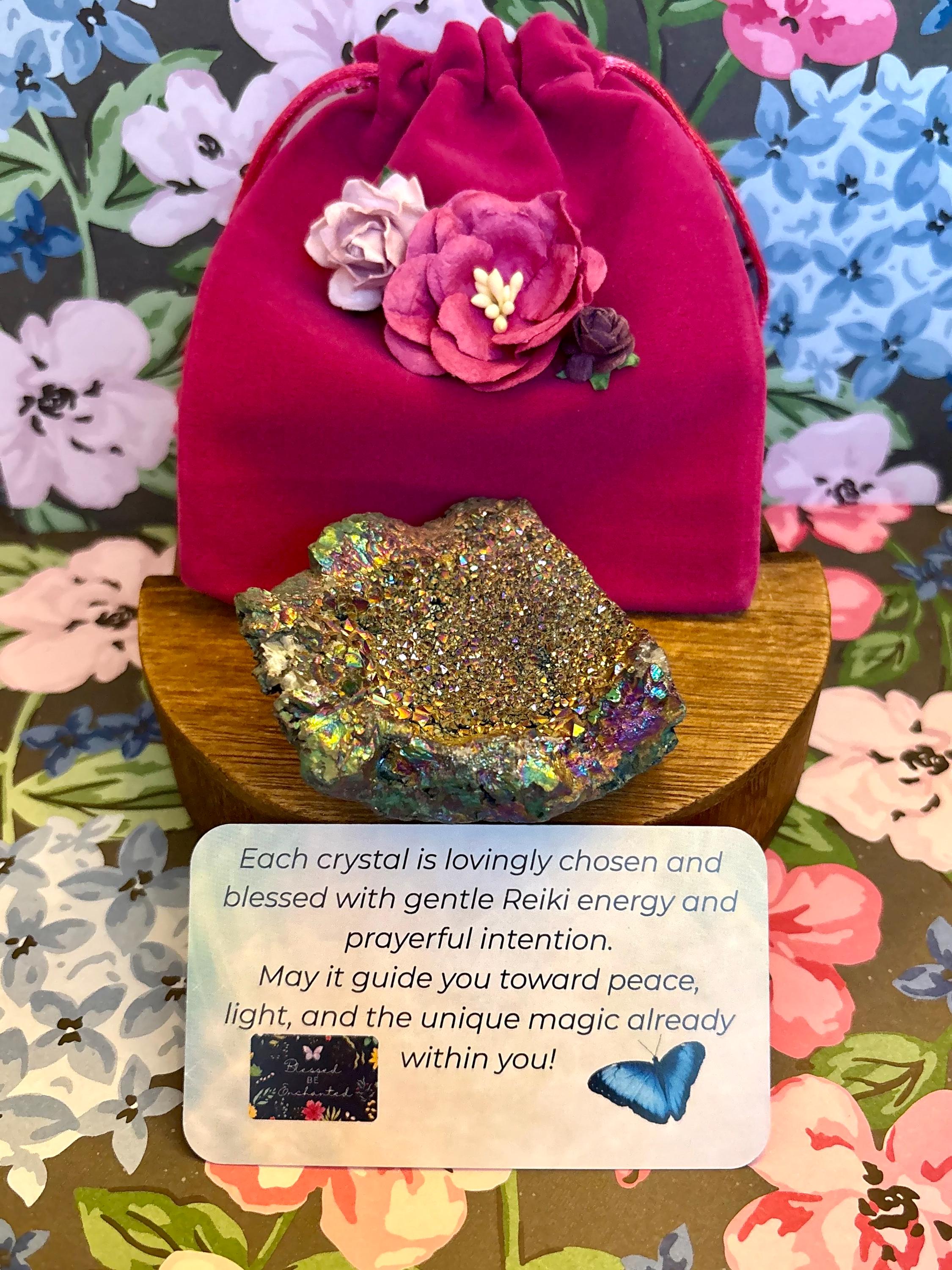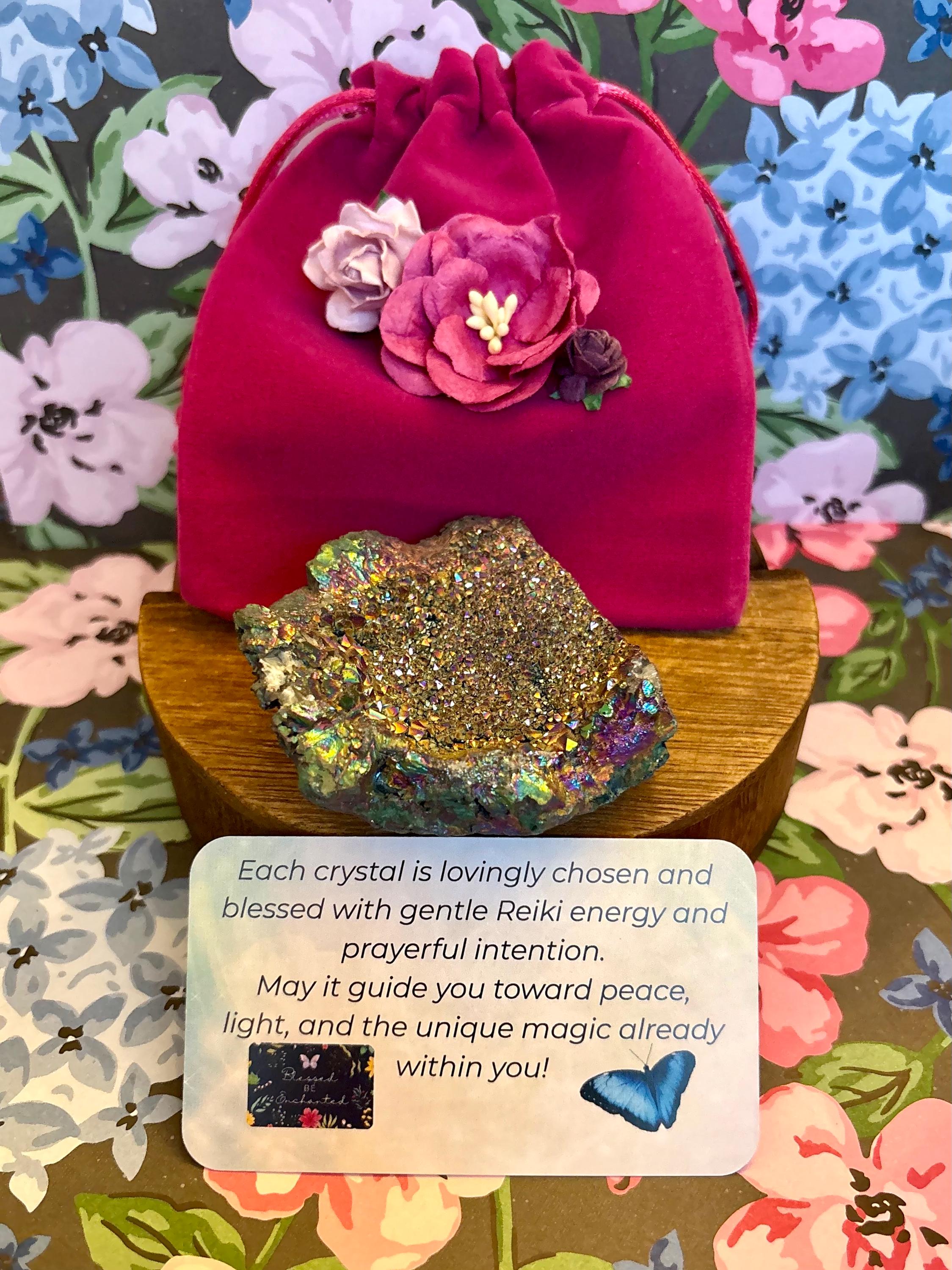 Rainbow Aura Amethyst Cluster Angel Crystal Bag | Reiki Blessed Gemstone Gift | Velvet Flower Pouch with Blessing & How to Use Card | Crystal Healing Gift