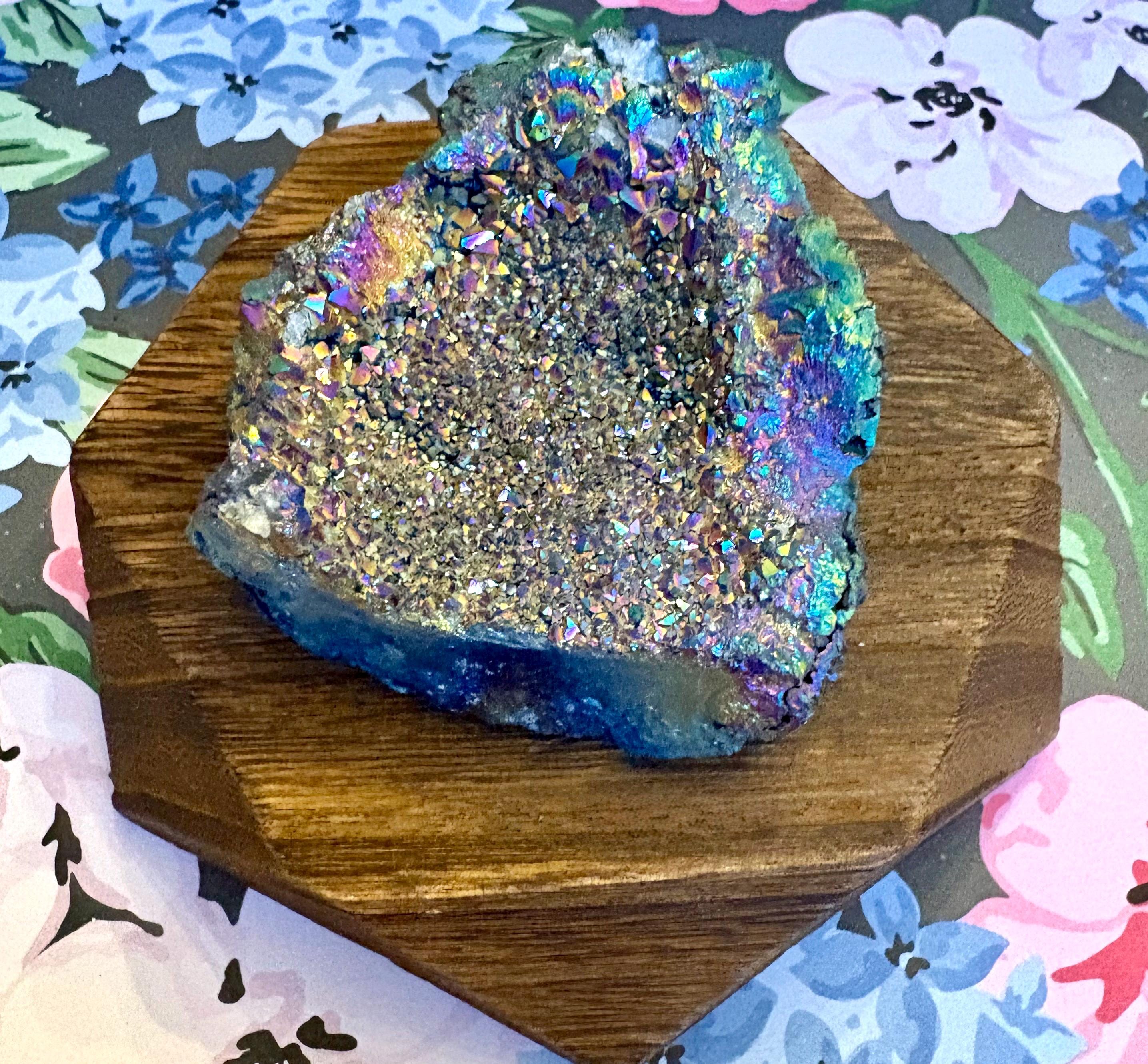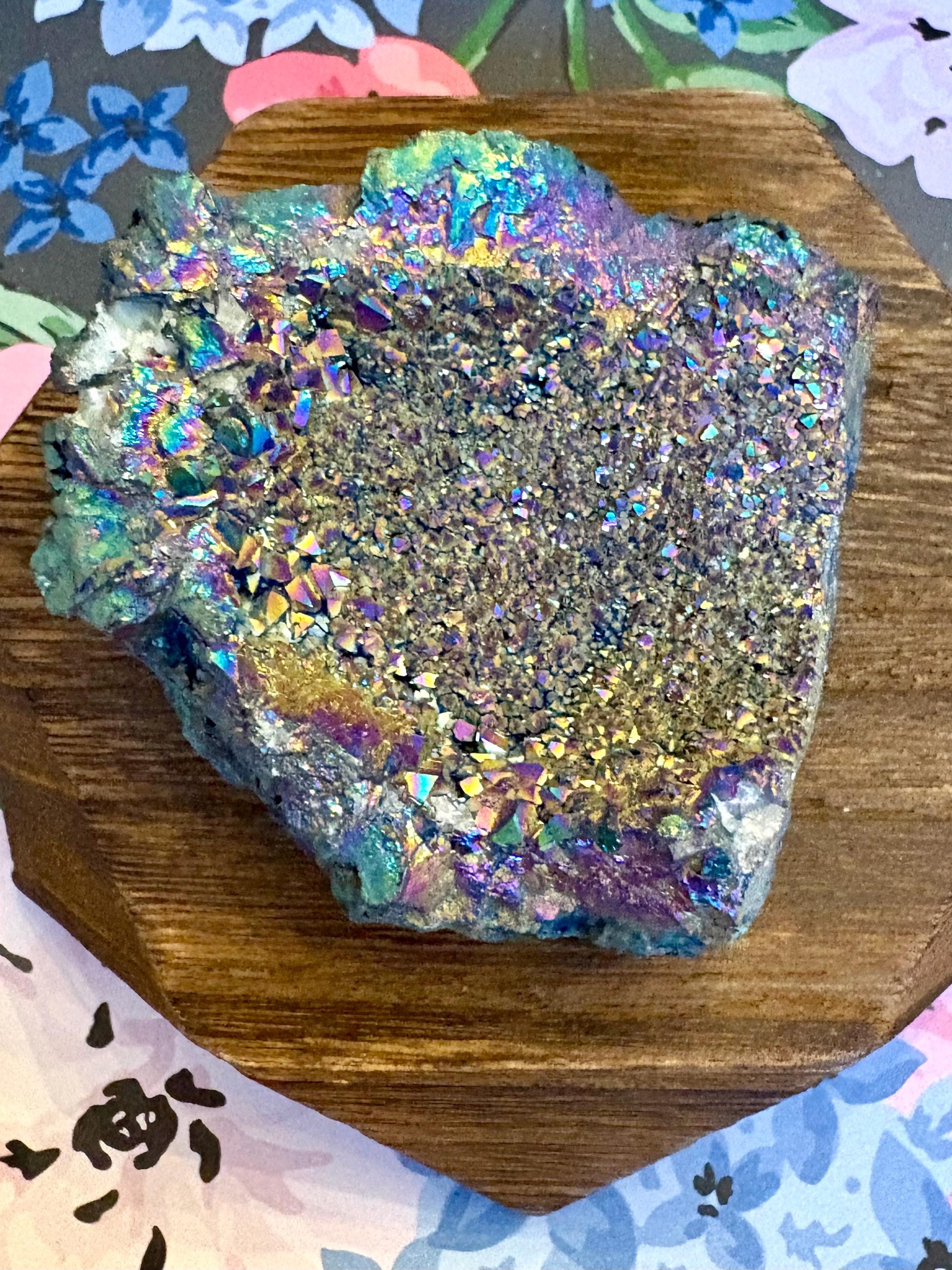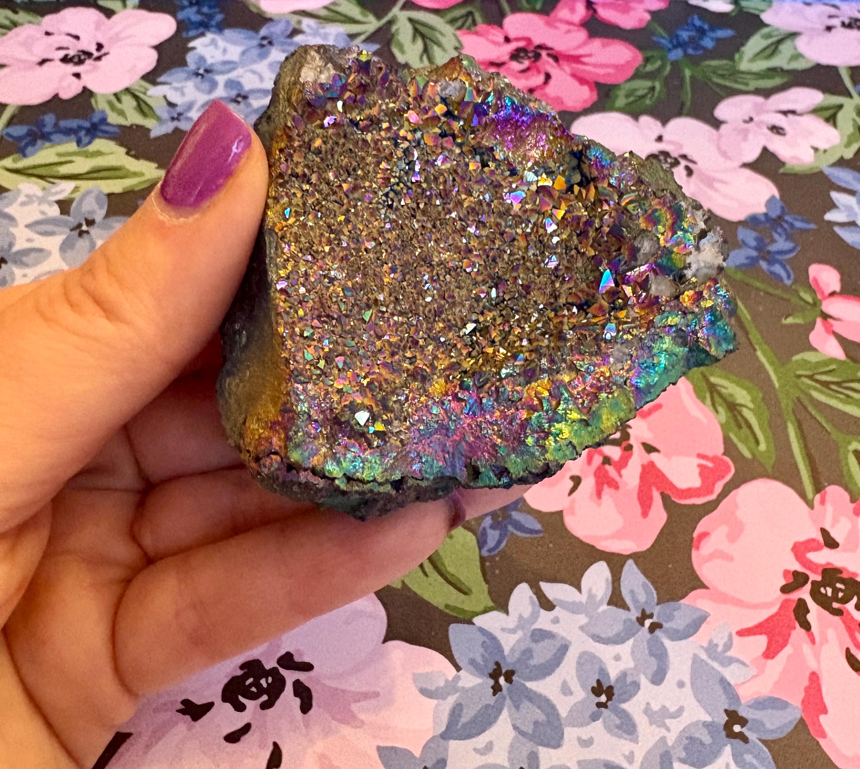 Rainbow Aura Amethyst begins as genuine amethyst that has been alchemically bonded with precious metals like titanium and gold, creating its mesmerizing rainbow sheen.