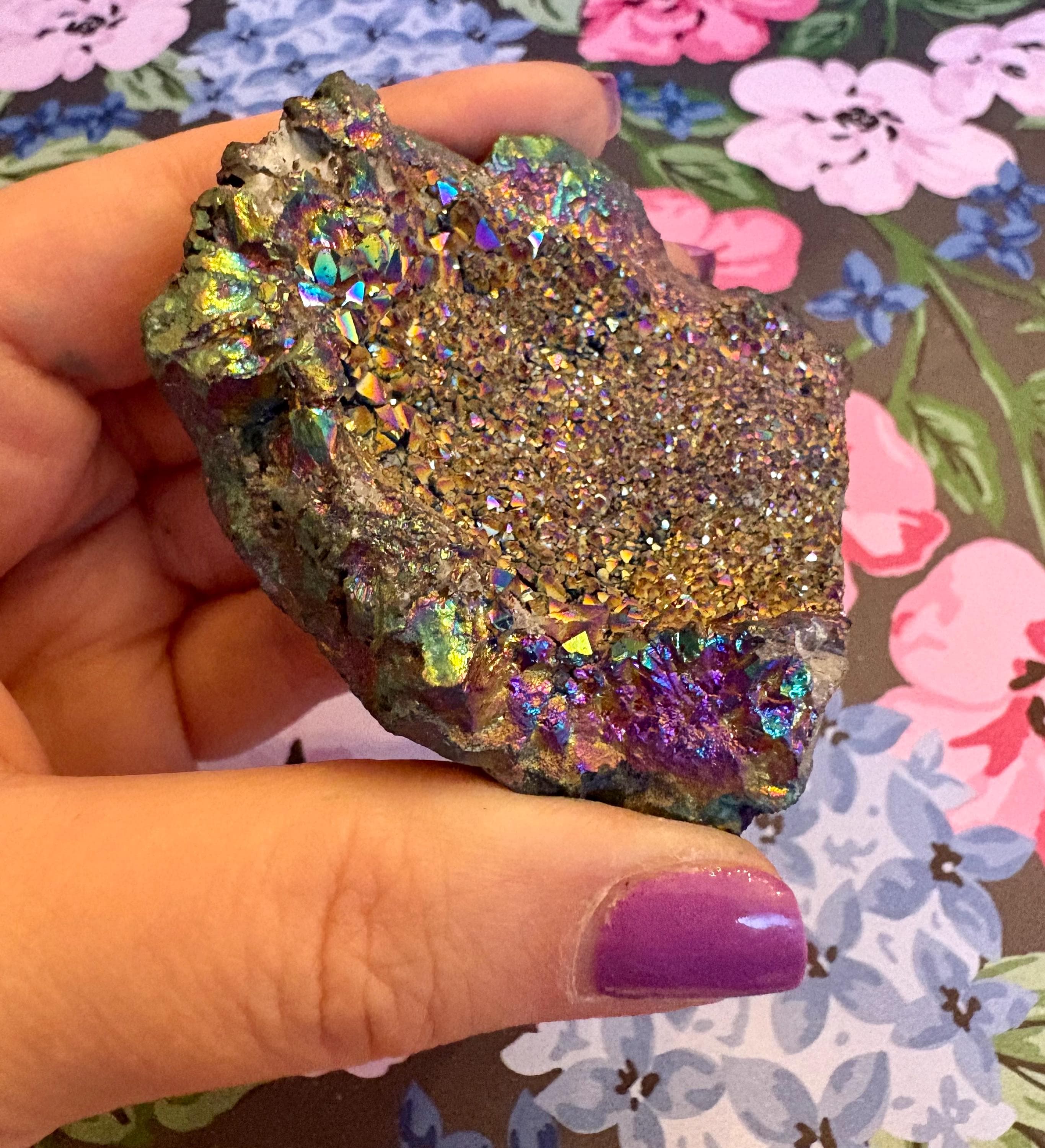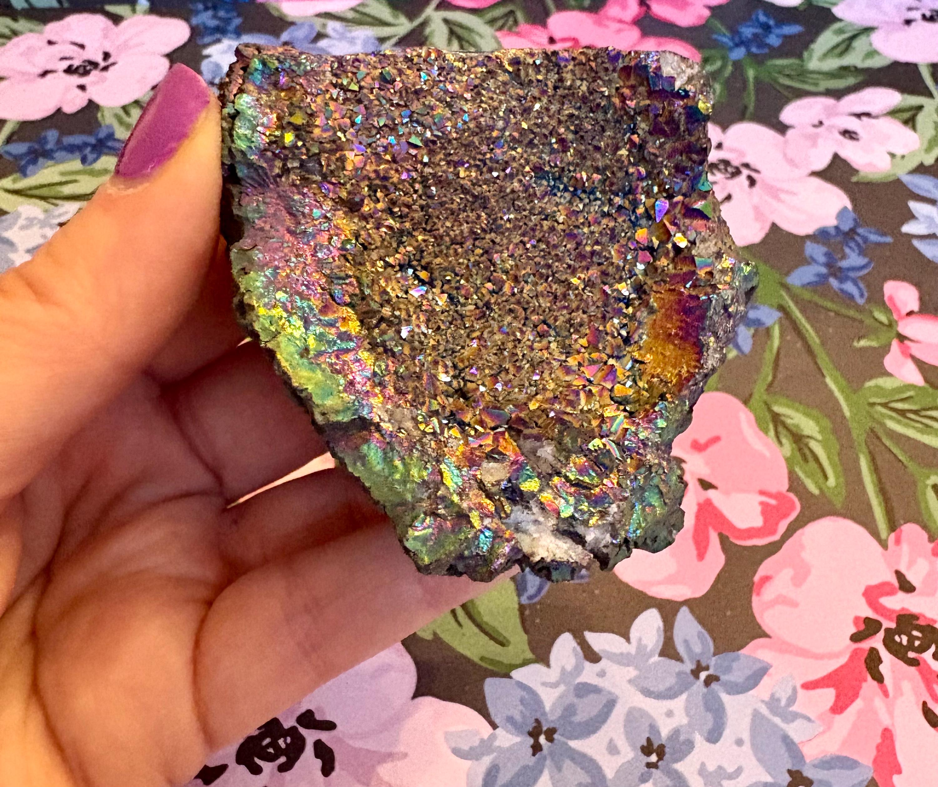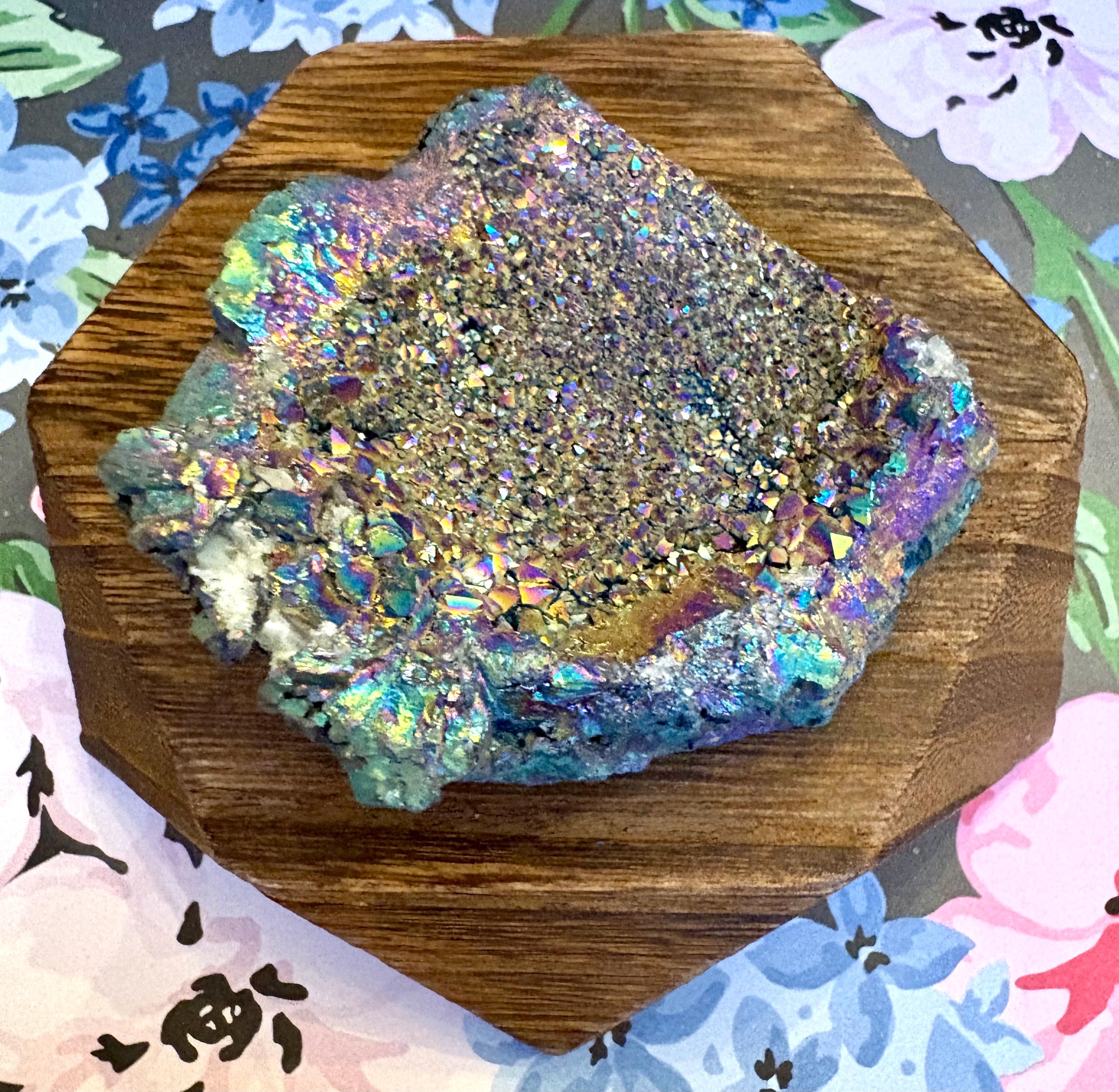 Rainbow Aura Amethyst begins as genuine amethyst that has been alchemically bonded with precious metals like titanium and gold, creating its mesmerizing rainbow sheen.