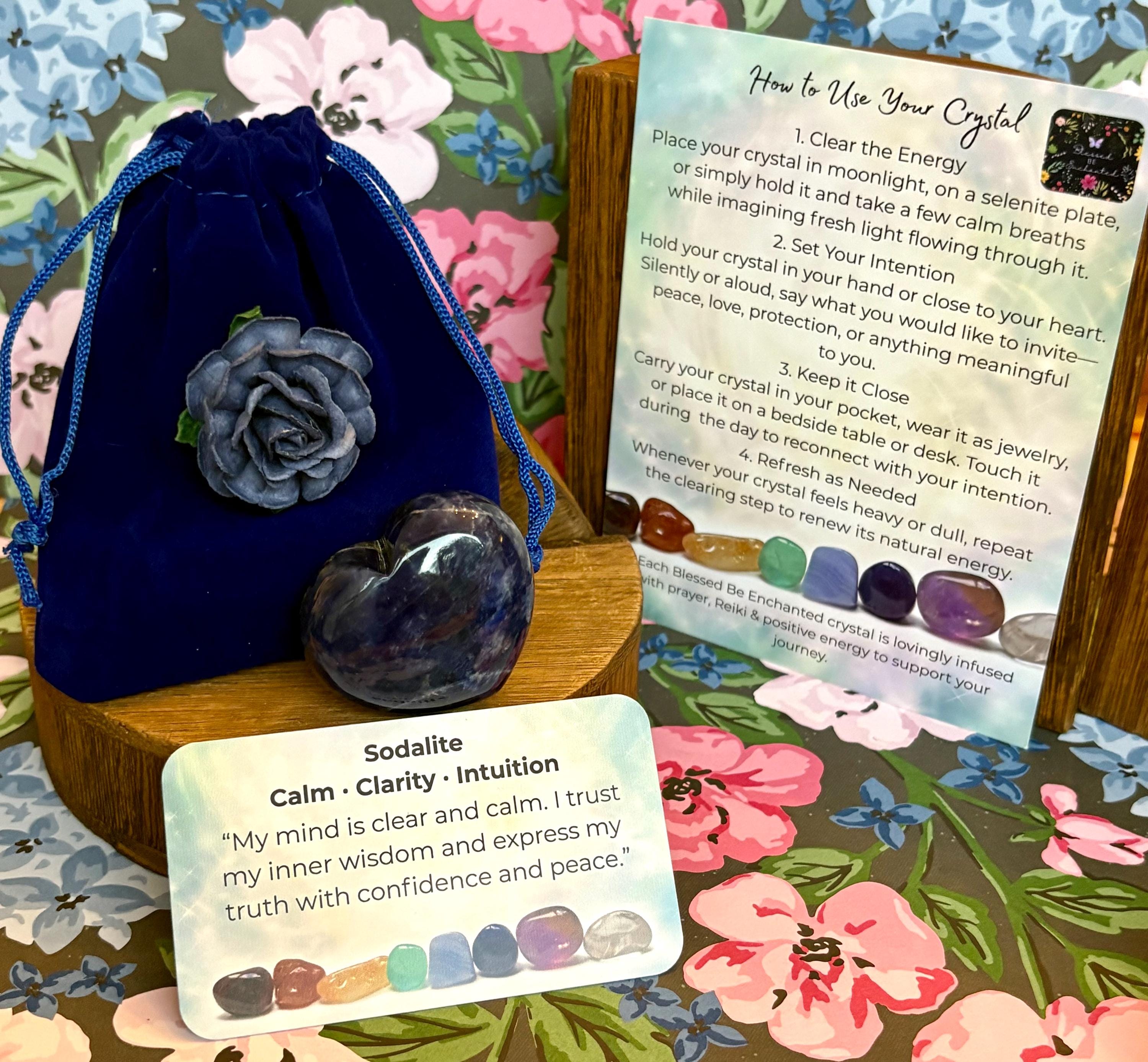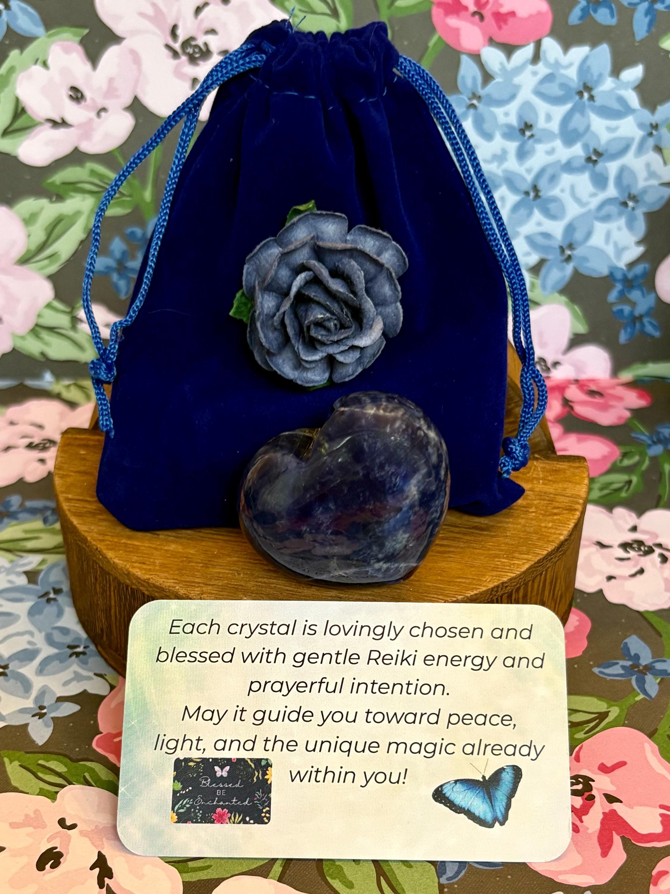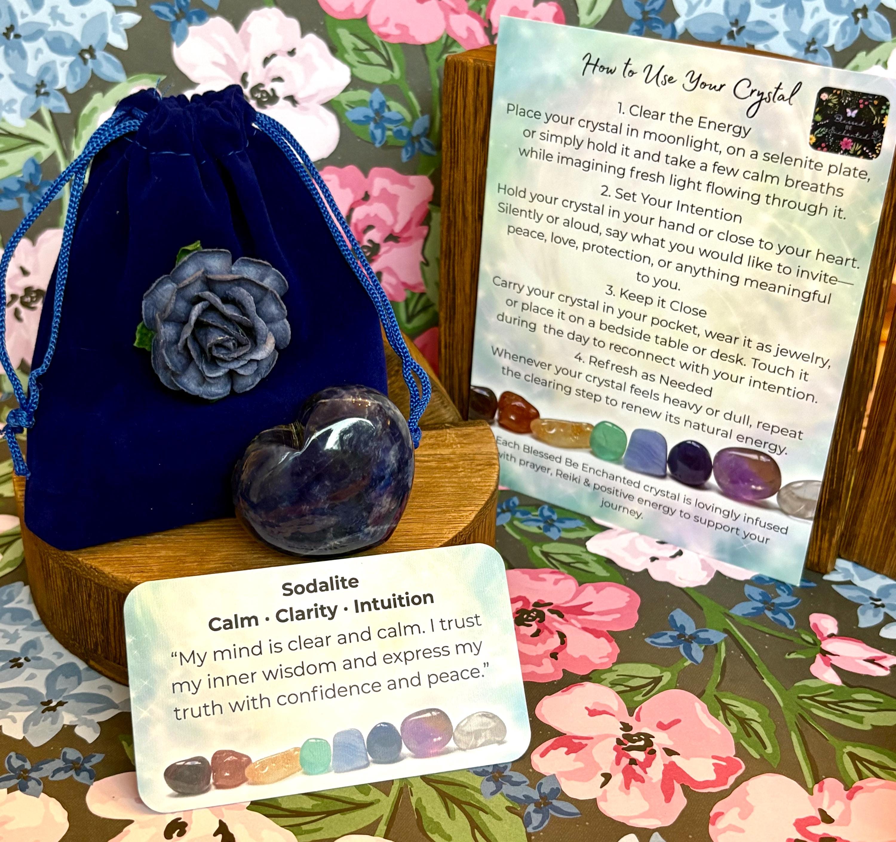Sodalite Angel Crystal Bag | Reiki Blessed Gemstone Gift | Velvet Flower Pouch with Blessing & How to Use Card | Crystal Healing Gift, Peace, Intuition & Truth