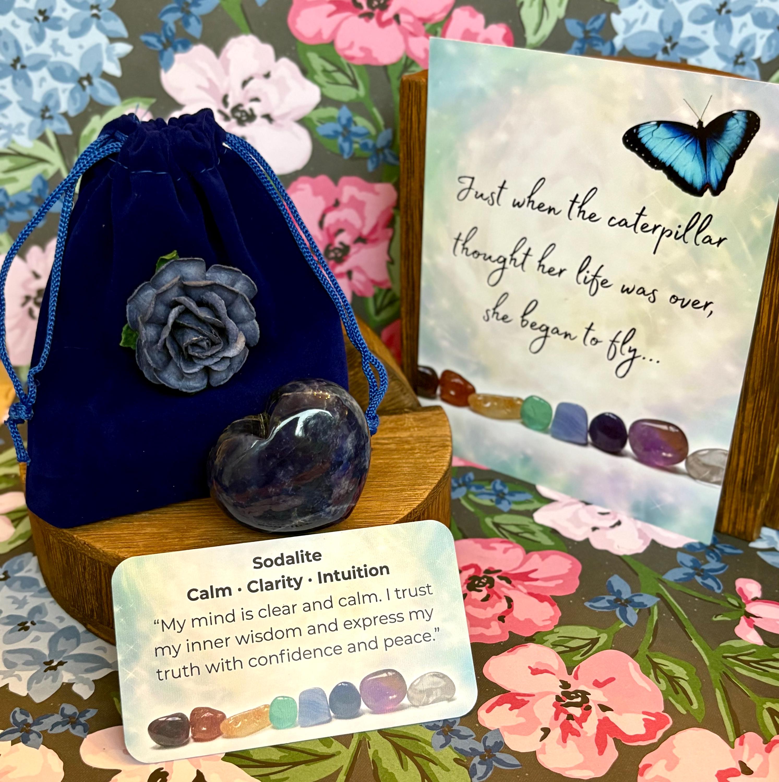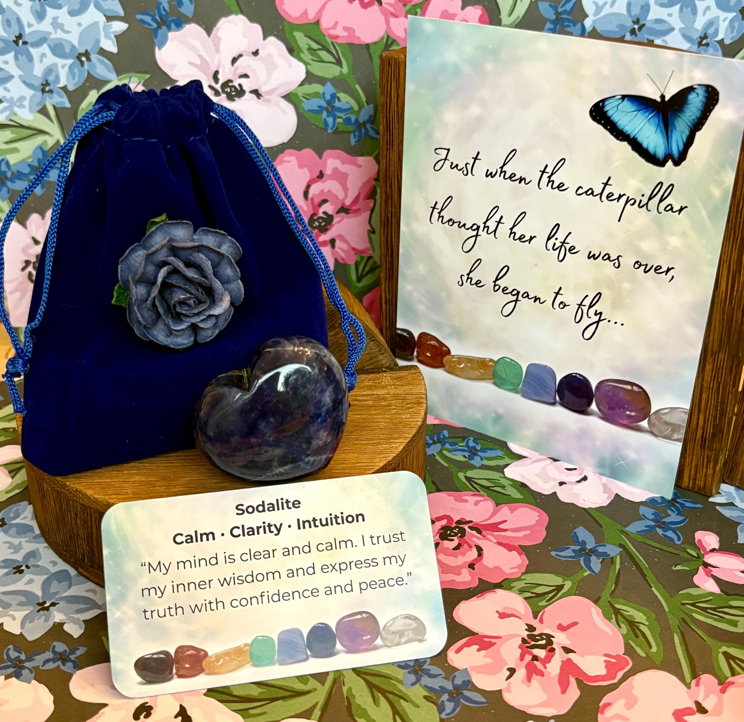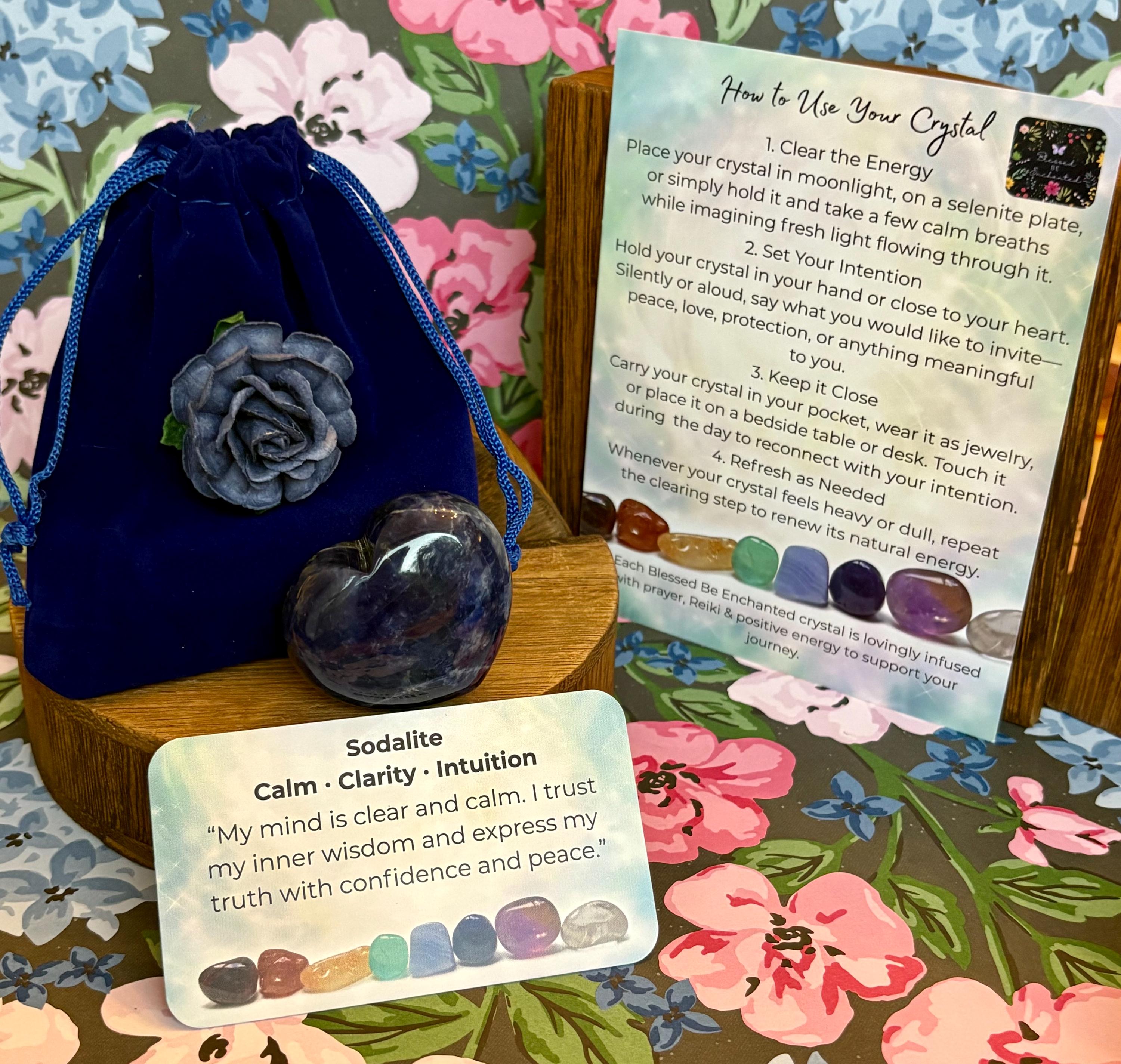 Sodalite Angel Crystal Bag | Reiki Blessed Gemstone Gift | Velvet Flower Pouch with Blessing & How to Use Card | Crystal Healing Gift, Peace, Intuition & Truth