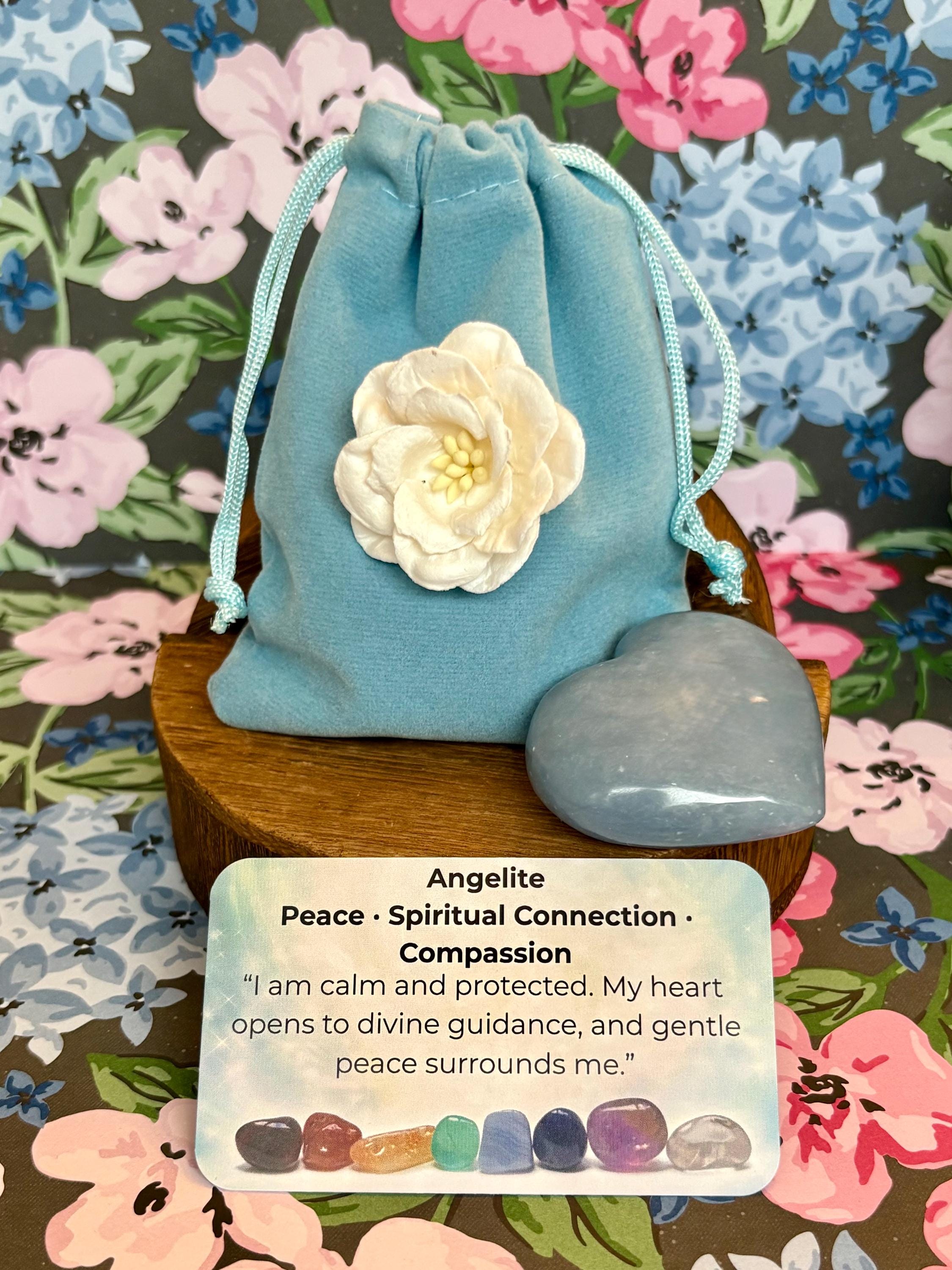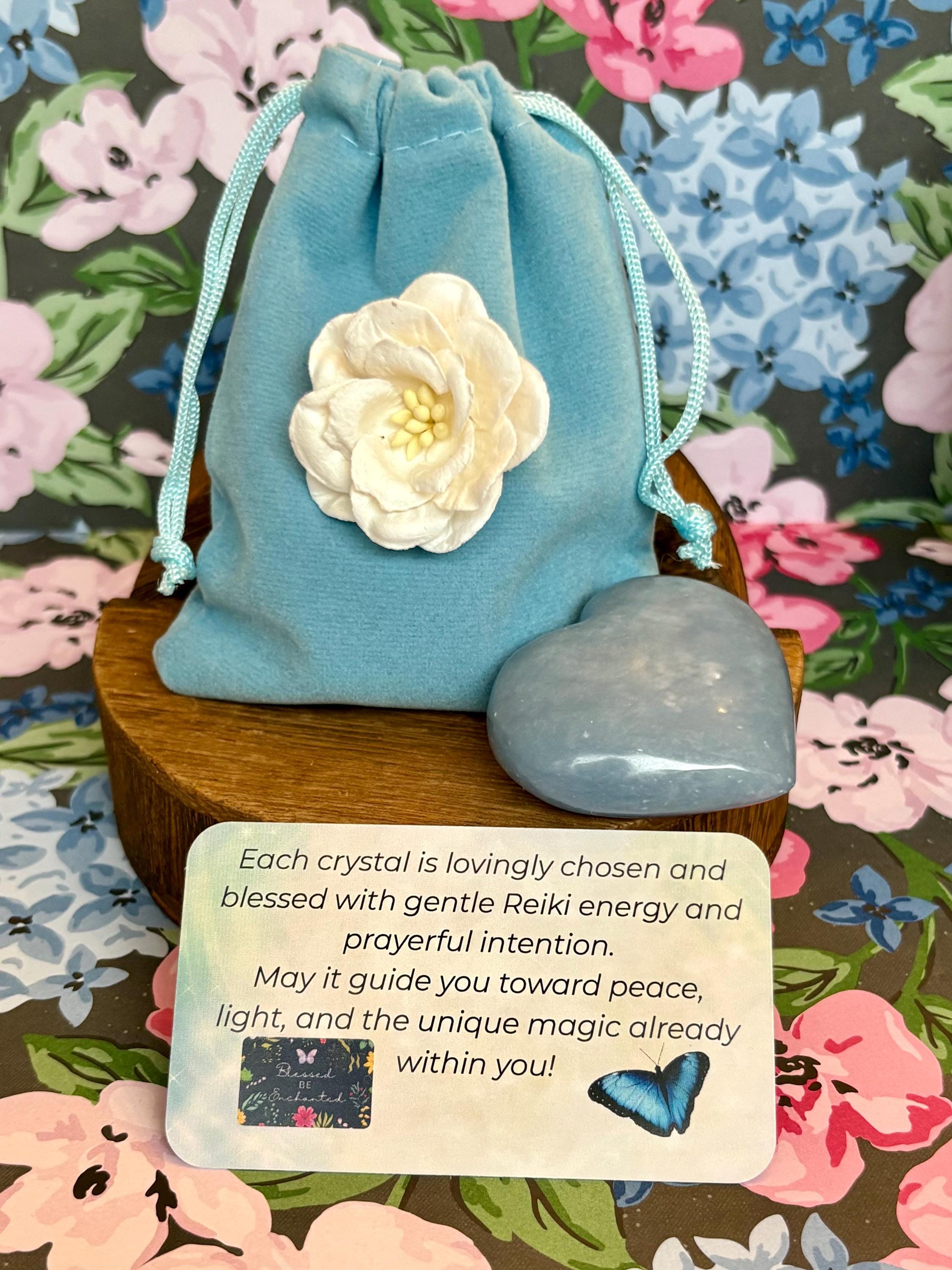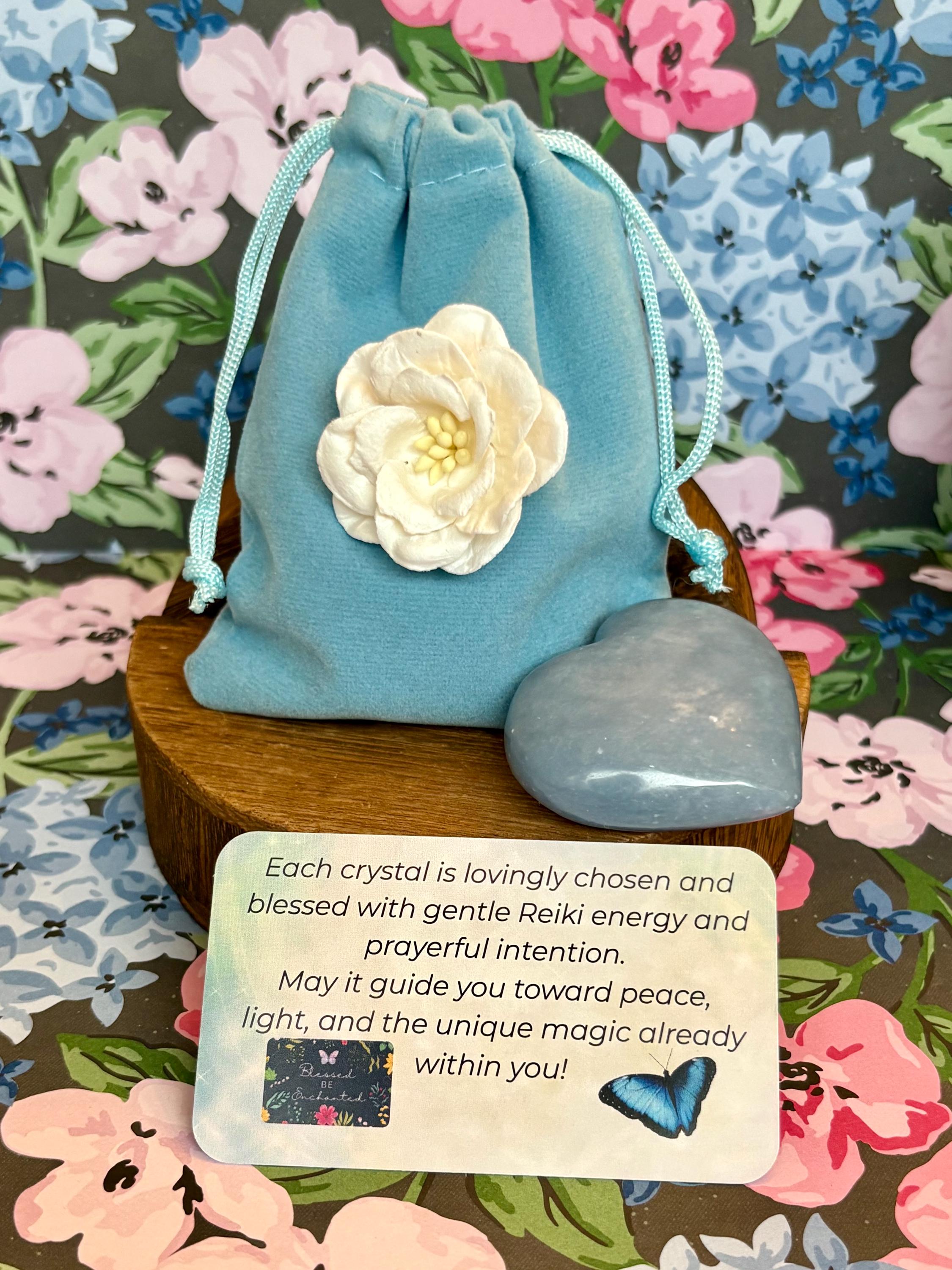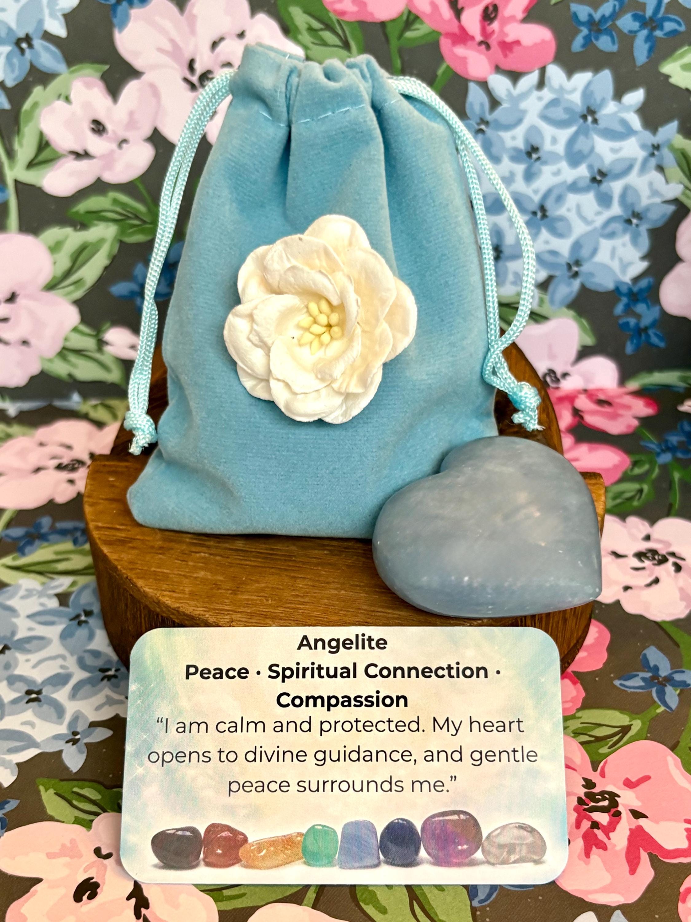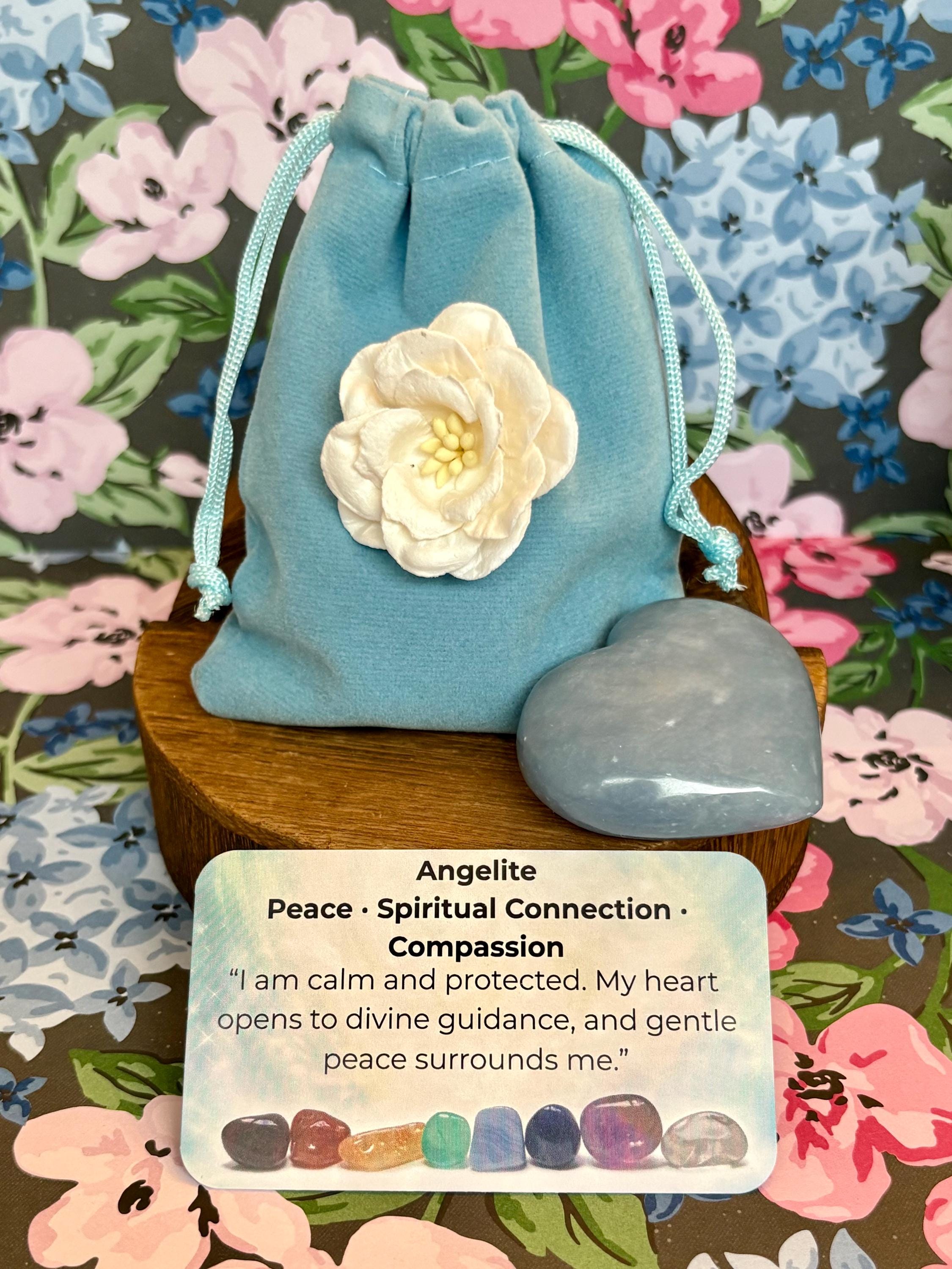 Angelite Heart Crystal Healing Bag • Peace • Spiritual Connection • Compassion • Reiki-Infused Angel Crystal Gift Set