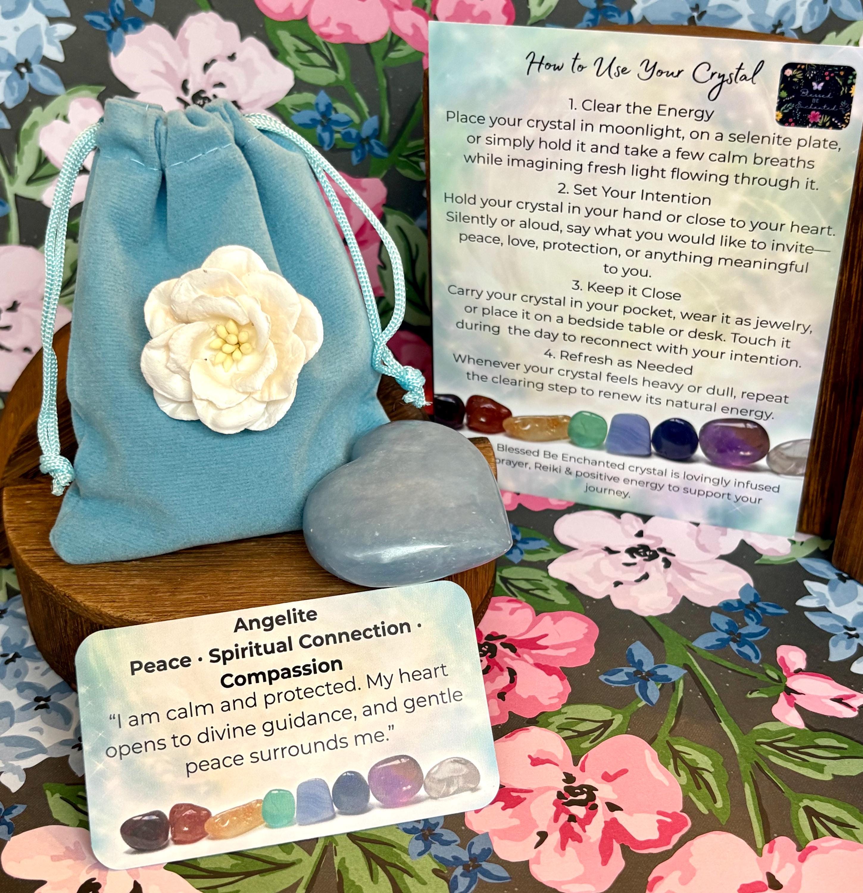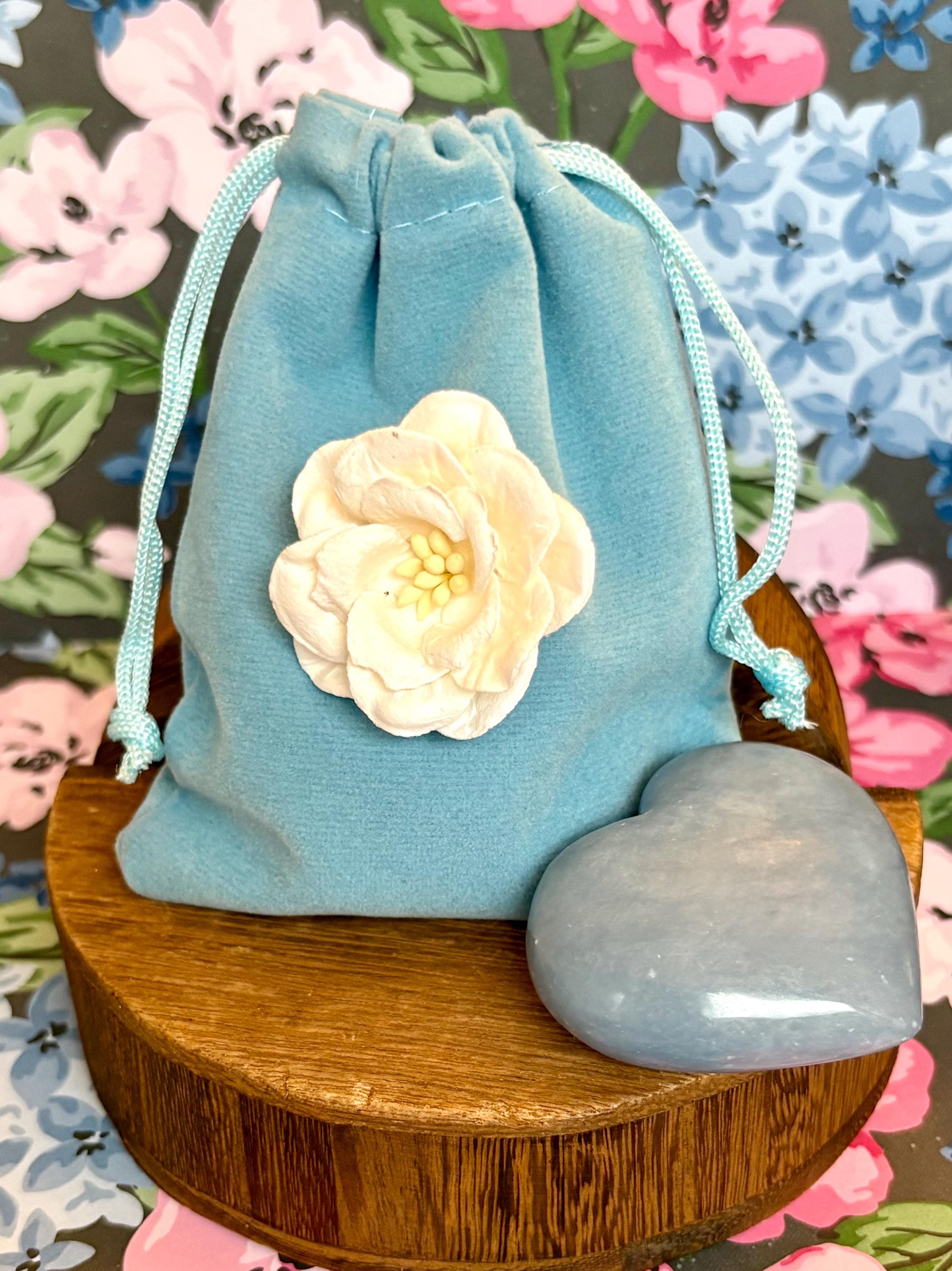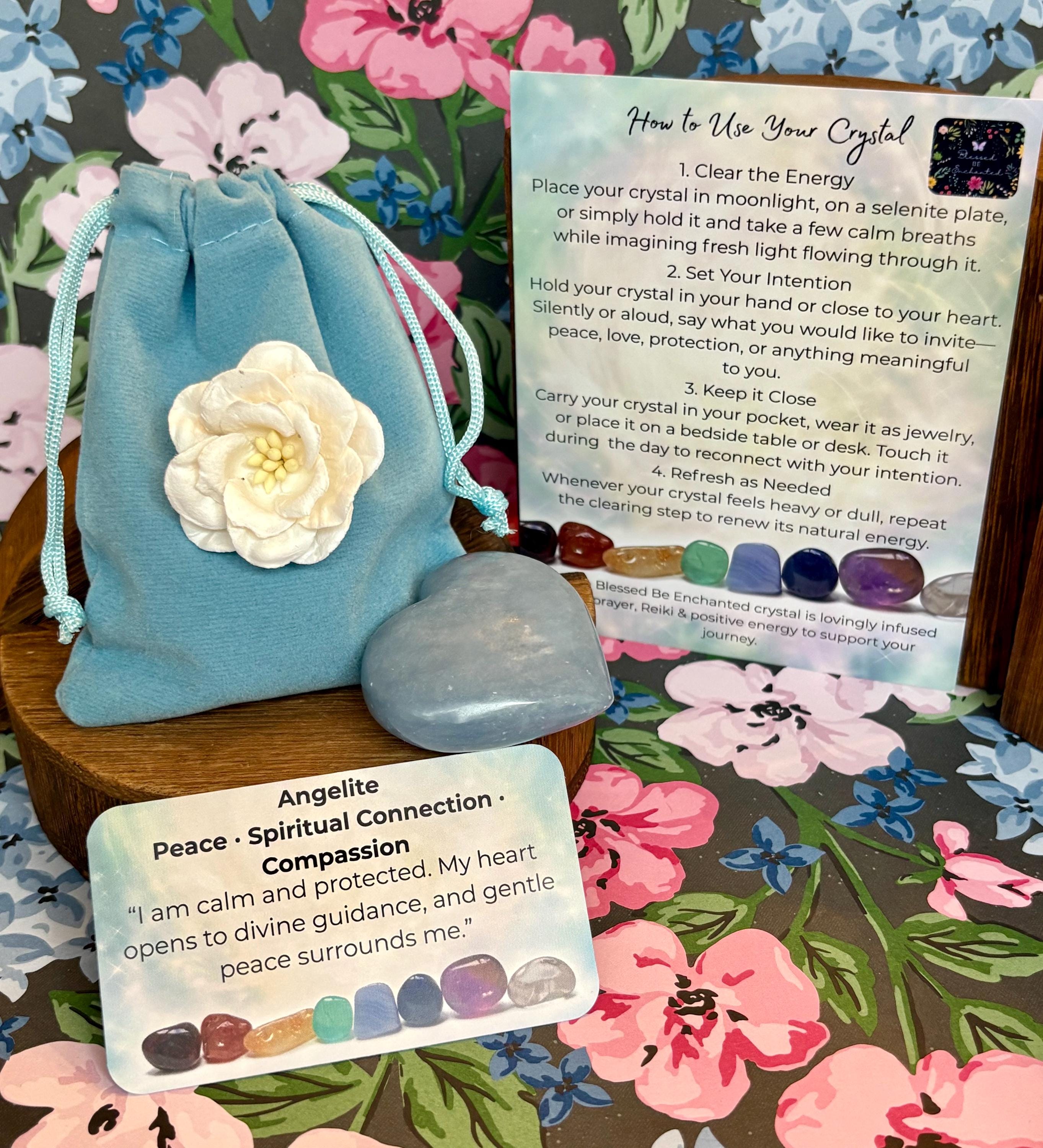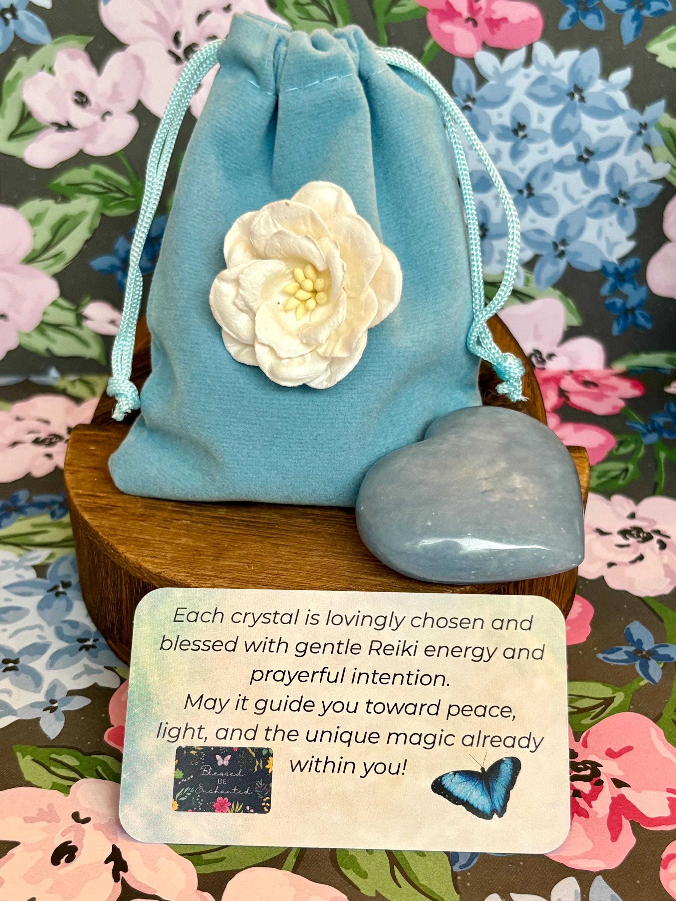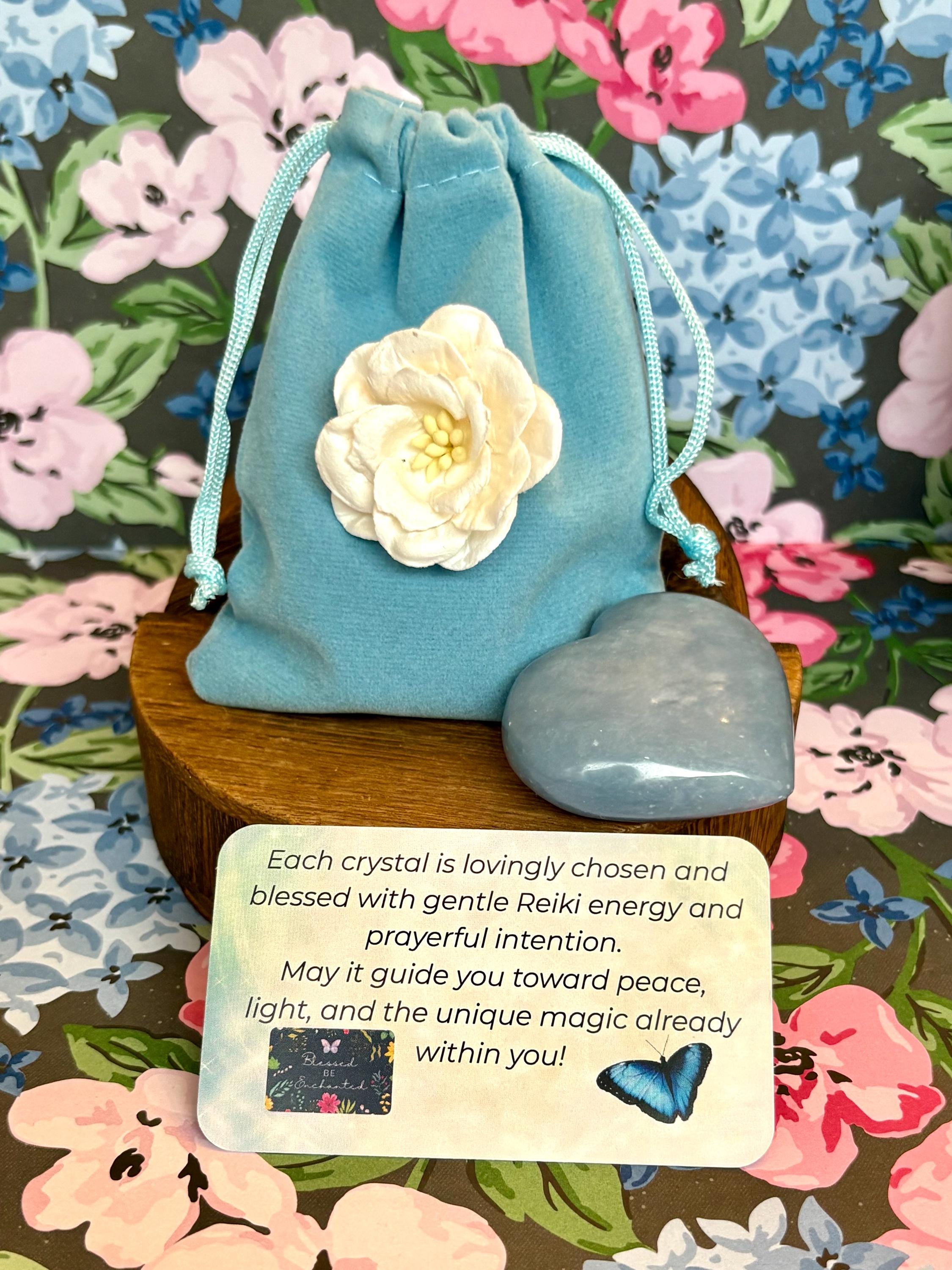 Angelite Heart Crystal Healing Bag • Peace • Spiritual Connection • Compassion • Reiki-Infused Angel Crystal Gift Set