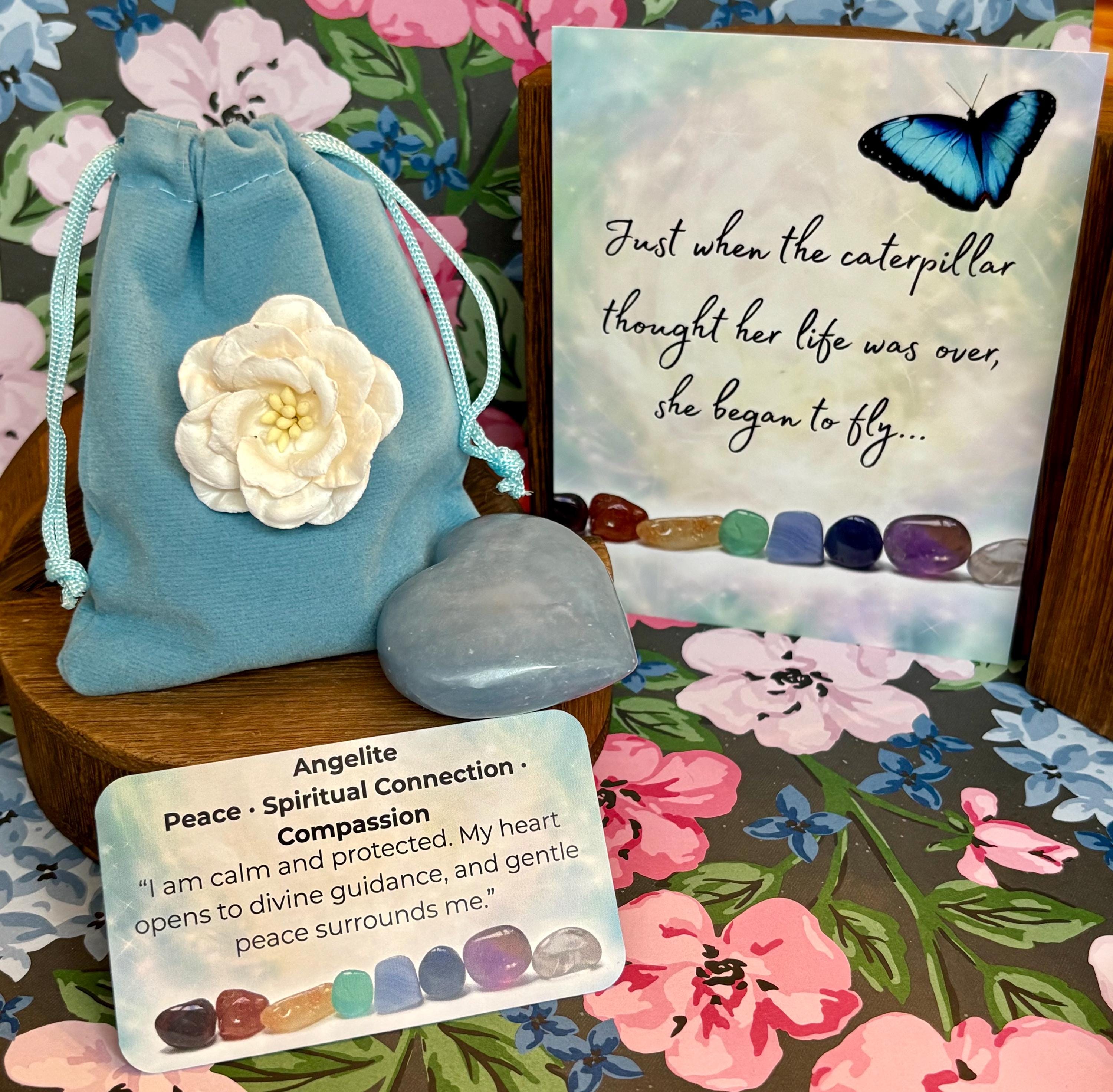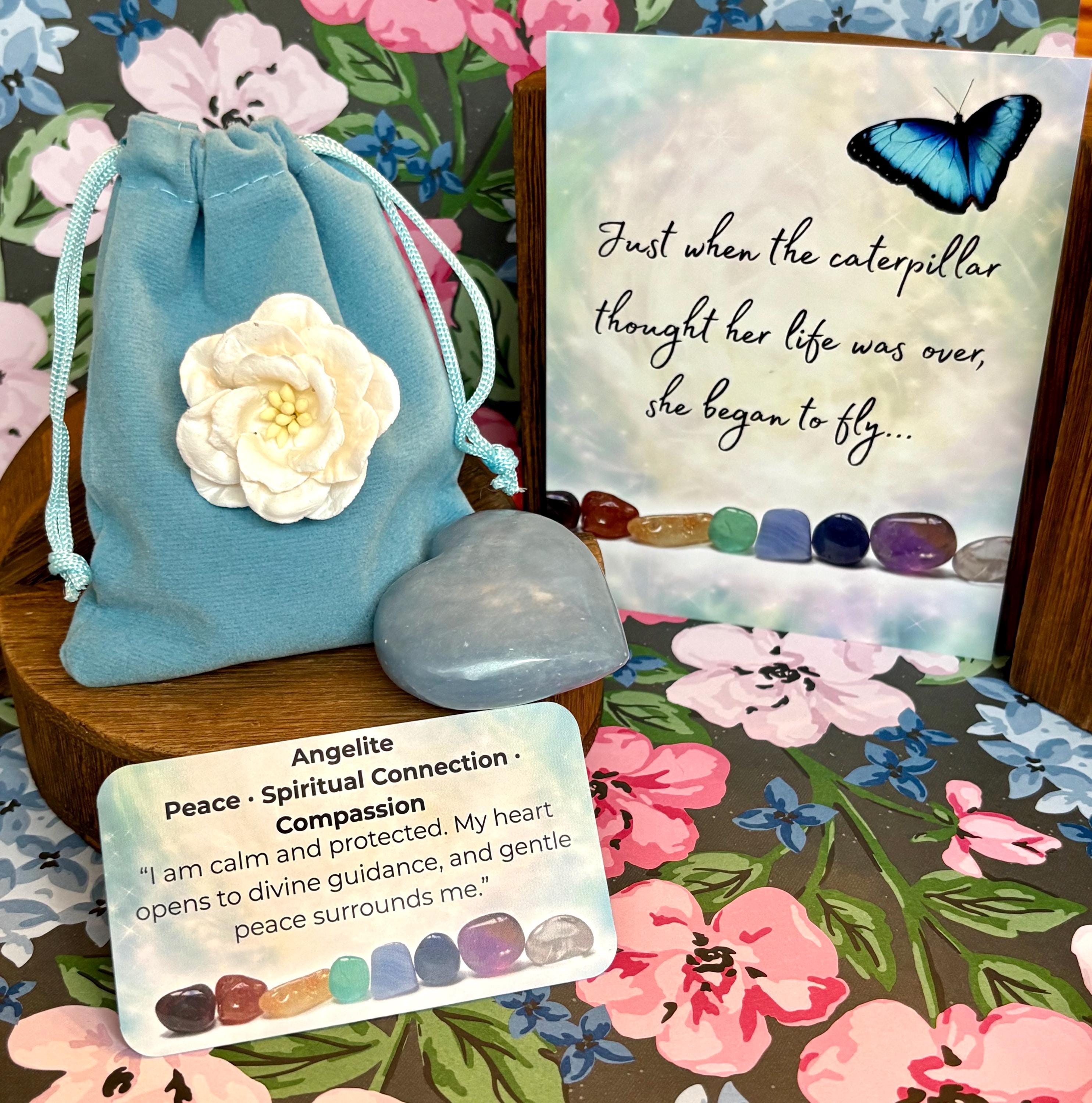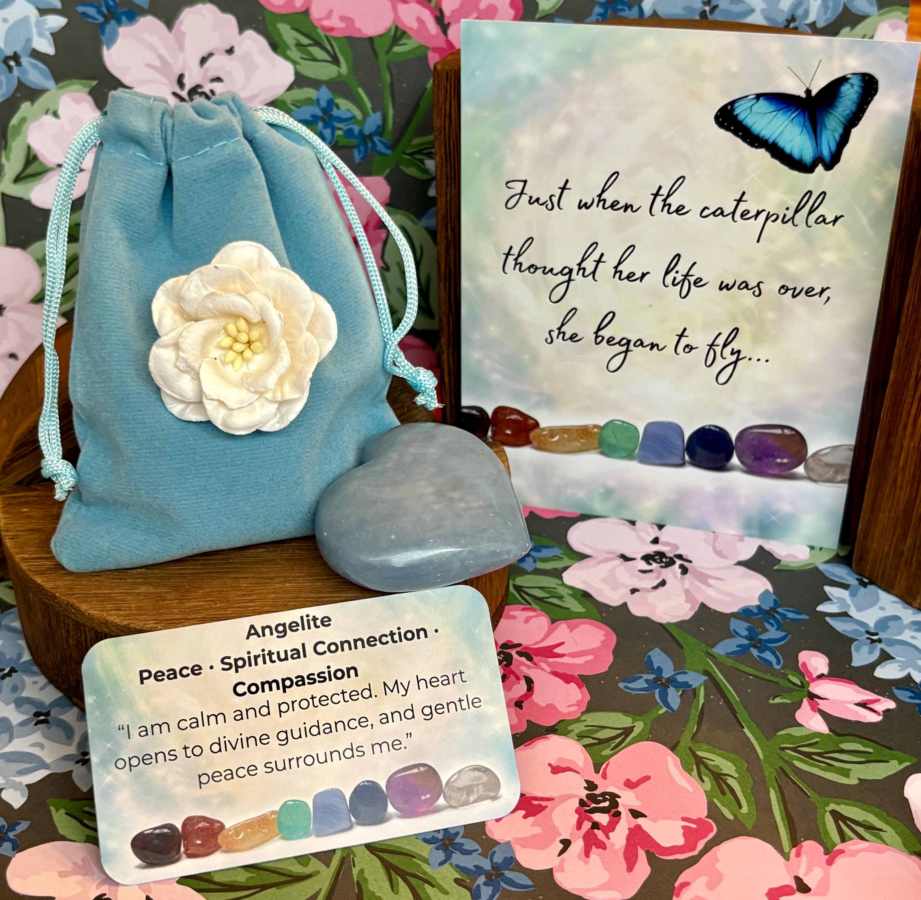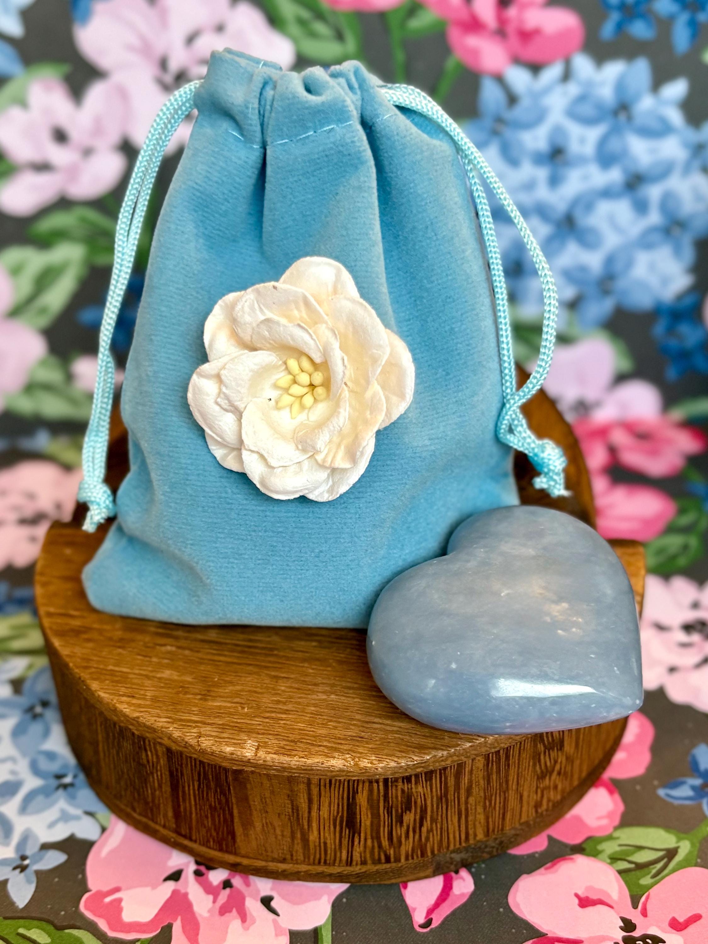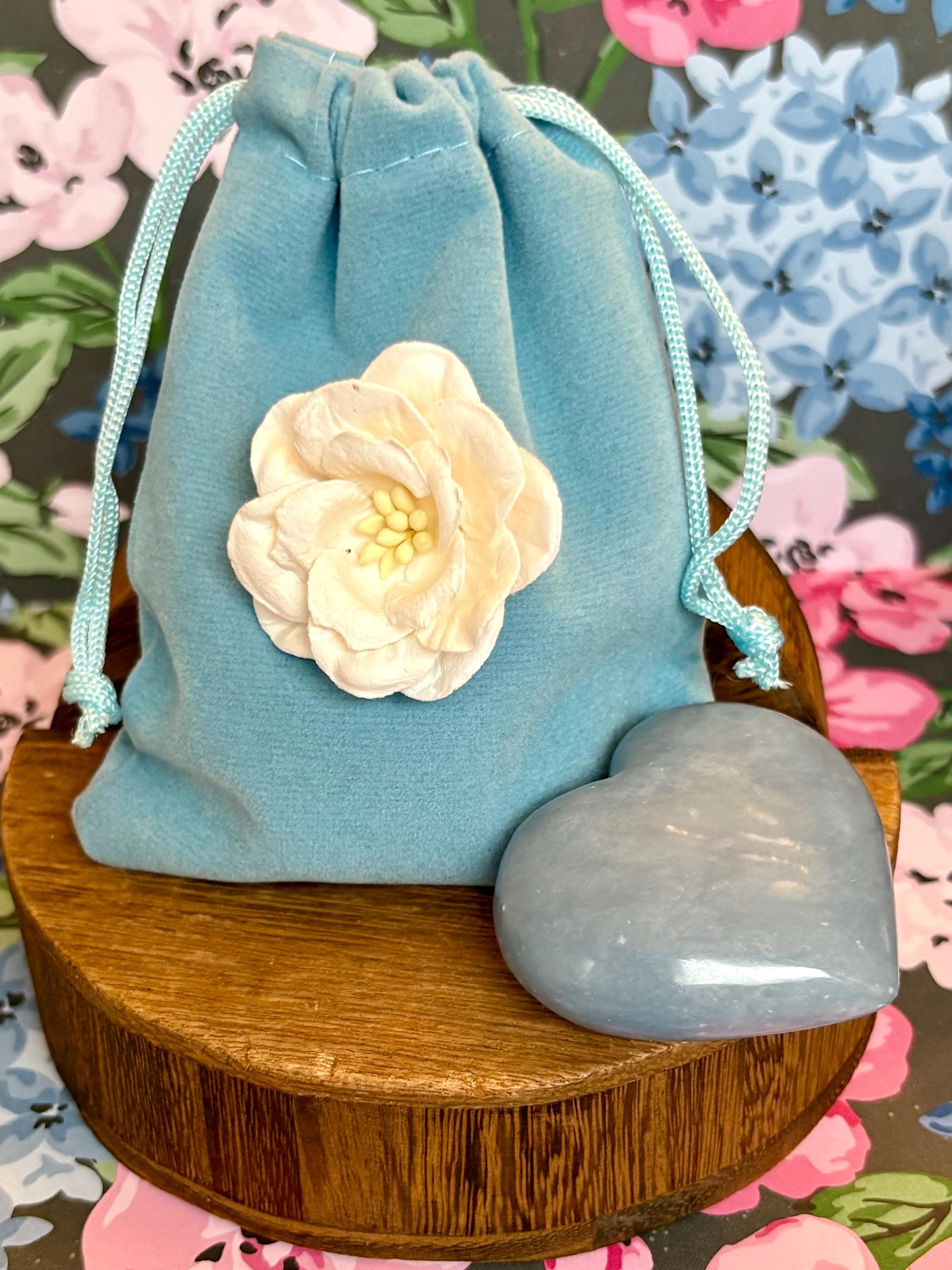 Angelite Heart Crystal Healing Bag • Peace • Spiritual Connection • Compassion • Reiki-Infused Angel Crystal Gift Set