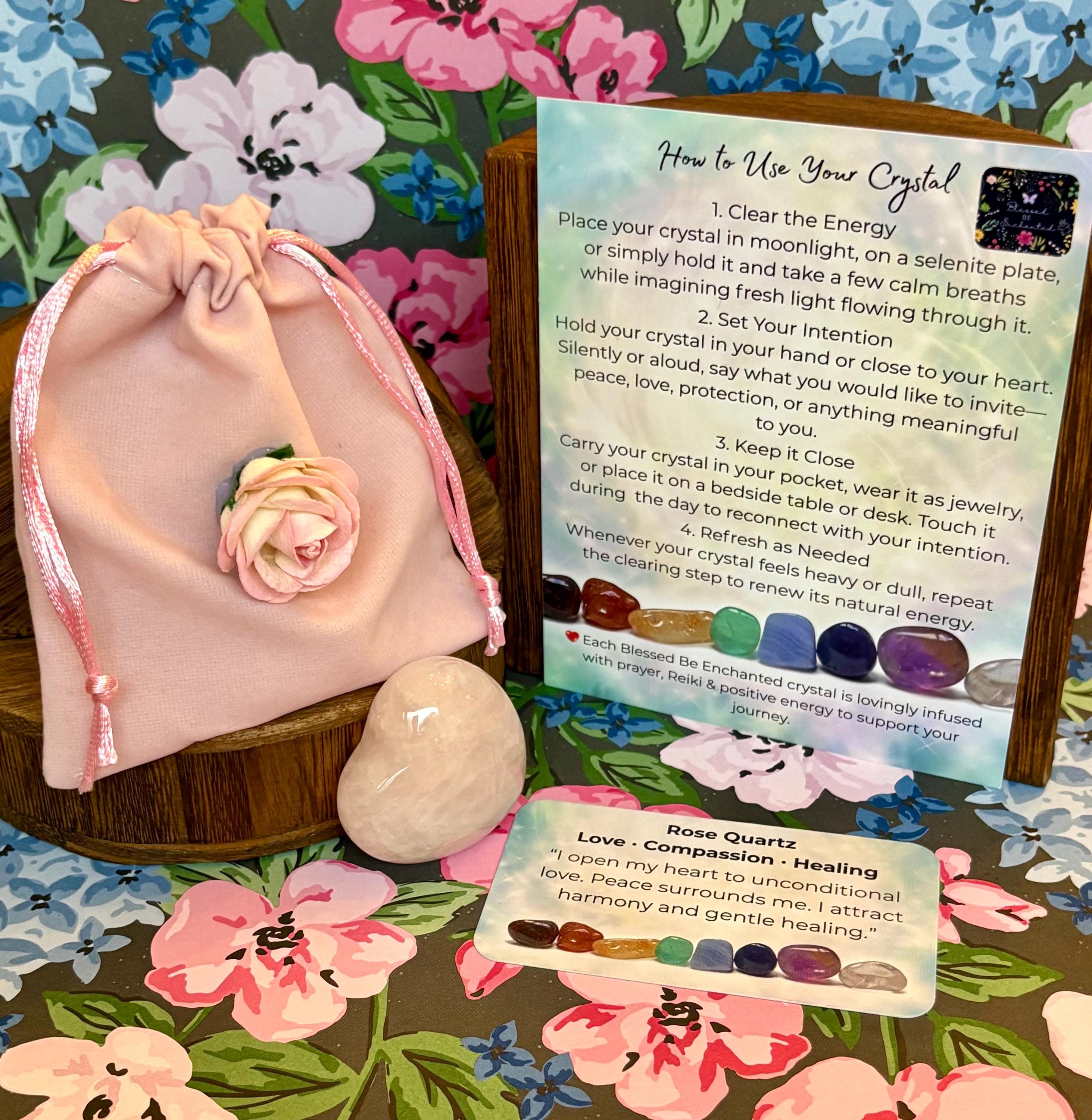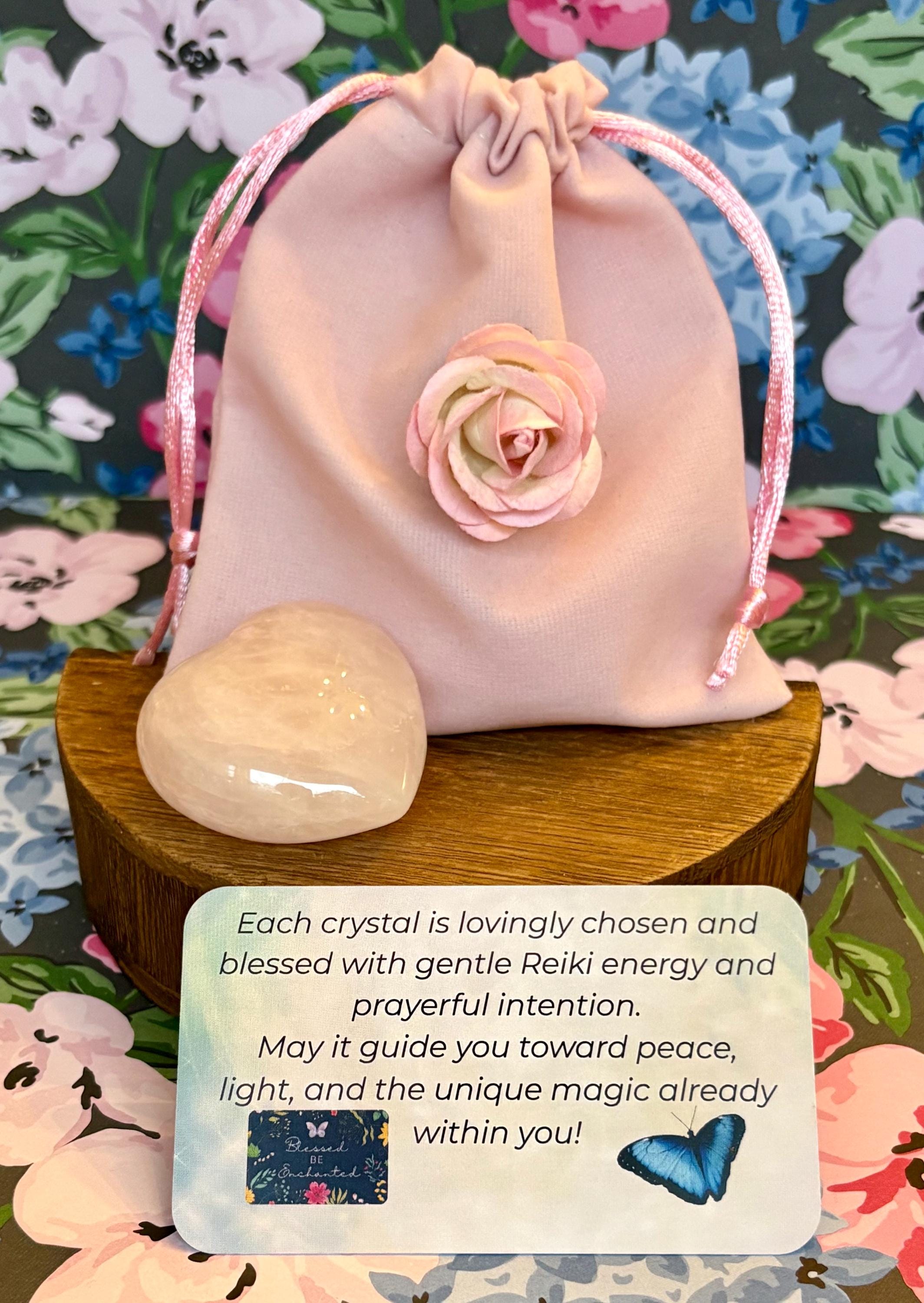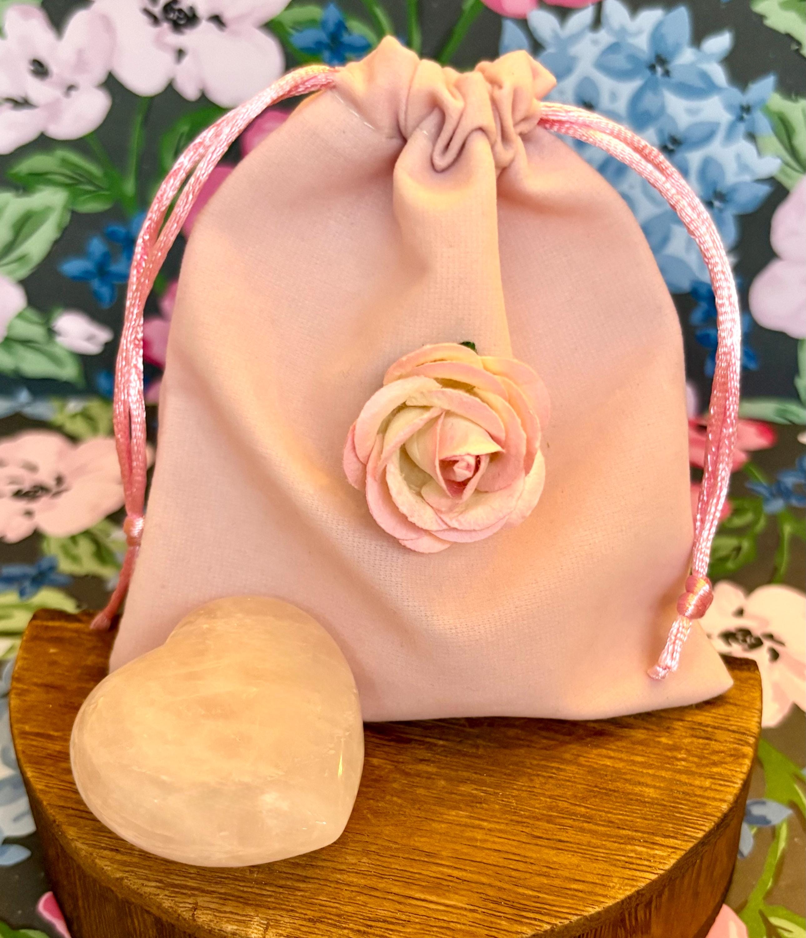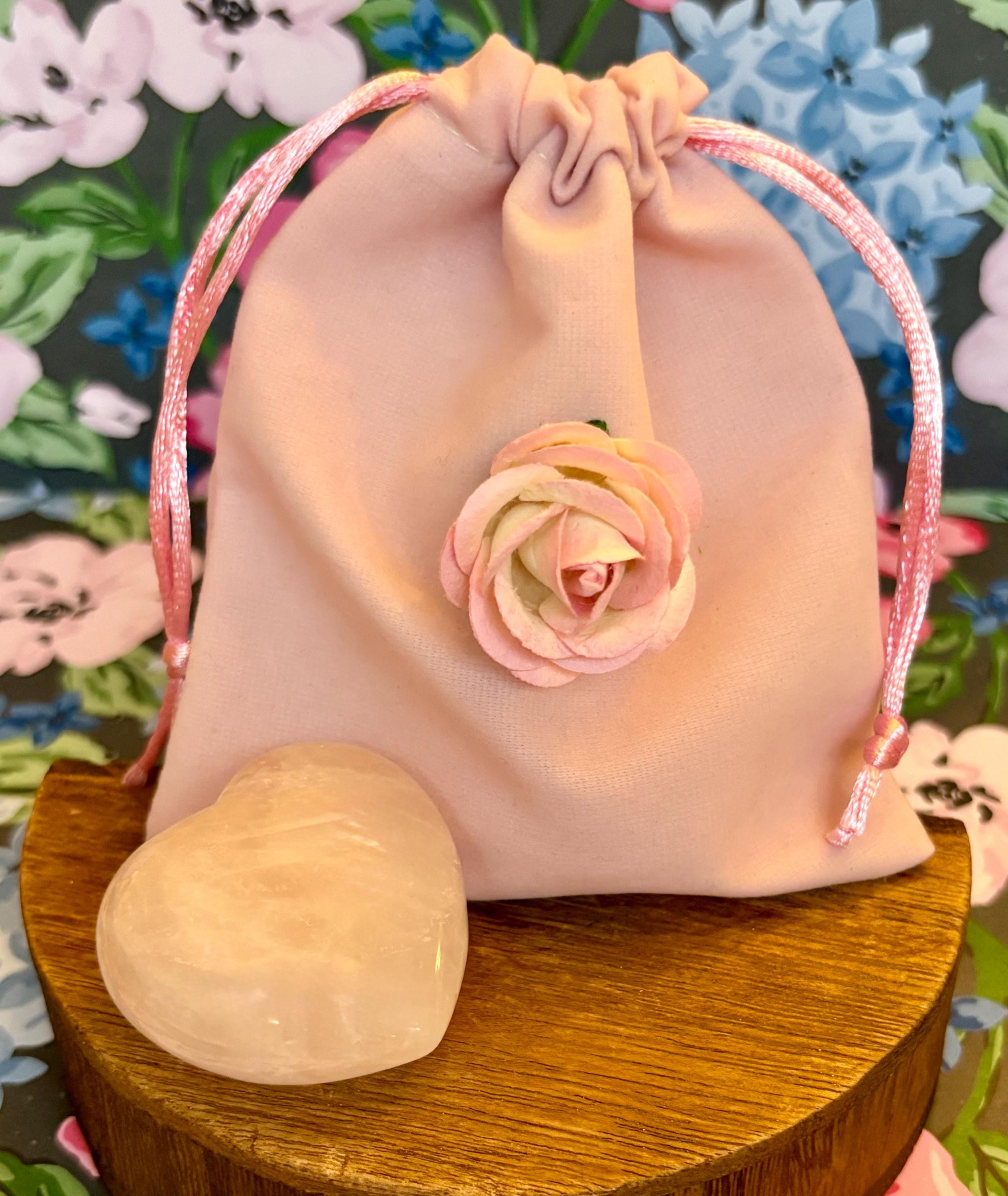 Rose Quartz Angel Crystal Bag • Heart-Shaped Crystal • Love • Compassion • Healing • Pink Velvet Flower Pouch & Blessing Cards
