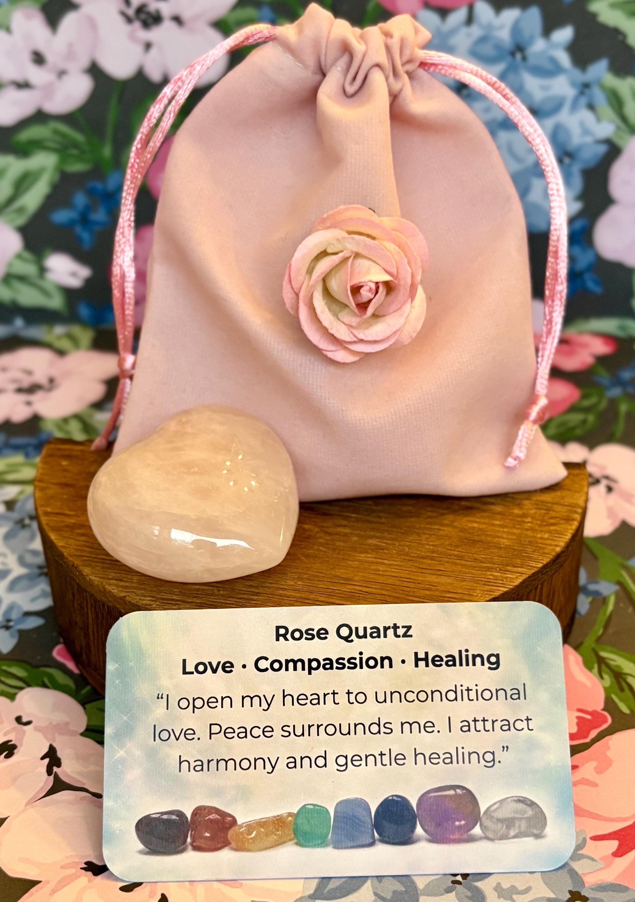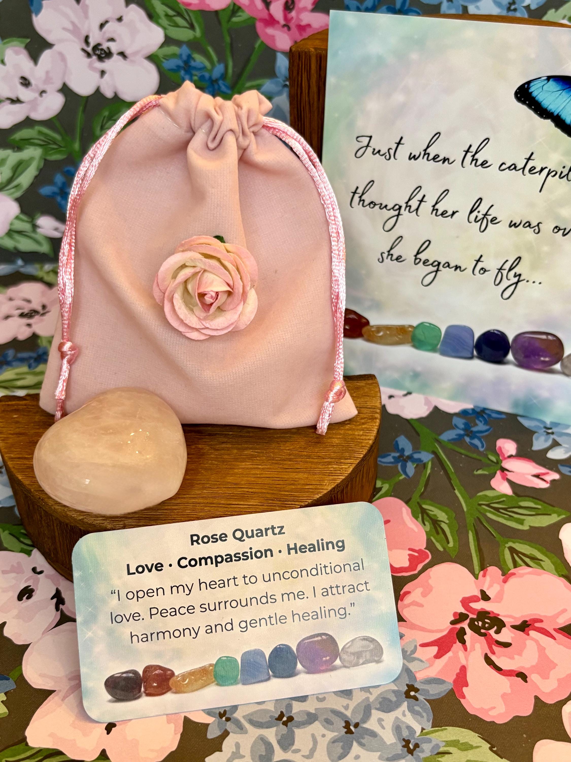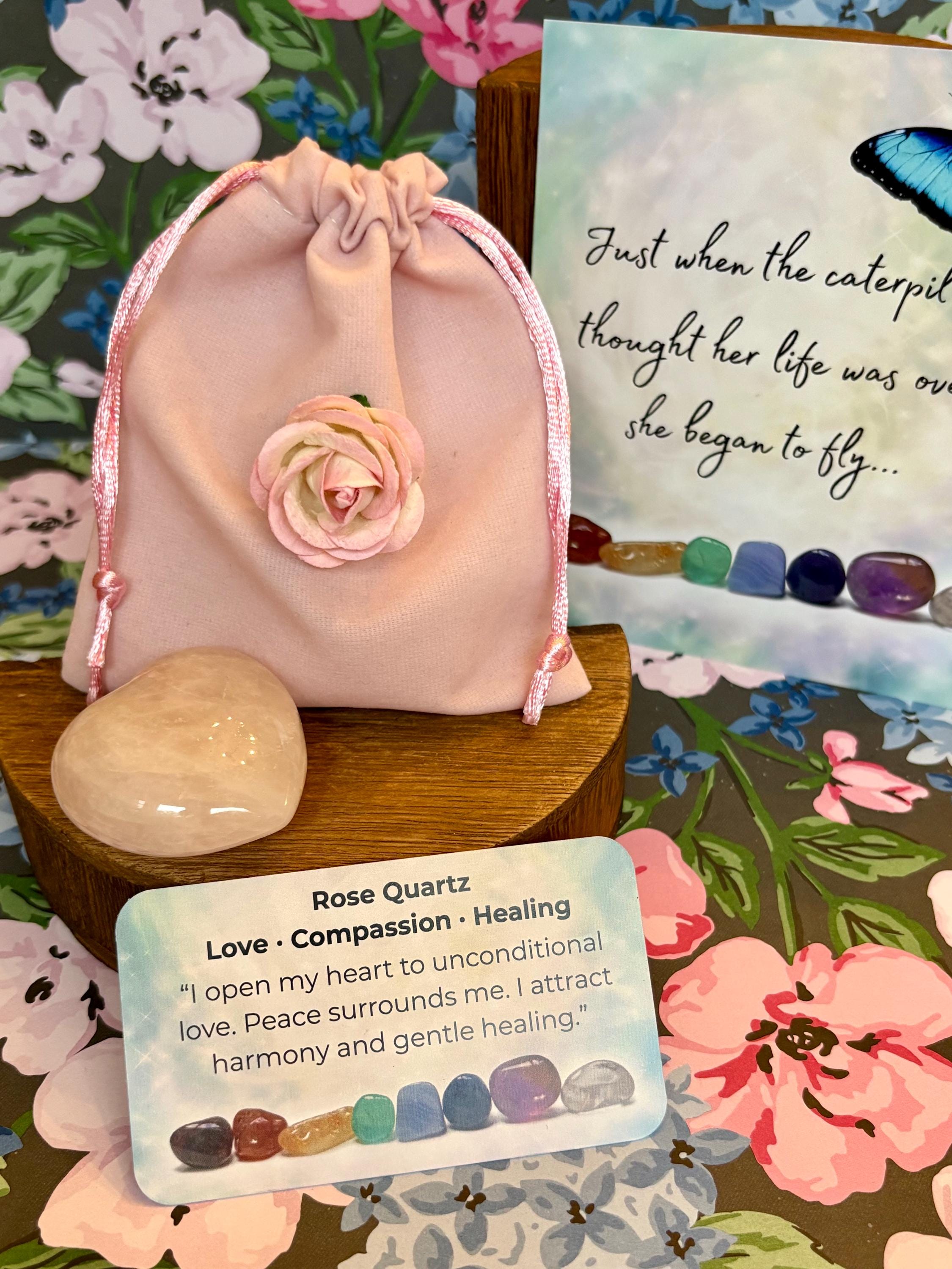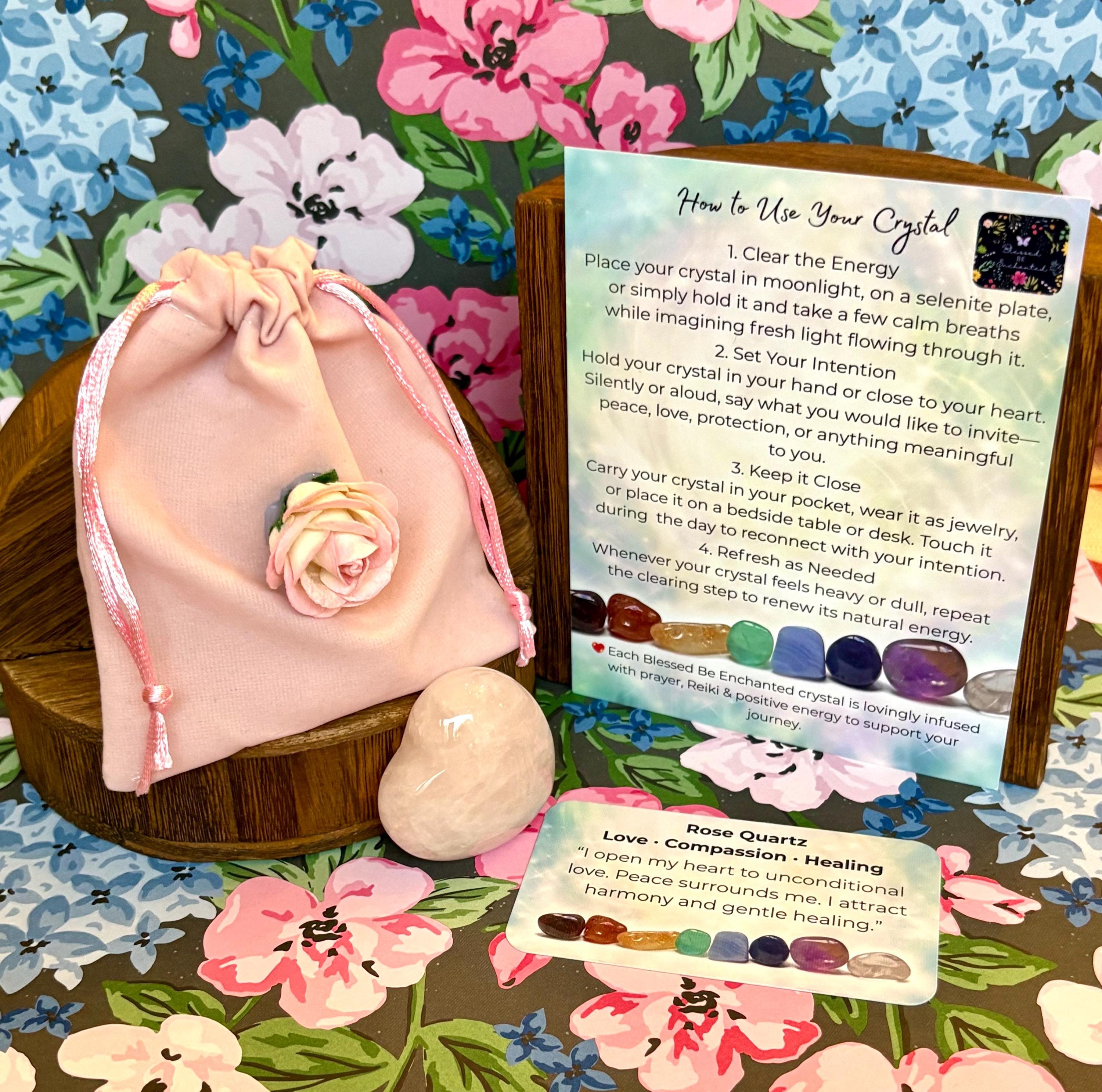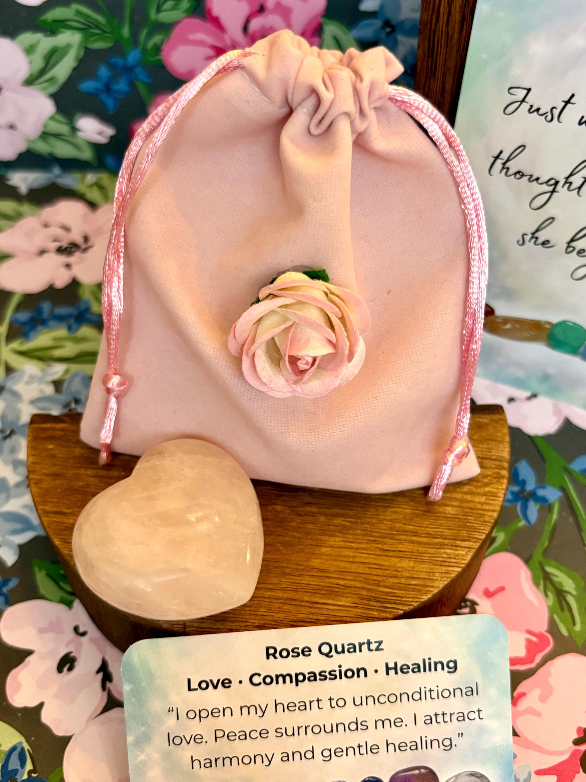 Rose Quartz Angel Crystal Bag • Heart-Shaped Crystal • Love • Compassion • Healing • Pink Velvet Flower Pouch & Blessing Cards