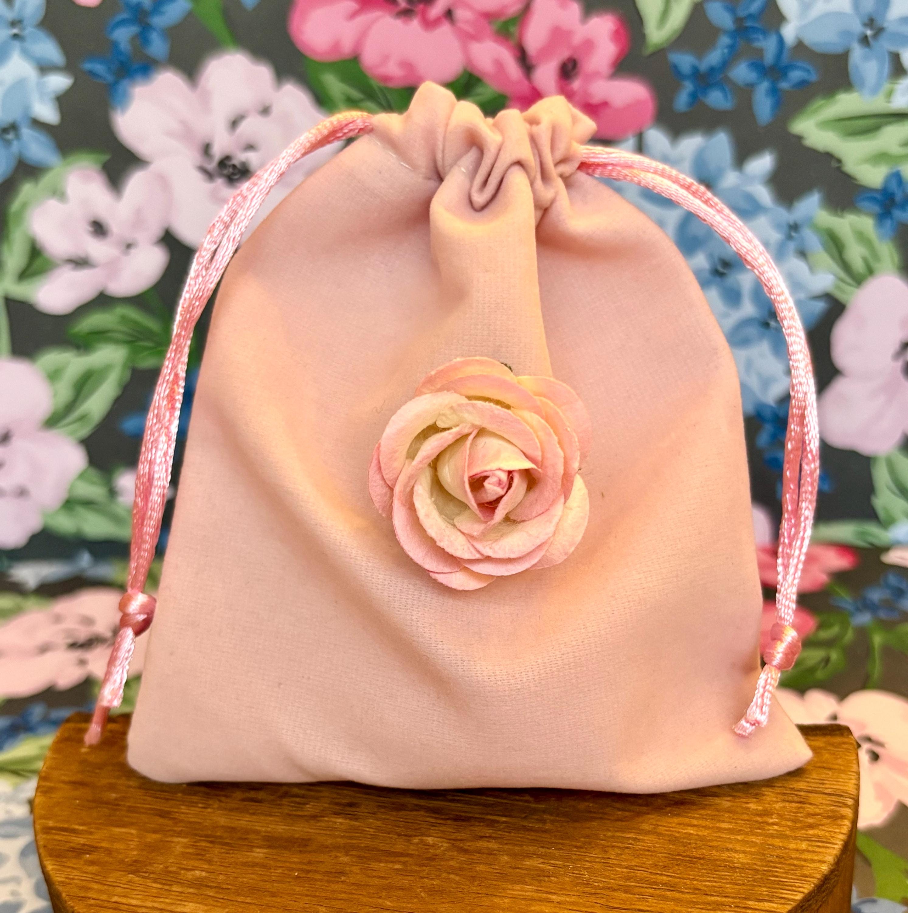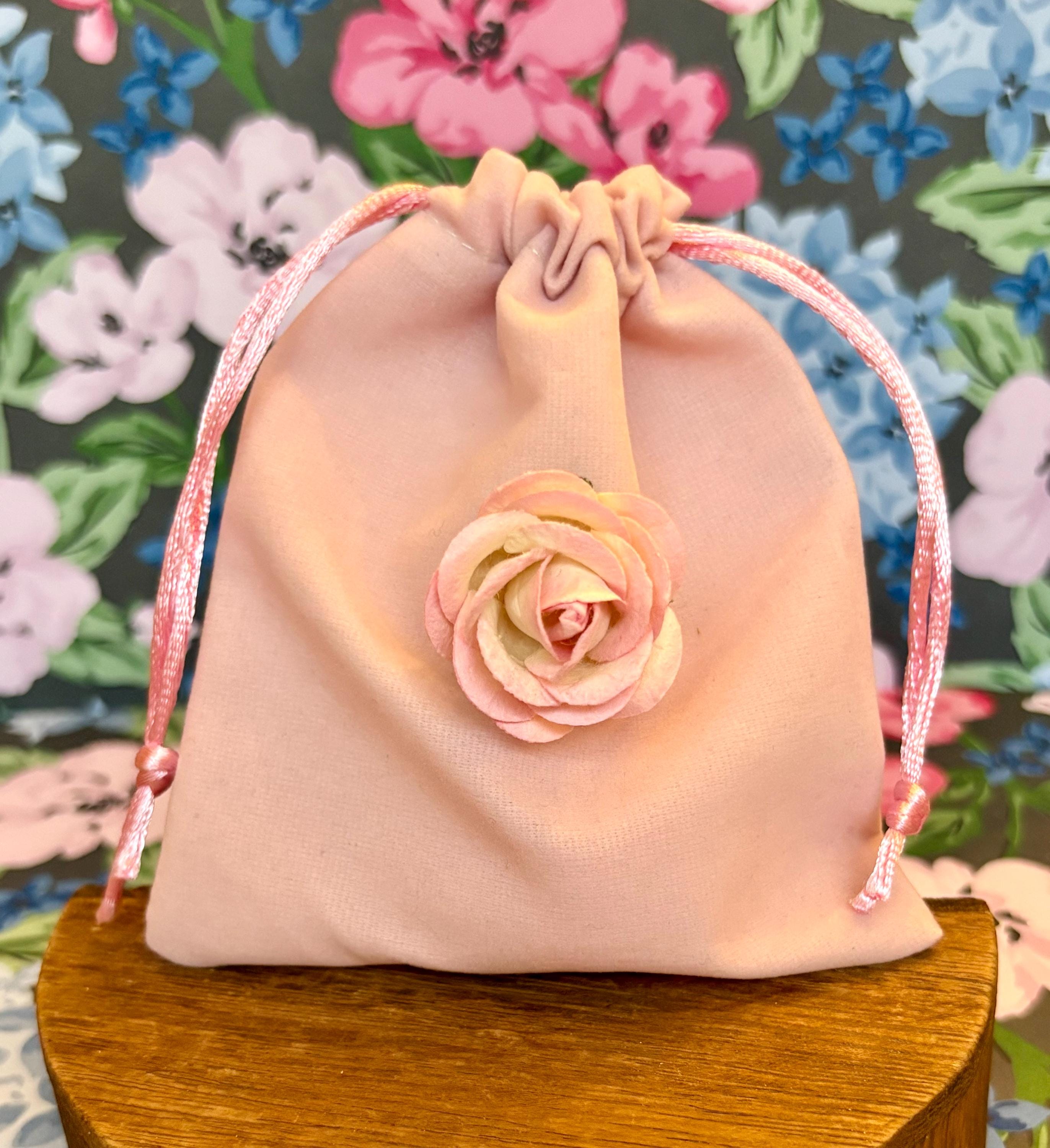 ✨ 1 soft pink velvet drawstring bag adorned with a delicate flower.
