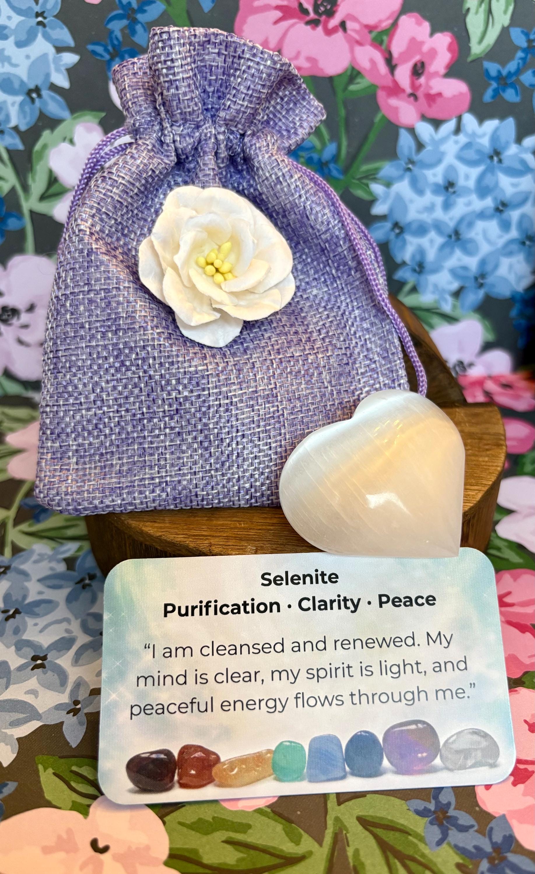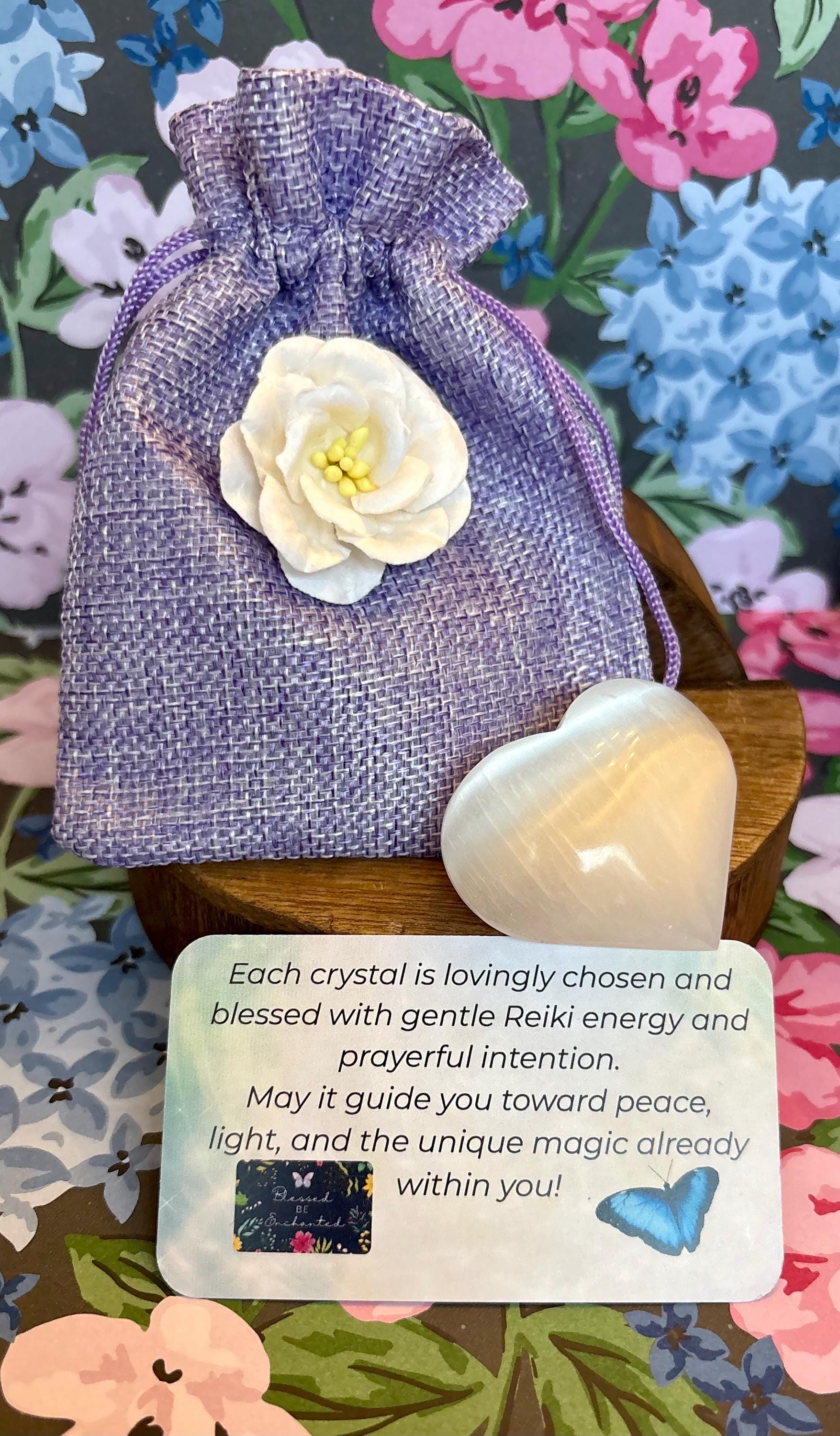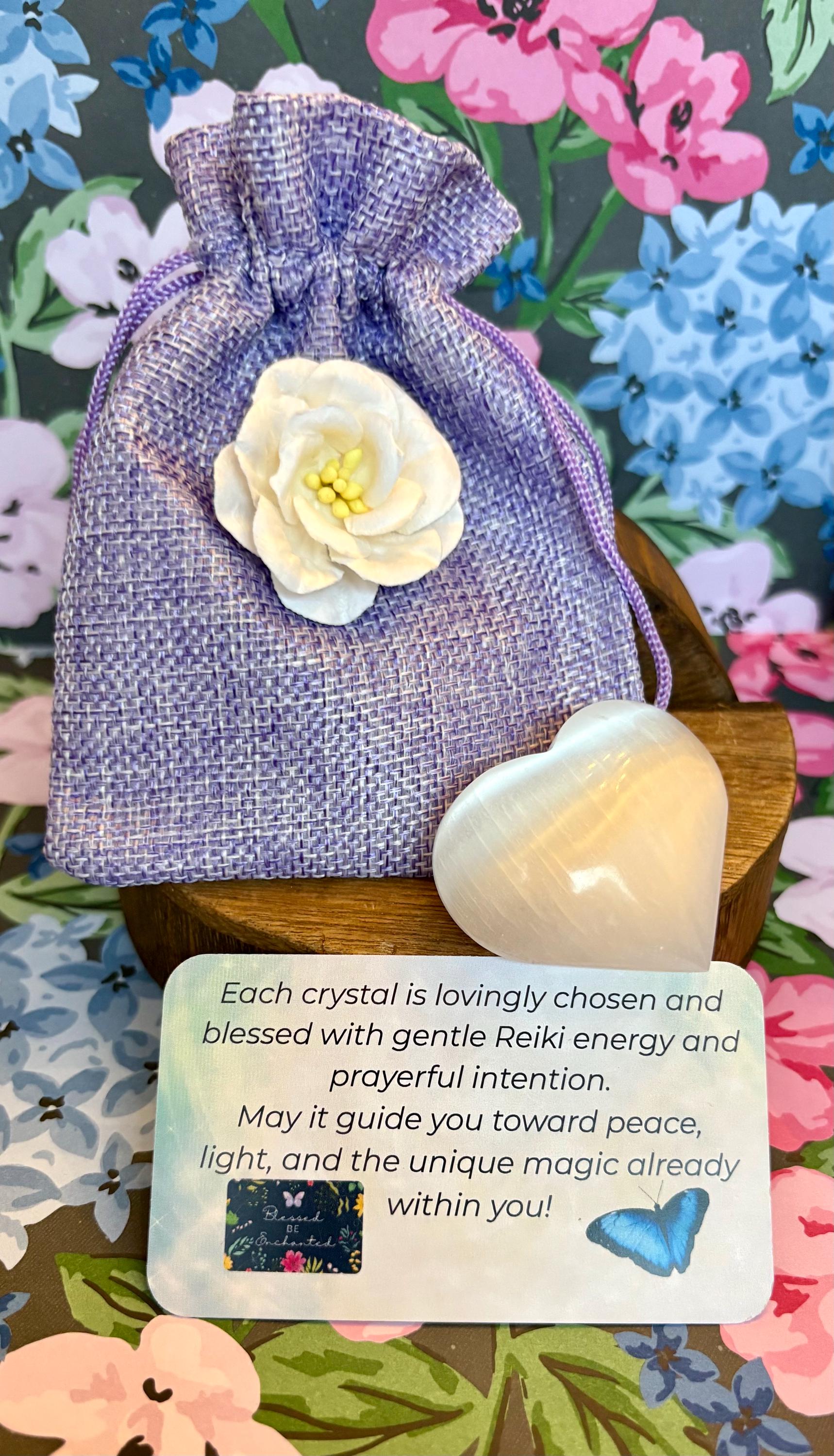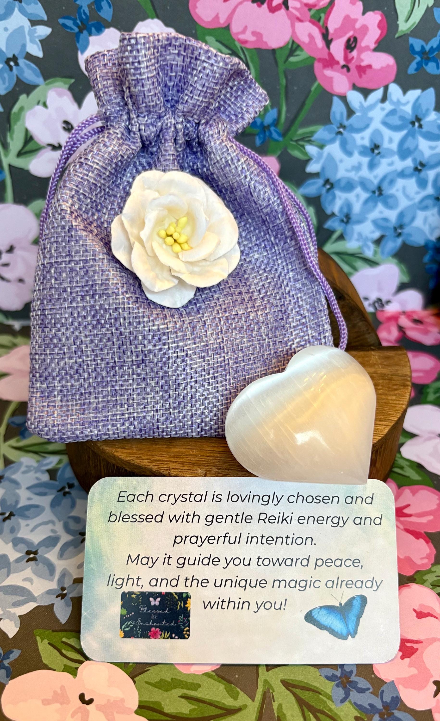 💎 1 polished heart-shaped Selenite crystal (puffed style) – radiant and smooth, perfect for meditation or energy cleansing.