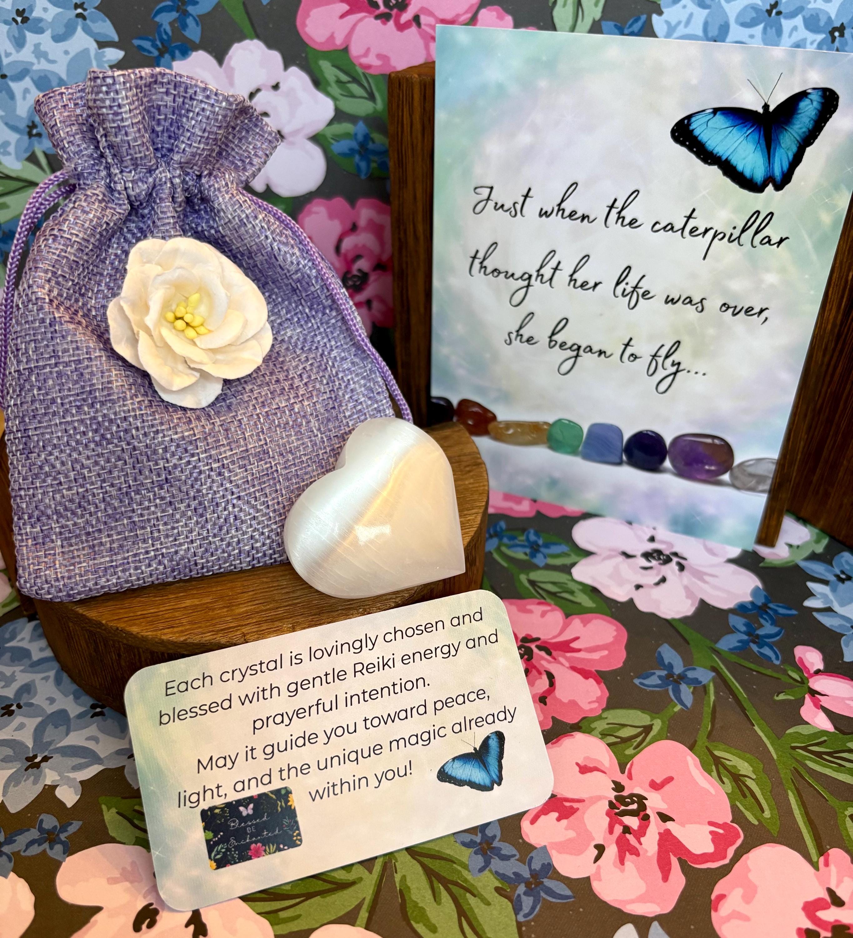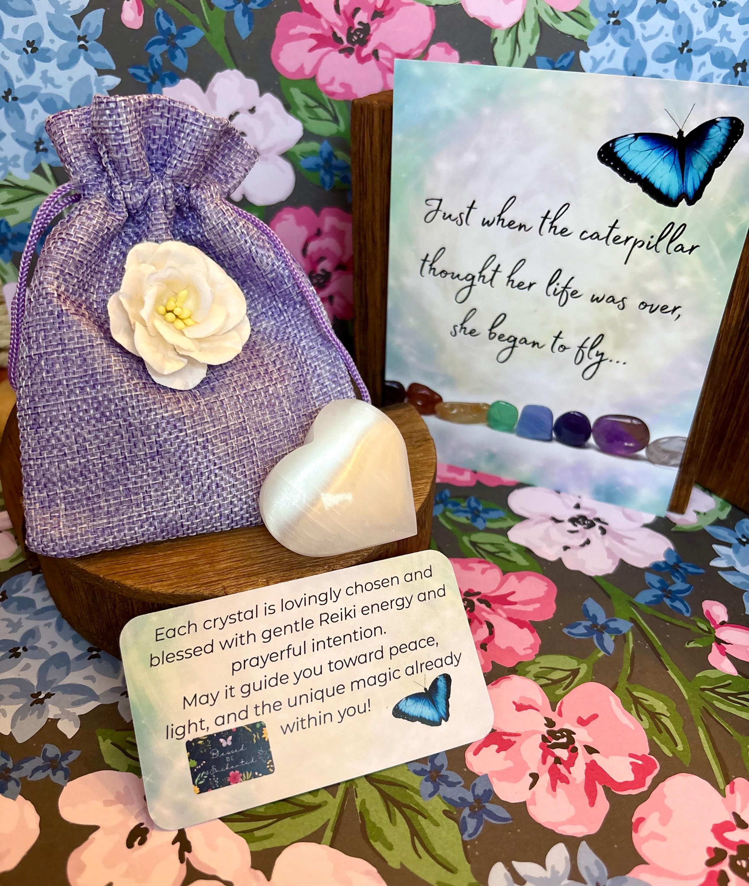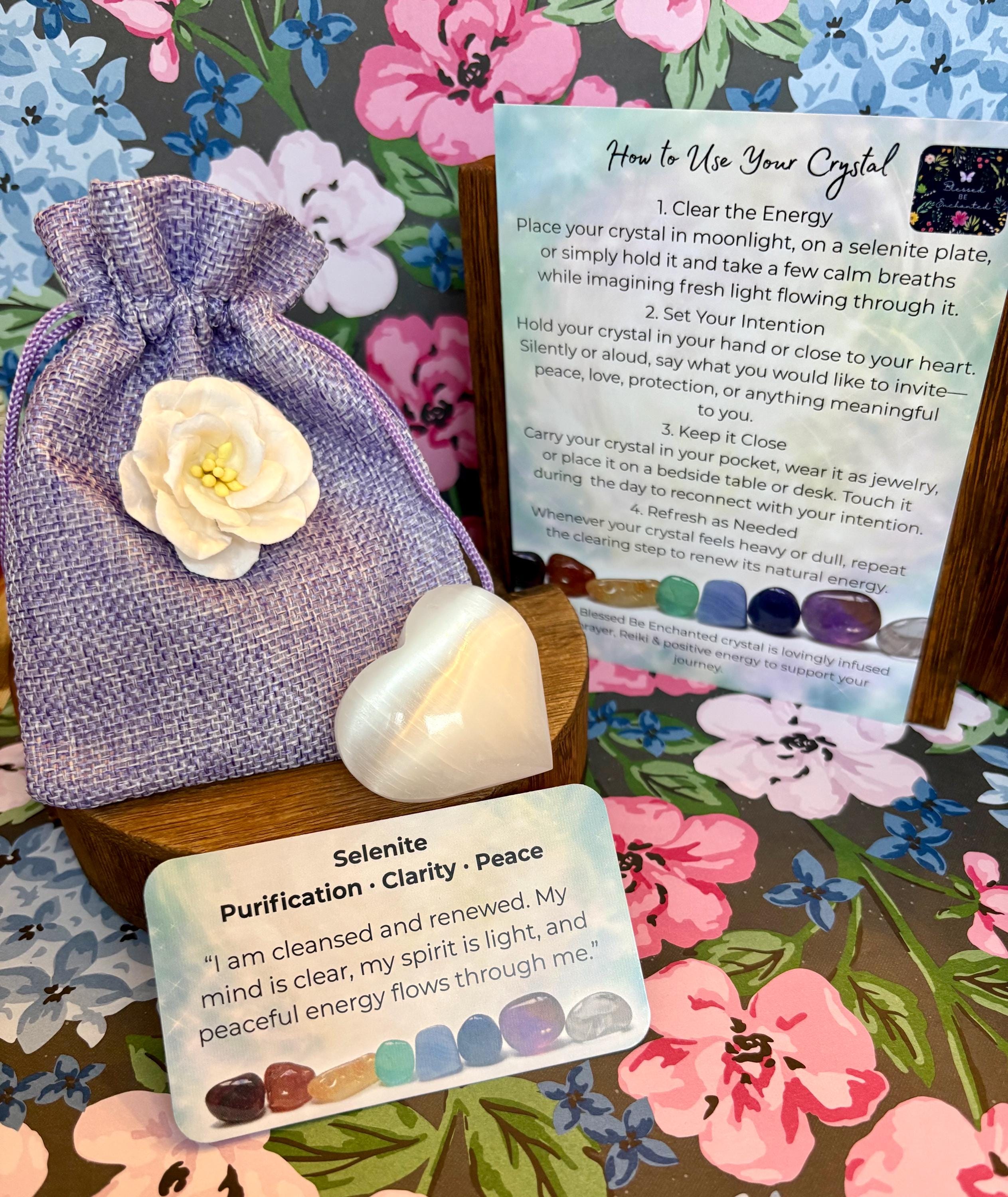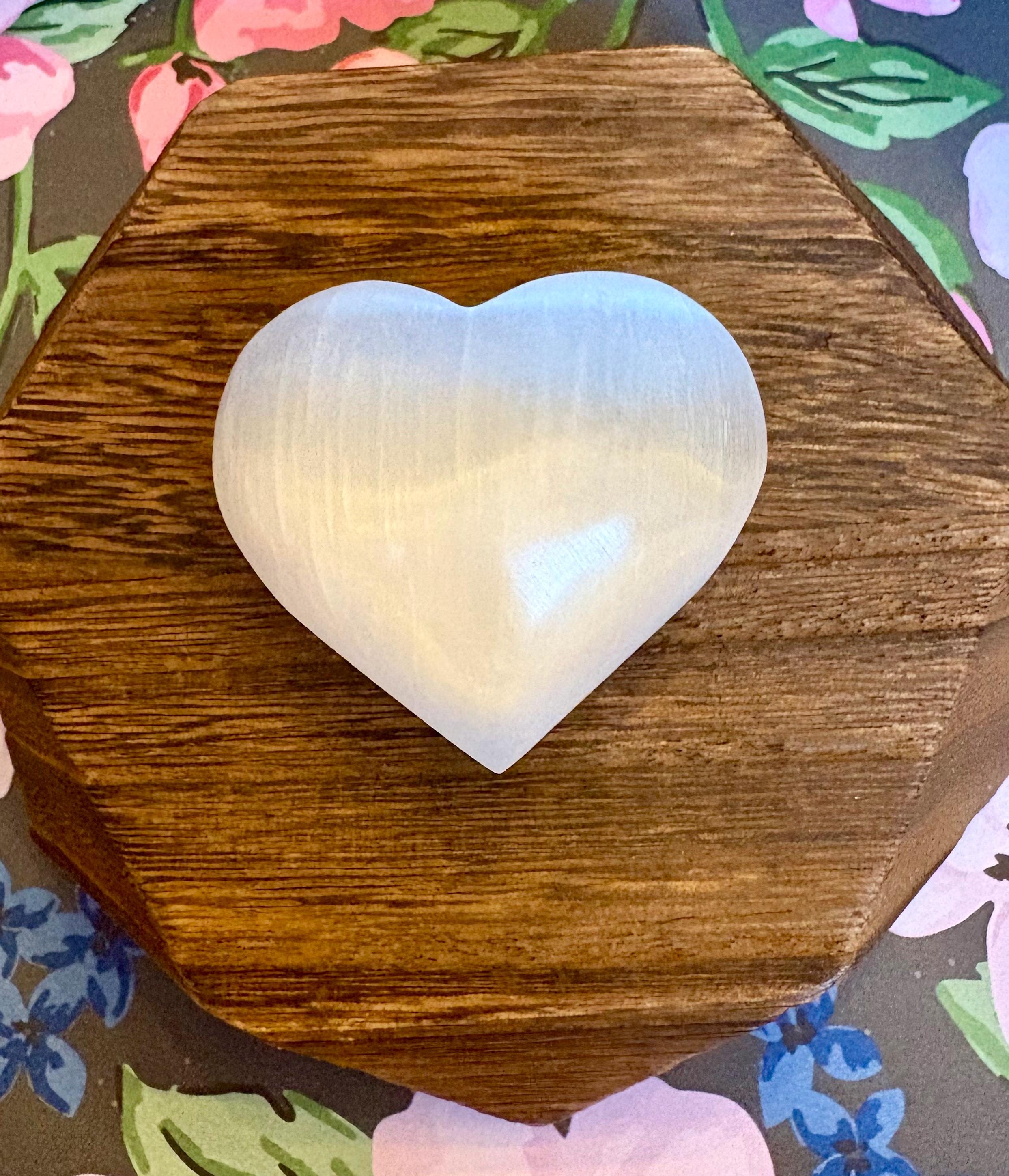 💎 1 polished heart-shaped Selenite crystal (puffed style) – radiant and smooth, perfect for meditation or energy cleansing.