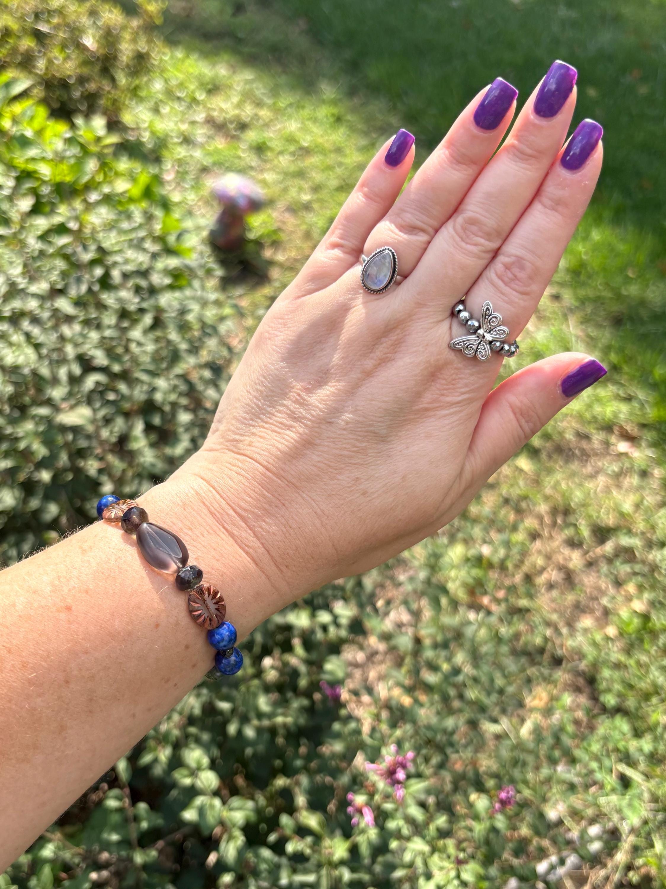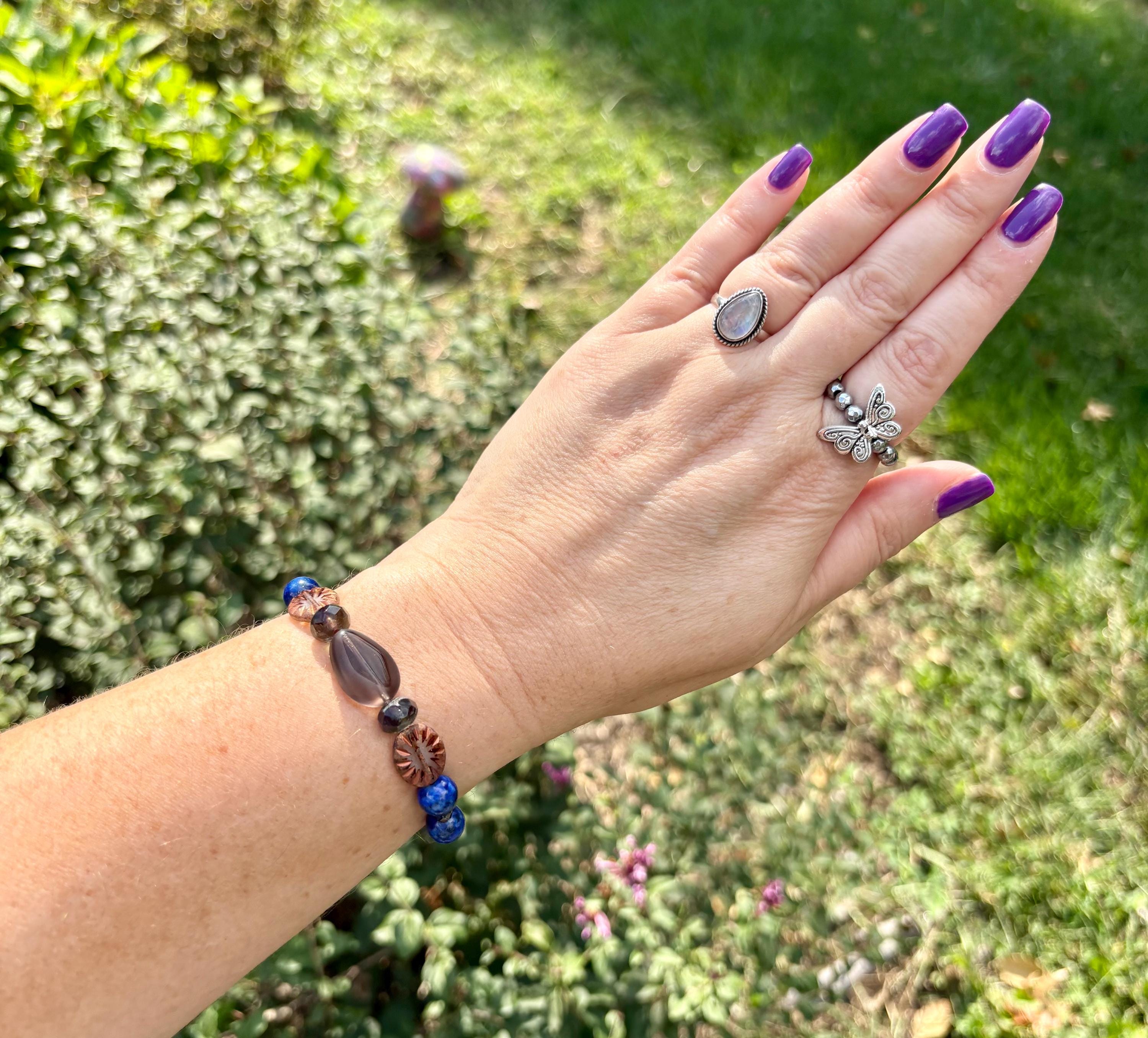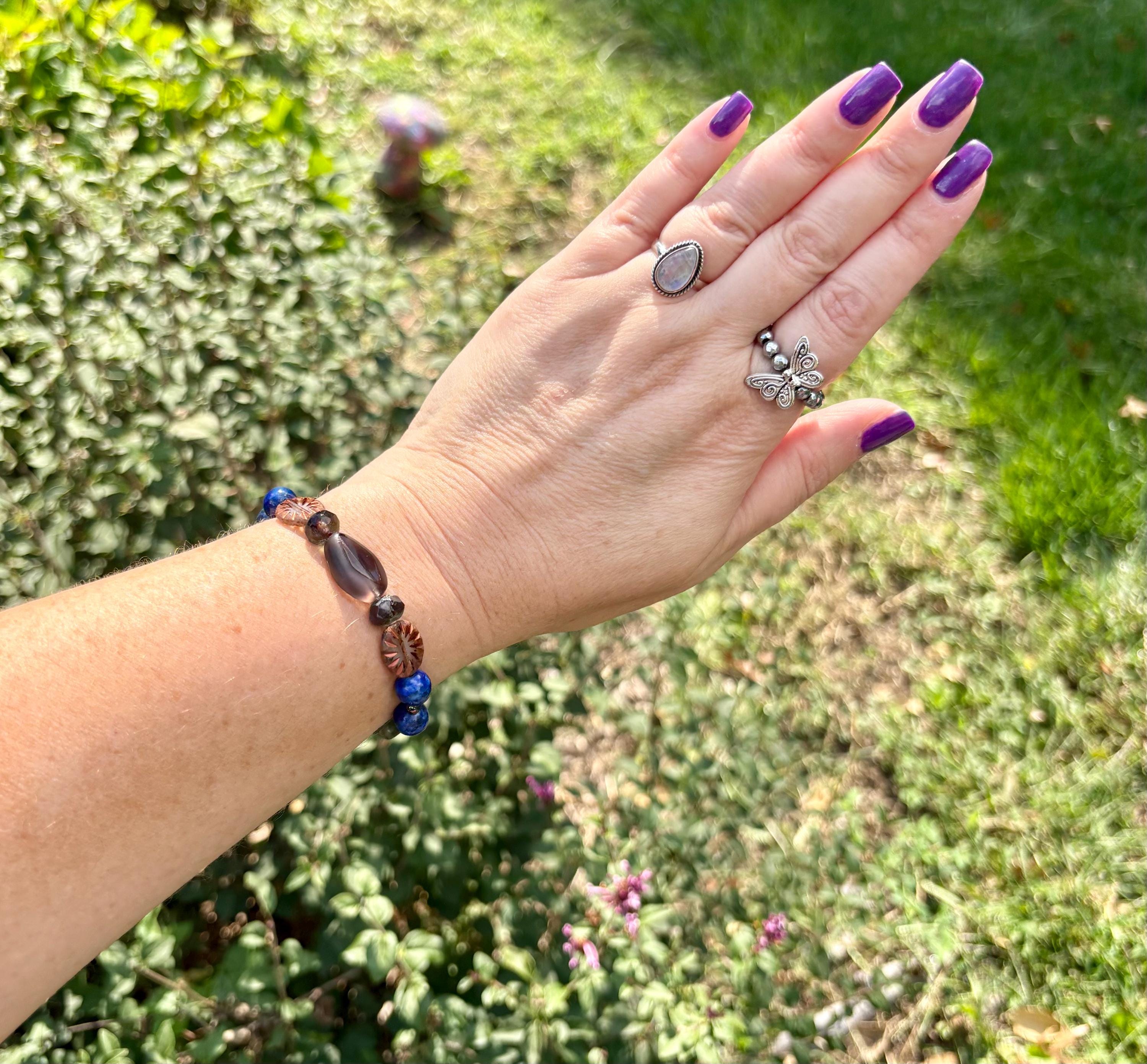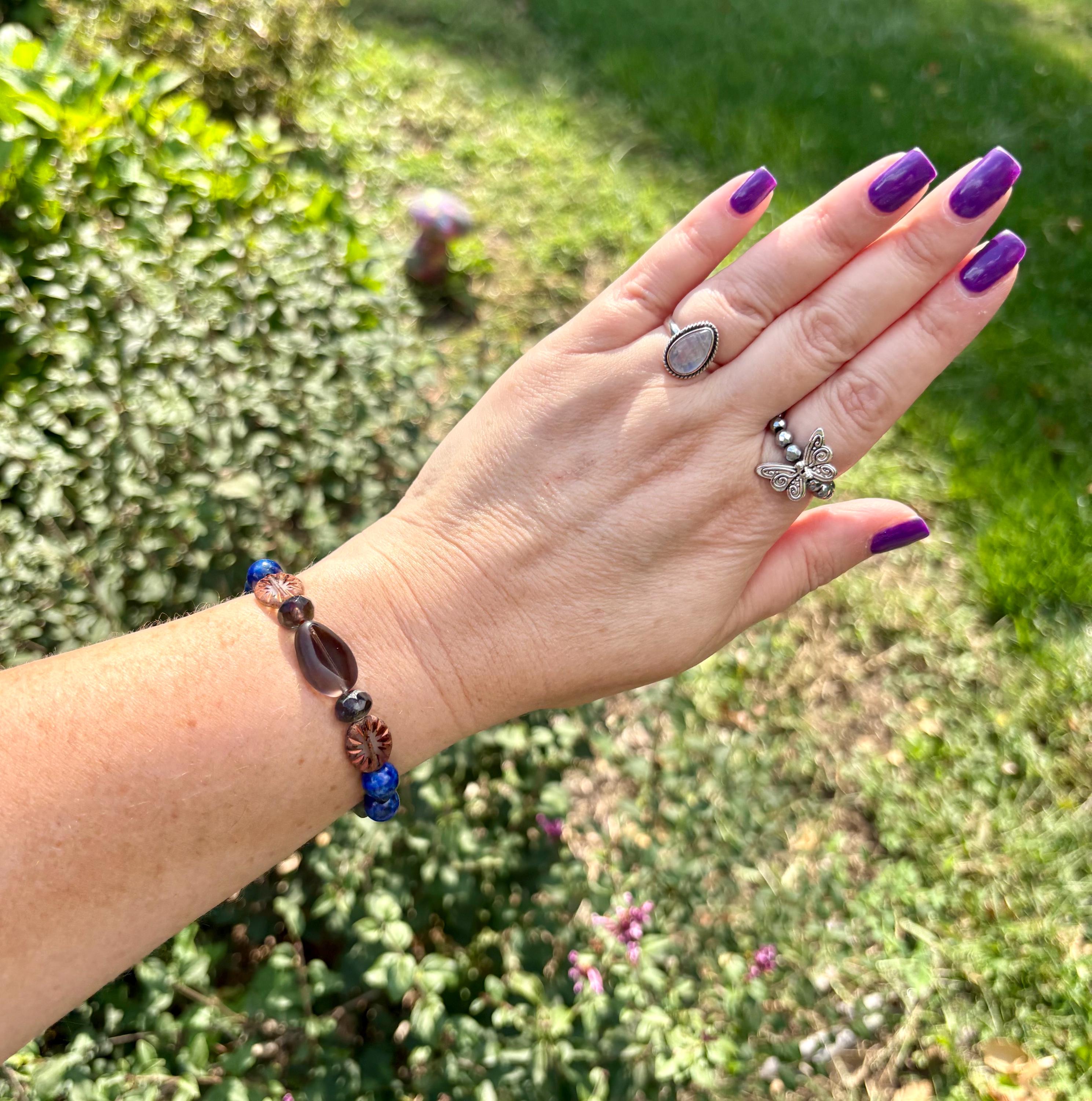 Step into your divine power with the Enchanted Midnight Rose Bracelet, a radiant piece from the Goddess Party Collection! This bracelet blends deep celestial blues with romantic copper and soft floral accents — a wearable prayer for wisdom, confidence, and grace.