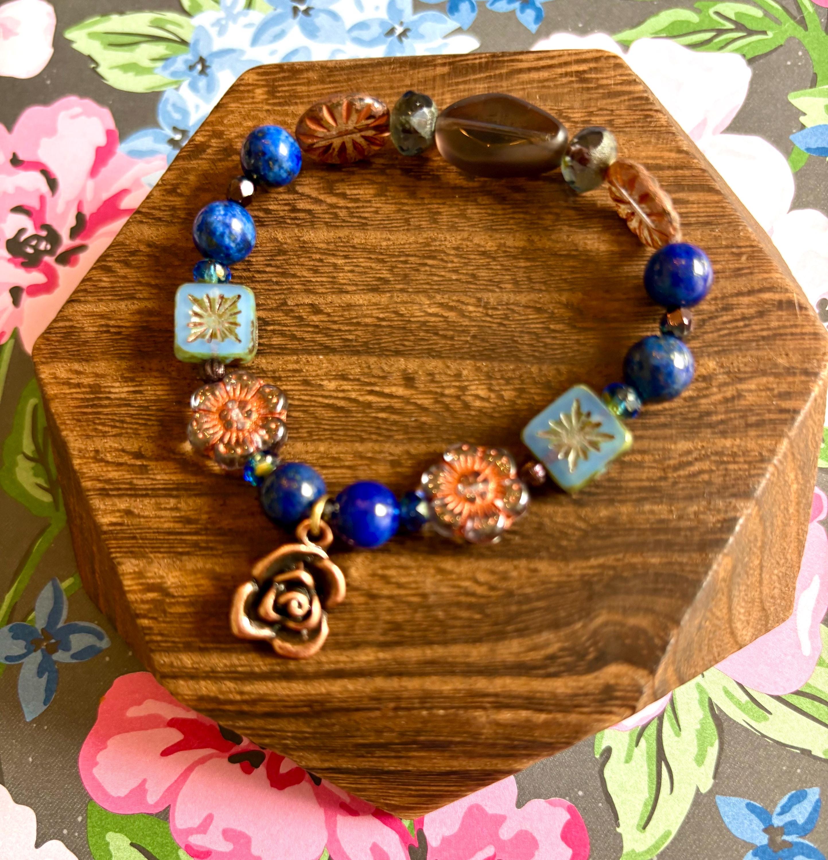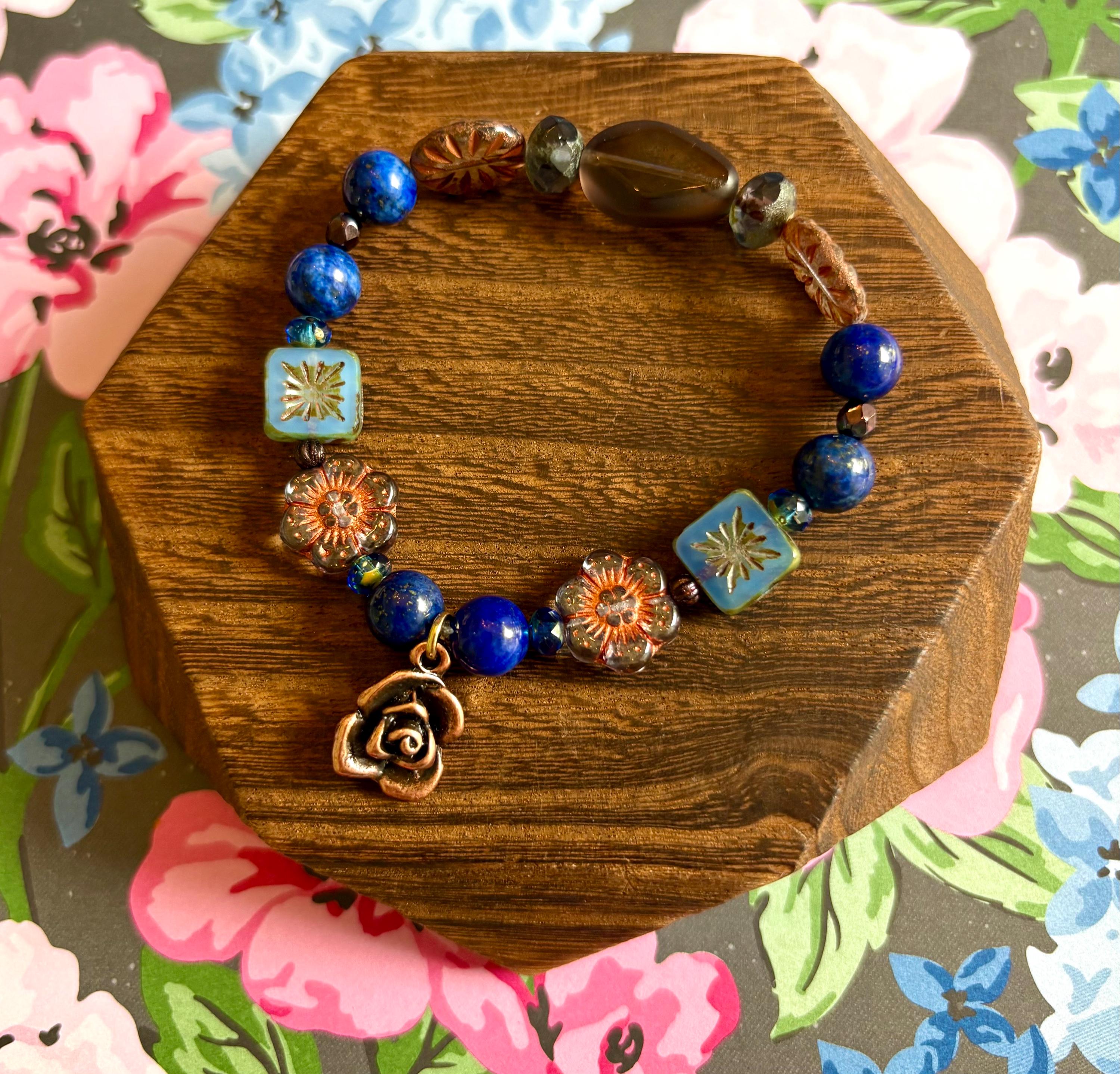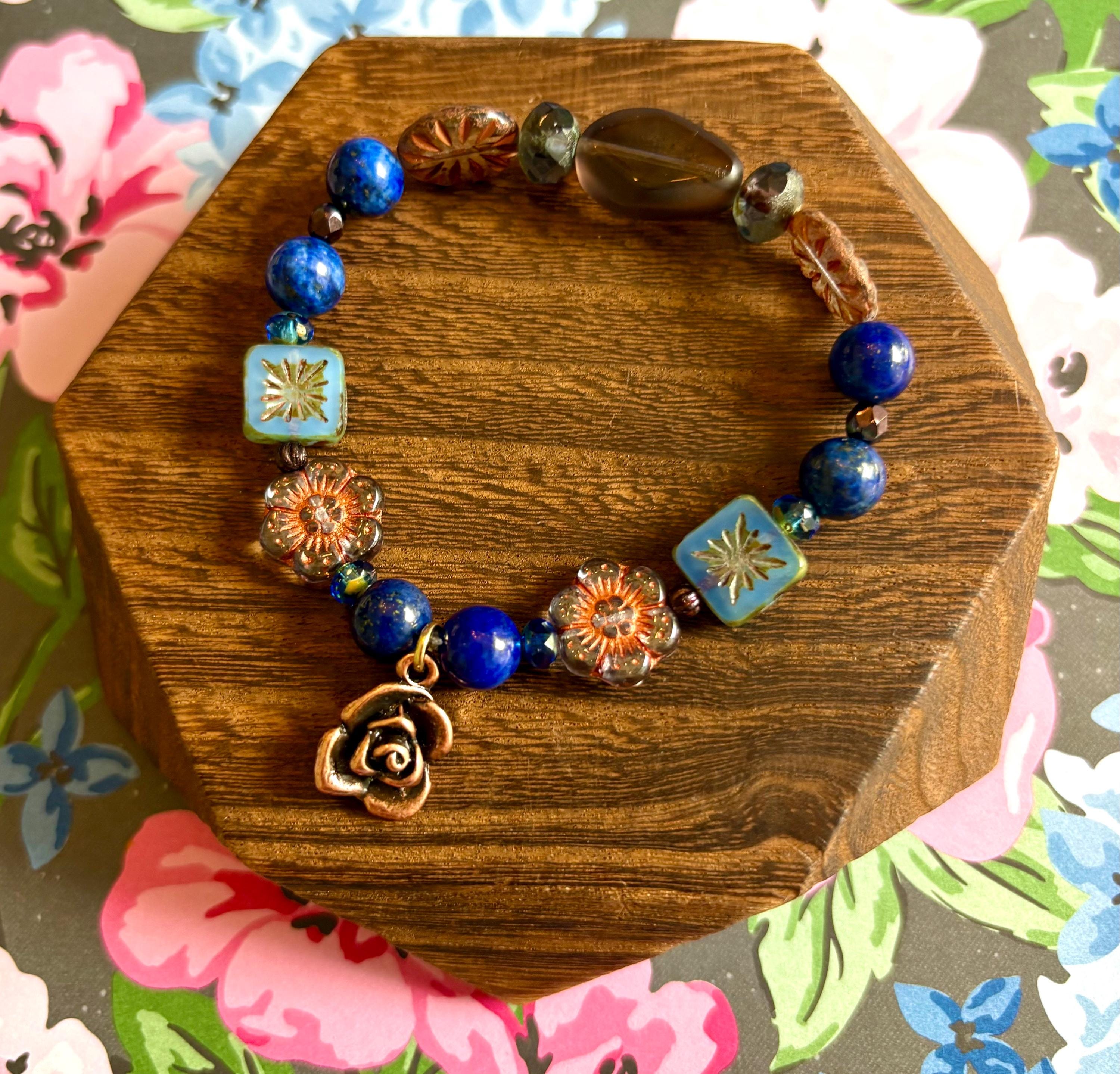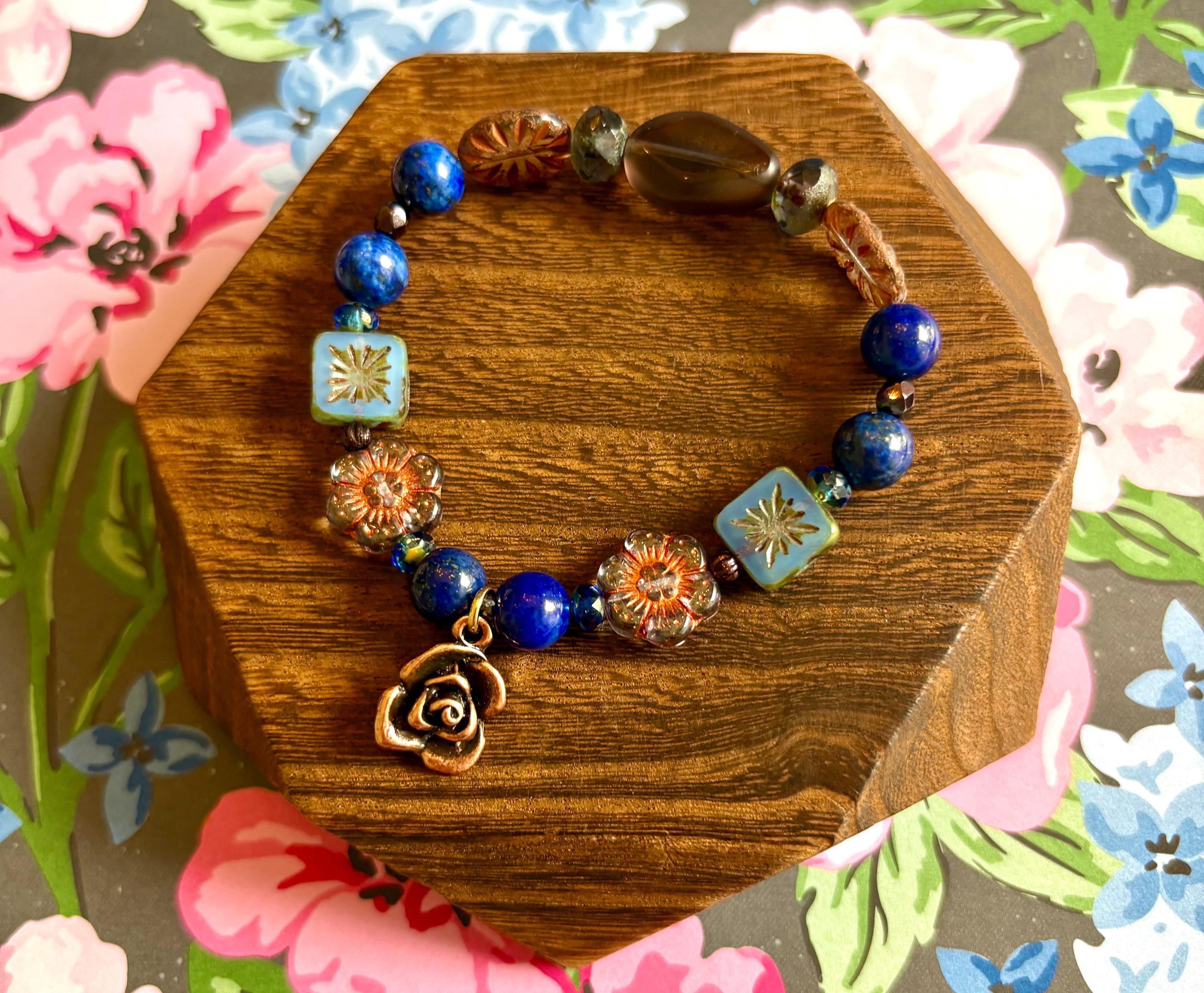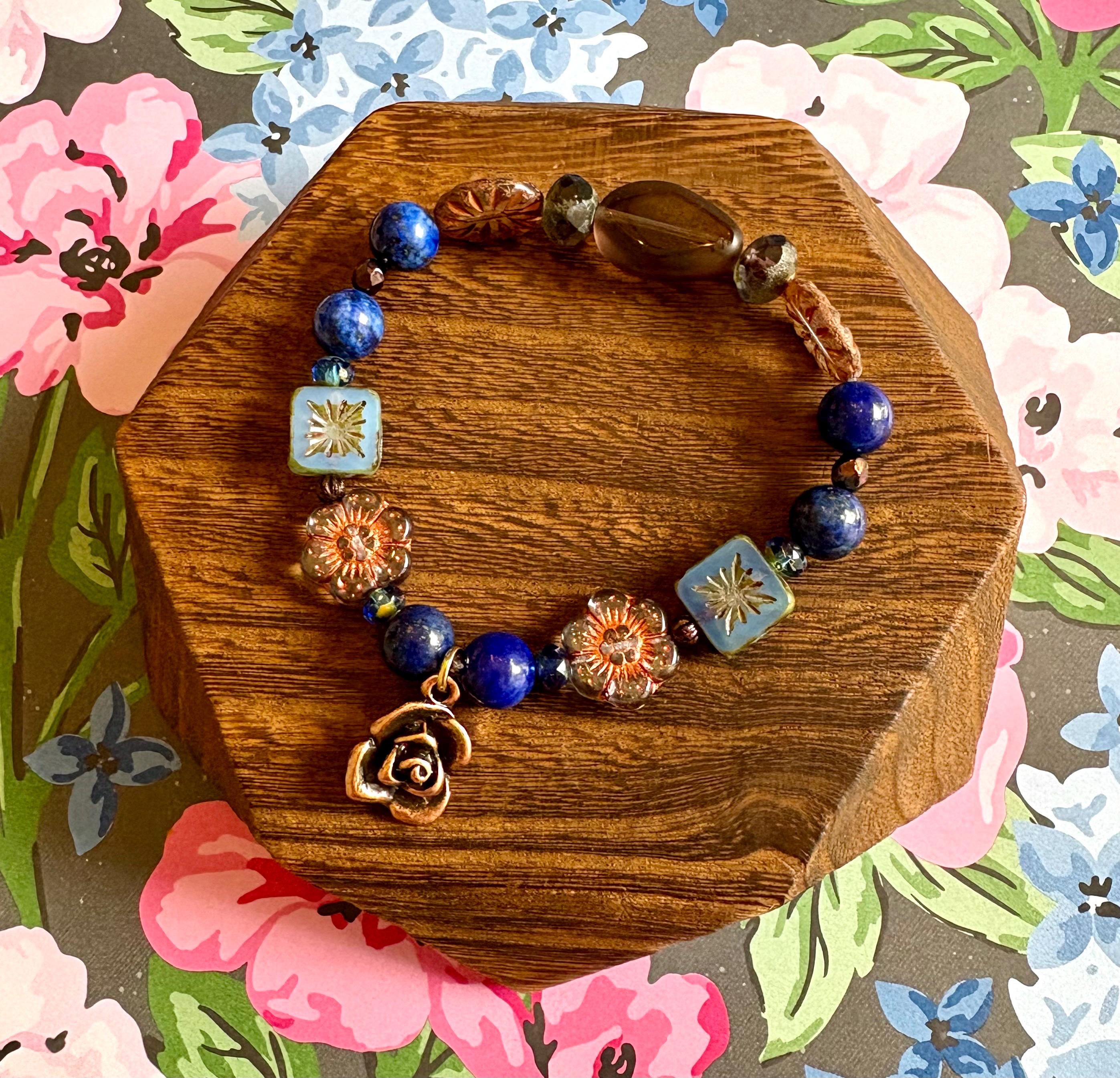 Enchanted Midnight Rose Bracelet – Lapis Lazuli, Czech Glass & Copper Rose Charm | Goddess Party Collection